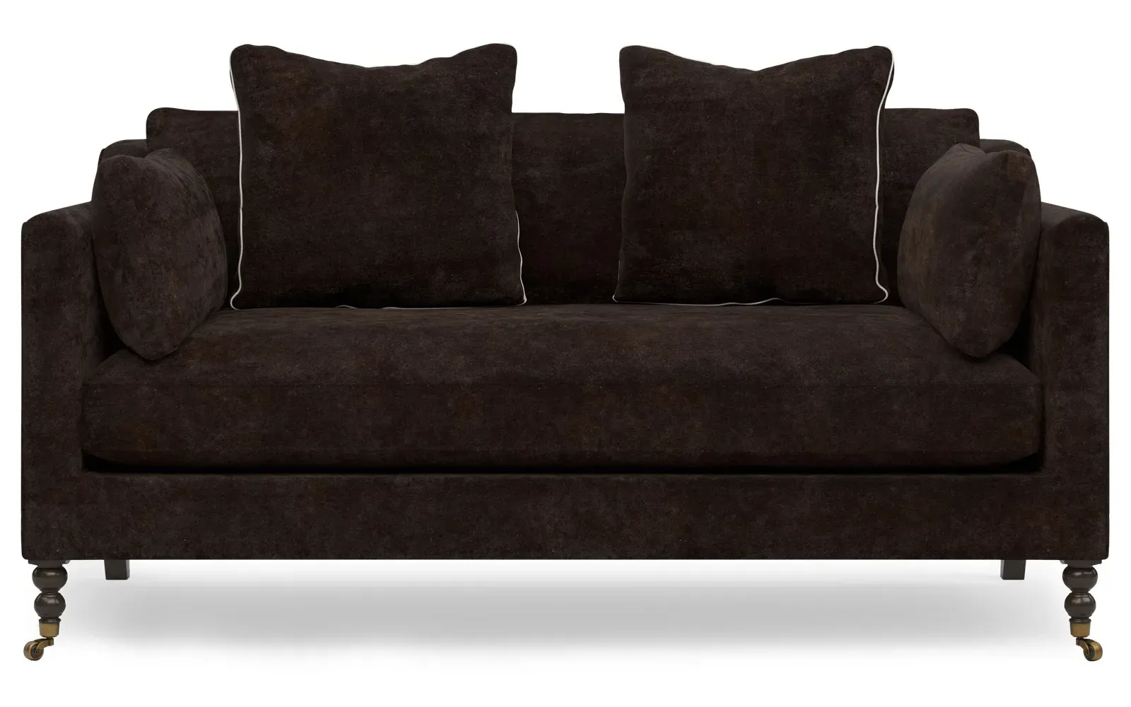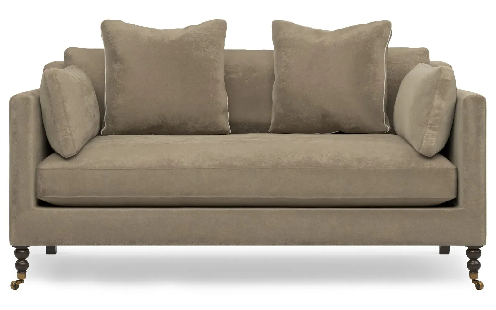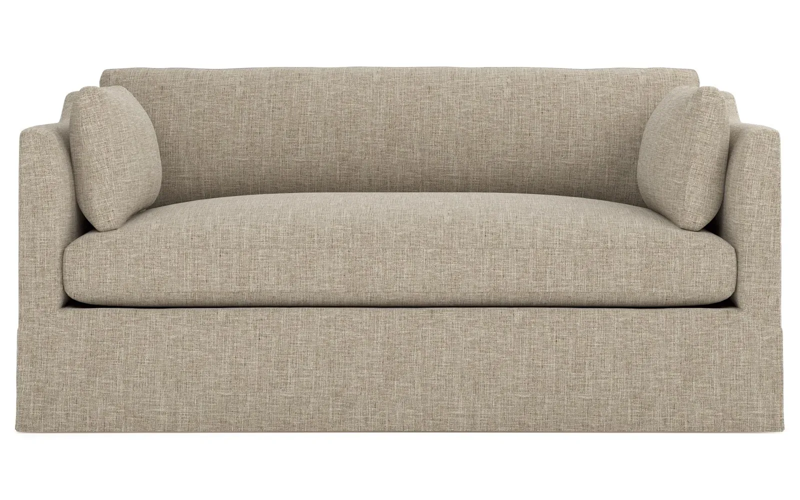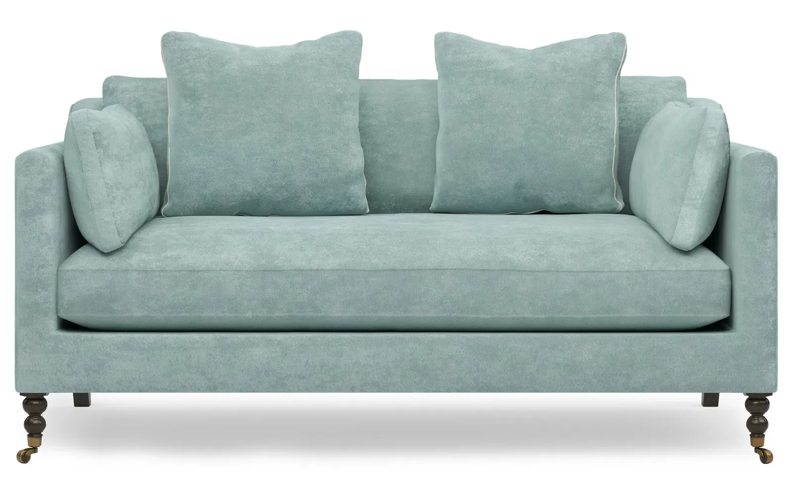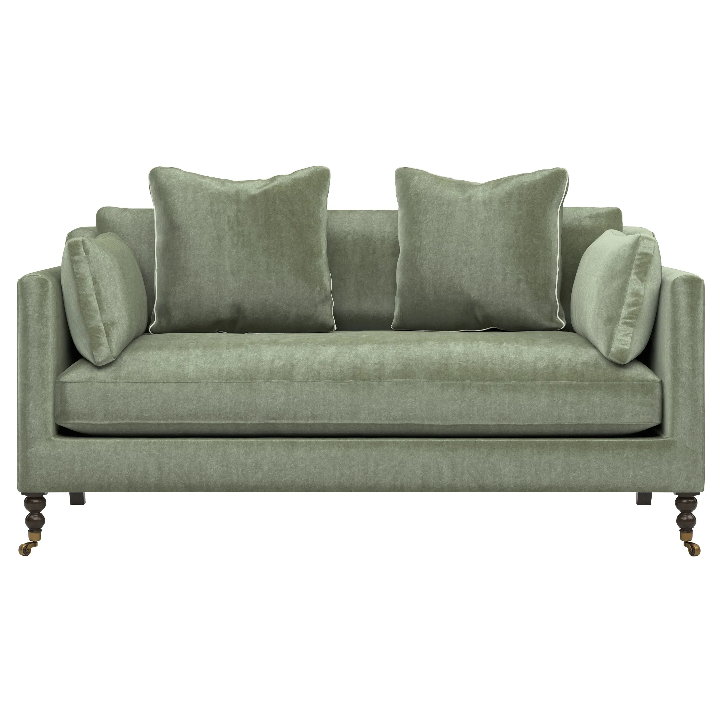 The 71" Madeline loveseat elevates any modern or traditional home. Turned wood legs with brass casters in the front pair beautifully with curved legs in the back, dressing up the silhouette. Soft yet supportive, the seat cushion is designed for supreme comfort, with a foam core surrounded by a blend of fiber, down, and feather fill. A pair of bolster pillows flanks the sophisticated bench seat. Choose from a variety of upholstery options, including linen, velvet, and performance fabrics. <b>Overall Dimensions:</b> 71" W x 40" D x 34" H. <b>Seat Dimensions:</b> 24” D x 21” H; <b>Distance Between Arms:</b> 49”; <b>Arm Height:</b> 29”; <b>Leg Height:</b> 7”. <b>Materials: </b>FSC®-certified, US-sourced, formaldehyde-free, solid kiln-dried hardwood and furniture-grade laminates, metal casters. <b>Material Finishes:</b> Espresso legs, brass casters. <b>Cushion Fill:</b> A CertiPUR-US® certified, high-resiliency foam core wrapped with a super soft foam layer then inserted into a channel-quilted casing filled with a blend of 50% fiber, 5% down, and 45% feather.
