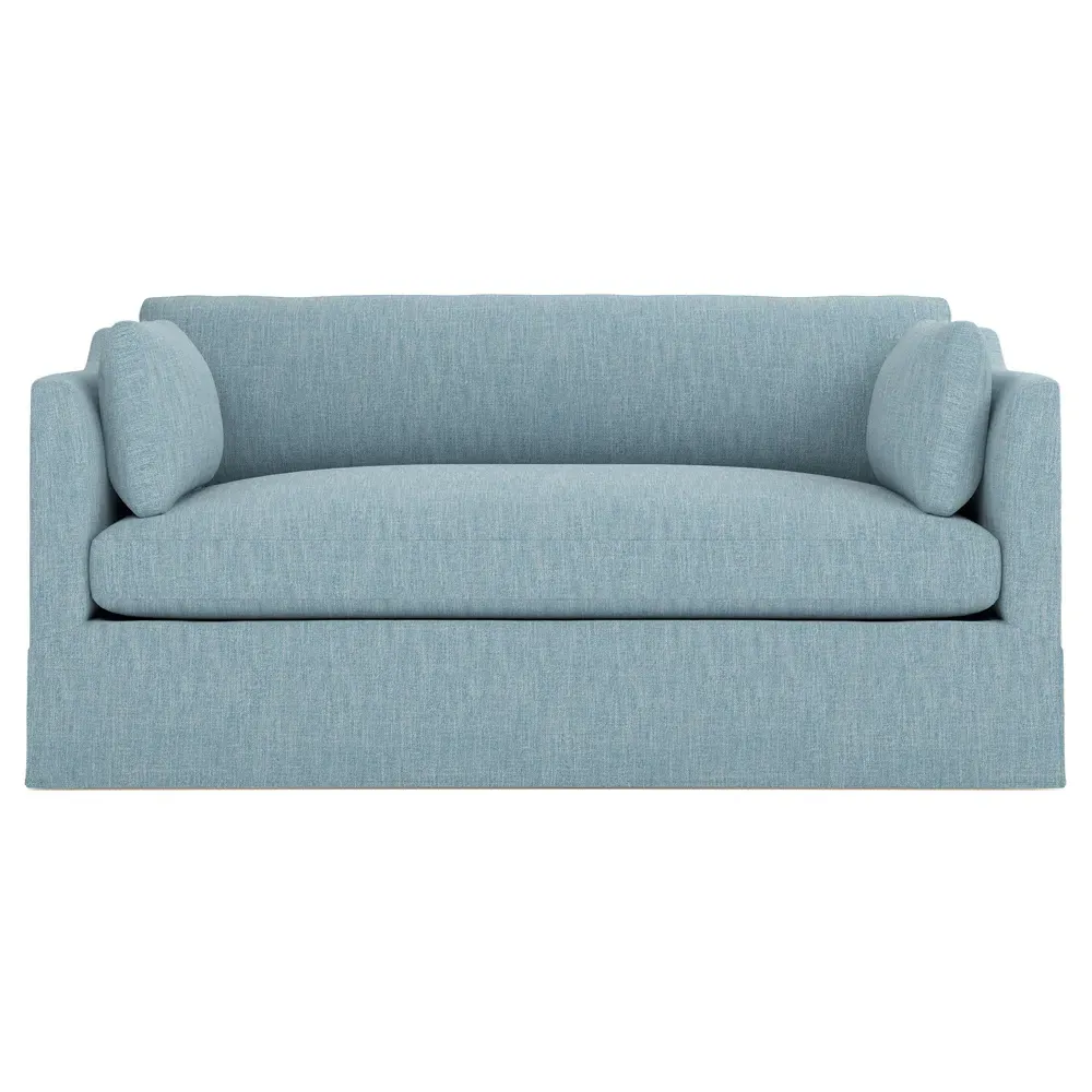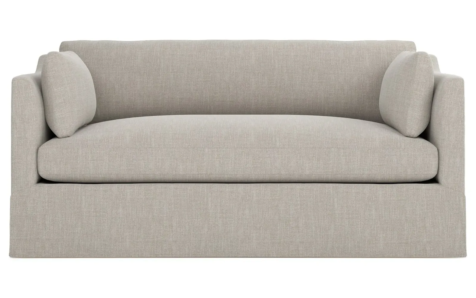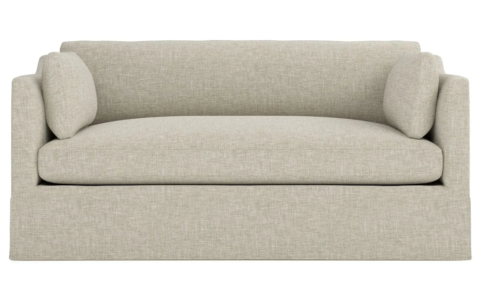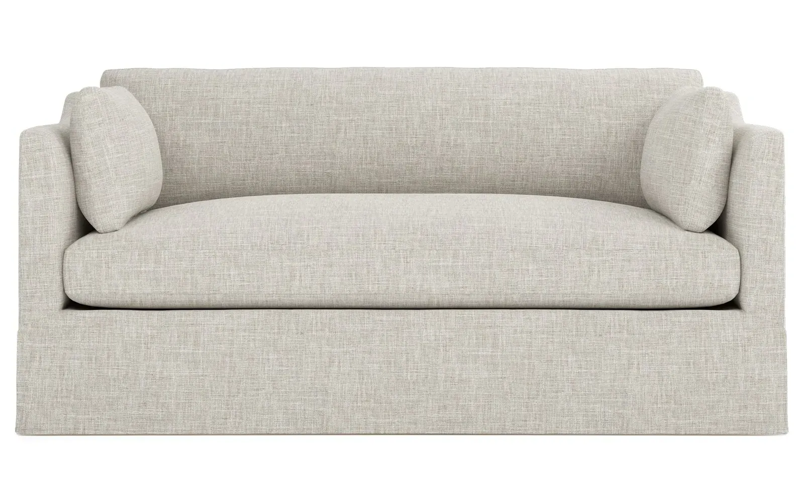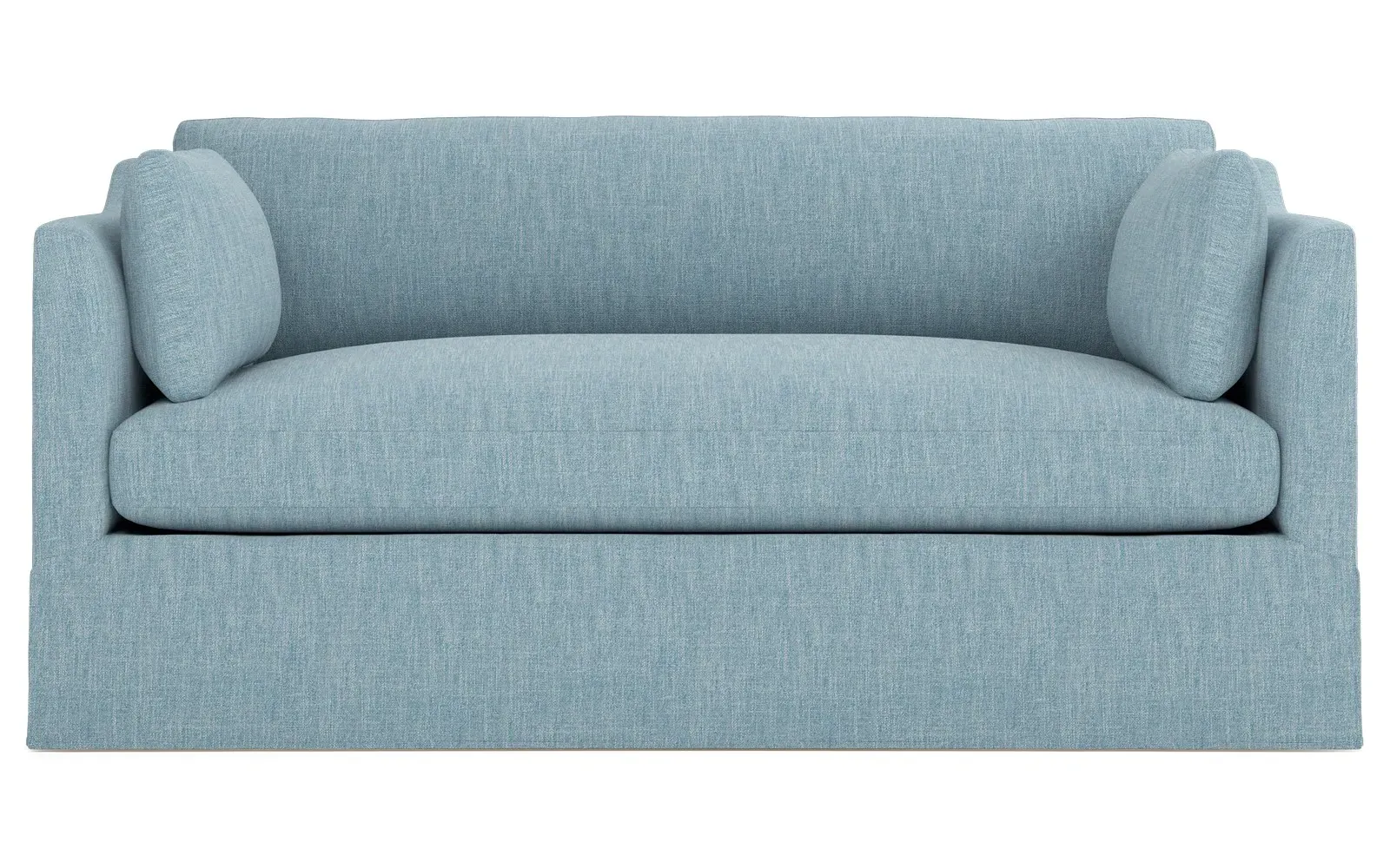 The 71" Madeline loveseat elevates any modern or traditional home. Turned wood legs with brass casters in the front pair beautifully with curved legs in the back, dressing up the silhouette. Soft yet supportive, the seat cushion is designed for supreme comfort, with a foam core surrounded by a blend of fiber, down, and feather fill. A pair of bolster pillows flanks the sophisticated bench seat. Choose from a variety of upholstery options, including linen, velvet, and performance fabrics. <b>Overall Dimensions:</b> 71" W x 40" D x 34" H. <b>Seat Dimensions:</b> 24” D x 21” H; <b>Distance Between Arms:</b> 49”; <b>Arm Height:</b> 29”; <b>Leg Height:</b> 7”. <b>Materials: </b>FSC®-certified, US-sourced, formaldehyde-free, solid kiln-dried hardwood and furniture-grade laminates, metal casters. <b>Material Finishes:</b> Espresso legs, brass casters. <b>Cushion Fill:</b> A CertiPUR-US® certified, high-resiliency foam core wrapped with a super soft foam layer then inserted into a channel-quilted casing filled with a blend of 50% fiber, 5% down, and 45% feather.