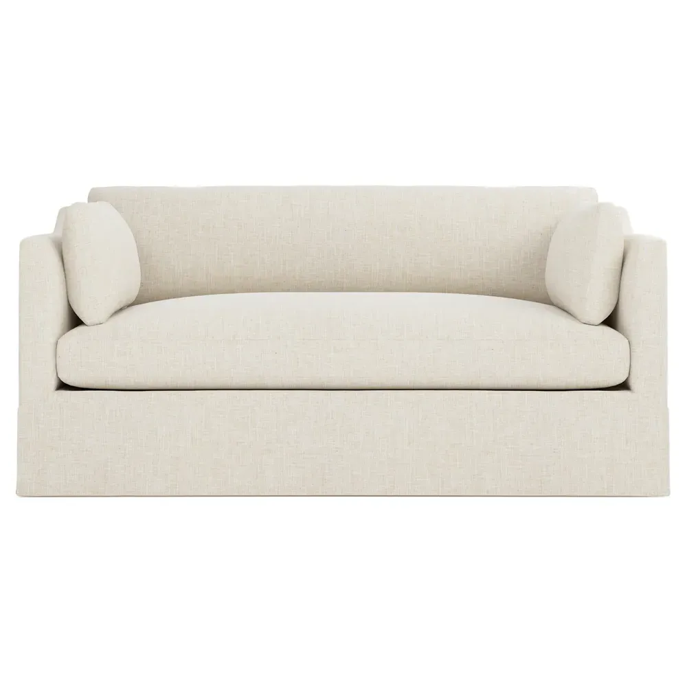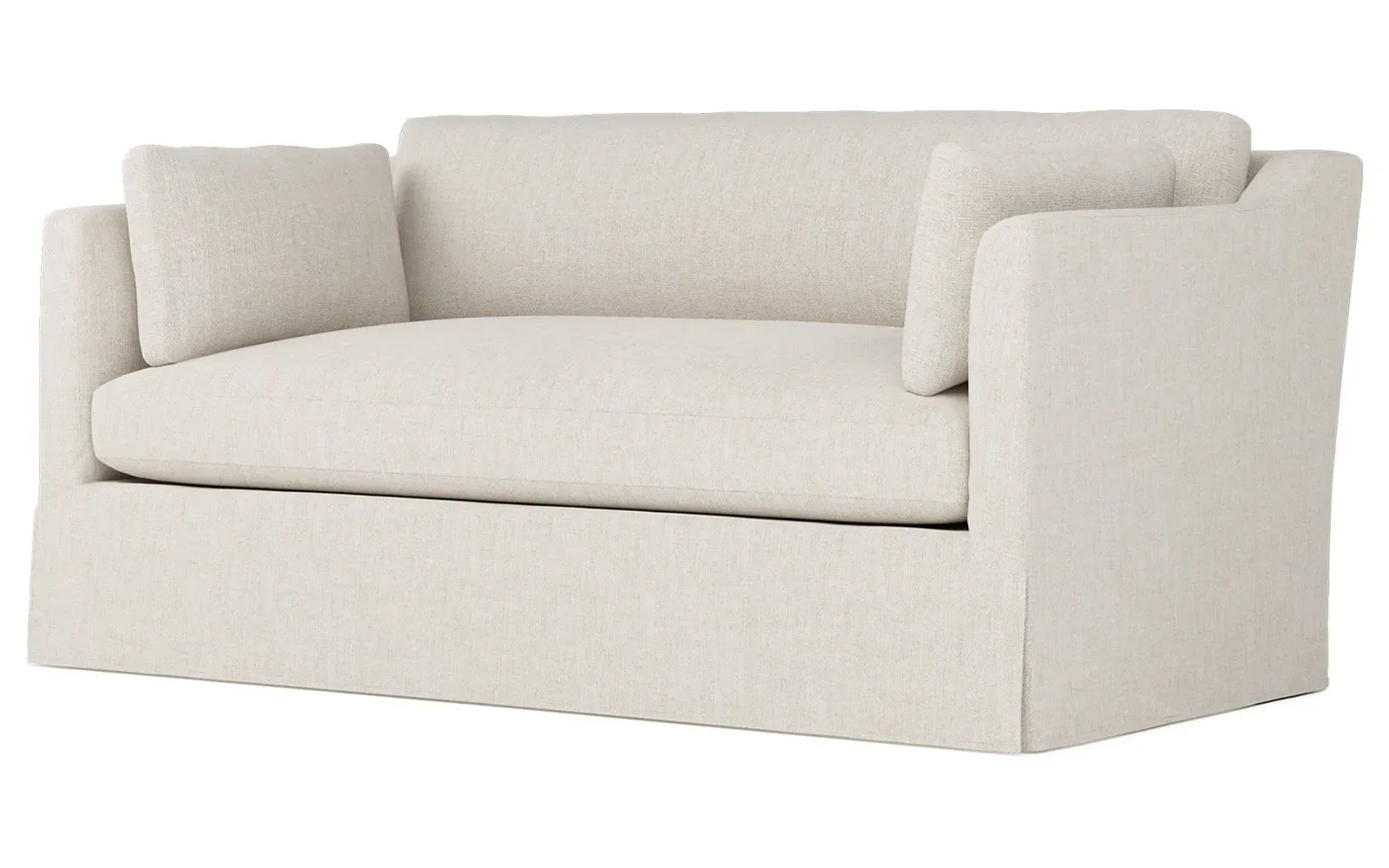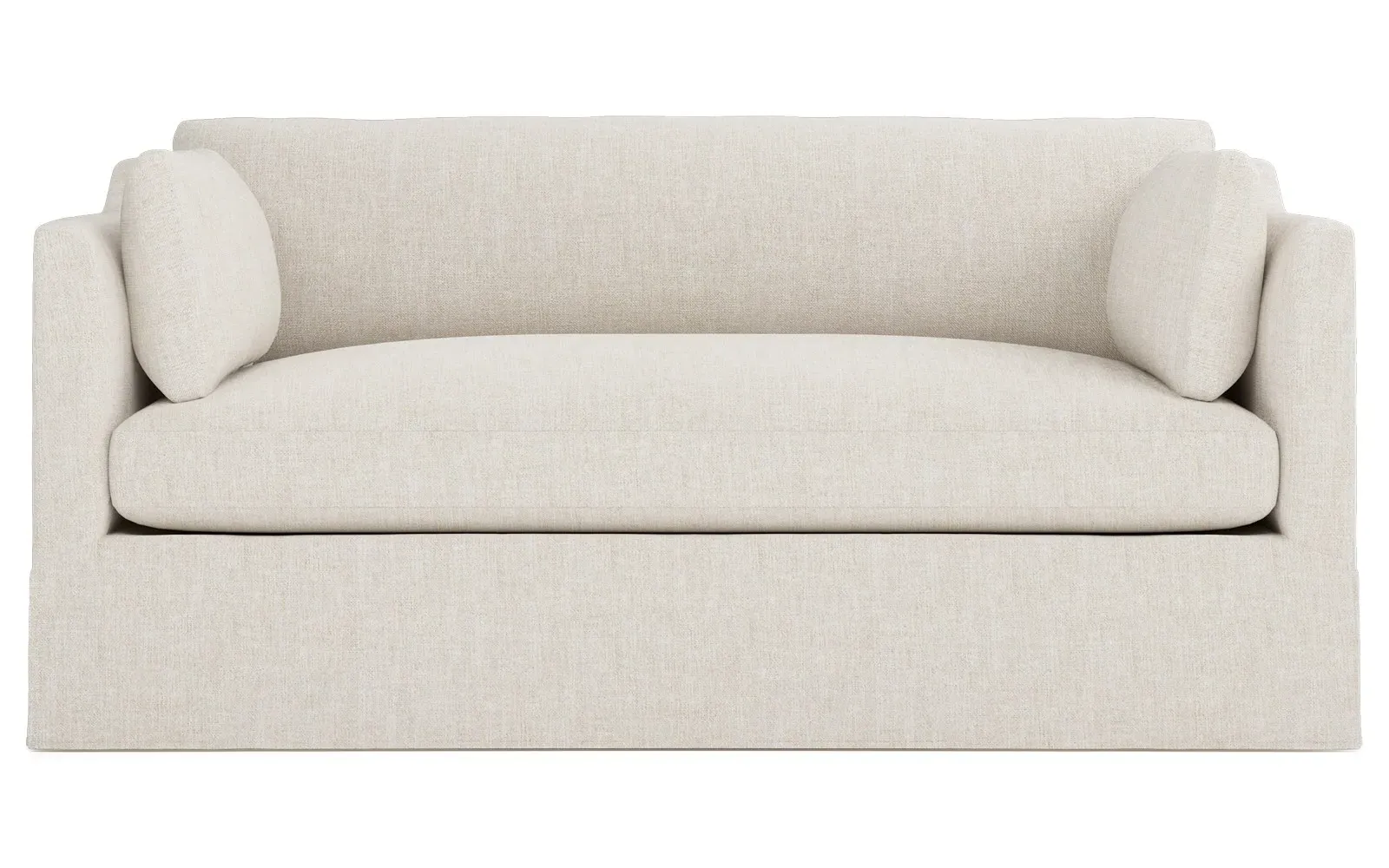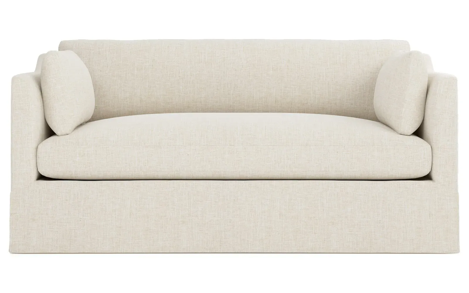 The Madeline loveseat combines clean lines with a balanced silhouette for relaxed versatility. Its seat cushion features a high-resiliency foam core wrapped with soft foam and filled with a blend of fiber, down, and feather for supreme comfort. Turned wood legs with brass casters in the front pair with curved legs in the back, while the solid kiln-dried hardwood frame ensures lasting durability. Bolster pillows flank the bench seat, and the channel-quilted casing keeps materials evenly distributed. W180 x D102 x H86 cm.