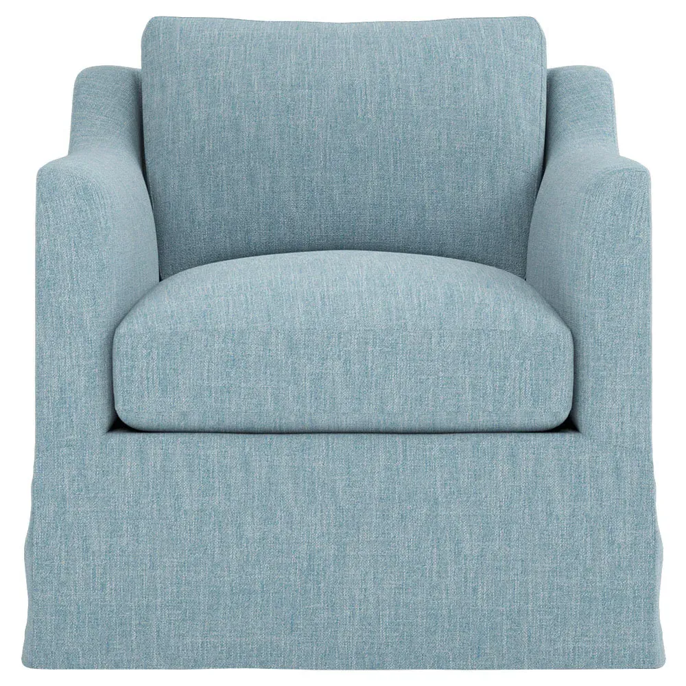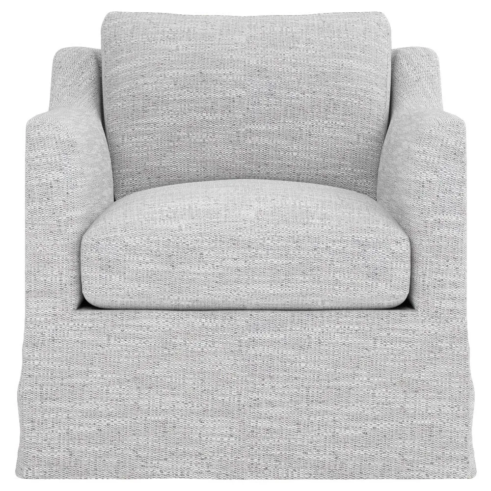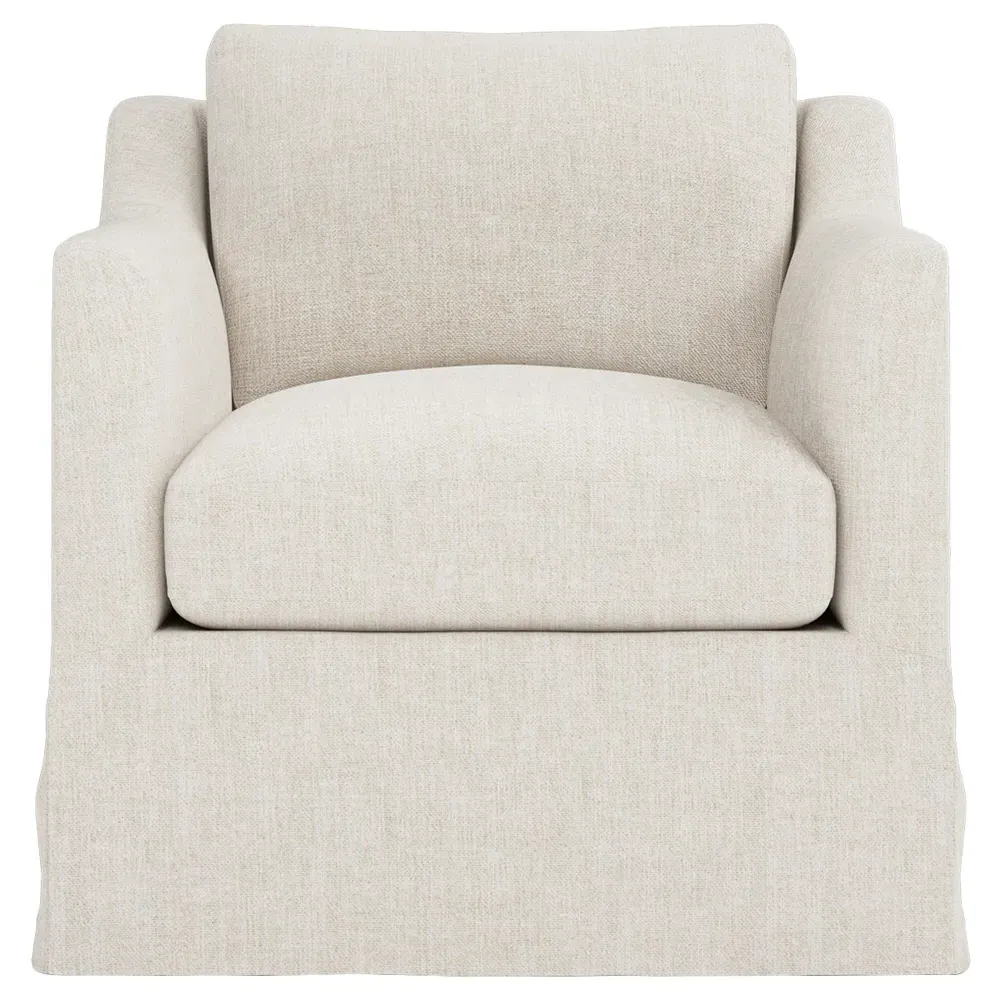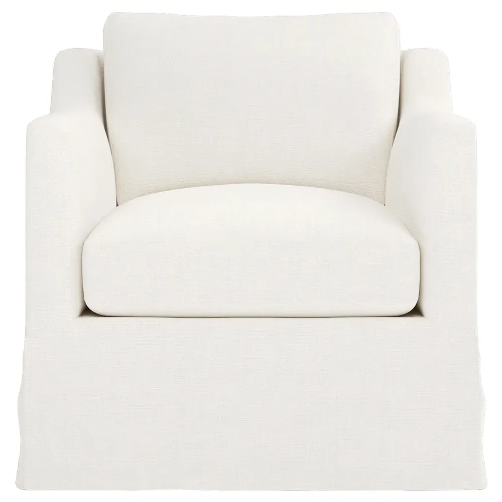 The Madeline slipcovered swivel chair combines comfort with versatility through its gently curved silhouette and supportive cushioning. Its high-resiliency foam core wrapped with soft foam and filled with a blend of fiber, down, and feather provides supreme comfort, while the loose back pillow and seat cushion allow easy maintenance. The washable slipcover fabric adds practicality, and the solid kiln-dried hardwood frame ensures lasting durability. W84 x D91 x H81 cm.
