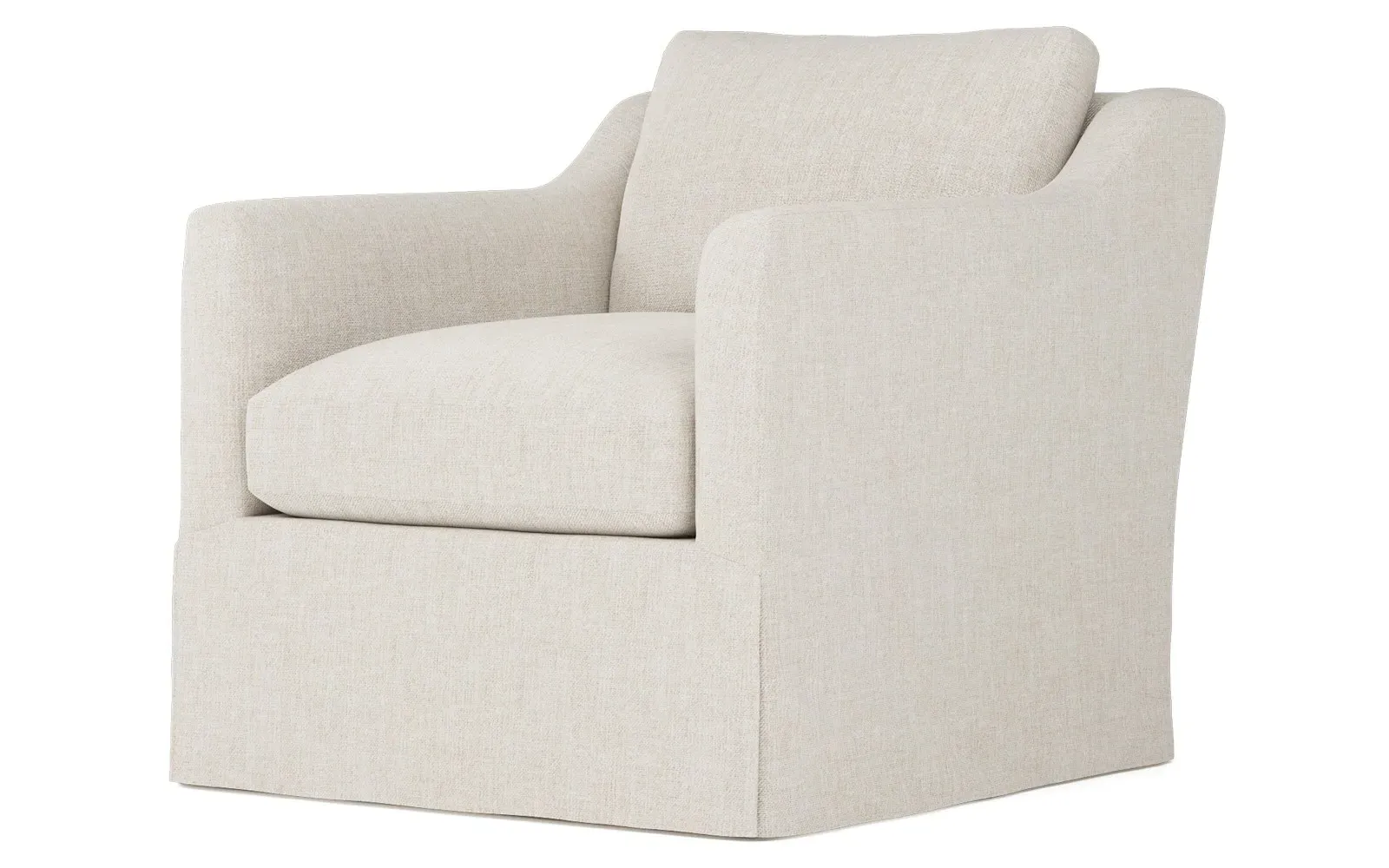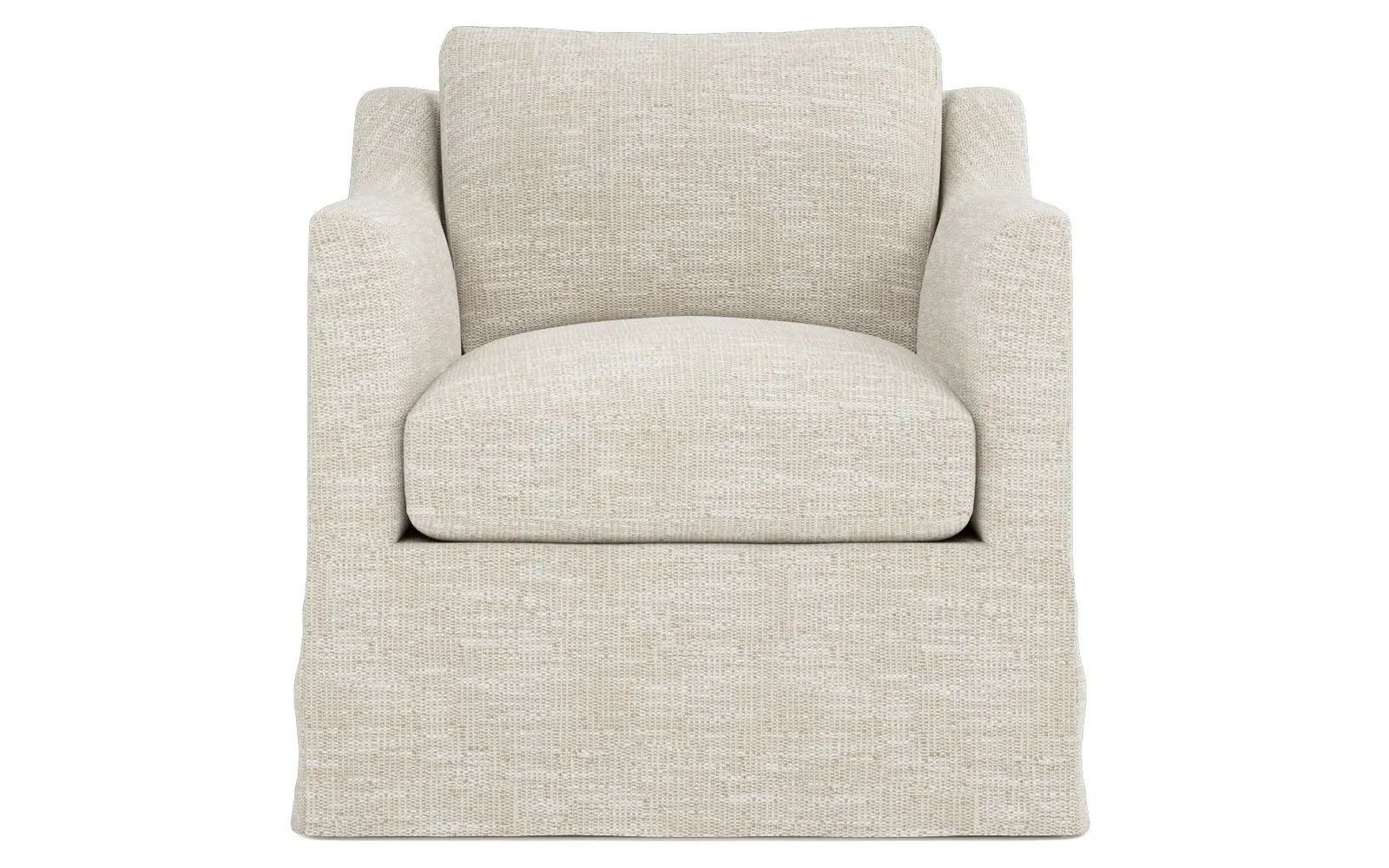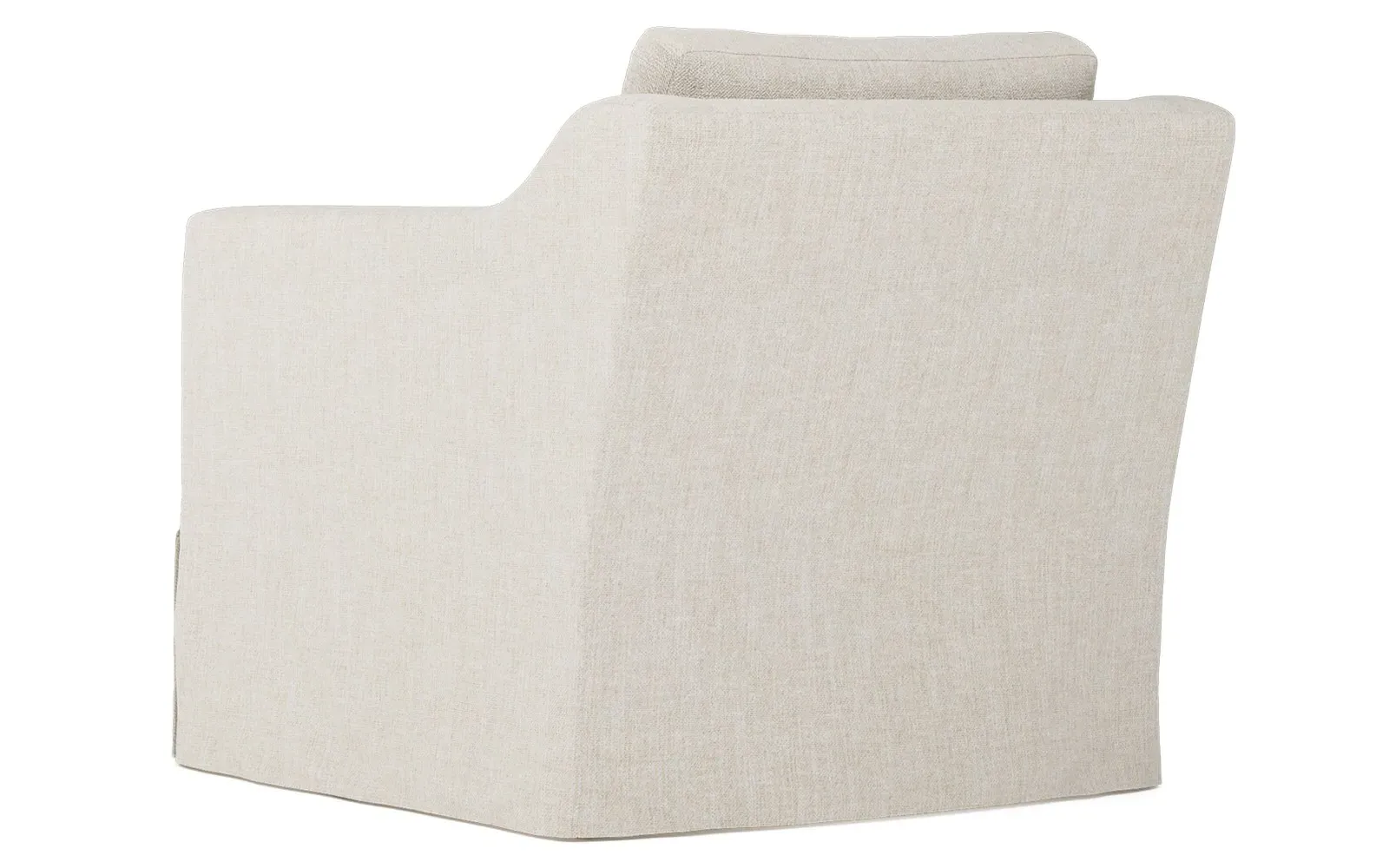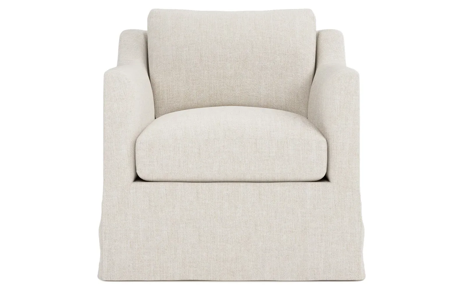 The Madeline slipcovered swivel chair combines comfort with versatility through its gently curved silhouette and supportive cushioning. Its high-resiliency foam core wrapped with soft foam and filled with a blend of fiber, down, and feather provides supreme comfort, while the loose back pillow and seat cushion allow easy maintenance. The washable slipcover fabric adds practicality, and the solid kiln-dried hardwood frame ensures lasting durability. W84 x D91 x H81 cm.