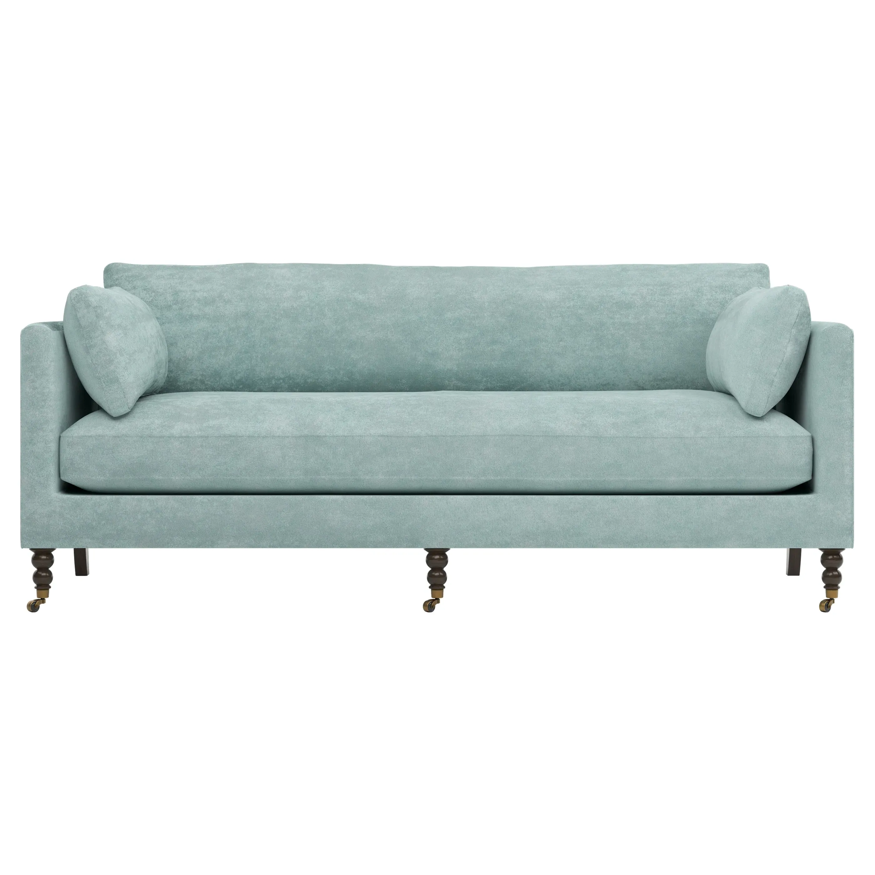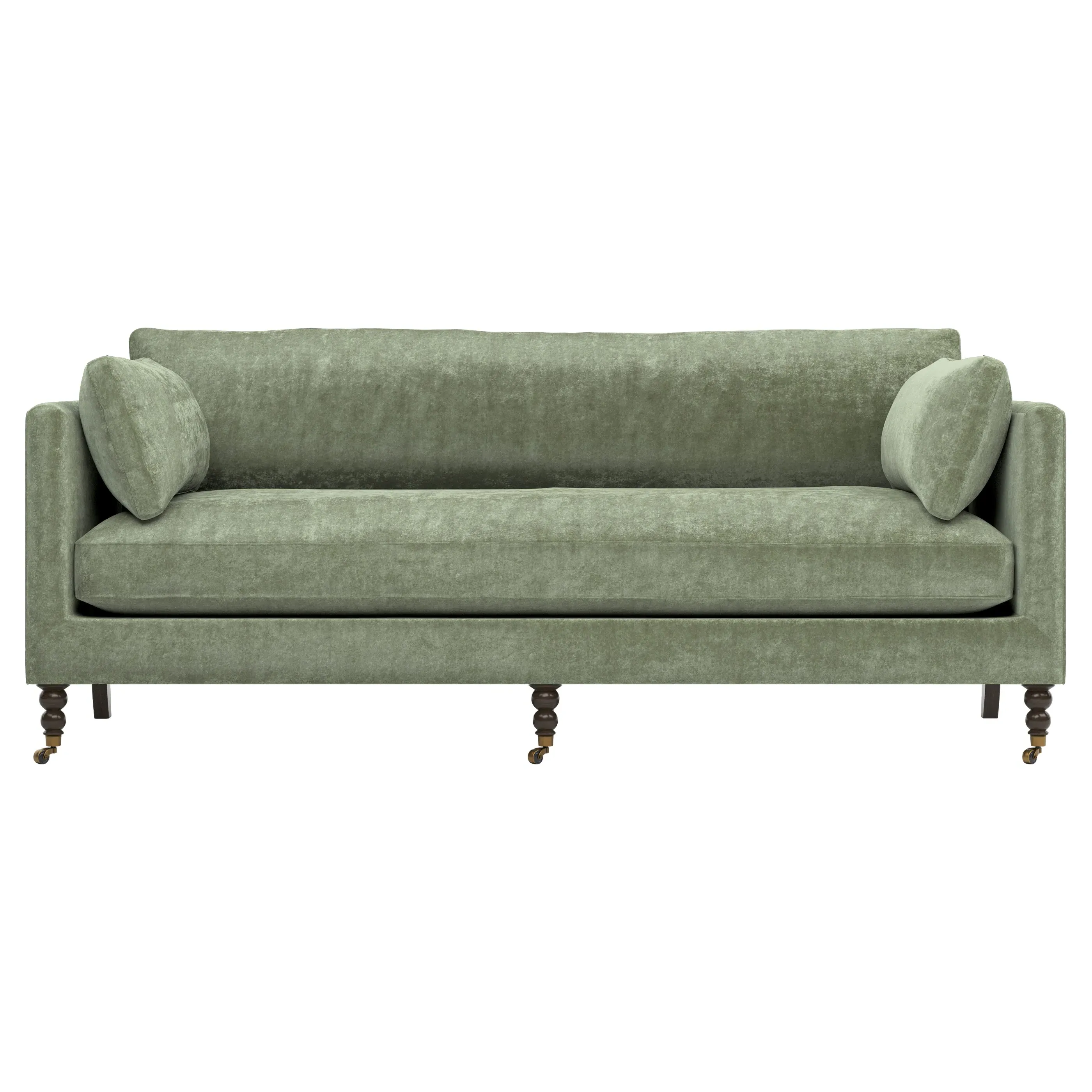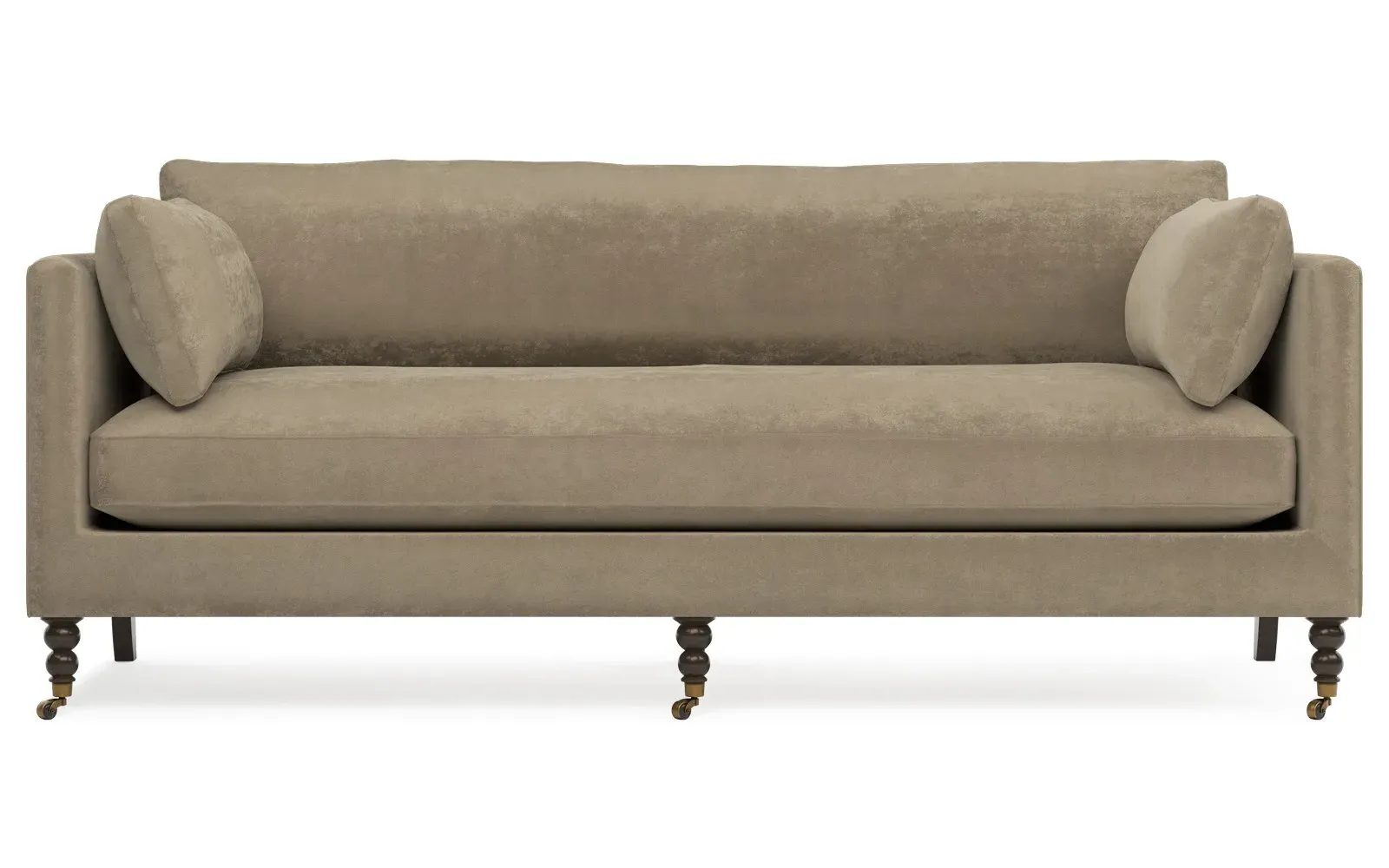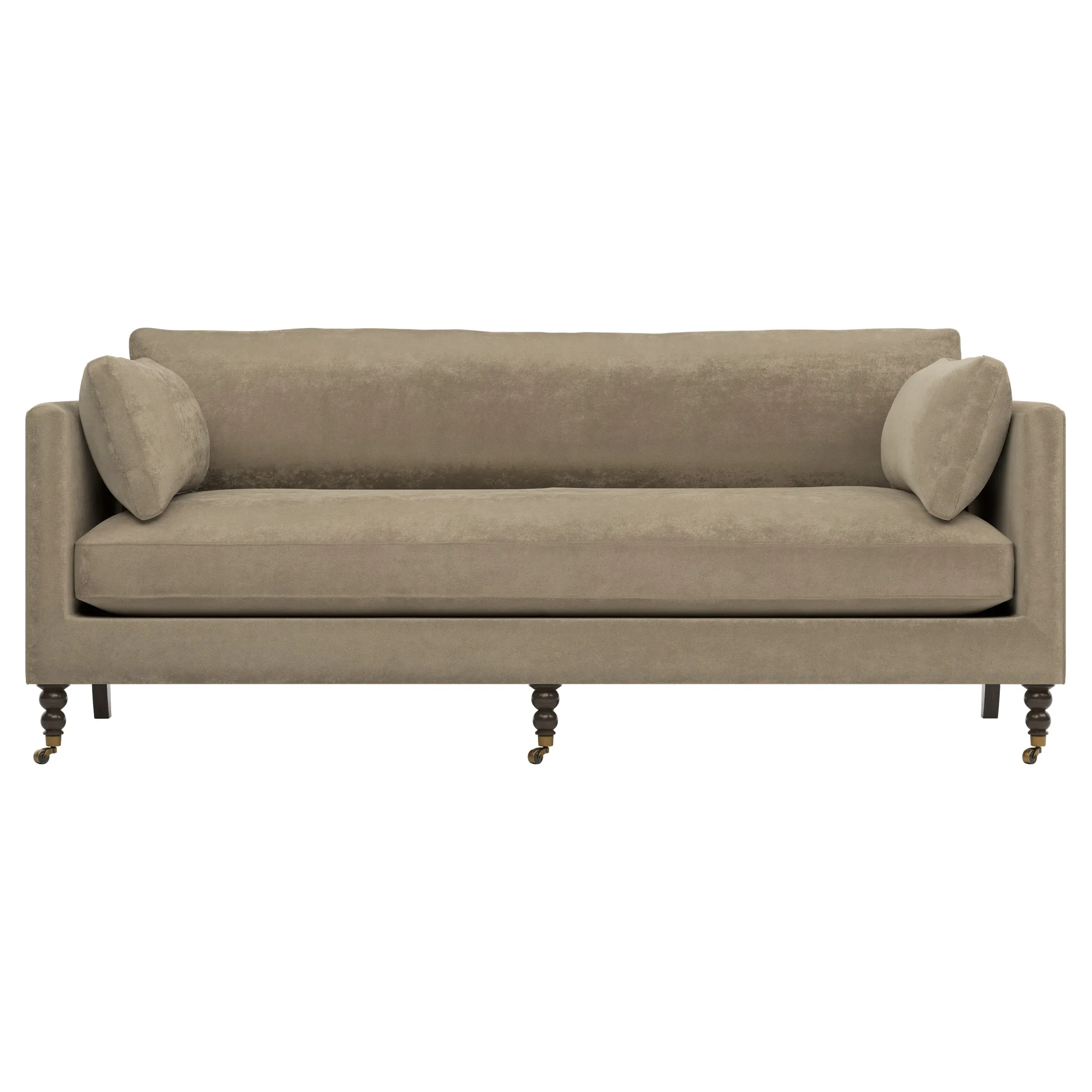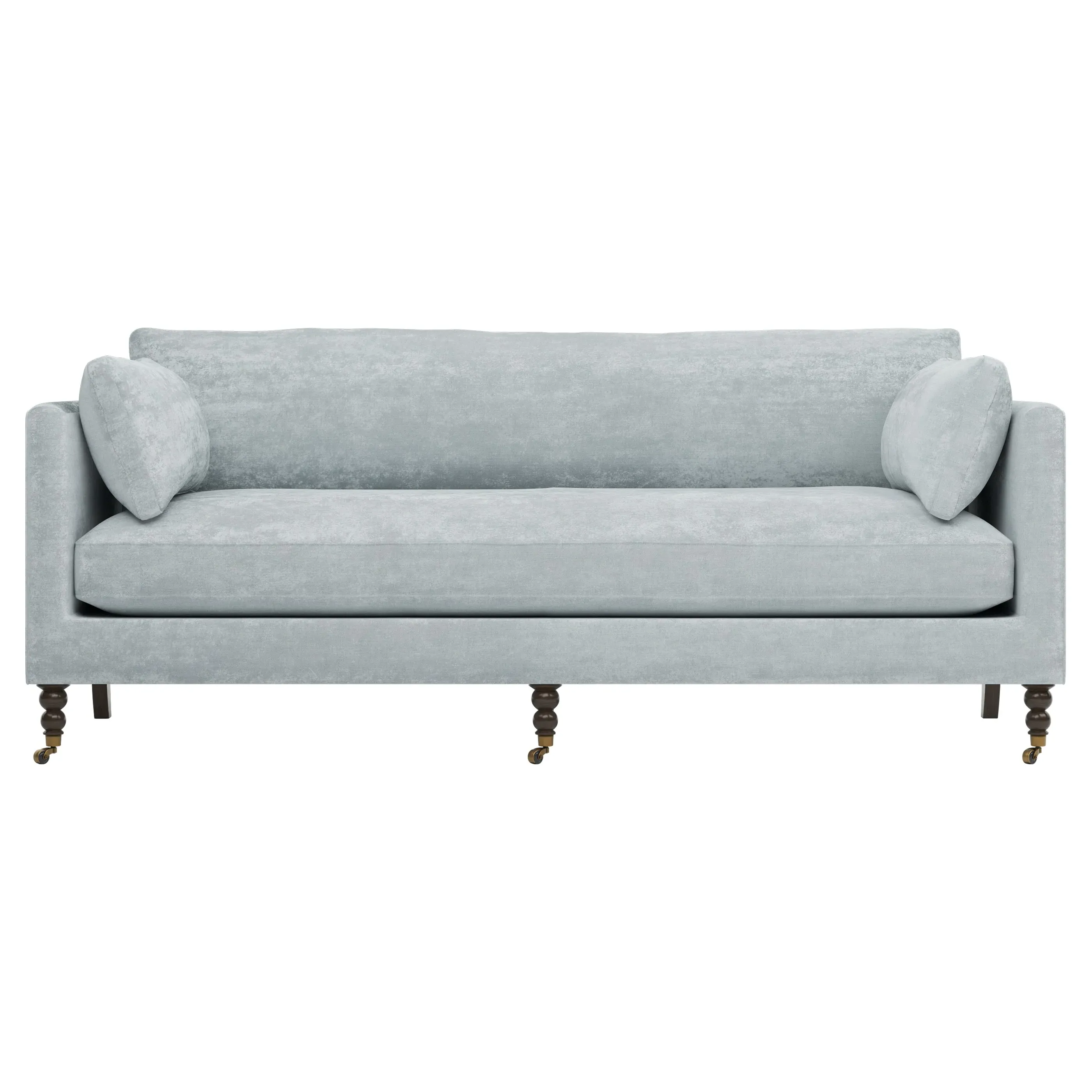 The 84" Madeline sofa elevates any modern or traditional home. Turned wood legs with brass casters in the front pair beautifully with curved legs in the back, dressing up the silhouette. Soft yet supportive, the seat cushion is designed for supreme comfort, with a foam core surrounded by a blend of fiber, down, and feather fill. A pair of bolster pillows flanks the sophisticated bench seat. Choose from a variety of upholstery options, including linen, velvet, and performance fabrics. <b>Overall Dimensions:</b> 84" W x 40" D x 34" H. <b>Seat Dimensions:</b> 24” D x 21” H; <b>Distance Between Arms:</b> 62”; <b>Arm Height:</b> 29”; <b>Leg Height:</b> 7”. <b>Materials:</b> FSC®️-certified, US-sourced, formaldehyde-free, solid kiln-dried hardwood and furniture-grade laminates, metal and vulcanized rubber casters. <b>Material Finishes:</b> Espresso legs, brass casters. <b>Cushion Fill:</b> A CertiPUR-US®️ certified, high-resiliency foam core wrapped with a super soft foam layer then inserted into a channel-quilted casing filled with a blend of 50% fiber, 5% down, and 45% feather.