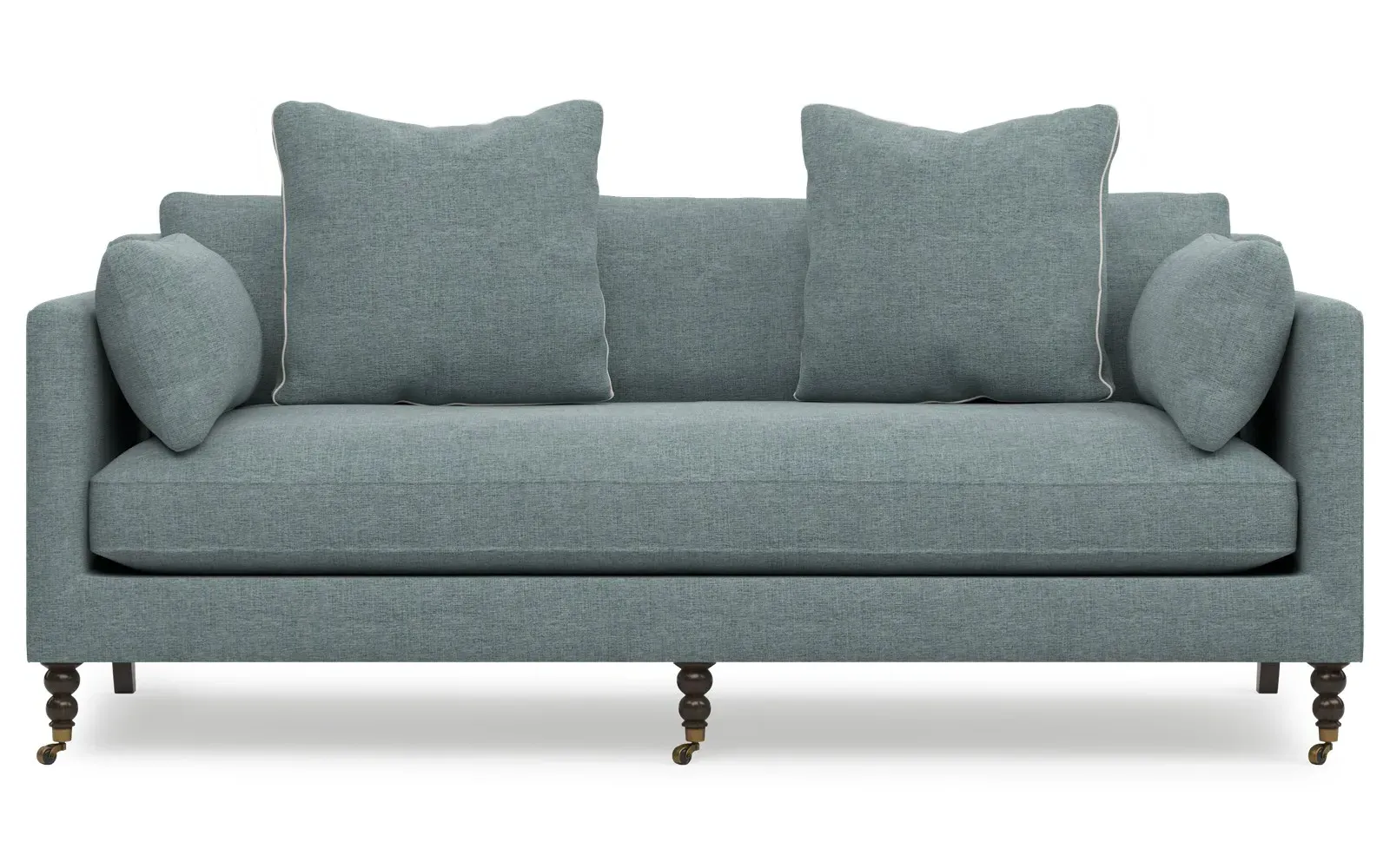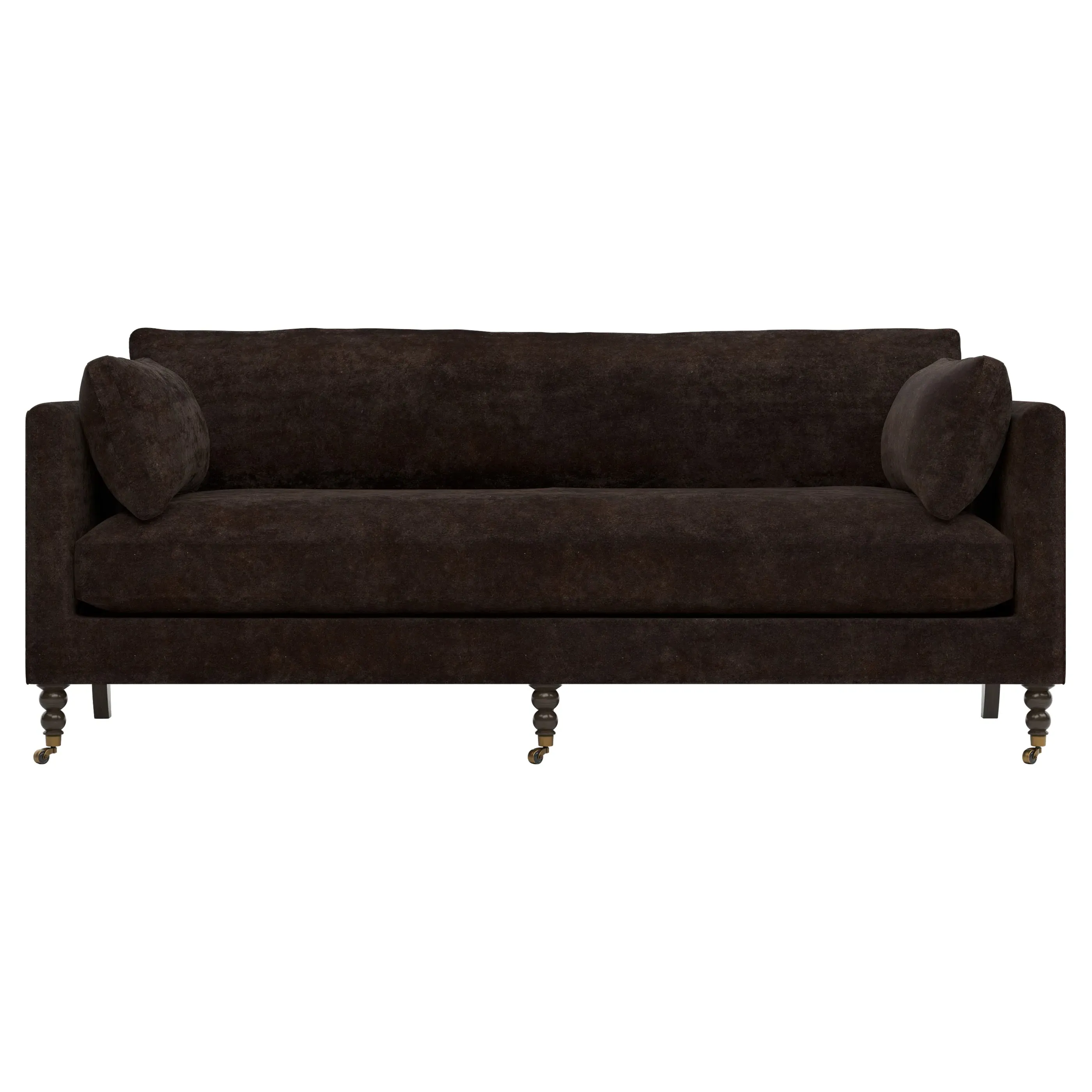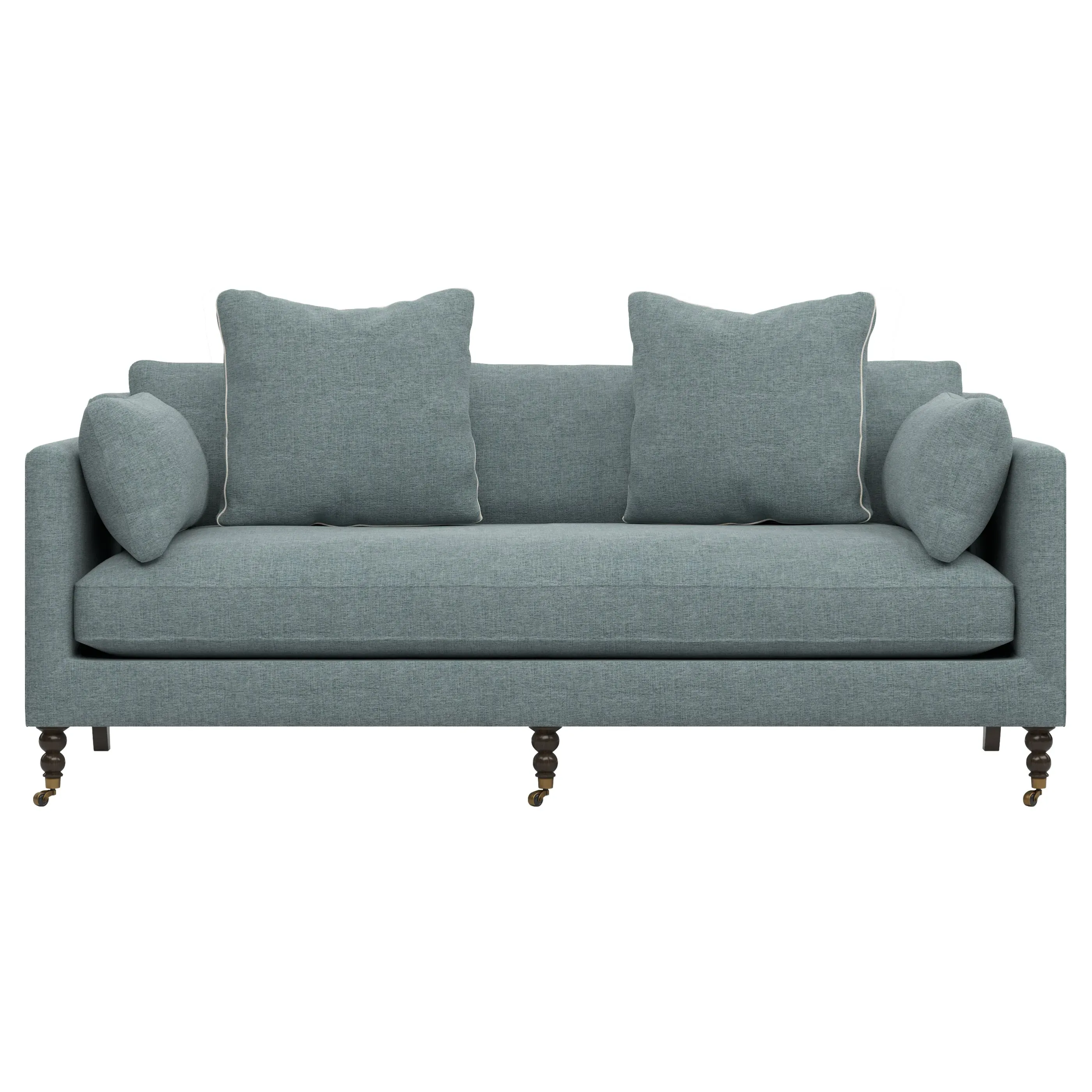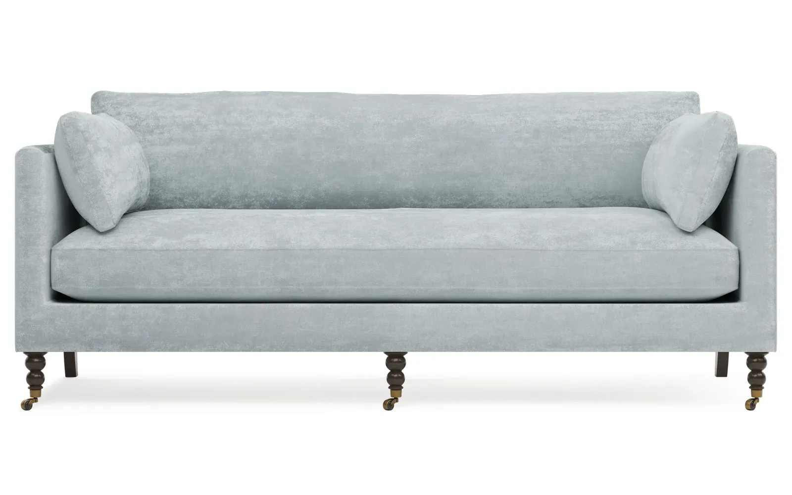 The 84" Madeline sofa elevates any modern or traditional home. Turned wood legs with brass casters in the front pair beautifully with curved legs in the back, dressing up the silhouette. Soft yet supportive, the seat cushion is designed for supreme comfort, with a foam core surrounded by a blend of fiber, down, and feather fill. A pair of bolster pillows flanks the sophisticated bench seat. Choose from a variety of upholstery options, including linen, velvet, and performance fabrics. <b>Overall Dimensions:</b> 84" W x 40" D x 34" H. <b>Seat Dimensions:</b> 24” D x 21” H; <b>Distance Between Arms:</b> 62”; <b>Arm Height:</b> 29”; <b>Leg Height:</b> 7”. <b>Materials:</b> FSC®️-certified, US-sourced, formaldehyde-free, solid kiln-dried hardwood and furniture-grade laminates, metal and vulcanized rubber casters. <b>Material Finishes:</b> Espresso legs, brass casters. <b>Cushion Fill:</b> A CertiPUR-US®️ certified, high-resiliency foam core wrapped with a super soft foam layer then inserted into a channel-quilted casing filled with a blend of 50% fiber, 5% down, and 45% feather.
