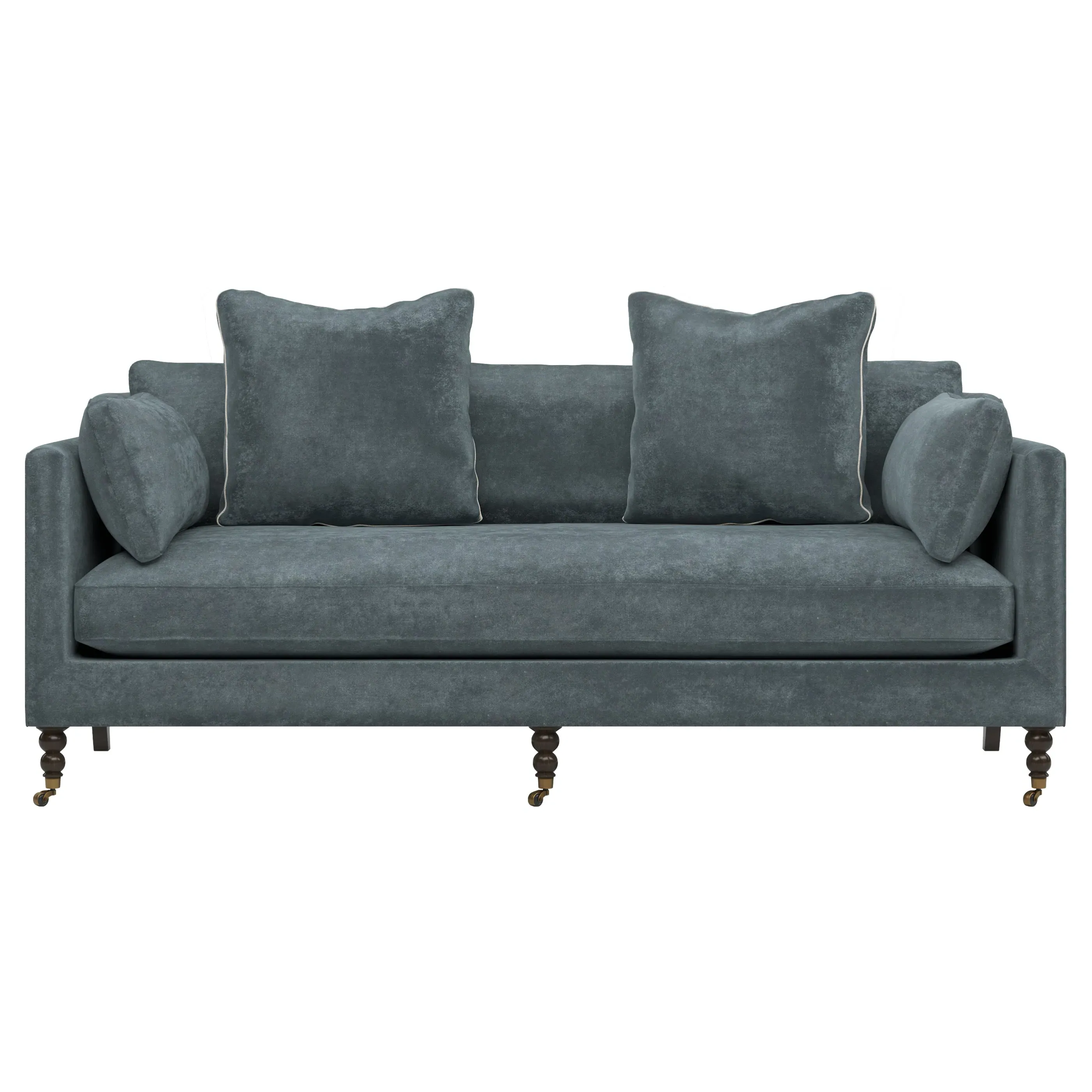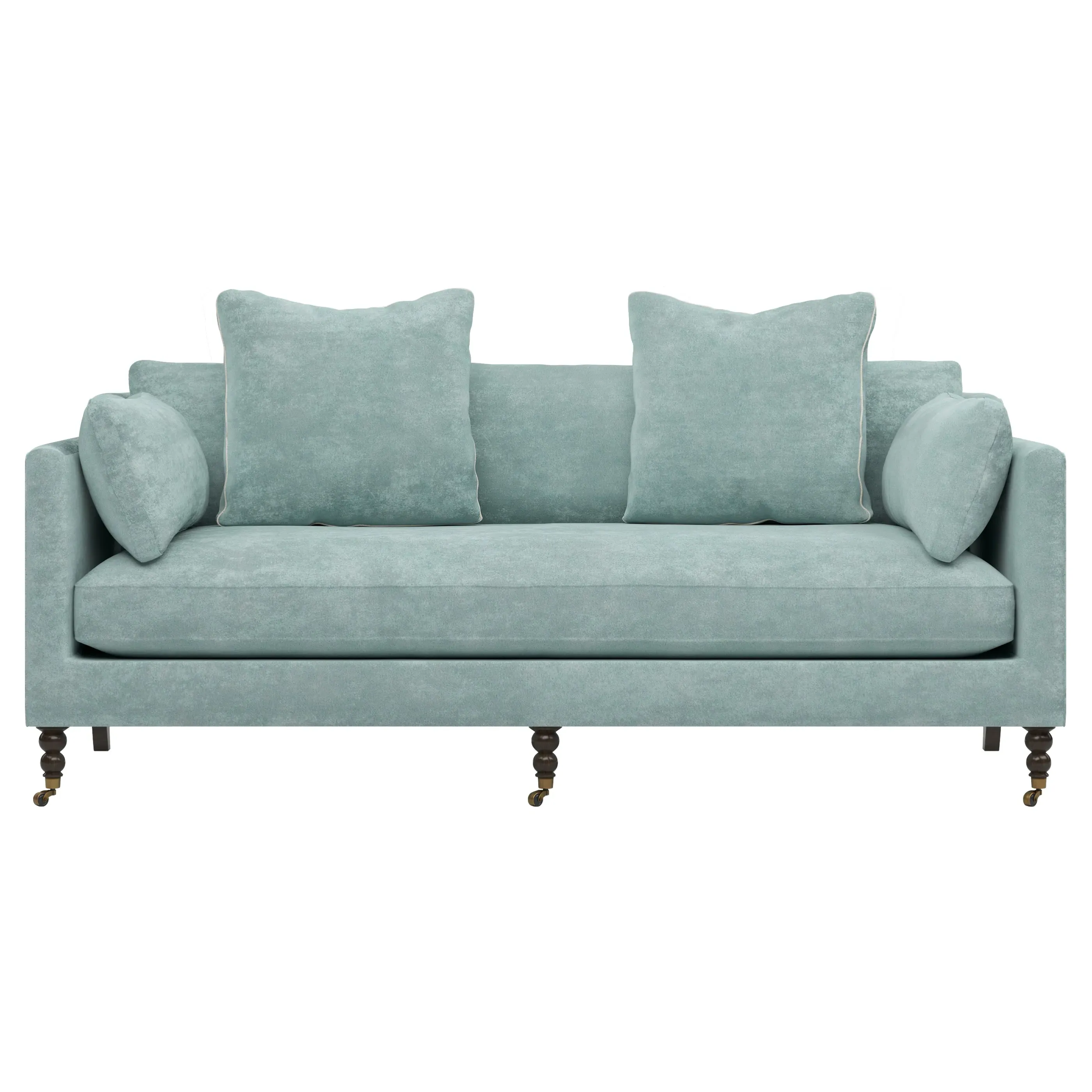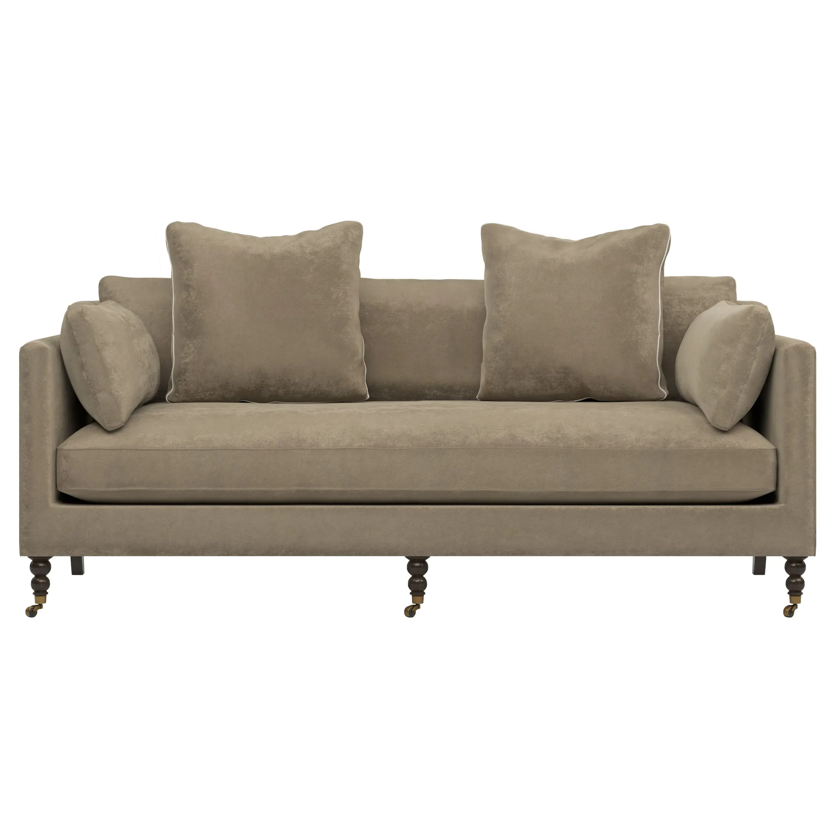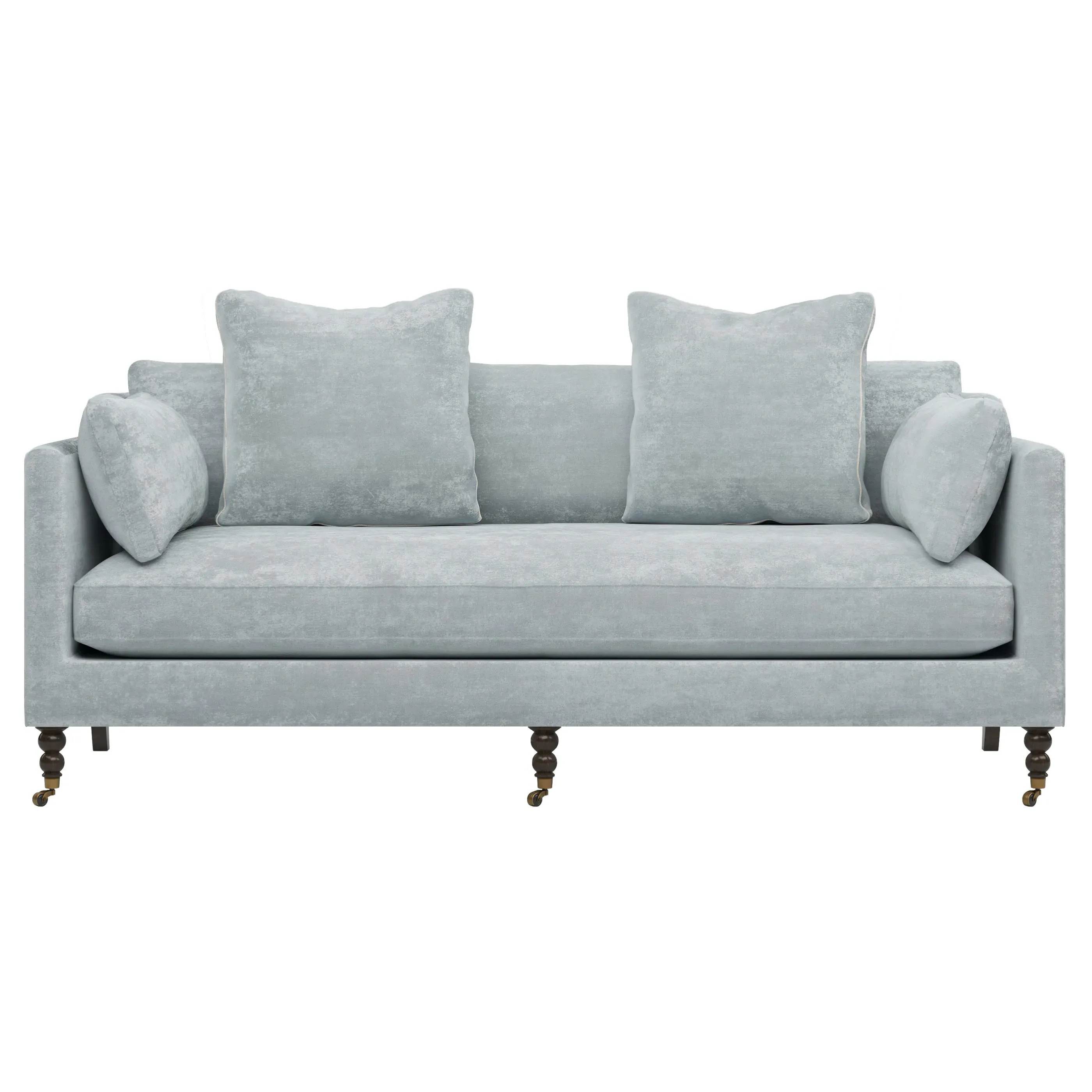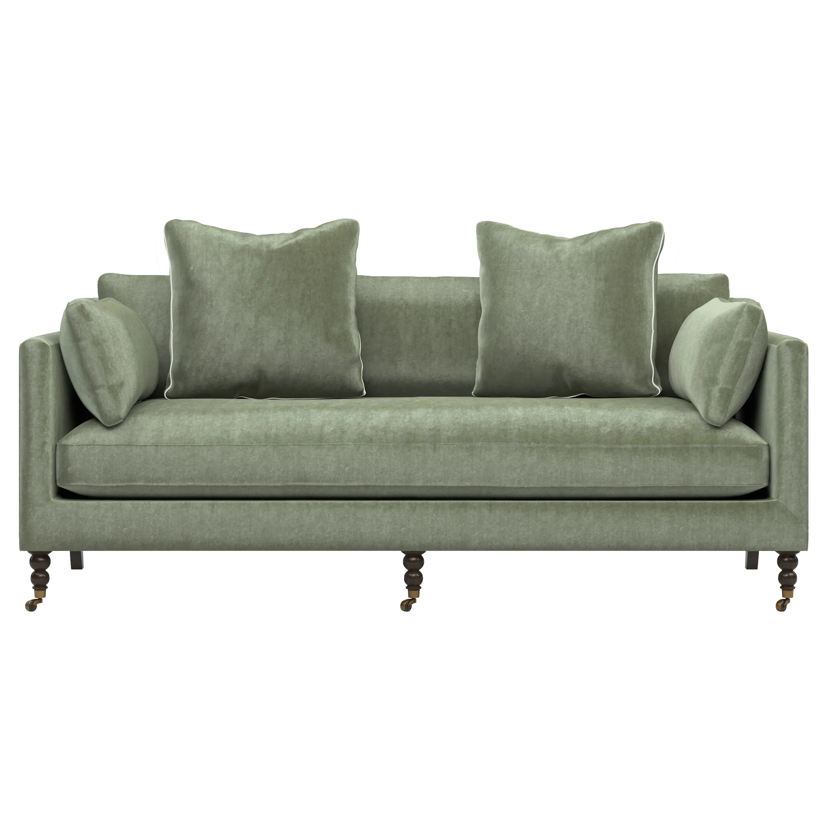 The 84" Madeline sofa elevates any modern or traditional home. Turned wood legs with brass casters in the front pair beautifully with curved legs in the back, dressing up the silhouette. Soft yet supportive, the seat cushion is designed for supreme comfort, with a foam core surrounded by a blend of fiber, down, and feather fill. A pair of bolster pillows flanks the sophisticated bench seat. Choose from a variety of upholstery options, including linen, velvet, and performance fabrics. <b>Overall Dimensions:</b> 84" W x 40" D x 34" H. <b>Seat Dimensions:</b> 24” D x 21” H; <b>Distance Between Arms:</b> 62”; <b>Arm Height:</b> 29”; <b>Leg Height:</b> 7”. <b>Materials:</b> FSC®️-certified, US-sourced, formaldehyde-free, solid kiln-dried hardwood and furniture-grade laminates, metal and vulcanized rubber casters. <b>Material Finishes:</b> Espresso legs, brass casters. <b>Cushion Fill:</b> A CertiPUR-US®️ certified, high-resiliency foam core wrapped with a super soft foam layer then inserted into a channel-quilted casing filled with a blend of 50% fiber, 5% down, and 45% feather.
