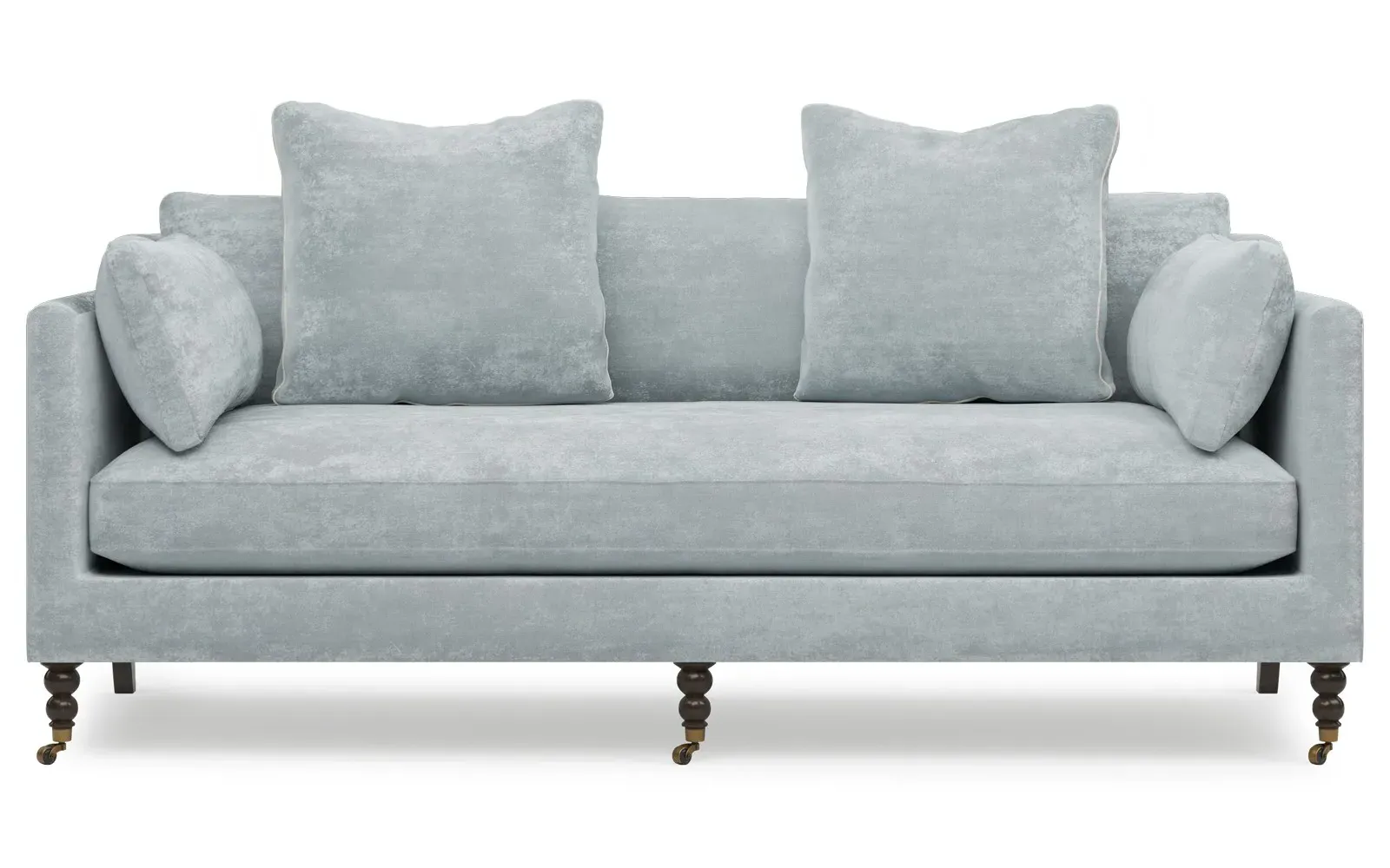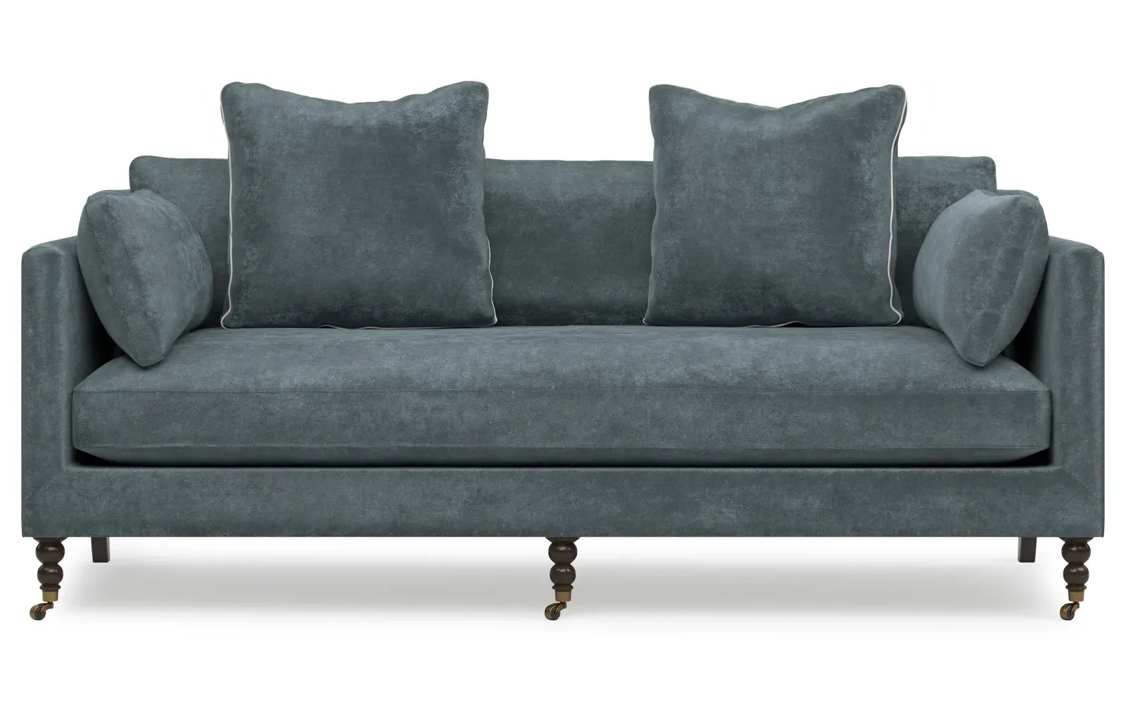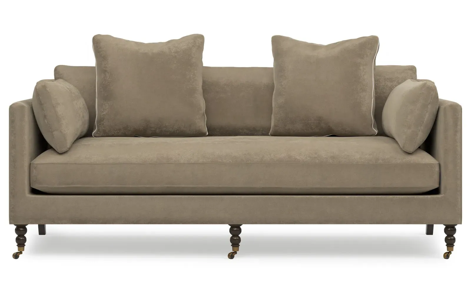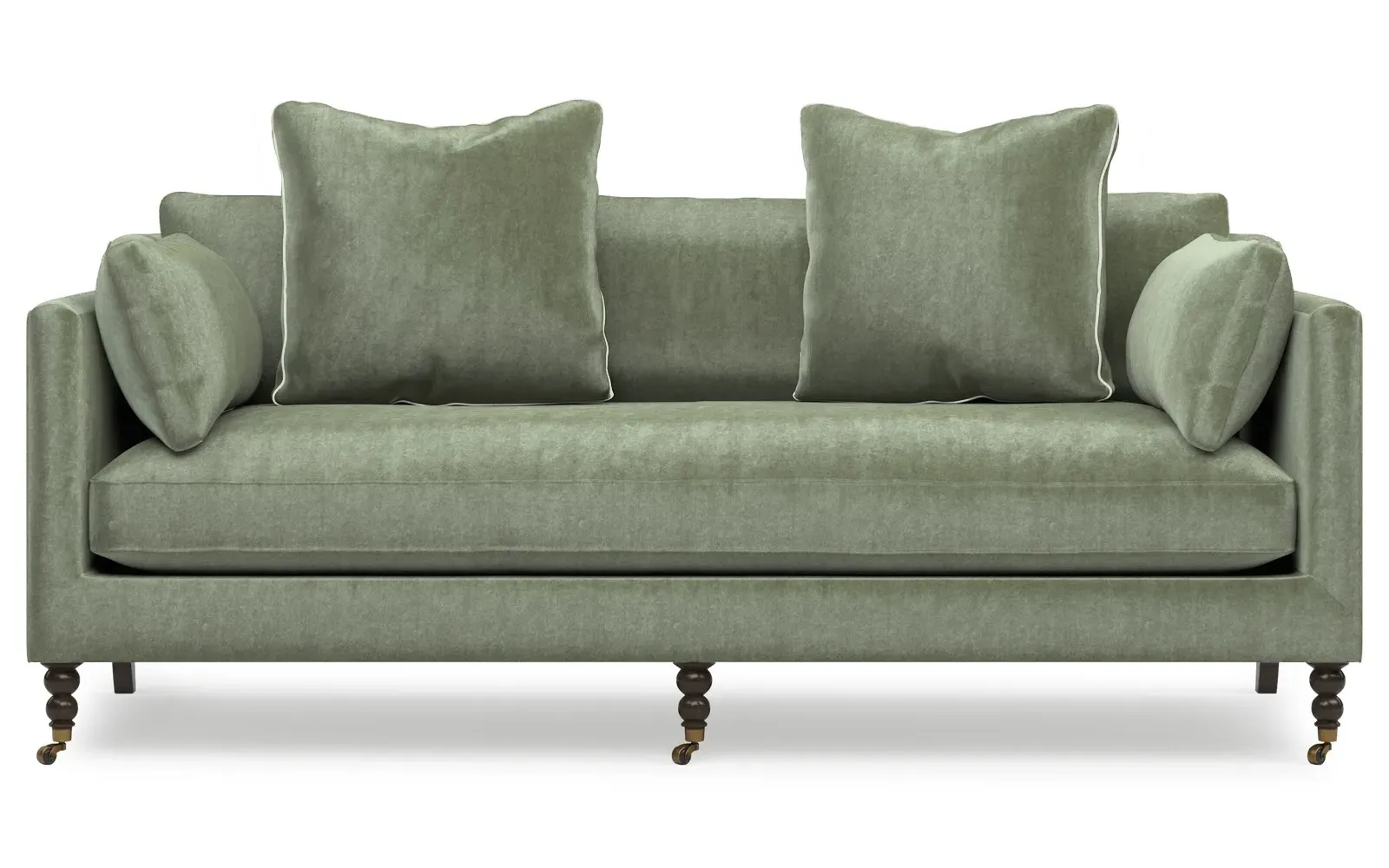 The 84" Madeline sofa elevates any modern or traditional home. Turned wood legs with brass casters in the front pair beautifully with curved legs in the back, dressing up the silhouette. Soft yet supportive, the seat cushion is designed for supreme comfort, with a foam core surrounded by a blend of fiber, down, and feather fill. A pair of bolster pillows flanks the sophisticated bench seat. Choose from a variety of upholstery options, including linen, velvet, and performance fabrics. <b>Overall Dimensions:</b> 84" W x 40" D x 34" H. <b>Seat Dimensions:</b> 24” D x 21” H; <b>Distance Between Arms:</b> 62”; <b>Arm Height:</b> 29”; <b>Leg Height:</b> 7”. <b>Materials:</b> FSC®️-certified, US-sourced, formaldehyde-free, solid kiln-dried hardwood and furniture-grade laminates, metal and vulcanized rubber casters. <b>Material Finishes:</b> Espresso legs, brass casters. <b>Cushion Fill:</b> A CertiPUR-US®️ certified, high-resiliency foam core wrapped with a super soft foam layer then inserted into a channel-quilted casing filled with a blend of 50% fiber, 5% down, and 45% feather.