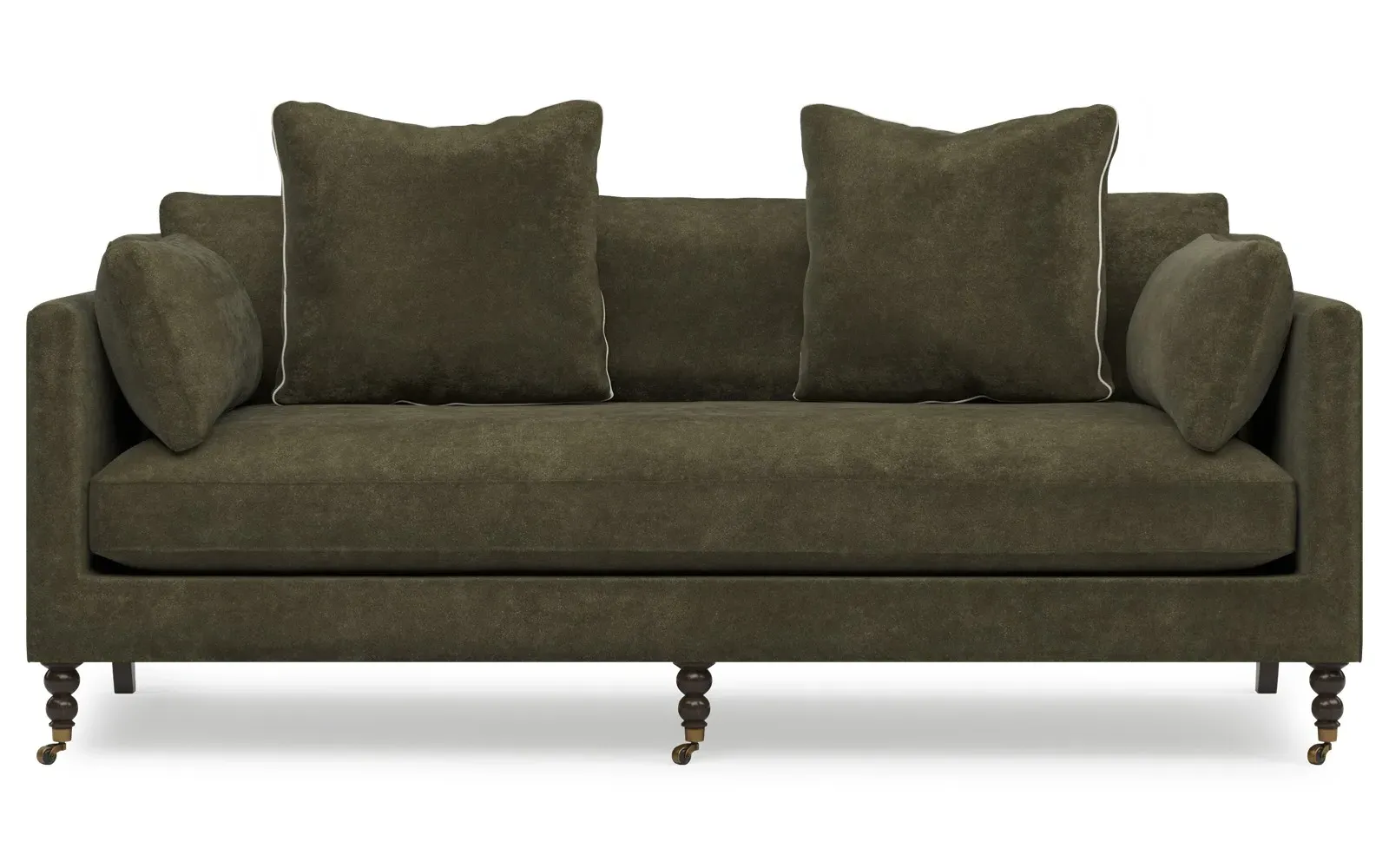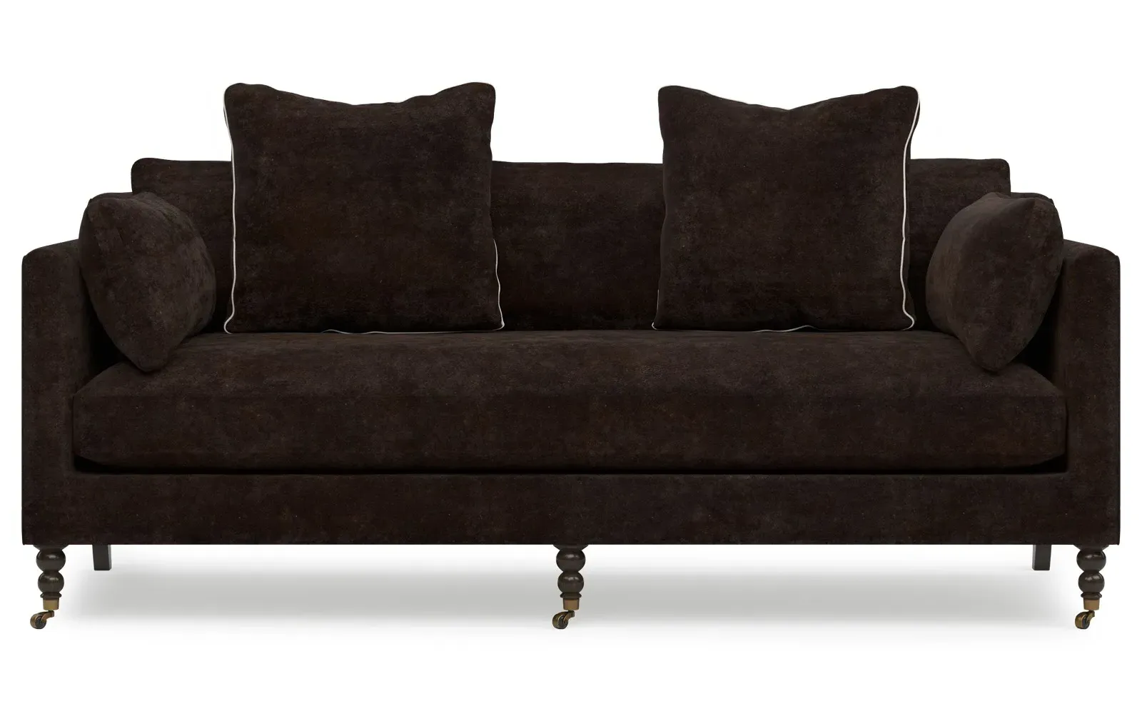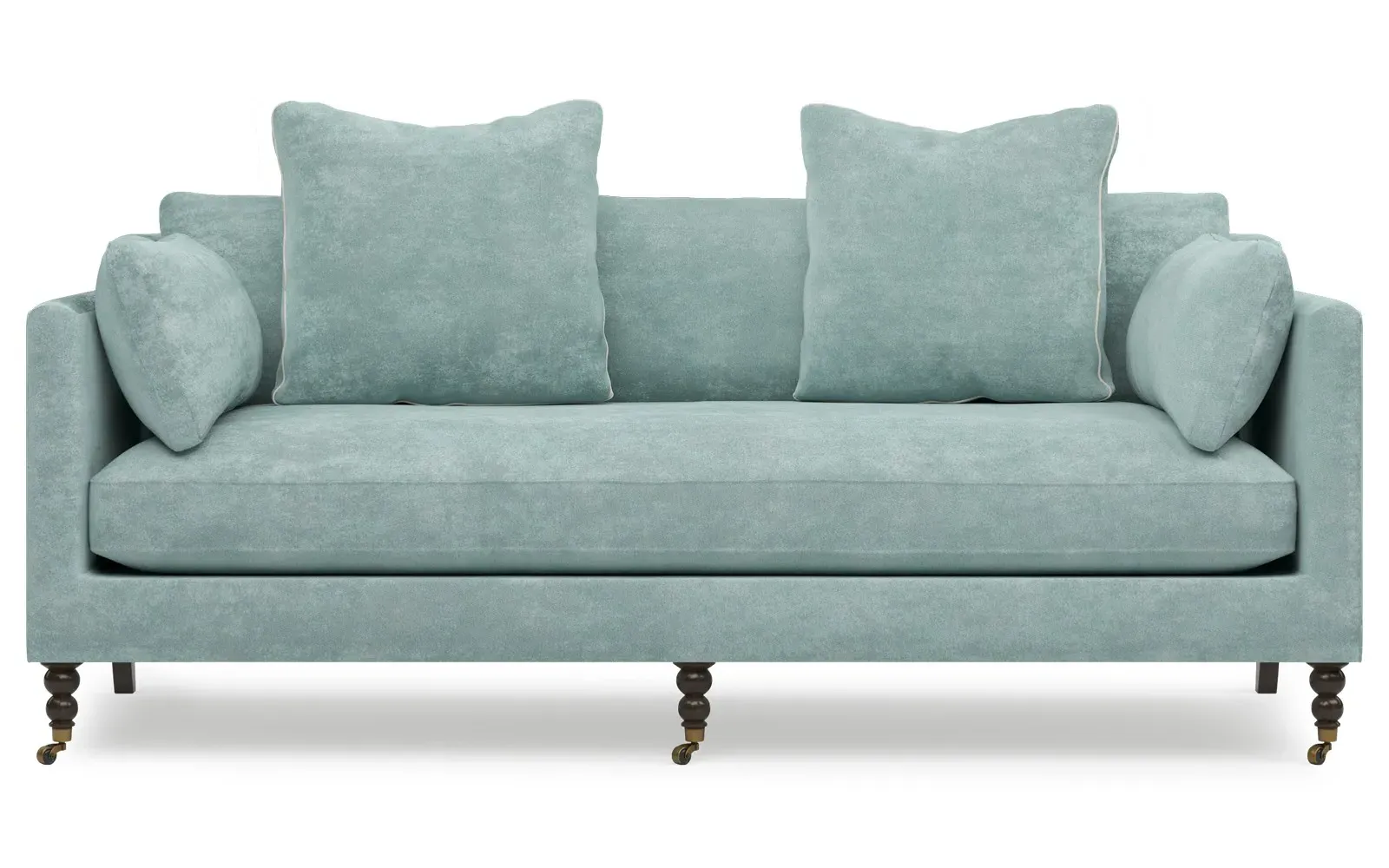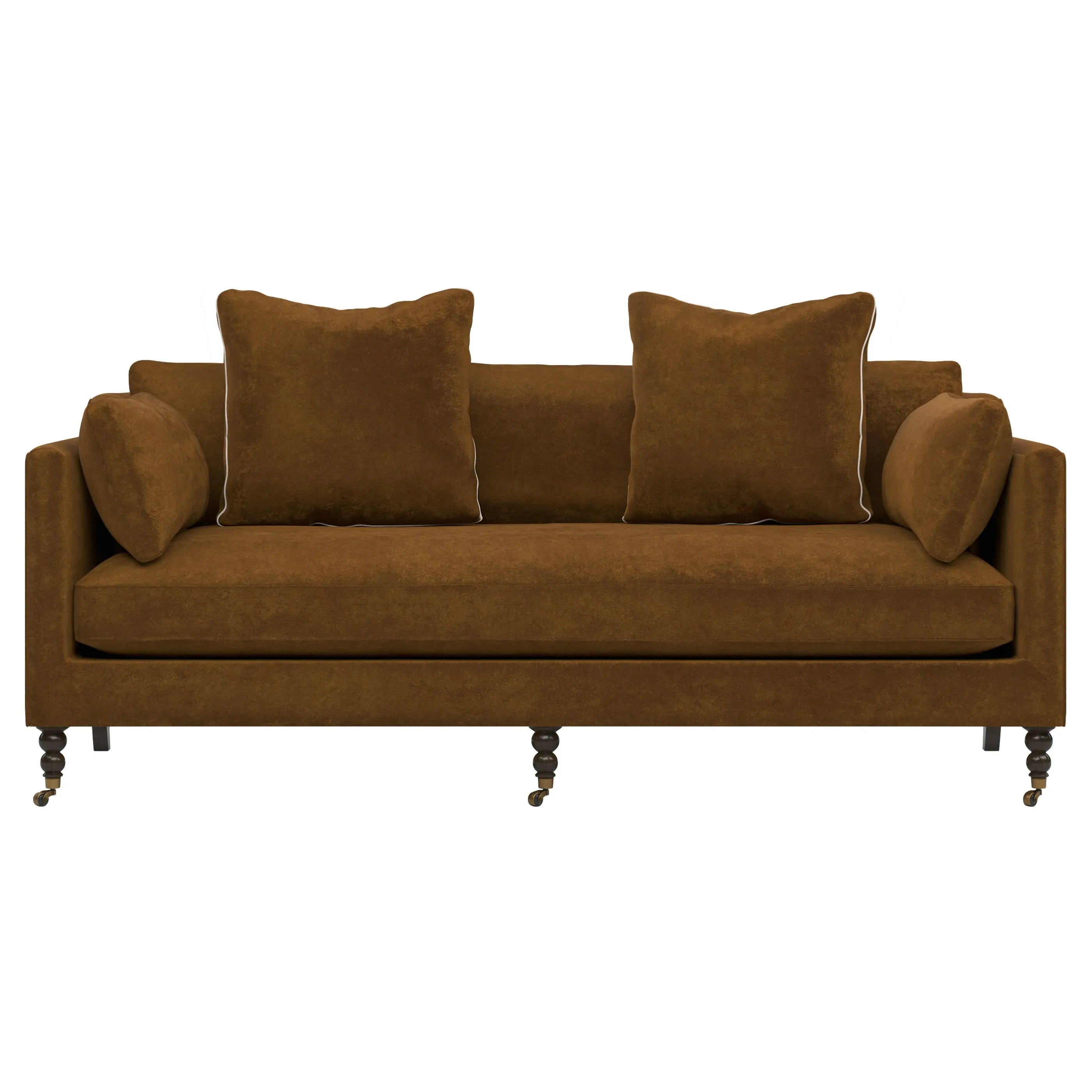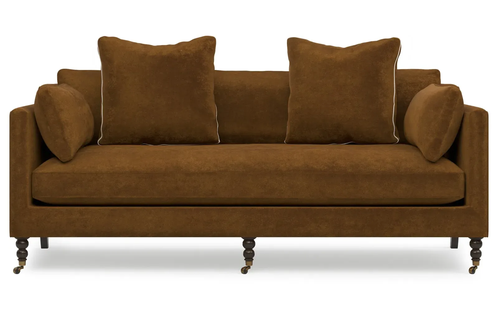 The 84" Madeline sofa elevates any modern or traditional home. Turned wood legs with brass casters in the front pair beautifully with curved legs in the back, dressing up the silhouette. Soft yet supportive, the seat cushion is designed for supreme comfort, with a foam core surrounded by a blend of fiber, down, and feather fill. A pair of bolster pillows flanks the sophisticated bench seat. Choose from a variety of upholstery options, including linen, velvet, and performance fabrics. <b>Overall Dimensions:</b> 84" W x 40" D x 34" H. <b>Seat Dimensions:</b> 24” D x 21” H; <b>Distance Between Arms:</b> 62”; <b>Arm Height:</b> 29”; <b>Leg Height:</b> 7”. <b>Materials:</b> FSC®️-certified, US-sourced, formaldehyde-free, solid kiln-dried hardwood and furniture-grade laminates, metal and vulcanized rubber casters. <b>Material Finishes:</b> Espresso legs, brass casters. <b>Cushion Fill:</b> A CertiPUR-US®️ certified, high-resiliency foam core wrapped with a super soft foam layer then inserted into a channel-quilted casing filled with a blend of 50% fiber, 5% down, and 45% feather.