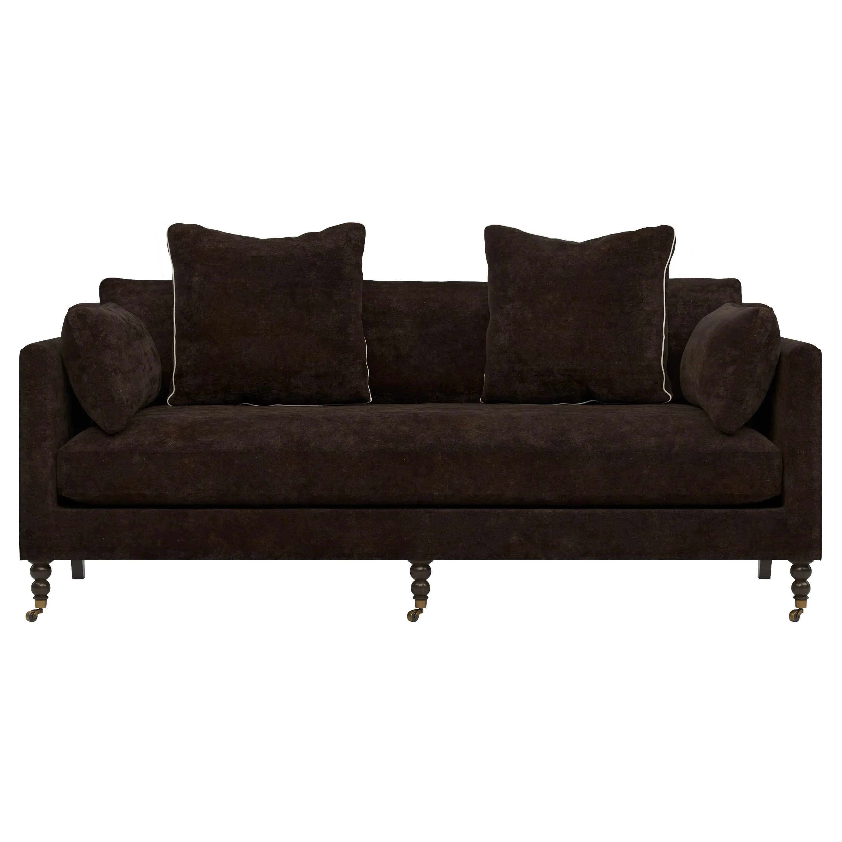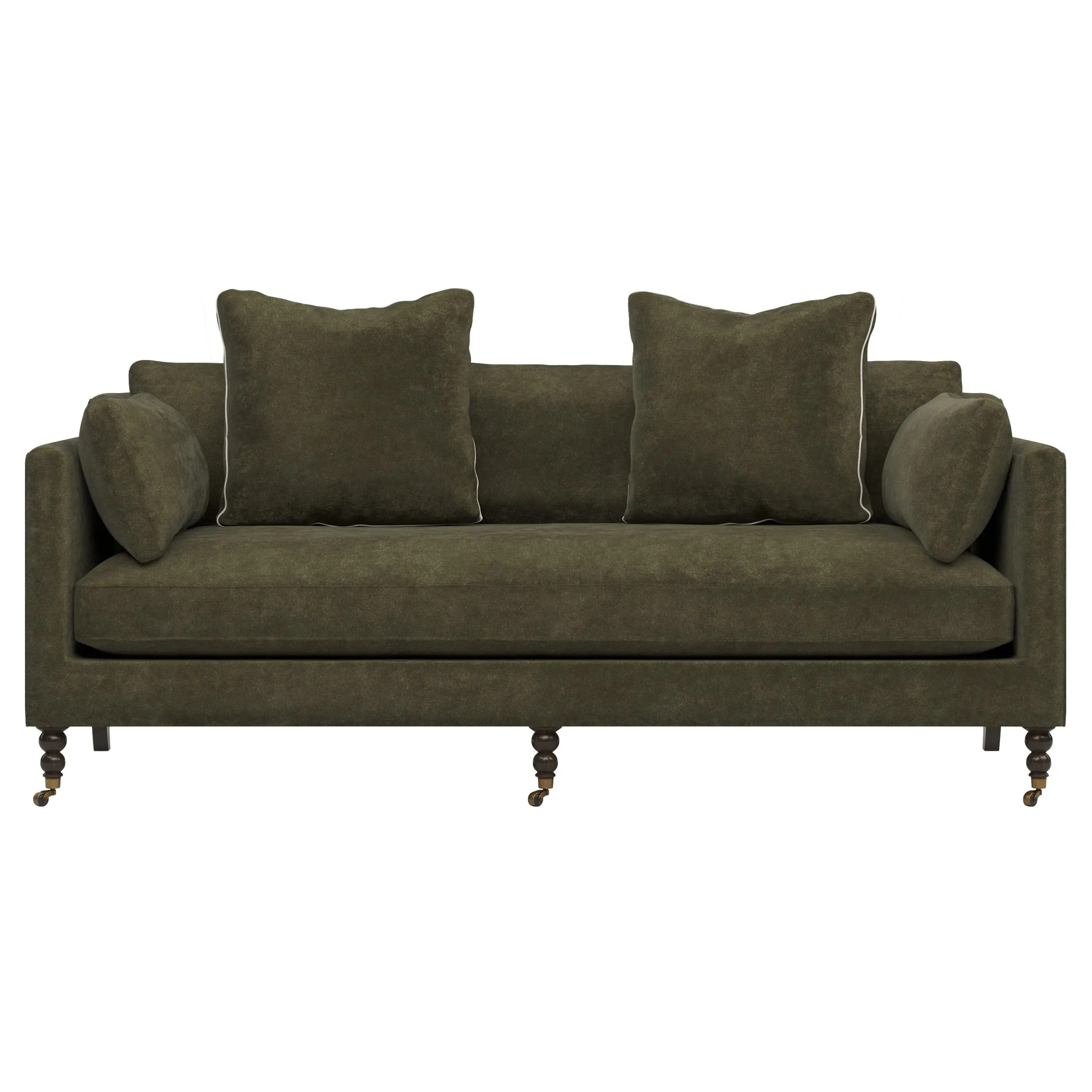 The Madeline sofa offers comfort with its foam core surrounded by fiber, down, and feather fill. Its turned wood legs feature brass casters in the front while curved legs in the back create an appealing silhouette. The bench seat includes bolster pillows for added support, and the FSC-certified hardwood construction ensures durability. W213 x D102 x H86 cm.