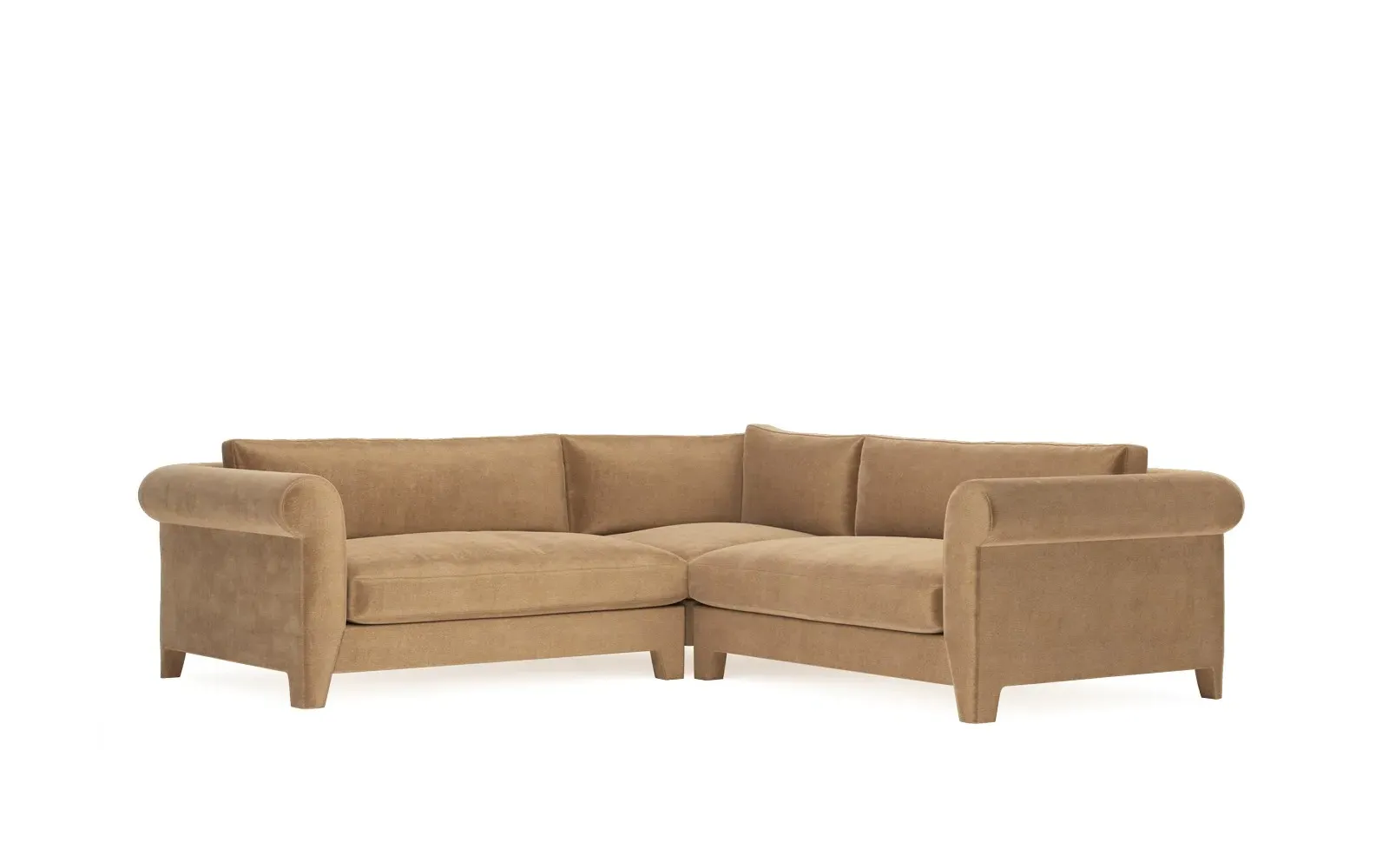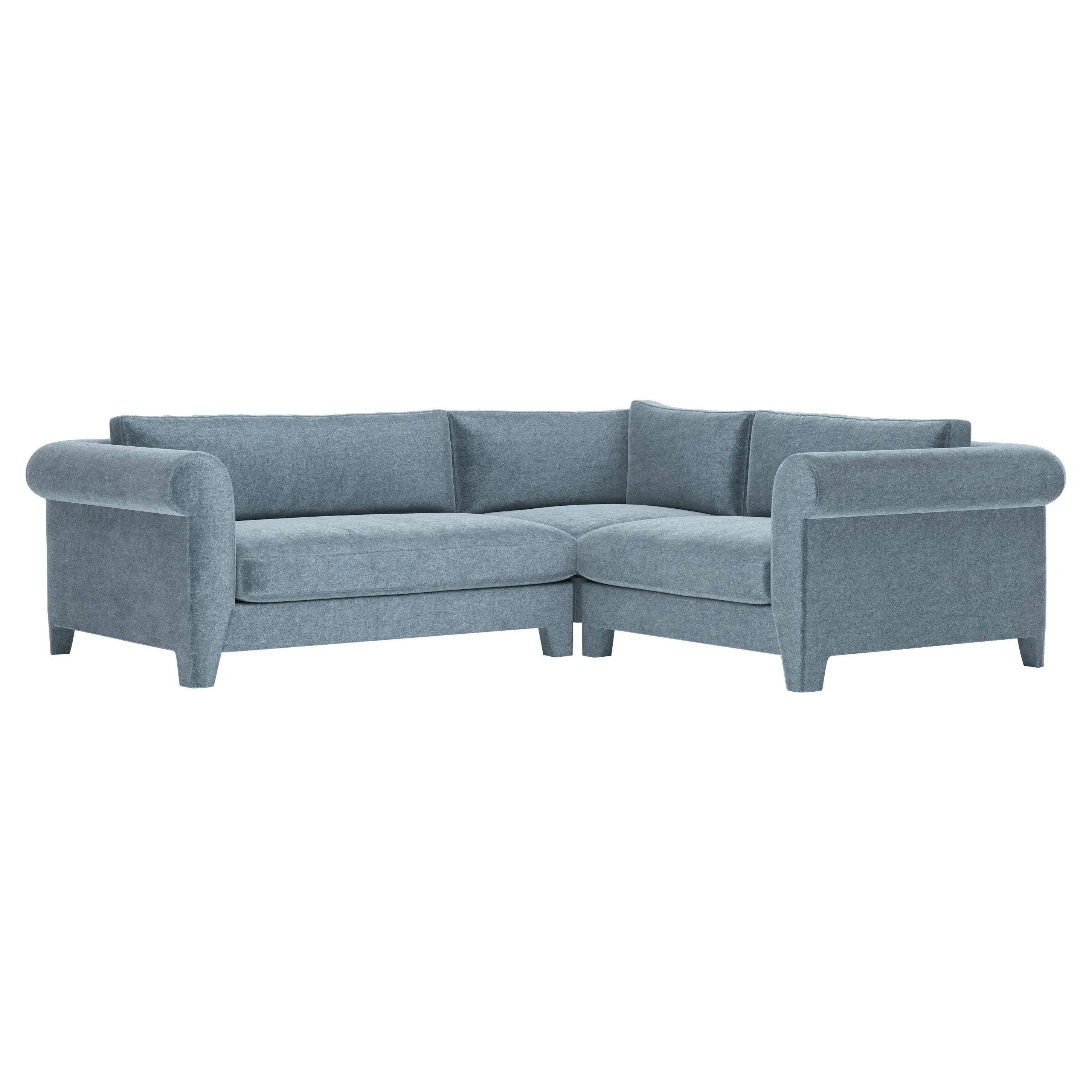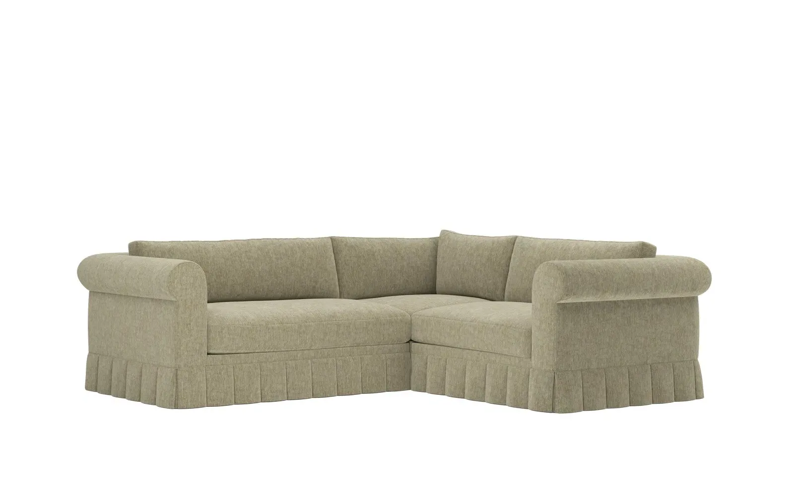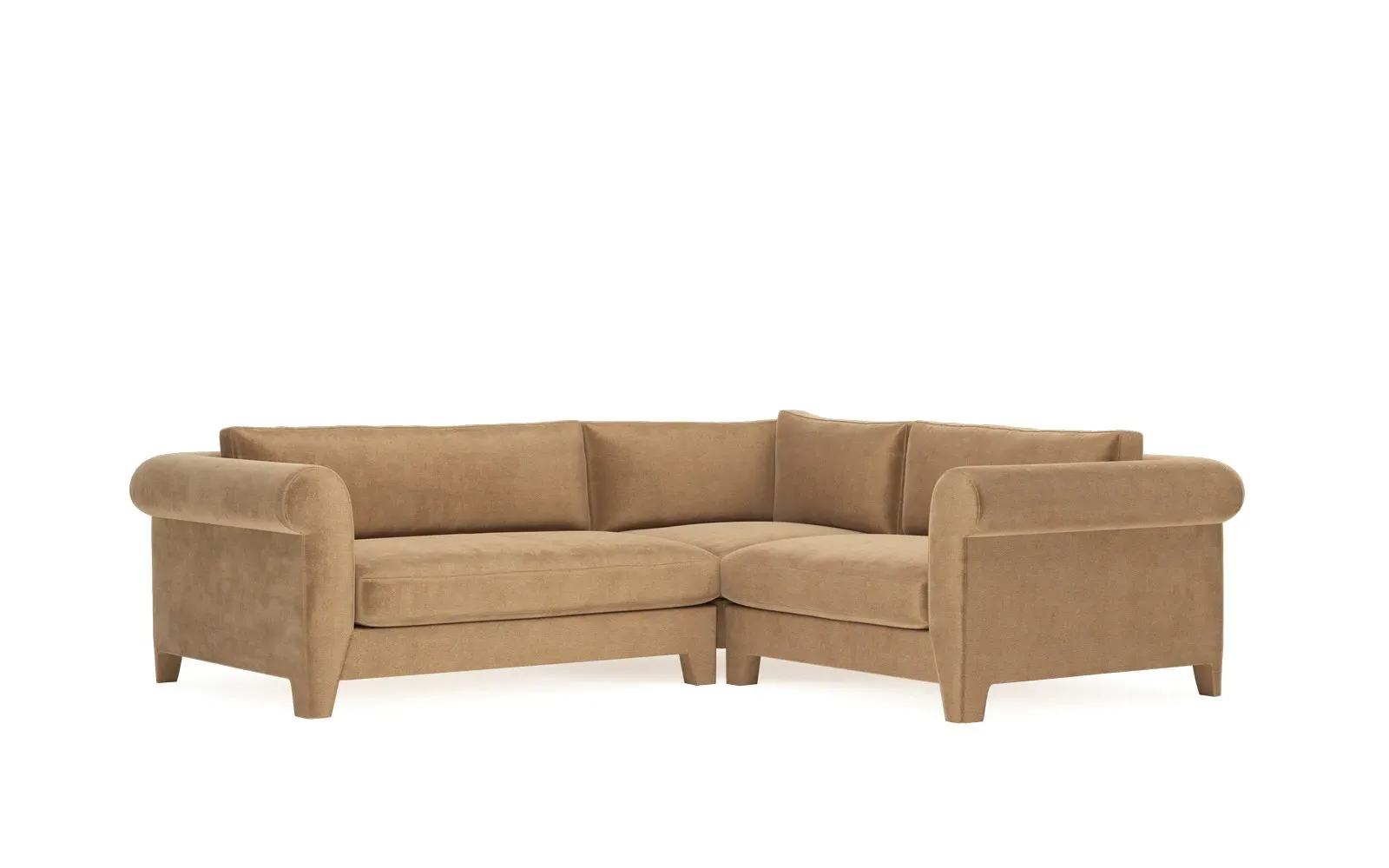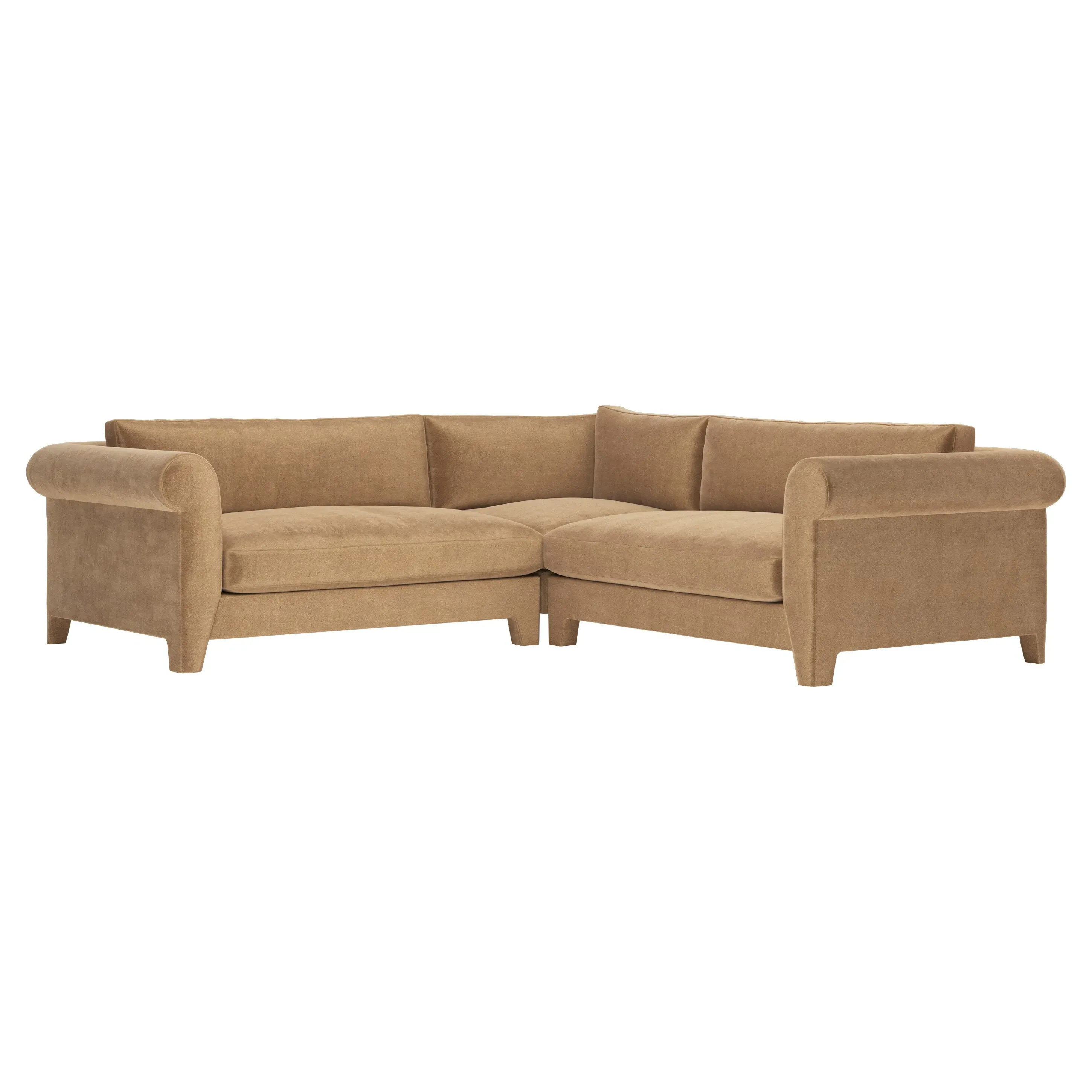 The McKinley Corner Sectional offers spacious seating with its three-piece configuration, featuring a left large one-arm sofa, corner seat, and right small one-arm sofa. Its hardwood and plywood construction provides lasting durability, while the 25-inch seat depth ensures comfortable lounging. The 4-inch legs elevate the frame for easy cleaning underneath, and the 28-inch arm height adds supportive comfort. W267 x D234 x H79 cm.