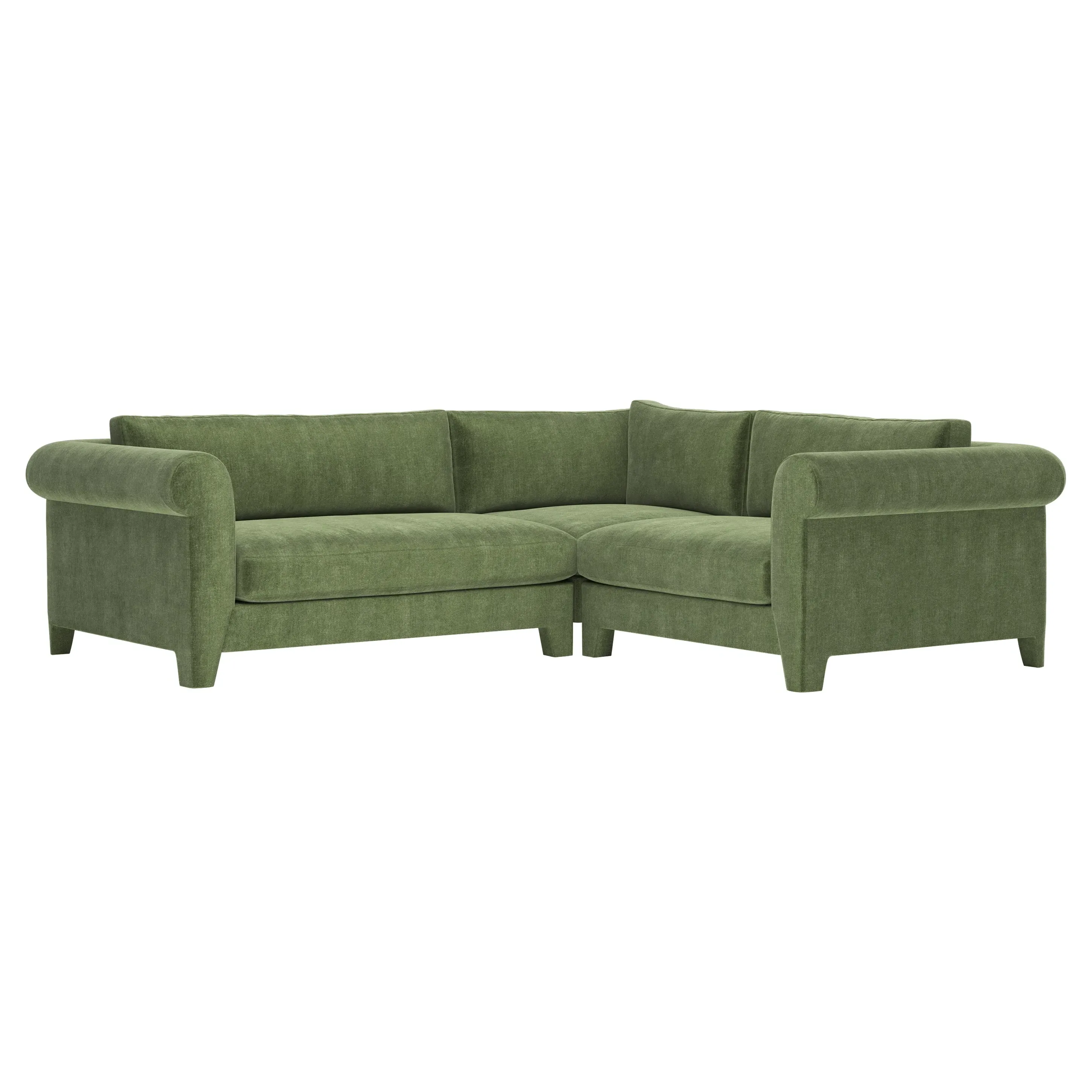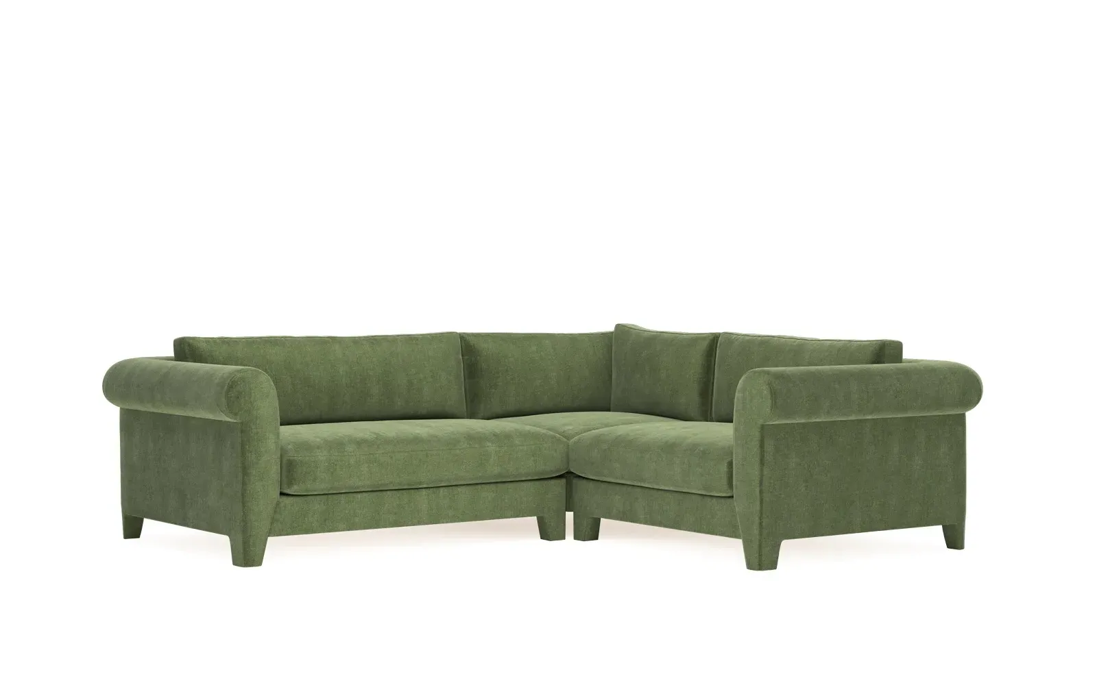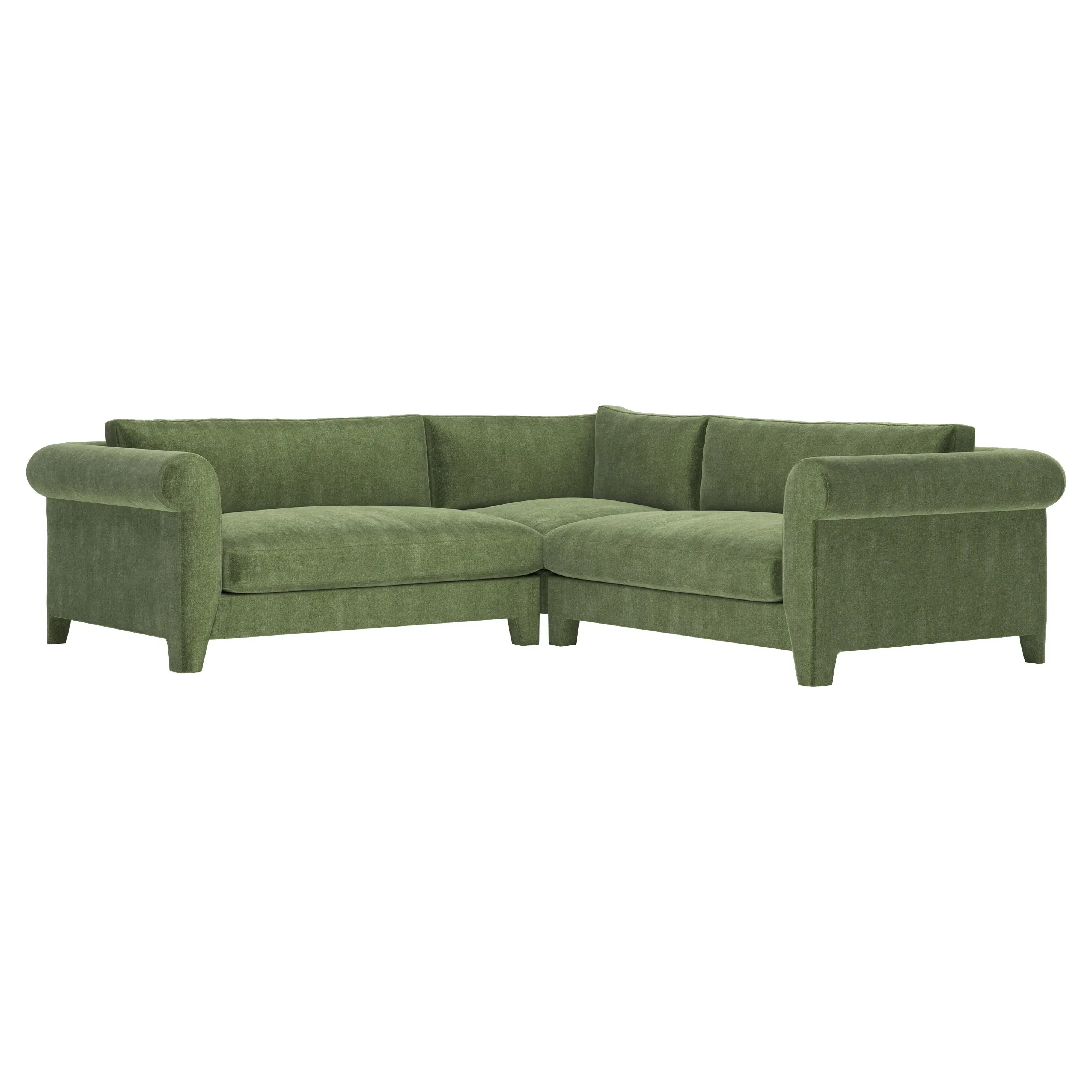 <b>Overall Dimensions:</b> 105" W x 92" D x 31" H. <b>Large One-Arm Sofa Dimensions:</b> 64" W x 41" D x 31" H; <b>Small One-Arm Sofa Dimensions:</b> 51" W x 41" D x 31" H; <b>Corner Seat Dimensions:</b> 41" W x 41" D x 31" H; <b>Seat Dimensions:</b> 25" D x 18" H; <b>Arm Height:</b> 28”; <b>Leg Height:</b> 4”. <b>Materials:</b> Hardwood and plywood. <b>Pieces Included:</b> Left large one-arm sofa, corner seat, right small one-arm sofa.