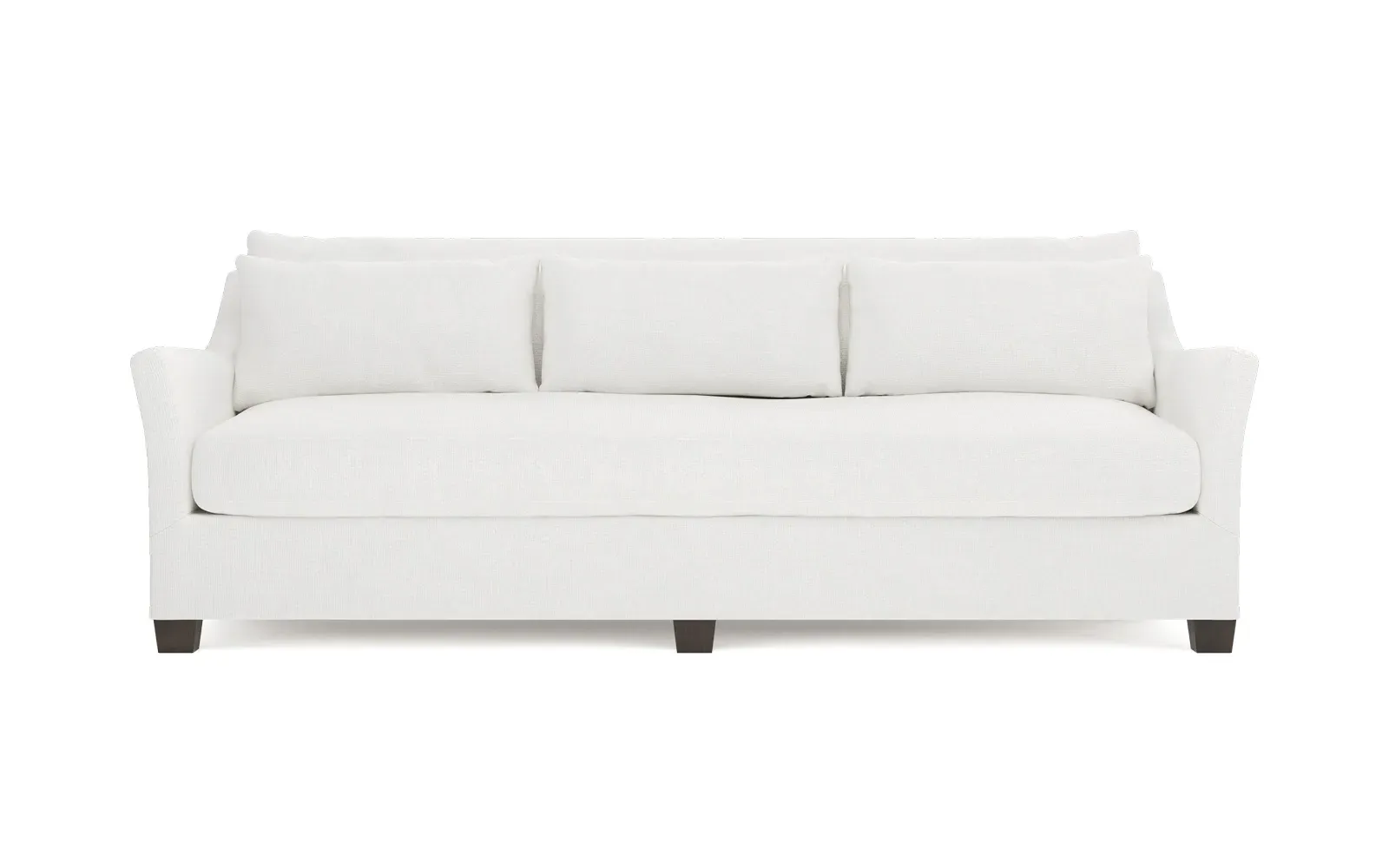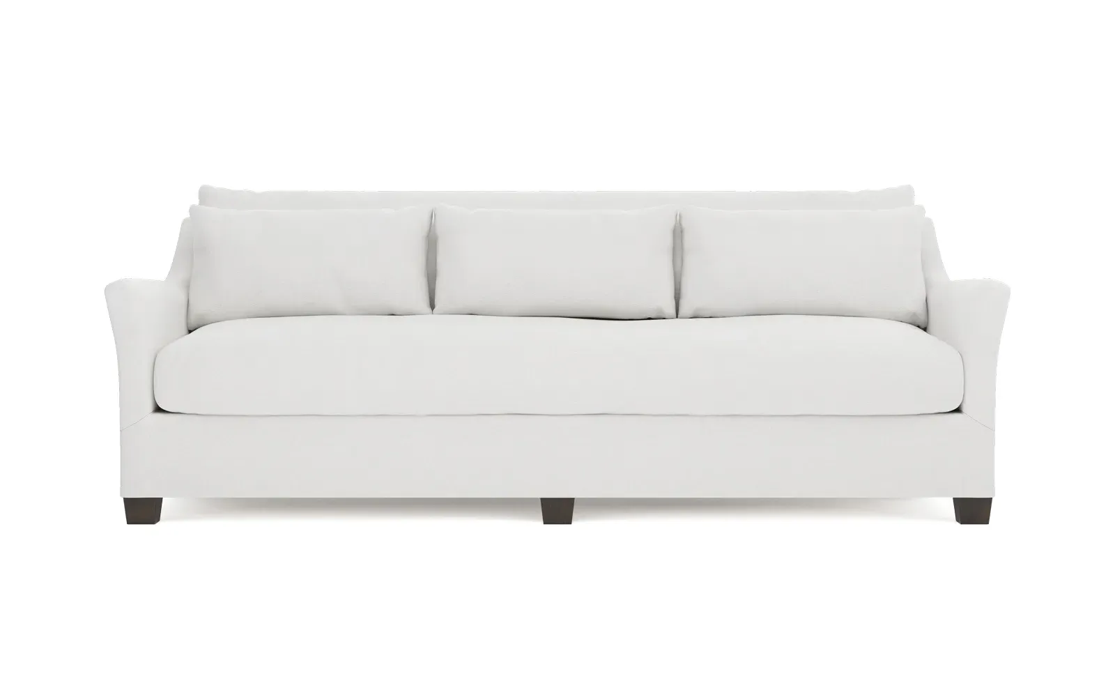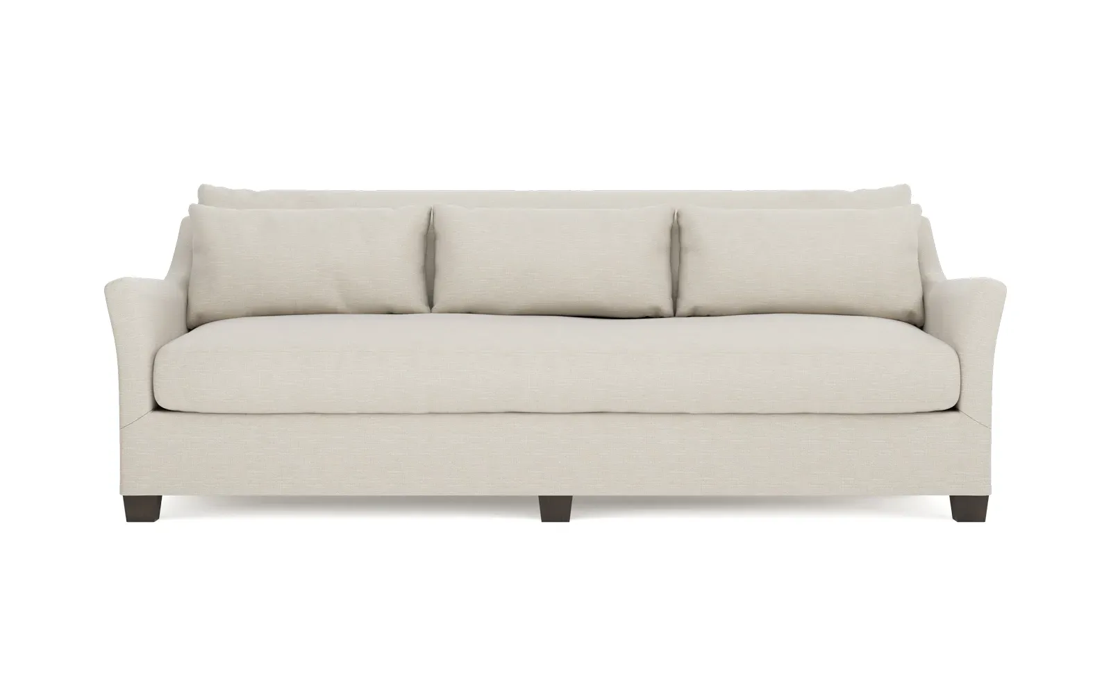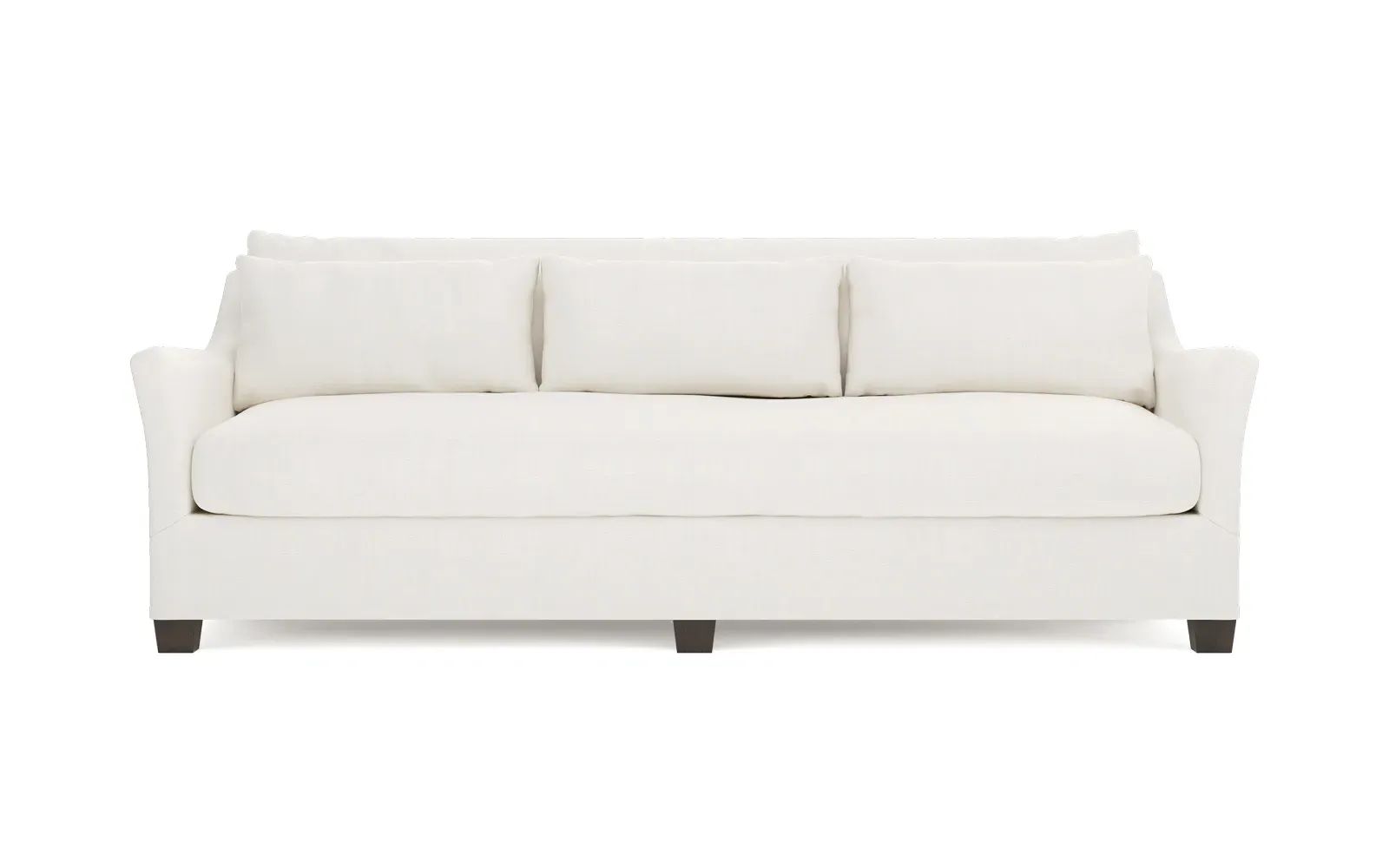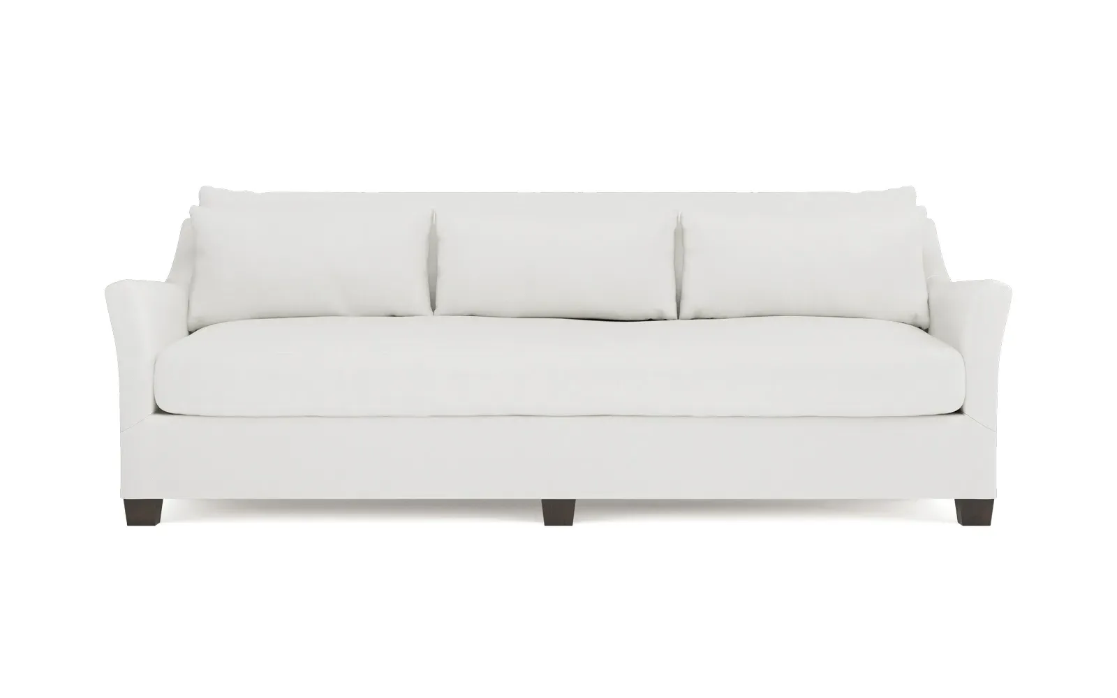 Timeless and versatile, the 98” Pauline sofa is a gracious companion to everyday living. Gently sloped, flared arms and low wood legs accent the elegant silhouette. Soft yet supportive, the bench seat is designed for plush comfort, with a foam core surrounded by a blend of fiber, down, and feather fill. Three lumbar pillows are layered in front of the full-length back pillow for a cozy, tiered effect. Choose from a variety of upholstery options, including linen, velvet, and performance fabrics. <b>Overall Dimensions: </b> 98" W x 41" D x 35" H. <b>Seat Depth: </b>19” to the front of lumbar pillows, 24” to the front of back cushions; <b>Seat Height: </b>22”; <b>Distance Between Arms: </b> 86”; <b>Arm Height: </b> 25”; <b>Leg Height: </b> 3 ½”. <b>Materials:</b> FSC®-certified, US-sourced, formaldehyde-free solid kiln-dried hardwood and furniture-grade laminates. <b>Material Finish: </b> Espresso legs. <b>Cushion Fill: </b>A CertiPUR-US® certified, high-resiliency foam core wrapped with a super soft foam layer then inserted into a channel-quilted casing filled with a blend of 50% fiber, 5% down, and 45% feather.