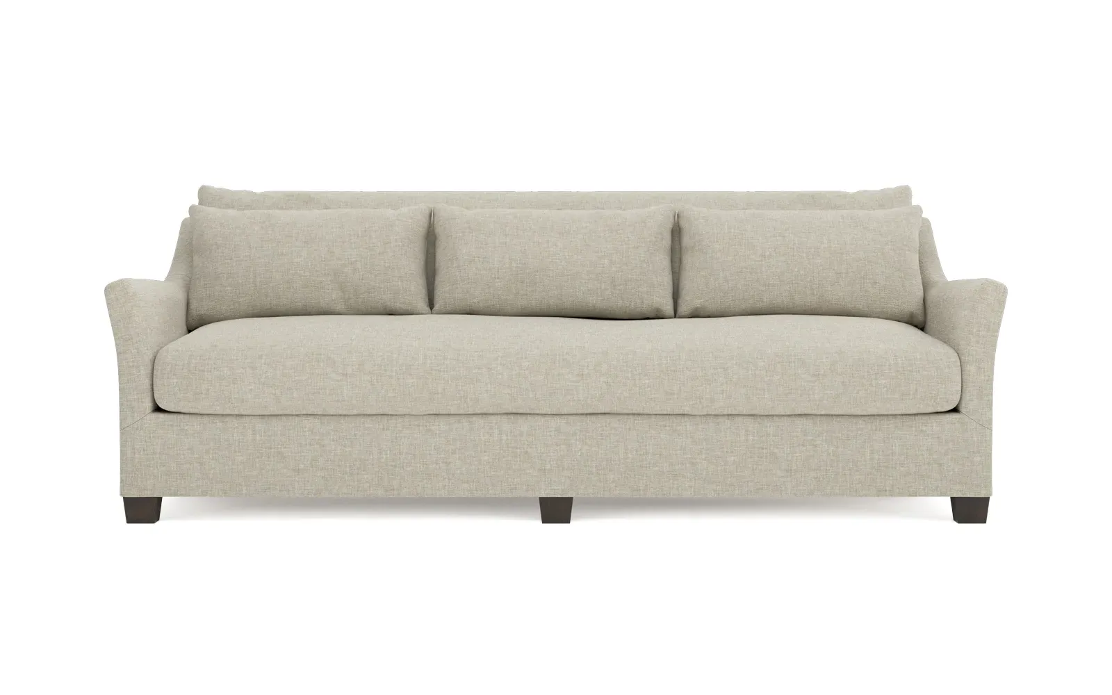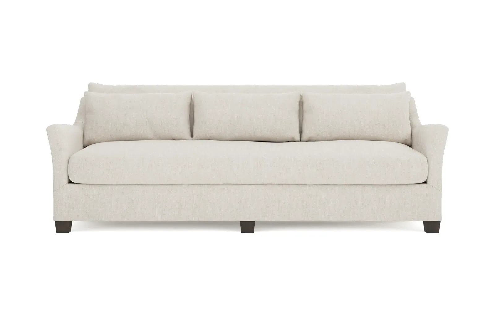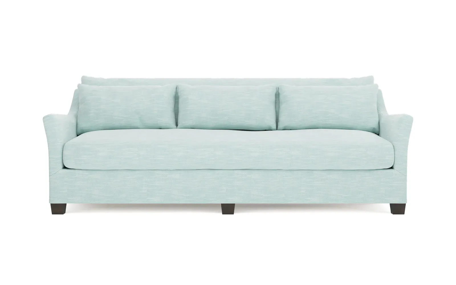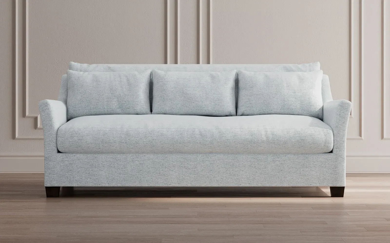 Timeless and versatile, the 98” Pauline sofa is a gracious companion to everyday living. Gently sloped, flared arms and low wood legs accent the elegant silhouette. Soft yet supportive, the bench seat is designed for plush comfort, with a foam core surrounded by a blend of fiber, down, and feather fill. Three lumbar pillows are layered in front of the full-length back pillow for a cozy, tiered effect. Choose from a variety of upholstery options, including linen, velvet, and performance fabrics. <b>Overall Dimensions: </b> 98" W x 41" D x 35" H. <b>Seat Depth: </b>19” to the front of lumbar pillows, 24” to the front of back cushions; <b>Seat Height: </b>22”; <b>Distance Between Arms: </b> 86”; <b>Arm Height: </b> 25”; <b>Leg Height: </b> 3 ½”. <b>Materials:</b> FSC®-certified, US-sourced, formaldehyde-free solid kiln-dried hardwood and furniture-grade laminates. <b>Material Finish: </b> Espresso legs. <b>Cushion Fill: </b>A CertiPUR-US® certified, high-resiliency foam core wrapped with a super soft foam layer then inserted into a channel-quilted casing filled with a blend of 50% fiber, 5% down, and 45% feather.