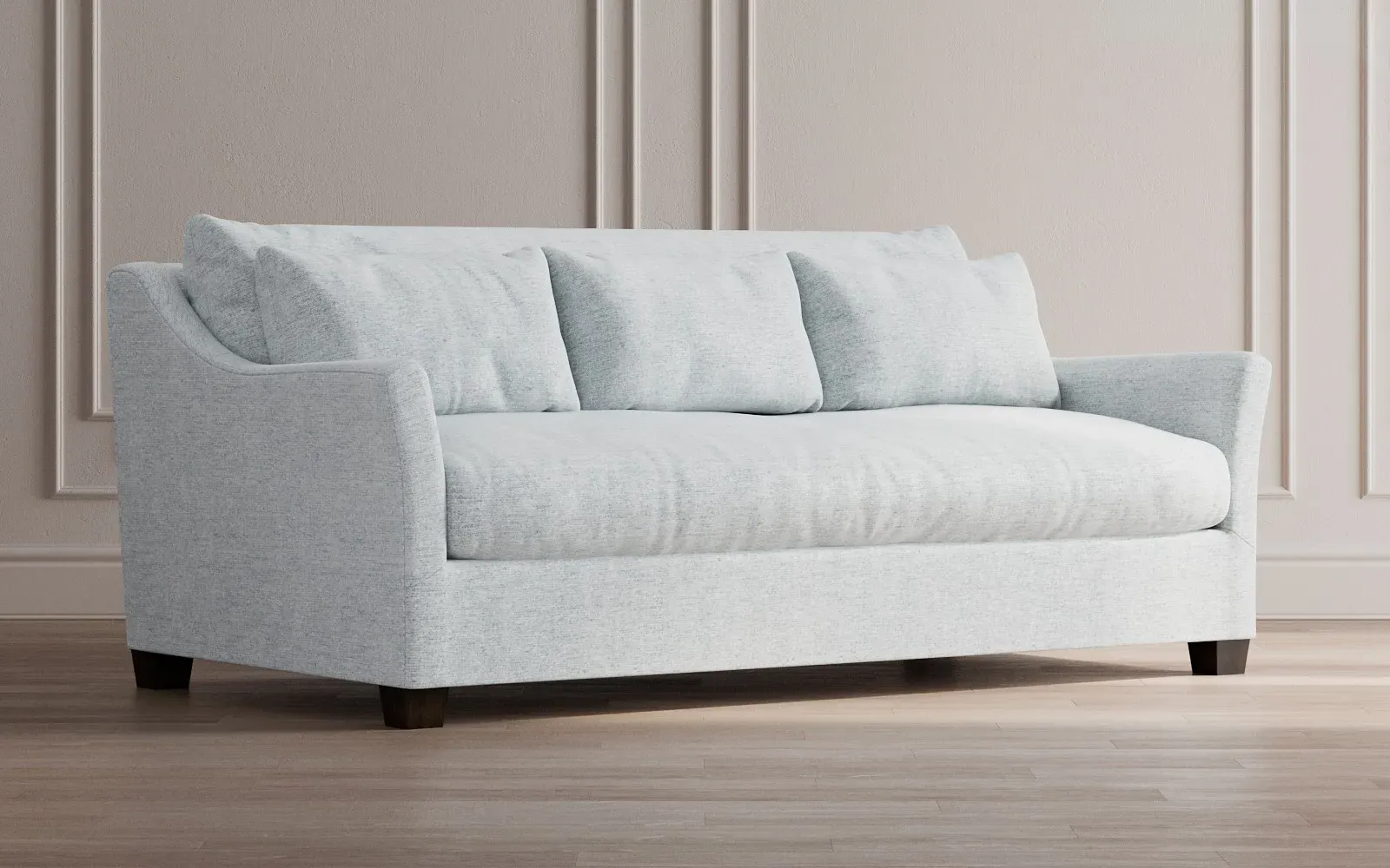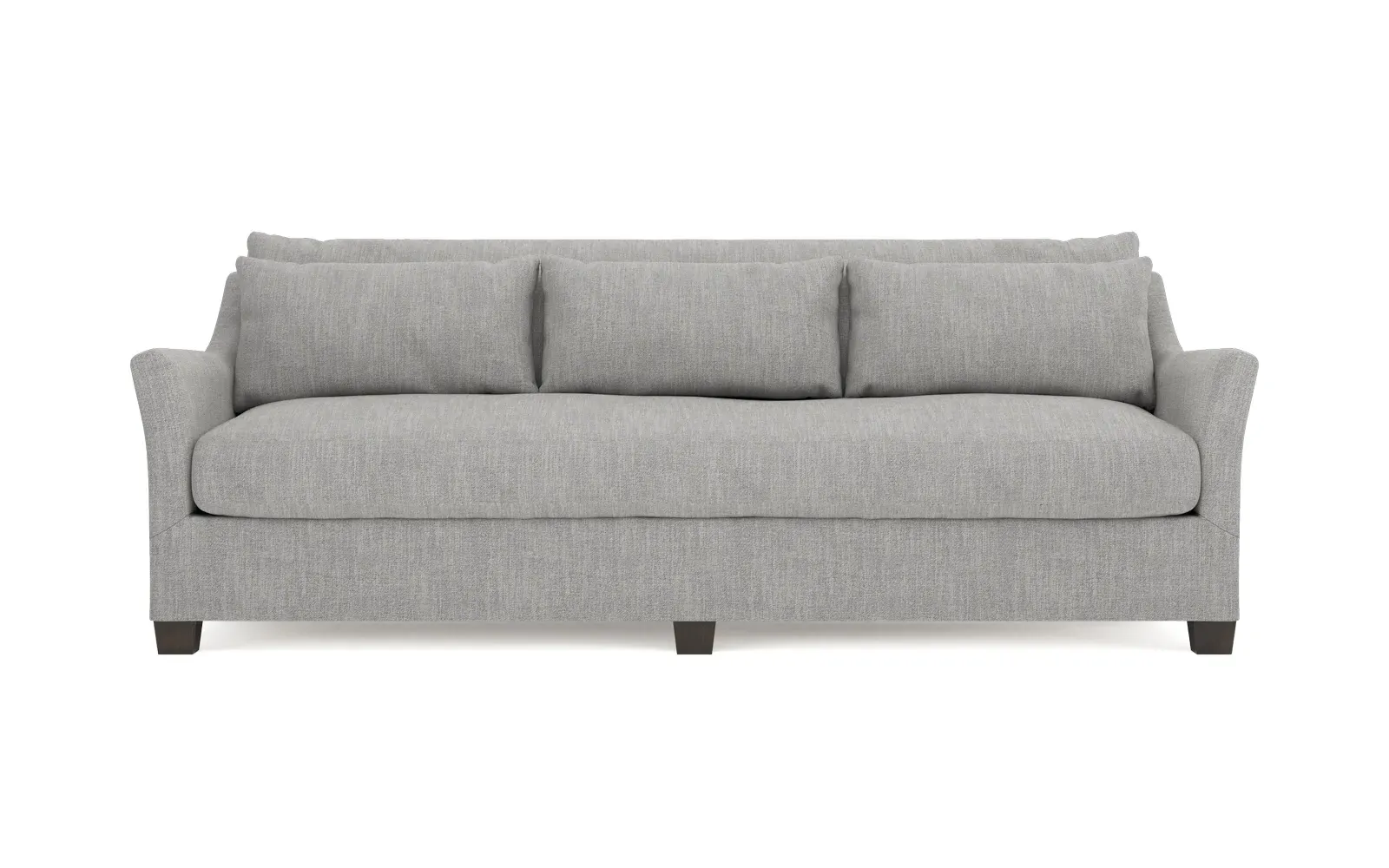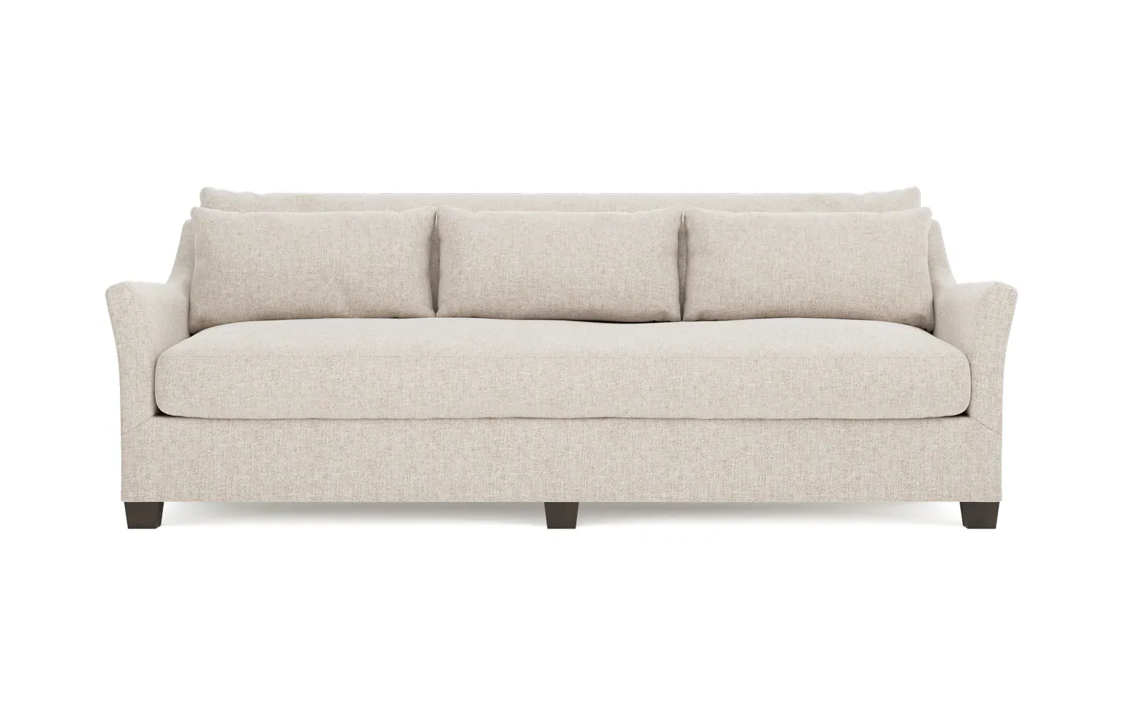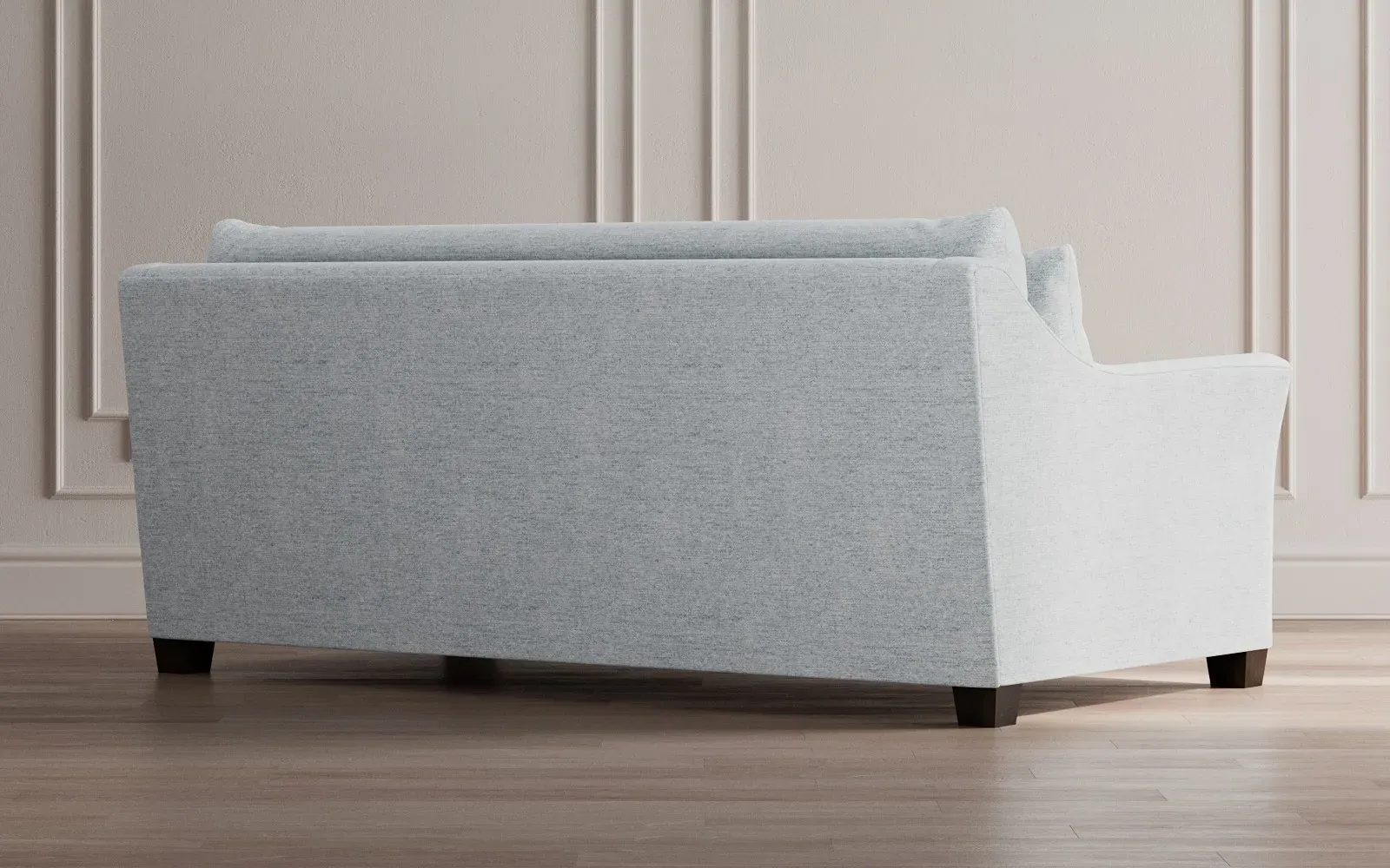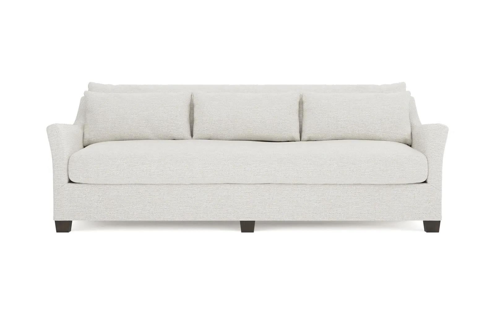 Timeless and versatile, the 98” Pauline sofa is a gracious companion to everyday living. Gently sloped, flared arms and low wood legs accent the elegant silhouette. Soft yet supportive, the bench seat is designed for plush comfort, with a foam core surrounded by a blend of fiber, down, and feather fill. Three lumbar pillows are layered in front of the full-length back pillow for a cozy, tiered effect. Choose from a variety of upholstery options, including linen, velvet, and performance fabrics. <b>Overall Dimensions: </b> 98" W x 41" D x 35" H. <b>Seat Depth: </b>19” to the front of lumbar pillows, 24” to the front of back cushions; <b>Seat Height: </b>22”; <b>Distance Between Arms: </b> 86”; <b>Arm Height: </b> 25”; <b>Leg Height: </b> 3 ½”. <b>Materials:</b> FSC®-certified, US-sourced, formaldehyde-free solid kiln-dried hardwood and furniture-grade laminates. <b>Material Finish: </b> Espresso legs. <b>Cushion Fill: </b>A CertiPUR-US® certified, high-resiliency foam core wrapped with a super soft foam layer then inserted into a channel-quilted casing filled with a blend of 50% fiber, 5% down, and 45% feather.