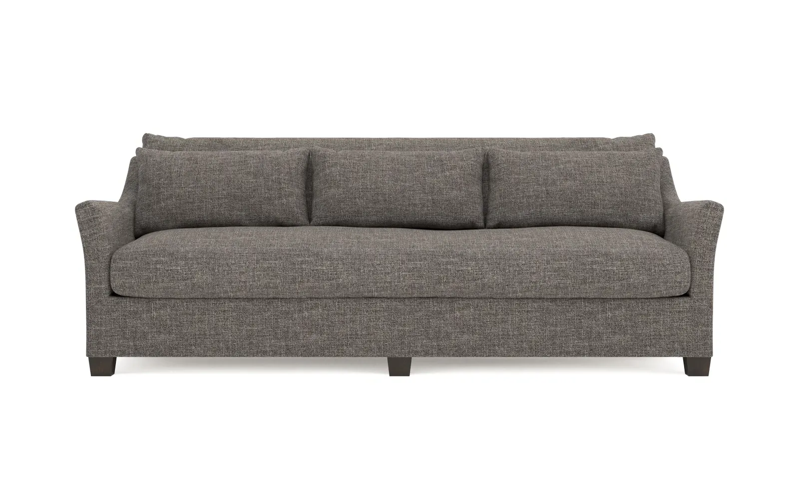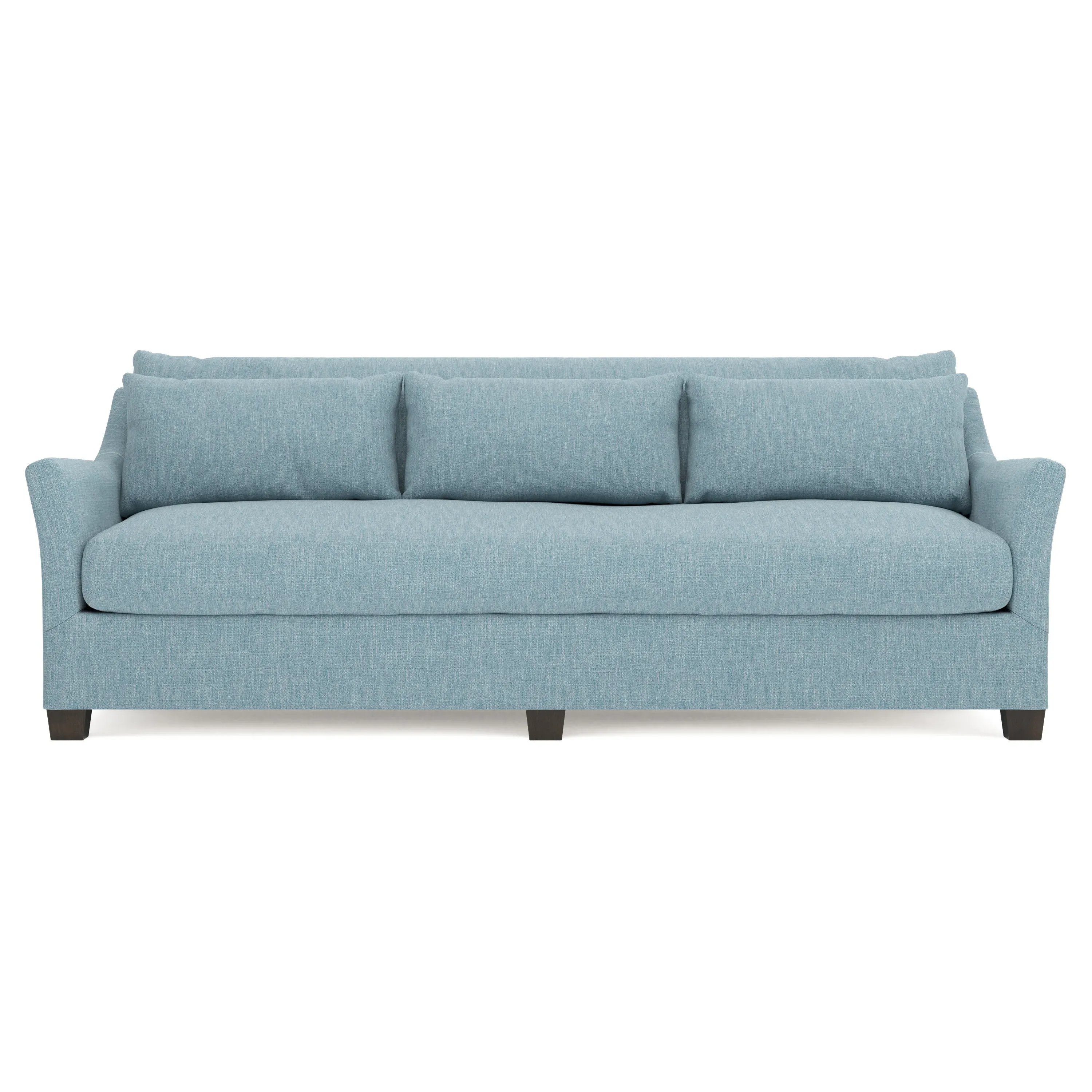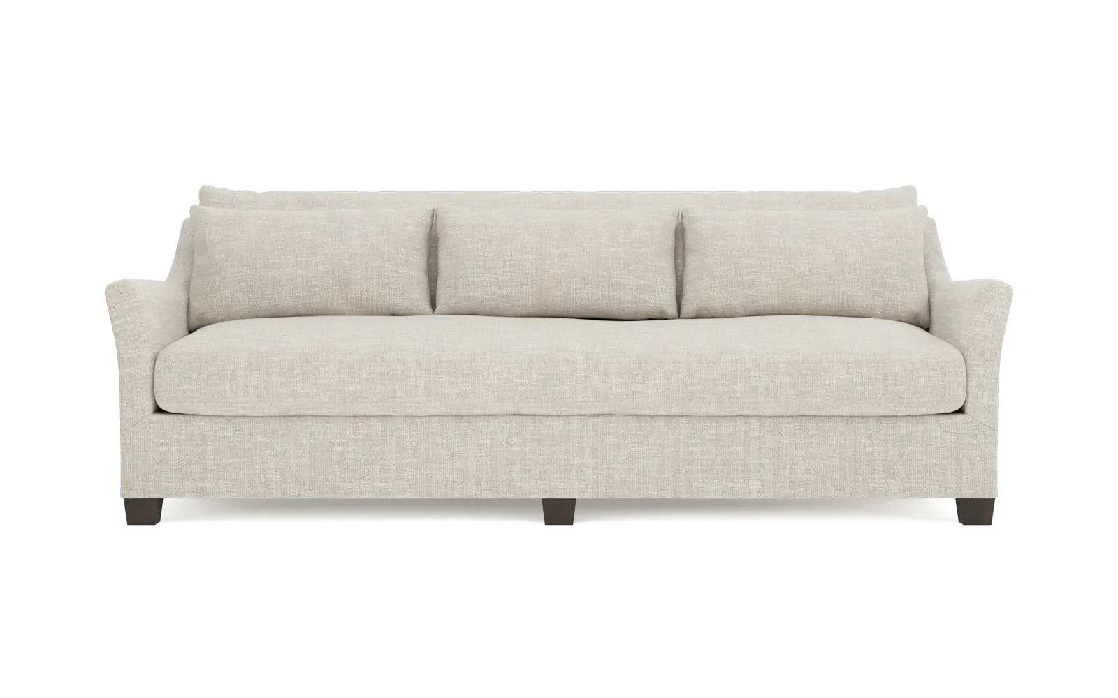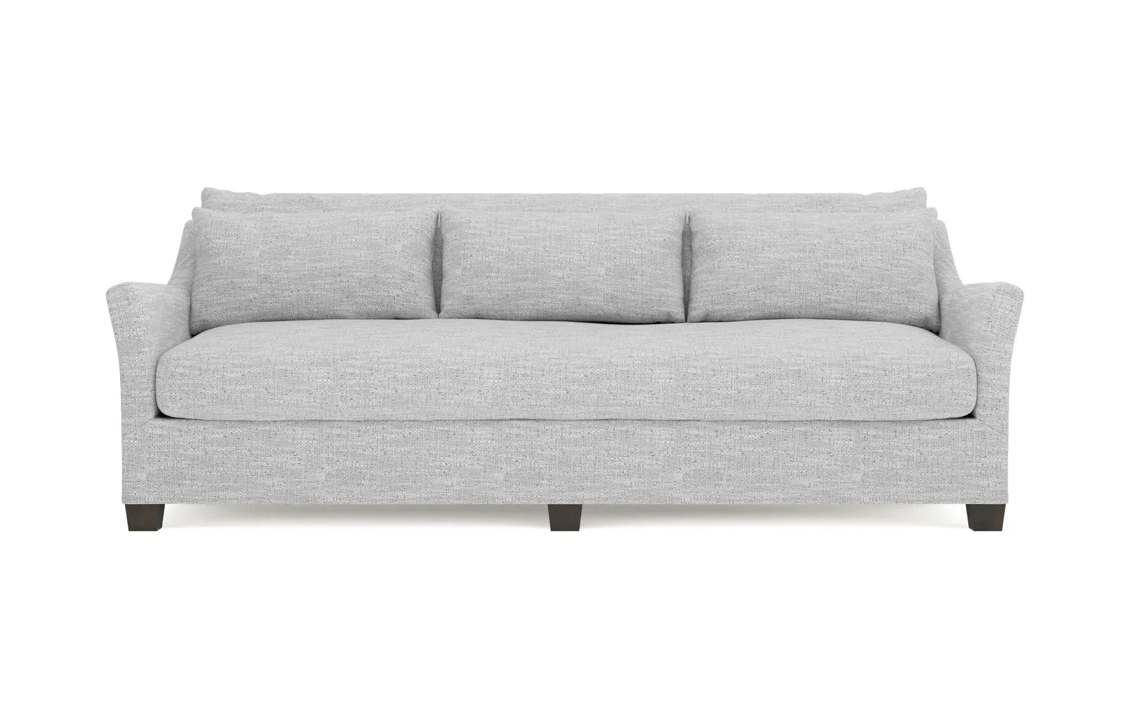Timeless and versatile, the 98” Pauline sofa is a gracious companion to everyday living. Gently sloped, flared arms and low wood legs accent the elegant silhouette. Soft yet supportive, the bench seat is designed for plush comfort, with a foam core surrounded by a blend of fiber, down, and feather fill. Three lumbar pillows are layered in front of the full-length back pillow for a cozy, tiered effect. Choose from a variety of upholstery options, including linen, velvet, and performance fabrics. <b>Overall Dimensions: </b> 98" W x 41" D x 35" H. <b>Seat Depth: </b>19” to the front of lumbar pillows, 24” to the front of back cushions; <b>Seat Height: </b>22”; <b>Distance Between Arms: </b> 86”; <b>Arm Height: </b> 25”; <b>Leg Height: </b> 3 ½”. <b>Materials:</b> FSC®-certified, US-sourced, formaldehyde-free solid kiln-dried hardwood and furniture-grade laminates. <b>Material Finish: </b> Espresso legs. <b>Cushion Fill: </b>A CertiPUR-US® certified, high-resiliency foam core wrapped with a super soft foam layer then inserted into a channel-quilted casing filled with a blend of 50% fiber, 5% down, and 45% feather.
