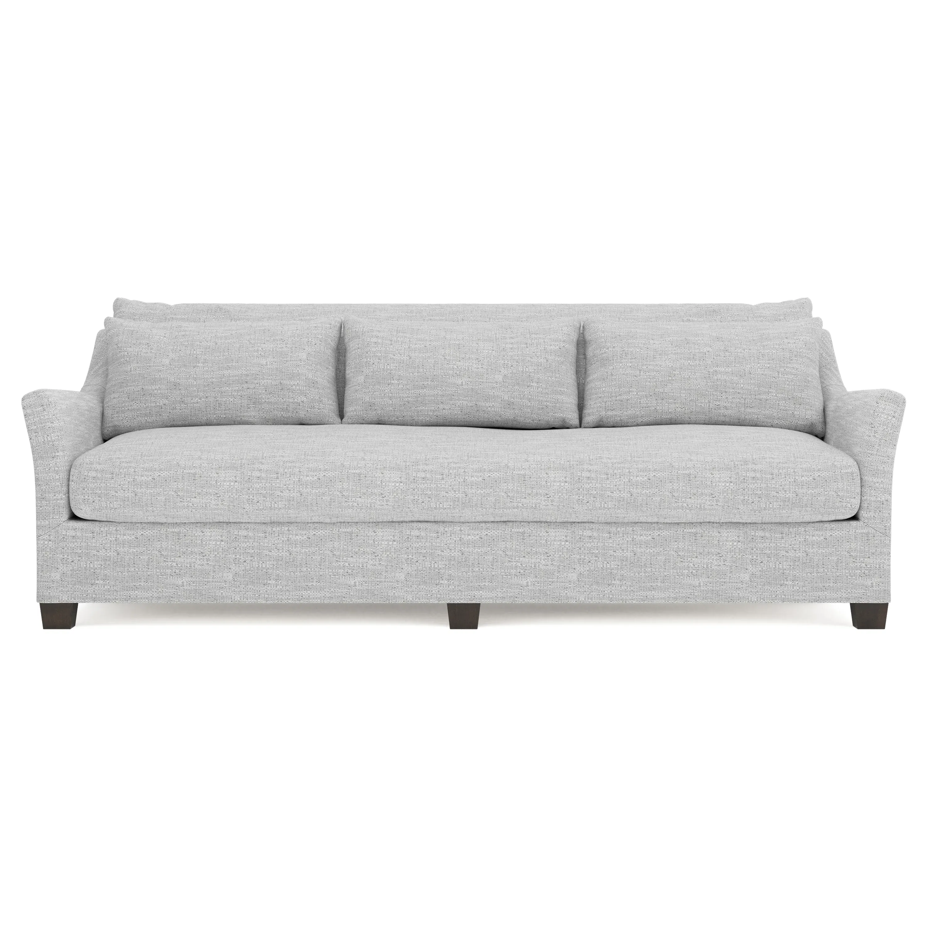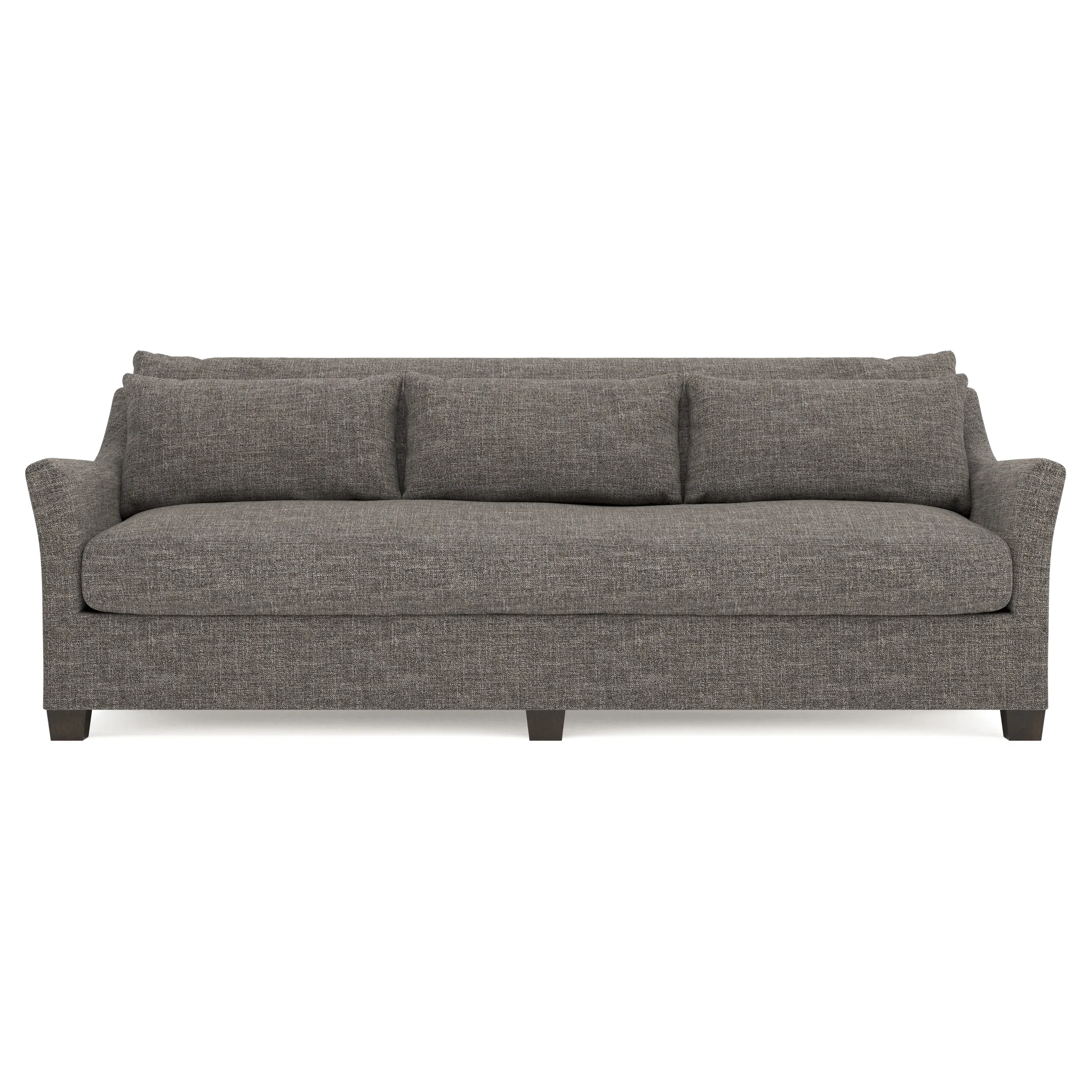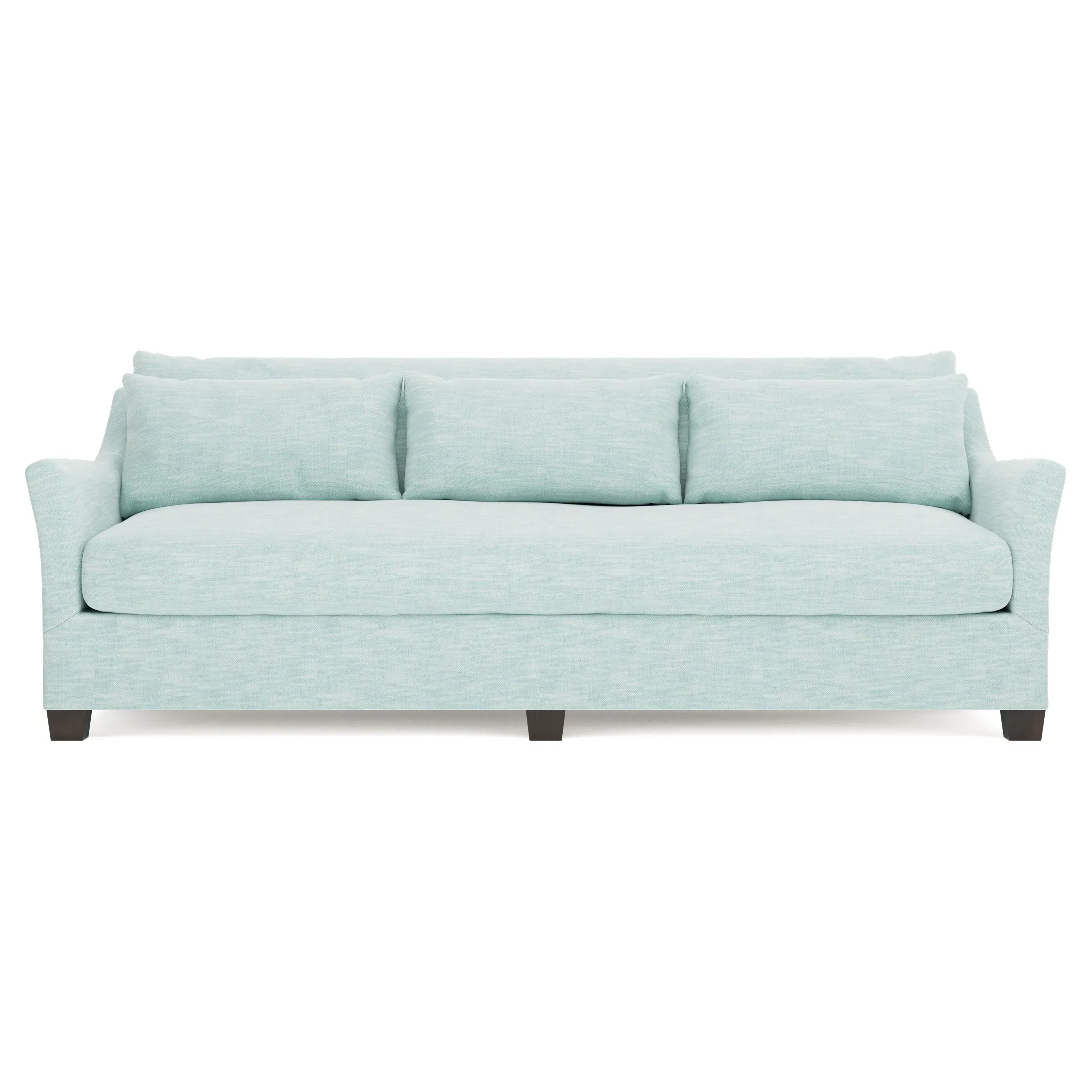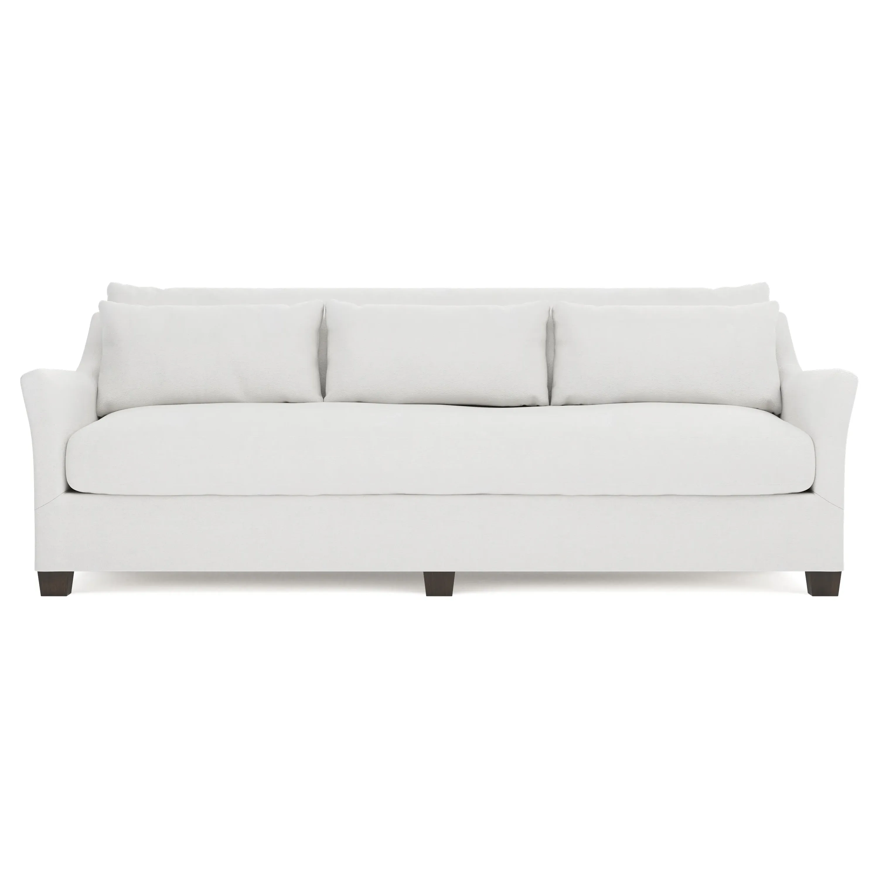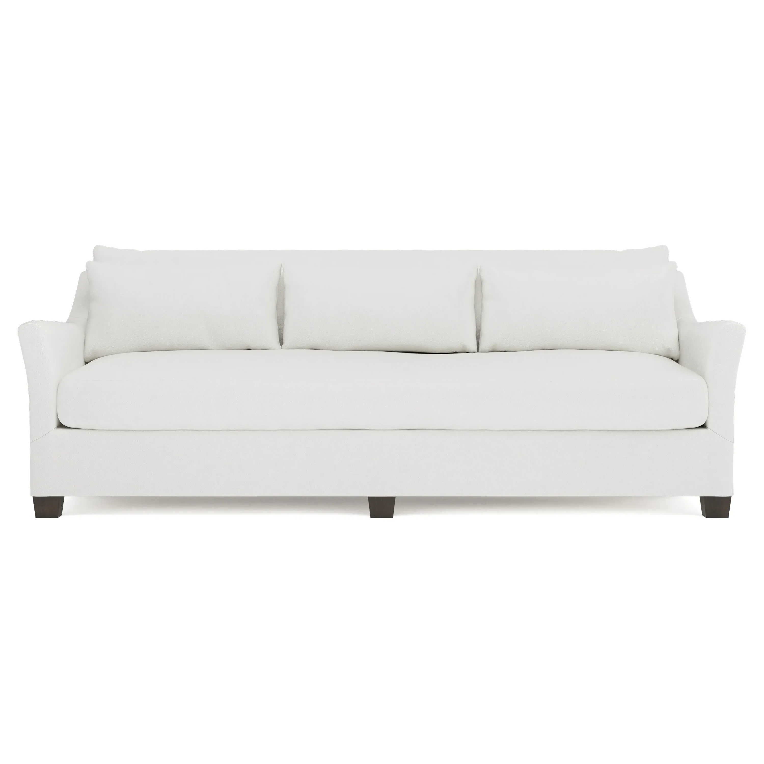 Timeless and versatile, the 98” Pauline sofa is a gracious companion to everyday living. Gently sloped, flared arms and low wood legs accent the elegant silhouette. Soft yet supportive, the bench seat is designed for plush comfort, with a foam core surrounded by a blend of fiber, down, and feather fill. Three lumbar pillows are layered in front of the full-length back pillow for a cozy, tiered effect. Choose from a variety of upholstery options, including linen, velvet, and performance fabrics. <b>Overall Dimensions: </b> 98" W x 41" D x 35" H. <b>Seat Depth: </b>19” to the front of lumbar pillows, 24” to the front of back cushions; <b>Seat Height: </b>22”; <b>Distance Between Arms: </b> 86”; <b>Arm Height: </b> 25”; <b>Leg Height: </b> 3 ½”. <b>Materials:</b> FSC®-certified, US-sourced, formaldehyde-free solid kiln-dried hardwood and furniture-grade laminates. <b>Material Finish: </b> Espresso legs. <b>Cushion Fill: </b>A CertiPUR-US® certified, high-resiliency foam core wrapped with a super soft foam layer then inserted into a channel-quilted casing filled with a blend of 50% fiber, 5% down, and 45% feather.