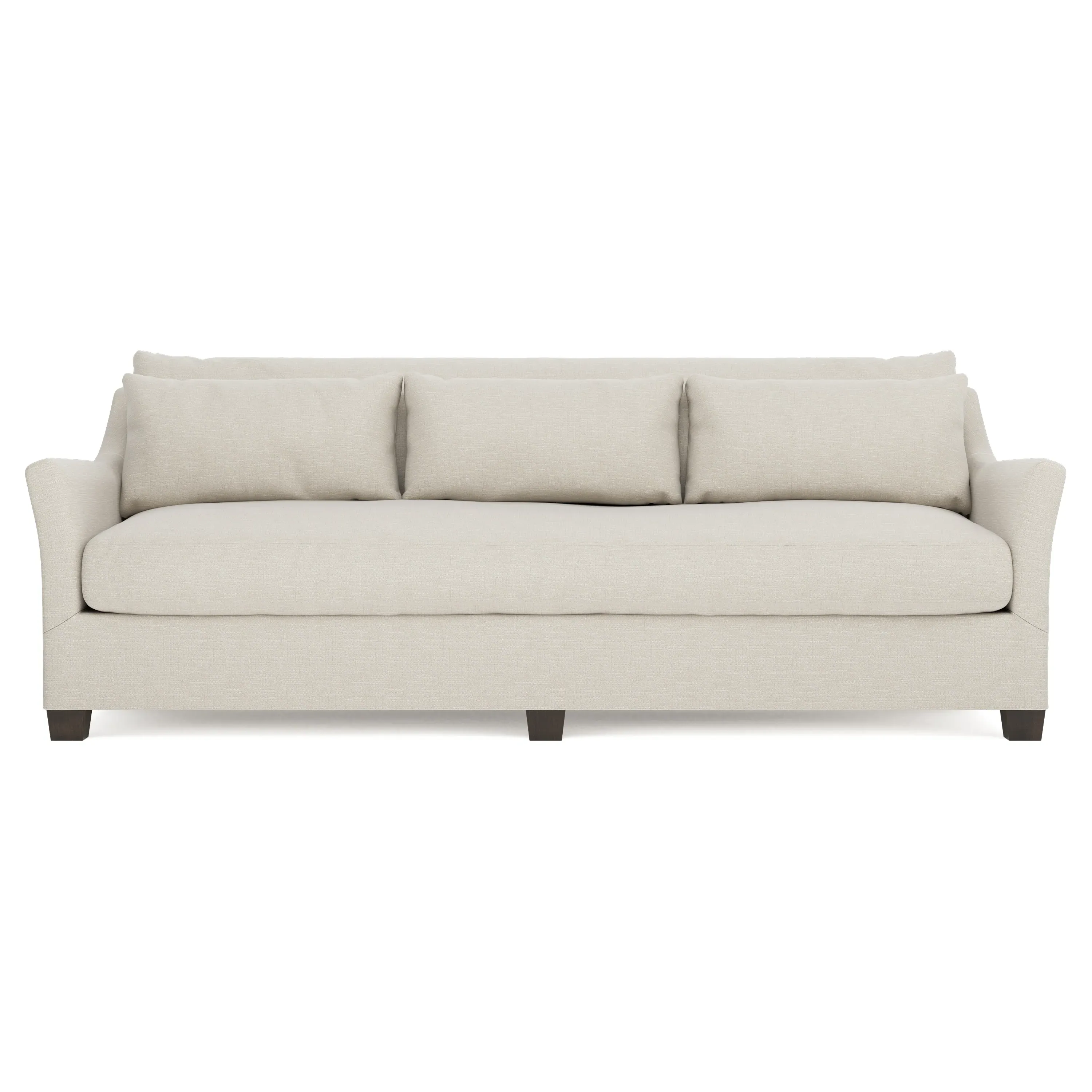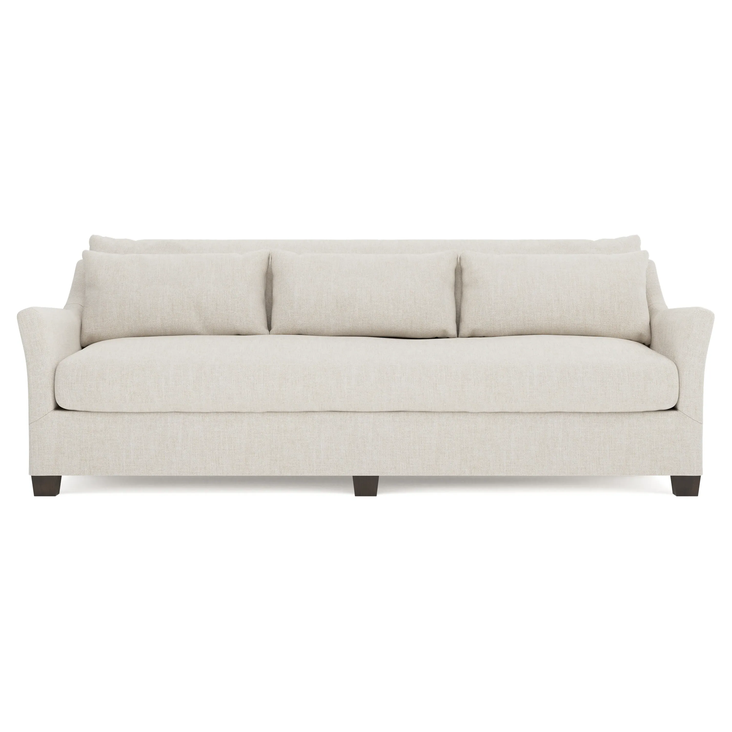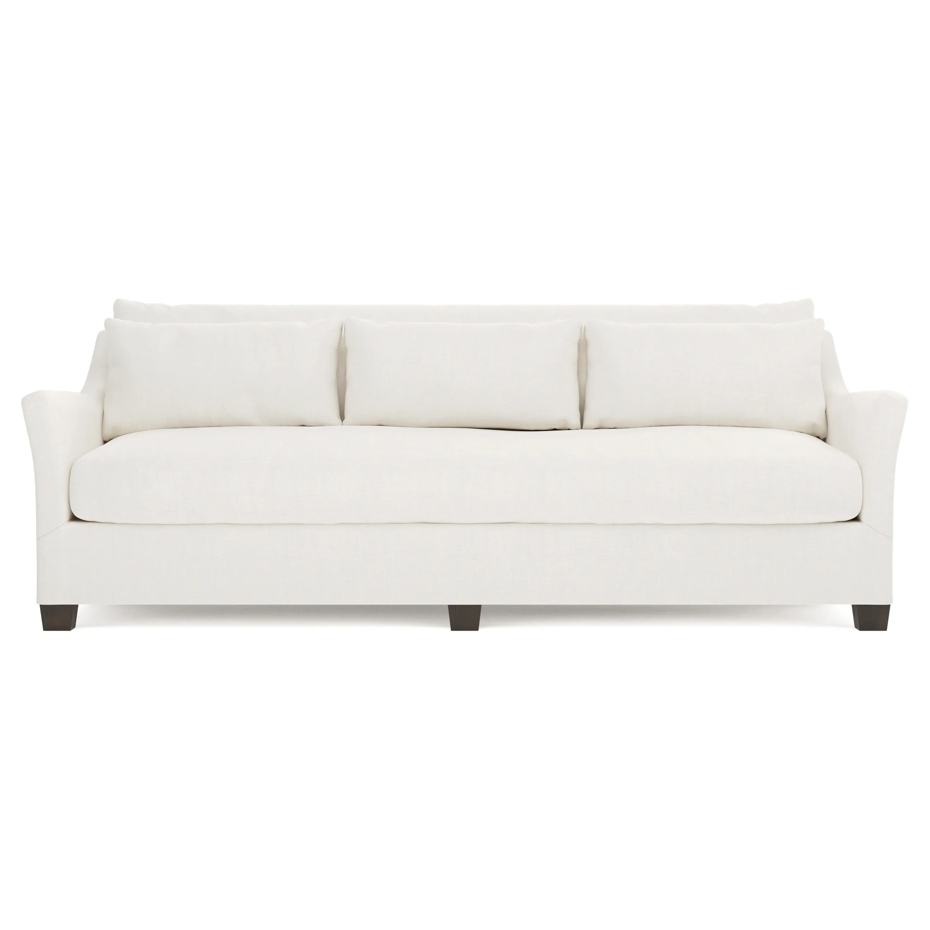 The Pauline sofa offers plush comfort with its bench seat design, featuring a high-resiliency foam core wrapped in soft foam and filled with a blend of fiber, down, and feather. Its gently sloped, flared arms and low espresso wood legs create a graceful silhouette, while the channel-quilted casing adds durability. Three lumbar pillows layer in front of the full-length back pillow for enhanced support. The FSC-certified kiln-dried hardwood frame ensures lasting stability. W249 x D104 x H89 cm.