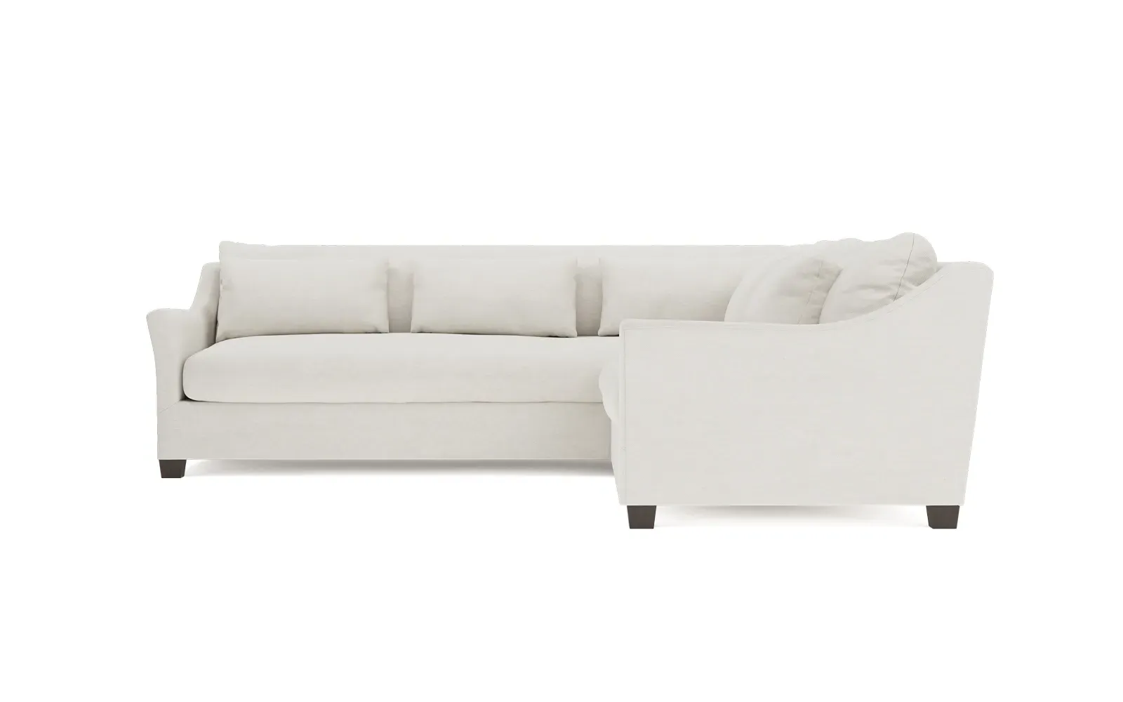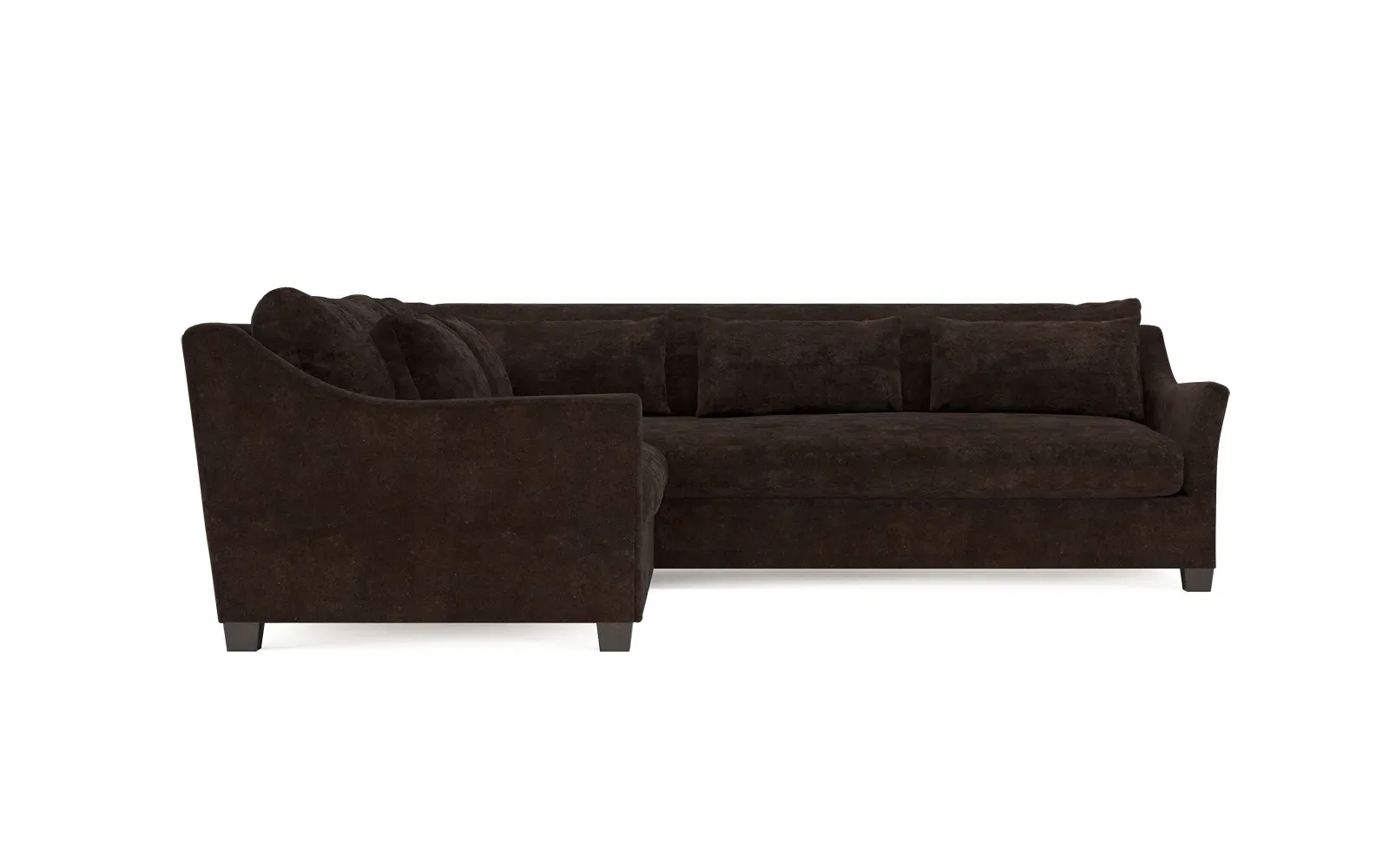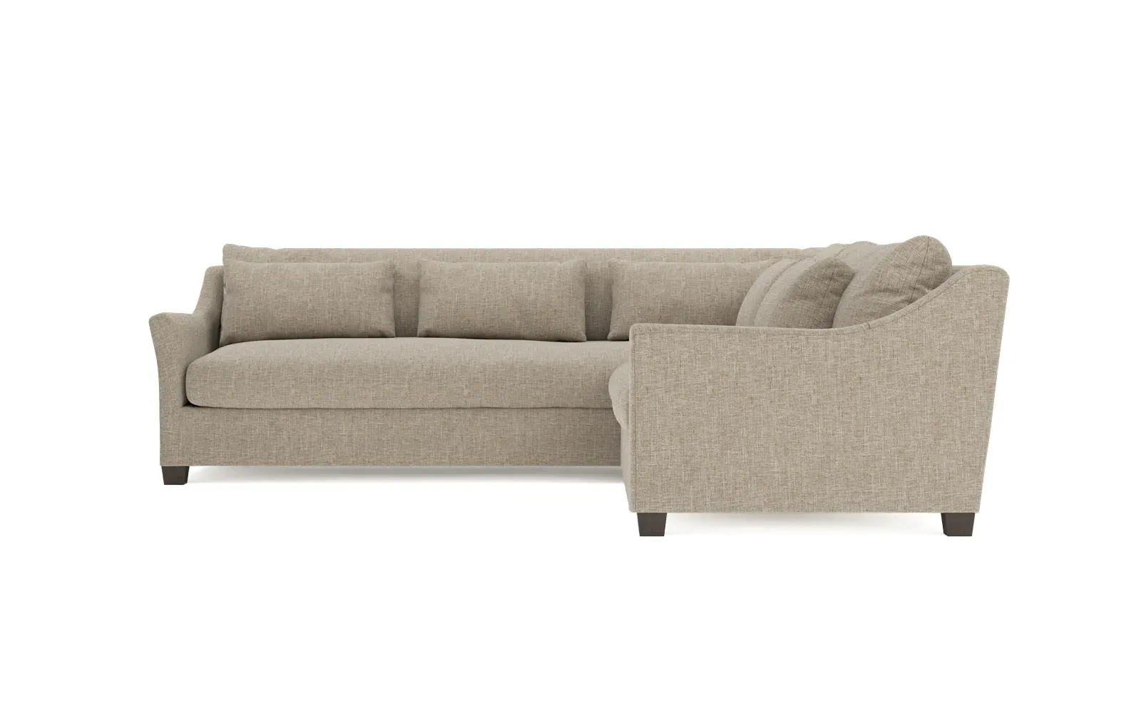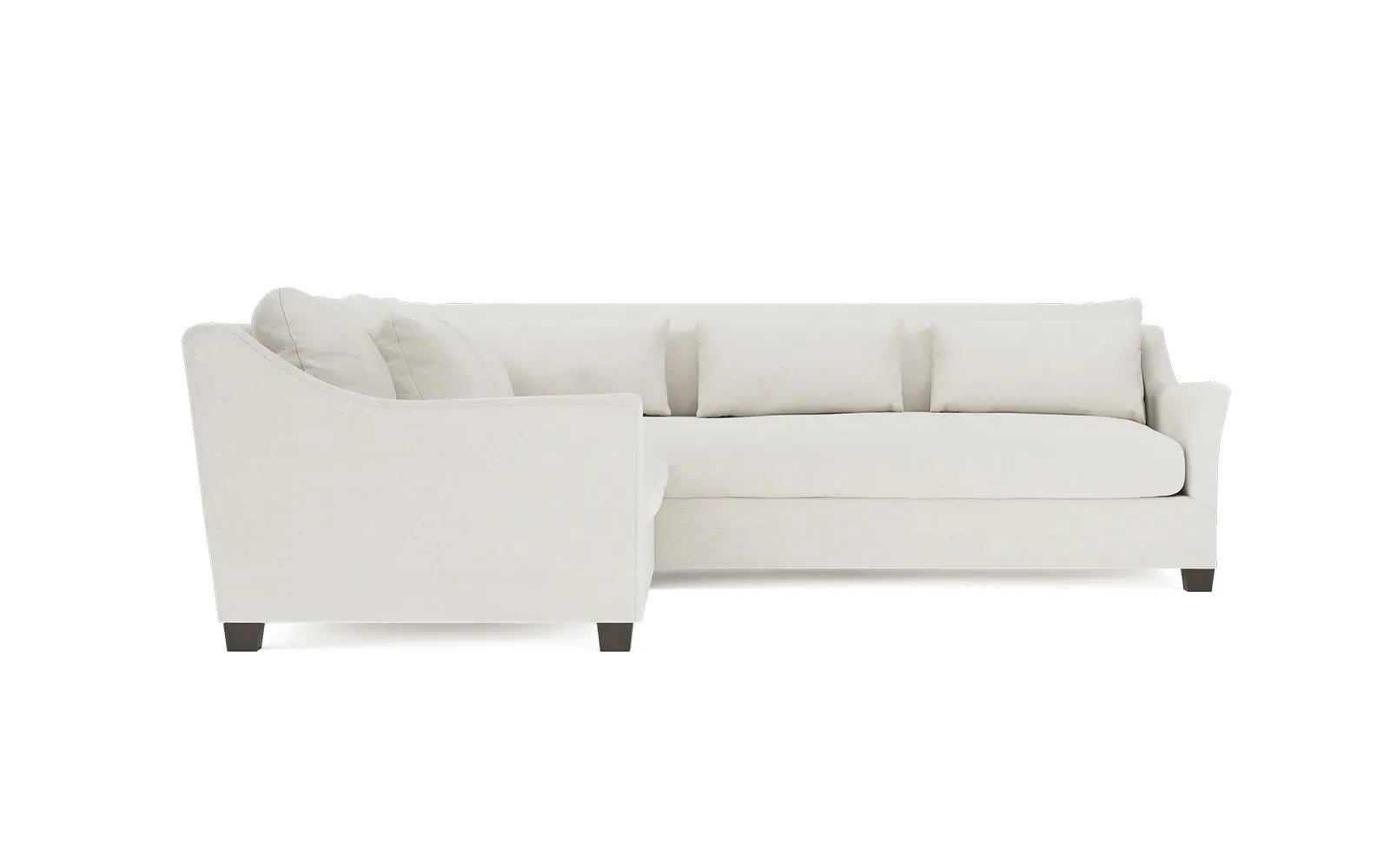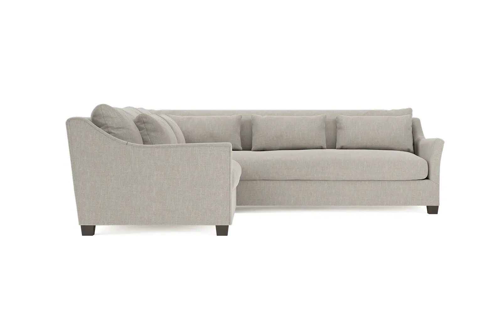 The left 106” Pauline corner sectional features gently sloped, flared arms, low wood legs, and a spacious seat. Its structured silhouette is a natural divider for great rooms, making it easy to define a seating area in open-concept spaces. Soft yet supportive, the seat cushions are designed for plush comfort, with a foam core surrounded by a blend of fiber, down, and feather fill. Choose from a variety of upholstery options, including linen, velvet, and performance fabrics. <b>Overall Dimensions: </b> 106" W x 118" D x 35" H. <b>End Sofa with Corner Dimensions: </b> 118" W x 41" D x 35" H; <b>End Sofa Dimensions: </b> 65” W x 41” D x 35” H; <b>Seat Depth: </b>19” to the front of lumbar pillows, 24” to the front of back cushions; <b>Seat Height: </b>22”; <b>Arm Height: </b> 25”; <b>Leg Height: </b> 3 ½”. <b>Materials:</b> FSC®-certified, US-sourced, formaldehyde-free solid kiln-dried hardwood and furniture-grade laminates. <b>Material Finish: </b> Espresso legs. <b>Pieces Included: </b> Right end sofa with corner and left end sofa.