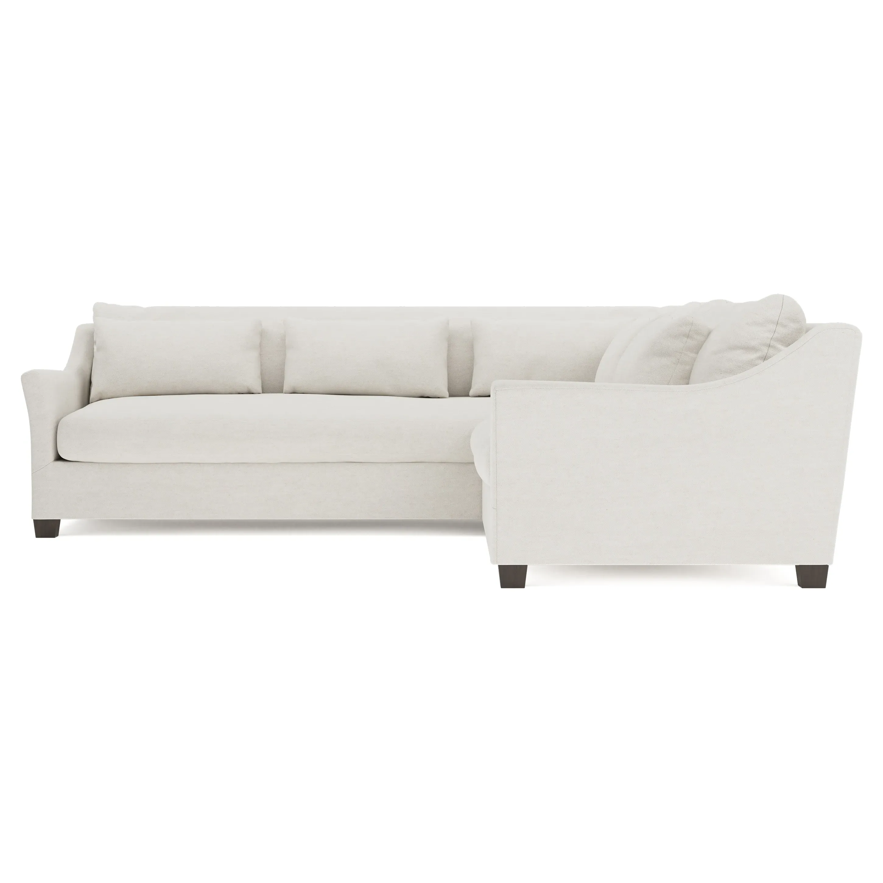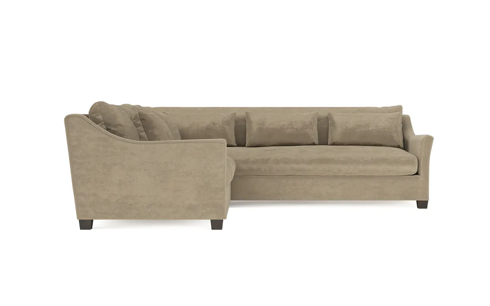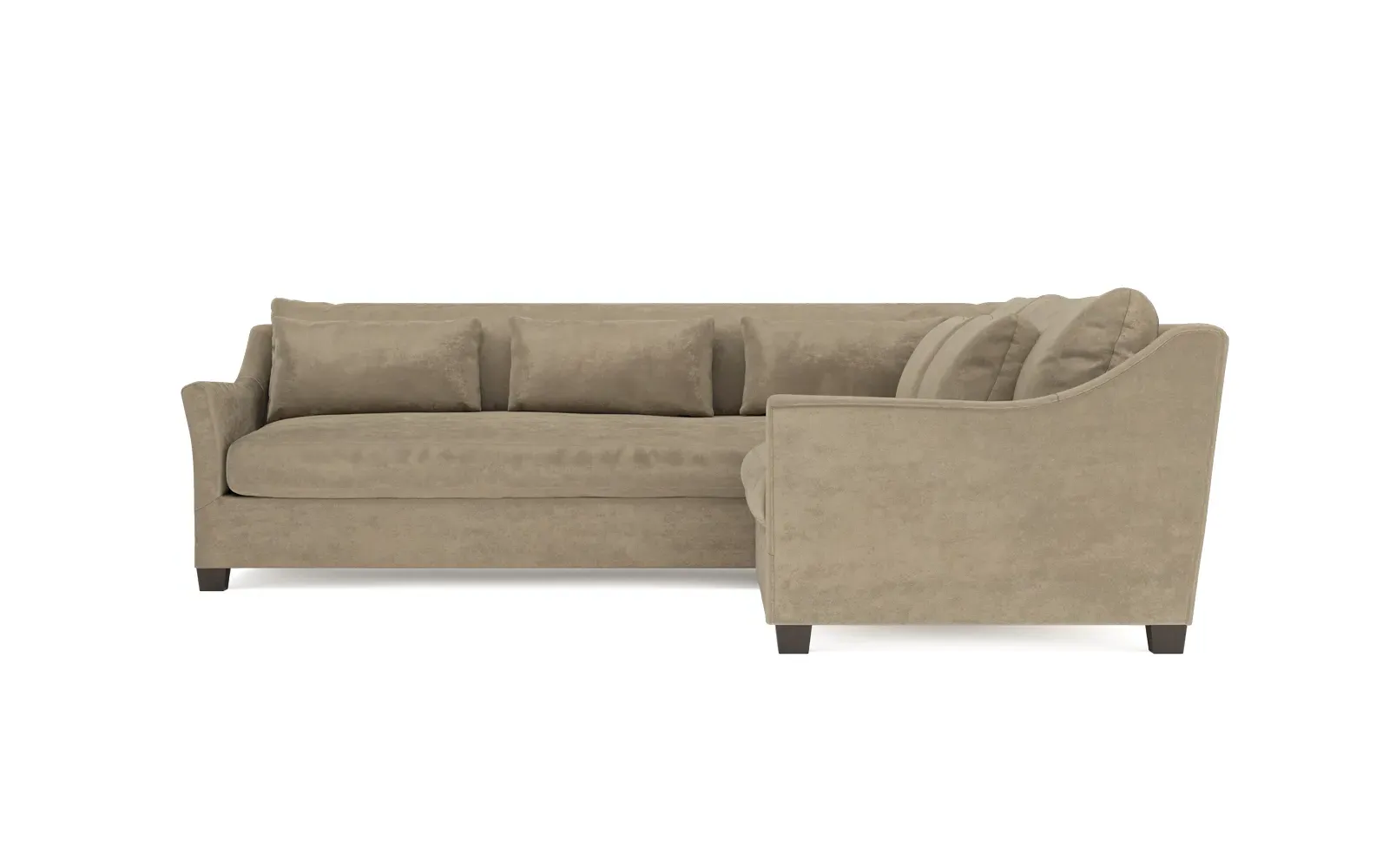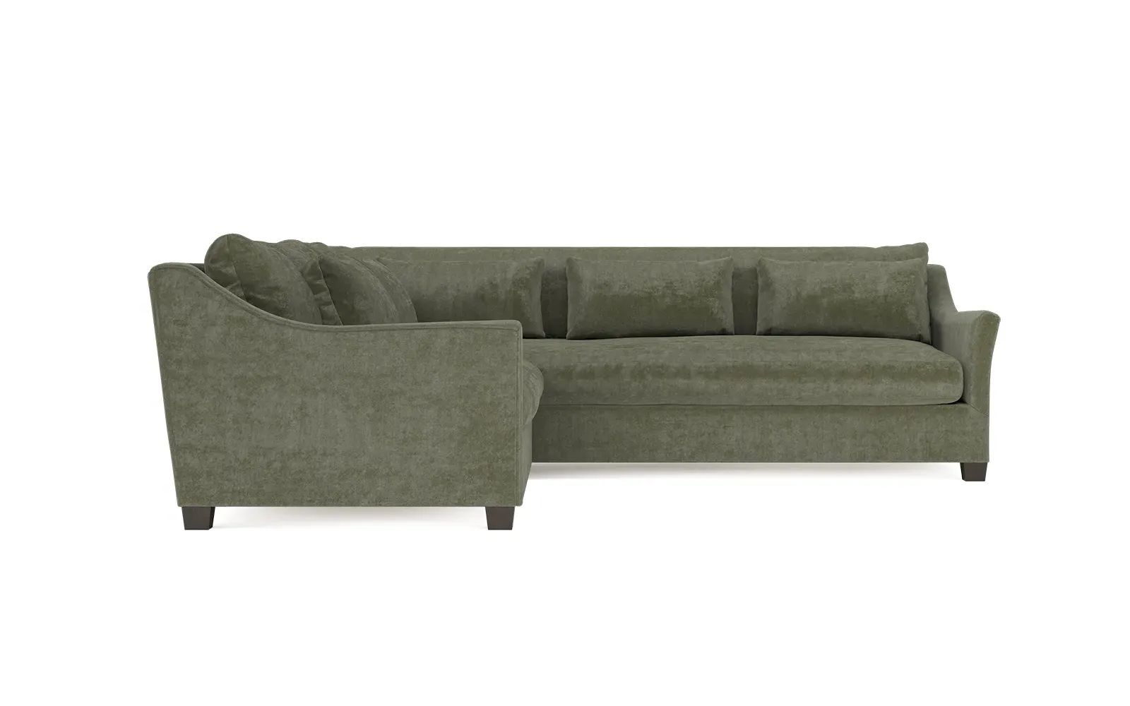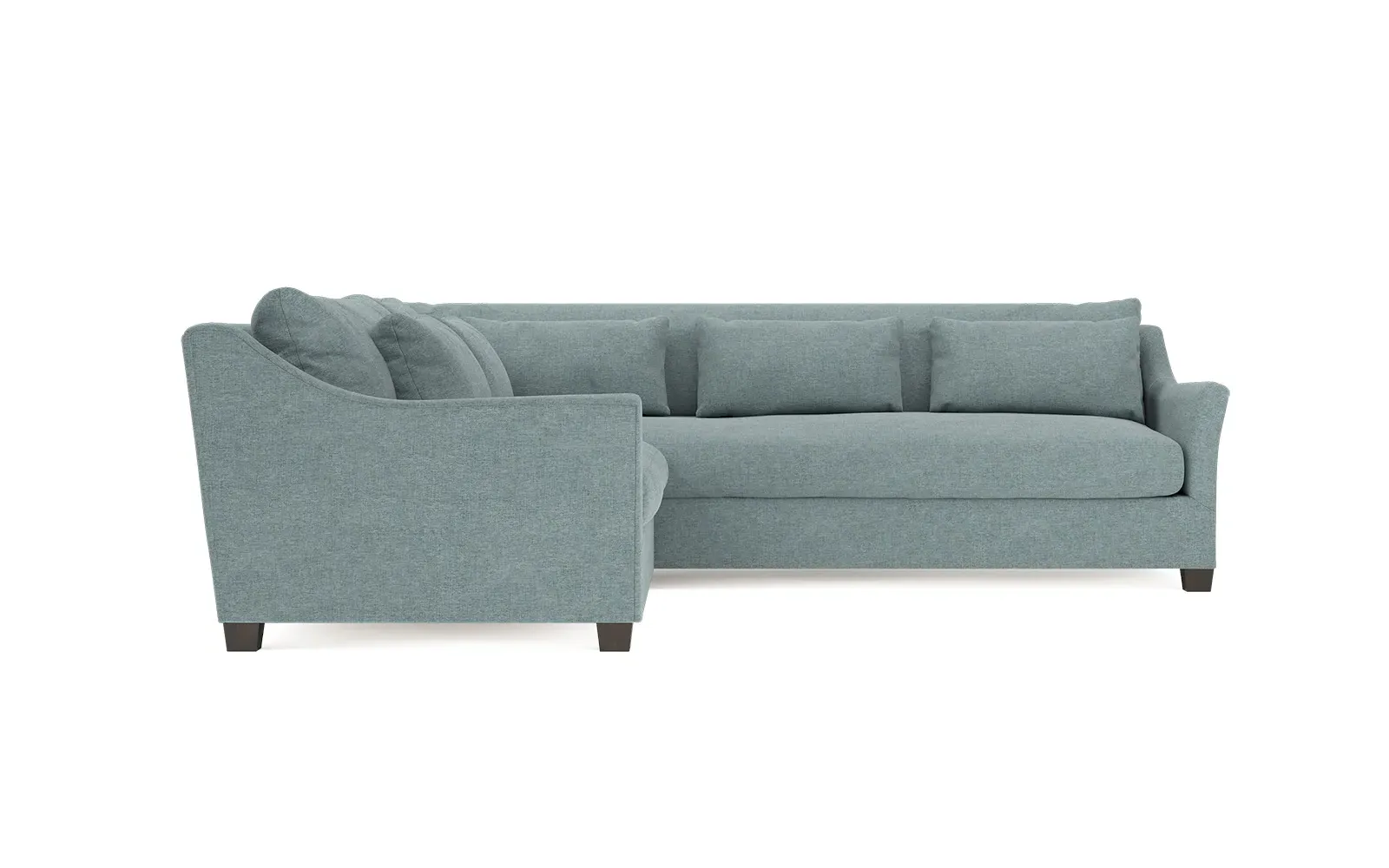 The left 106” Pauline corner sectional features gently sloped, flared arms, low wood legs, and a spacious seat. Its structured silhouette is a natural divider for great rooms, making it easy to define a seating area in open-concept spaces. Soft yet supportive, the seat cushions are designed for plush comfort, with a foam core surrounded by a blend of fiber, down, and feather fill. Choose from a variety of upholstery options, including linen, velvet, and performance fabrics. <b>Overall Dimensions: </b> 106" W x 118" D x 35" H. <b>End Sofa with Corner Dimensions: </b> 118" W x 41" D x 35" H; <b>End Sofa Dimensions: </b> 65” W x 41” D x 35” H; <b>Seat Depth: </b>19” to the front of lumbar pillows, 24” to the front of back cushions; <b>Seat Height: </b>22”; <b>Arm Height: </b> 25”; <b>Leg Height: </b> 3 ½”. <b>Materials:</b> FSC®-certified, US-sourced, formaldehyde-free solid kiln-dried hardwood and furniture-grade laminates. <b>Material Finish: </b> Espresso legs. <b>Pieces Included: </b> Right end sofa with corner and left end sofa.