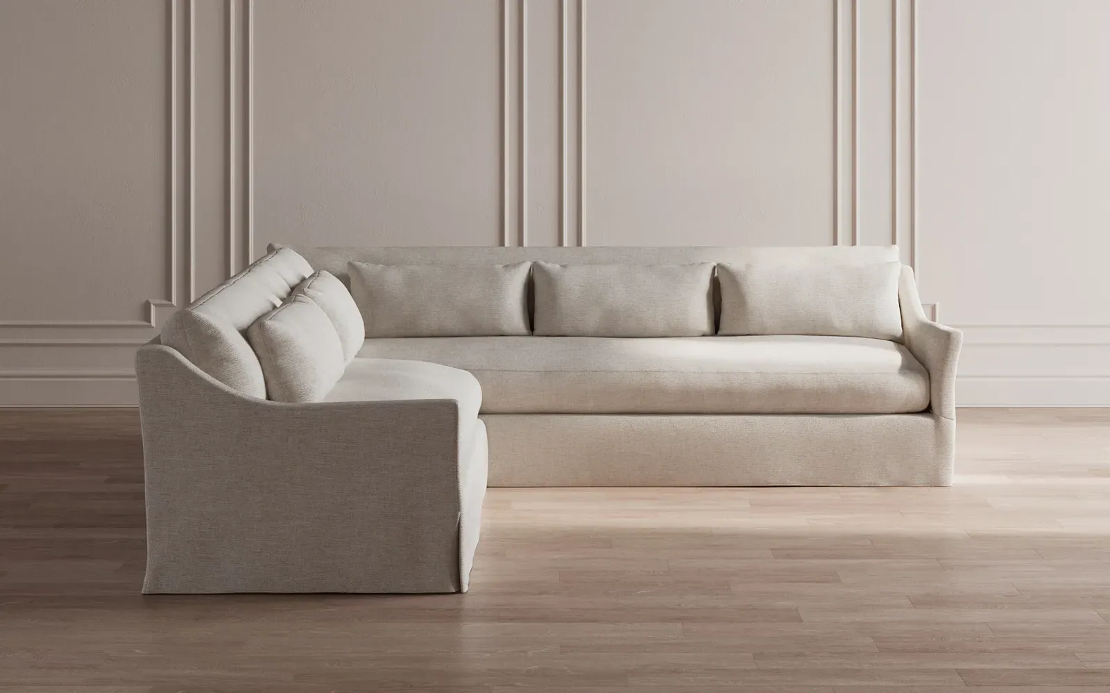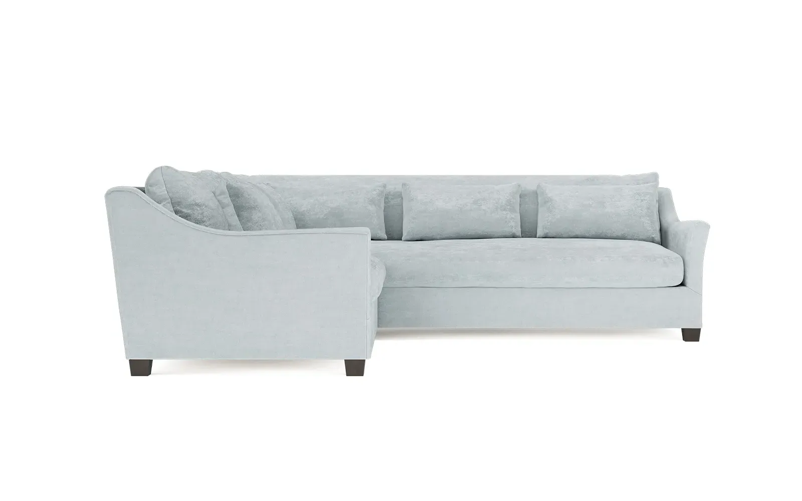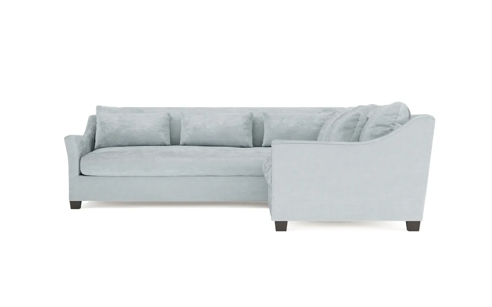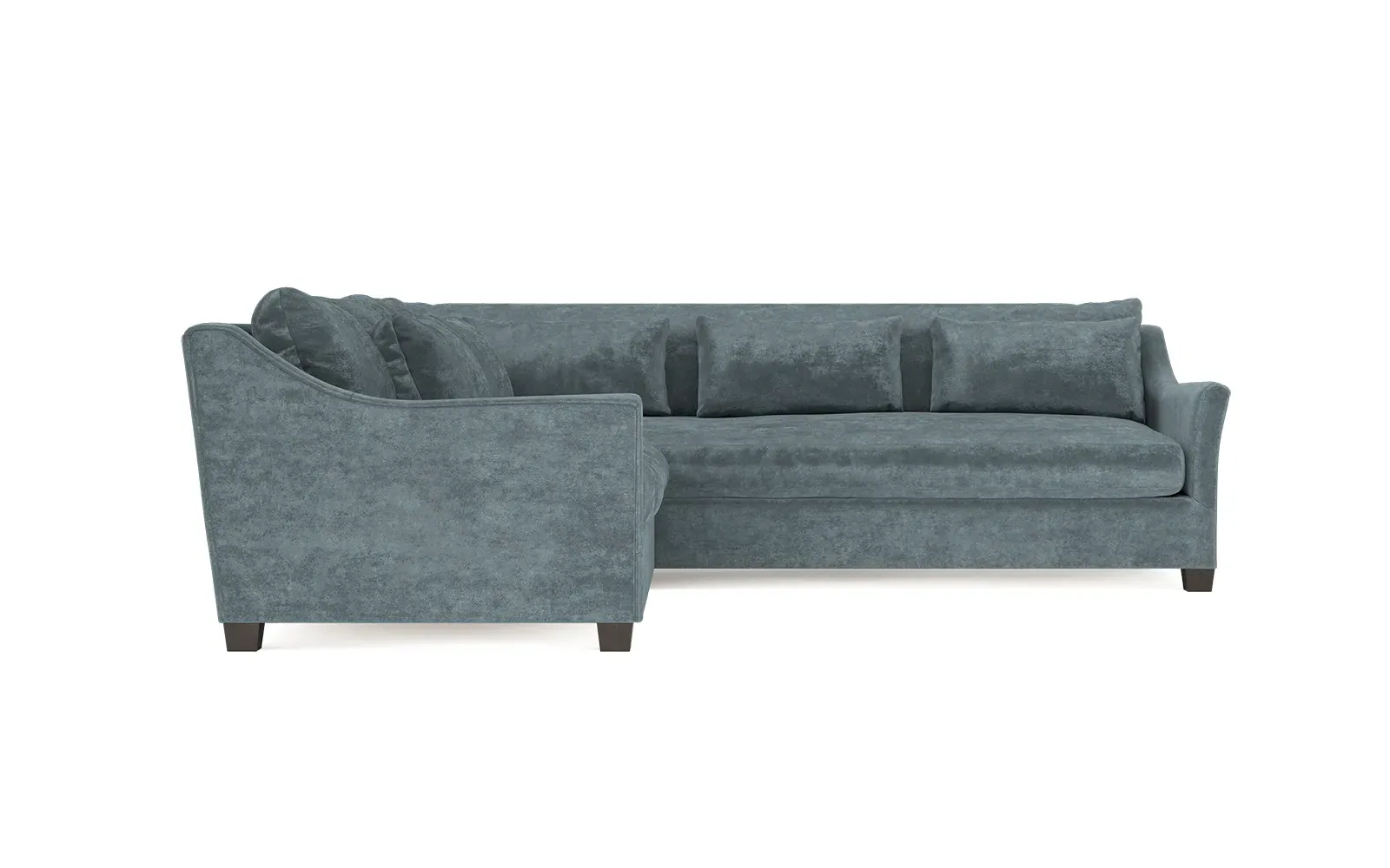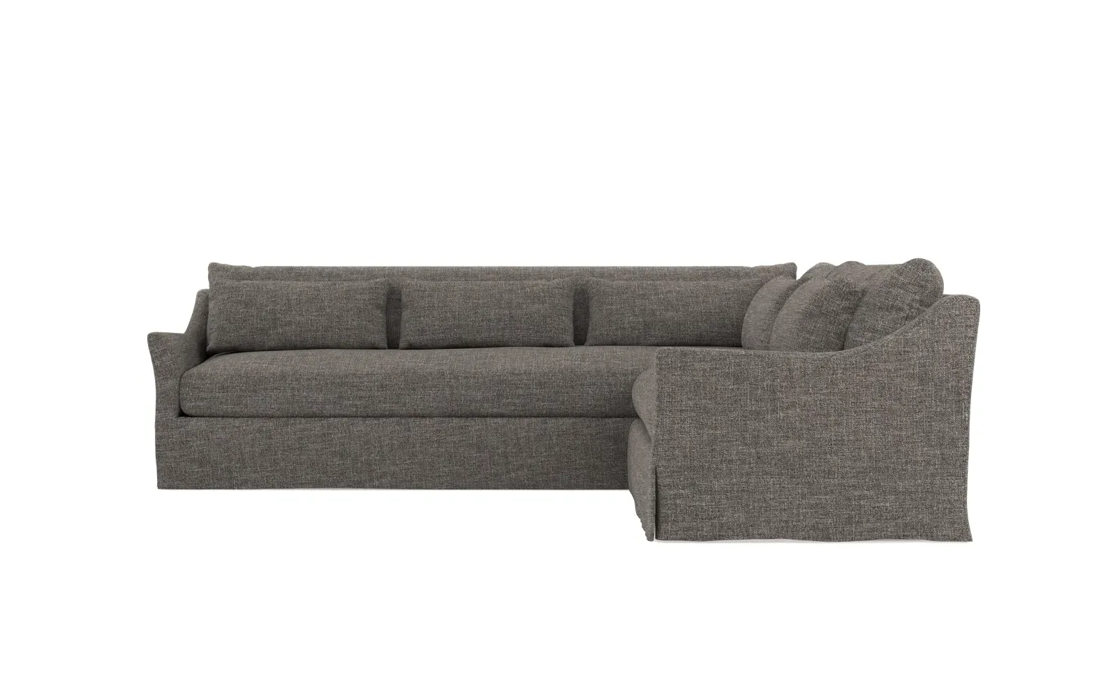 The left 106” Pauline corner sectional features gently sloped, flared arms, low wood legs, and a spacious seat. Its structured silhouette is a natural divider for great rooms, making it easy to define a seating area in open-concept spaces. Soft yet supportive, the seat cushions are designed for plush comfort, with a foam core surrounded by a blend of fiber, down, and feather fill. Choose from a variety of upholstery options, including linen, velvet, and performance fabrics. <b>Overall Dimensions: </b> 106" W x 118" D x 35" H. <b>End Sofa with Corner Dimensions: </b> 118" W x 41" D x 35" H; <b>End Sofa Dimensions: </b> 65” W x 41” D x 35” H; <b>Seat Depth: </b>19” to the front of lumbar pillows, 24” to the front of back cushions; <b>Seat Height: </b>22”; <b>Arm Height: </b> 25”; <b>Leg Height: </b> 3 ½”. <b>Materials:</b> FSC®-certified, US-sourced, formaldehyde-free solid kiln-dried hardwood and furniture-grade laminates. <b>Material Finish: </b> Espresso legs. <b>Pieces Included: </b> Right end sofa with corner and left end sofa.