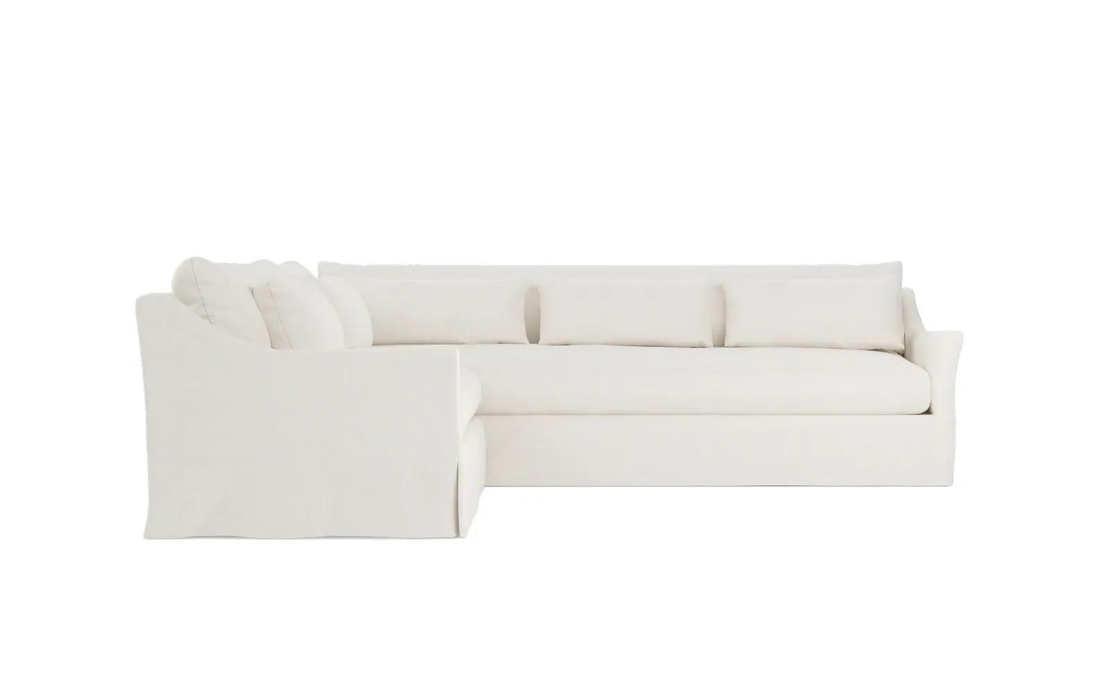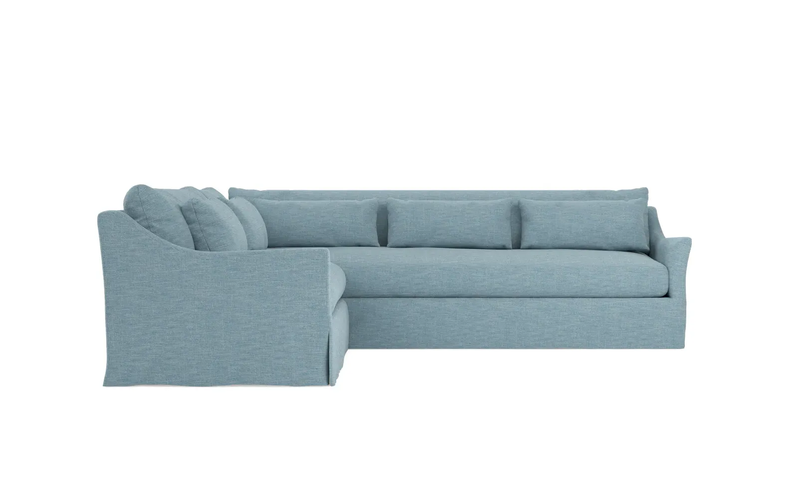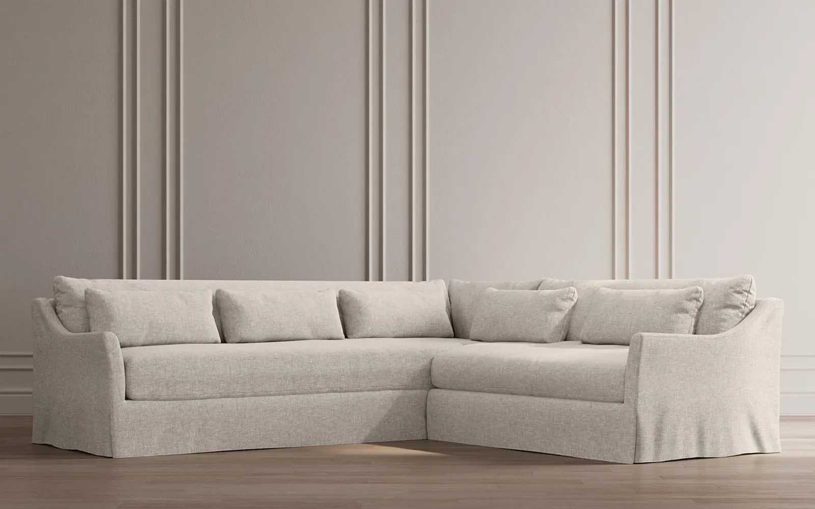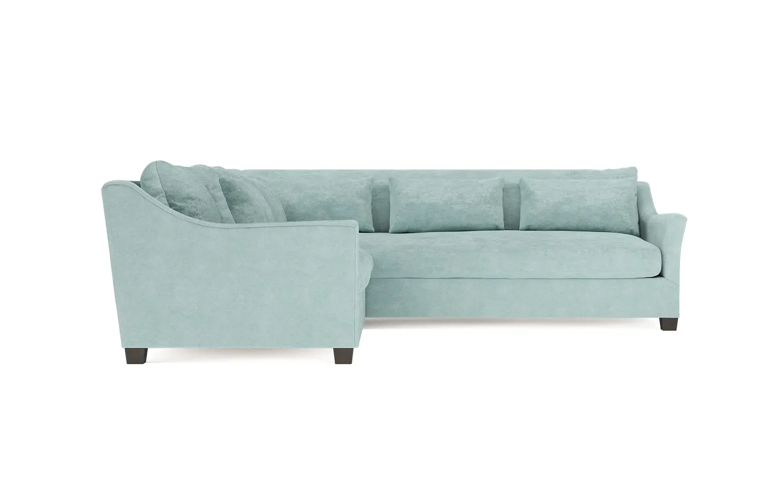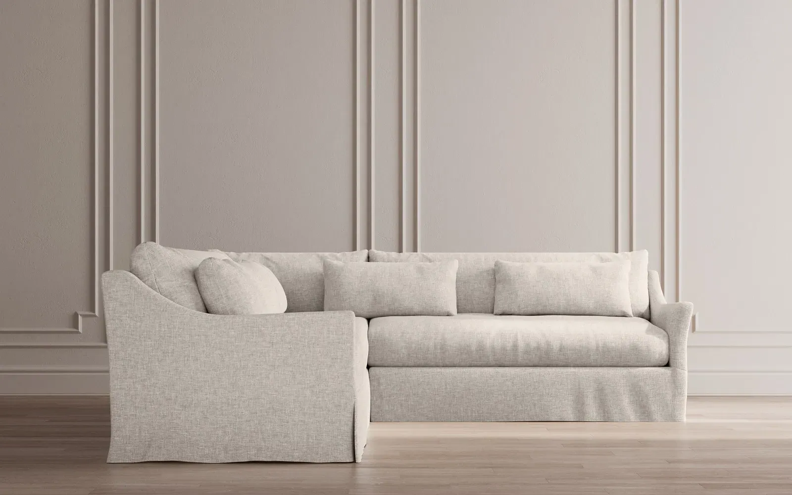 The left 106” Pauline corner sectional features gently sloped, flared arms, low wood legs, and a spacious seat. Its structured silhouette is a natural divider for great rooms, making it easy to define a seating area in open-concept spaces. Soft yet supportive, the seat cushions are designed for plush comfort, with a foam core surrounded by a blend of fiber, down, and feather fill. Choose from a variety of upholstery options, including linen, velvet, and performance fabrics. <b>Overall Dimensions: </b> 106" W x 118" D x 35" H. <b>End Sofa with Corner Dimensions: </b> 118" W x 41" D x 35" H; <b>End Sofa Dimensions: </b> 65” W x 41” D x 35” H; <b>Seat Depth: </b>19” to the front of lumbar pillows, 24” to the front of back cushions; <b>Seat Height: </b>22”; <b>Arm Height: </b> 25”; <b>Leg Height: </b> 3 ½”. <b>Materials:</b> FSC®-certified, US-sourced, formaldehyde-free solid kiln-dried hardwood and furniture-grade laminates. <b>Material Finish: </b> Espresso legs. <b>Pieces Included: </b> Right end sofa with corner and left end sofa.