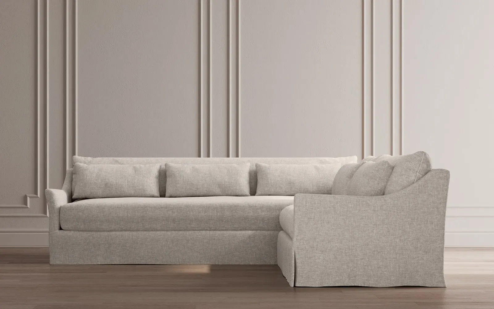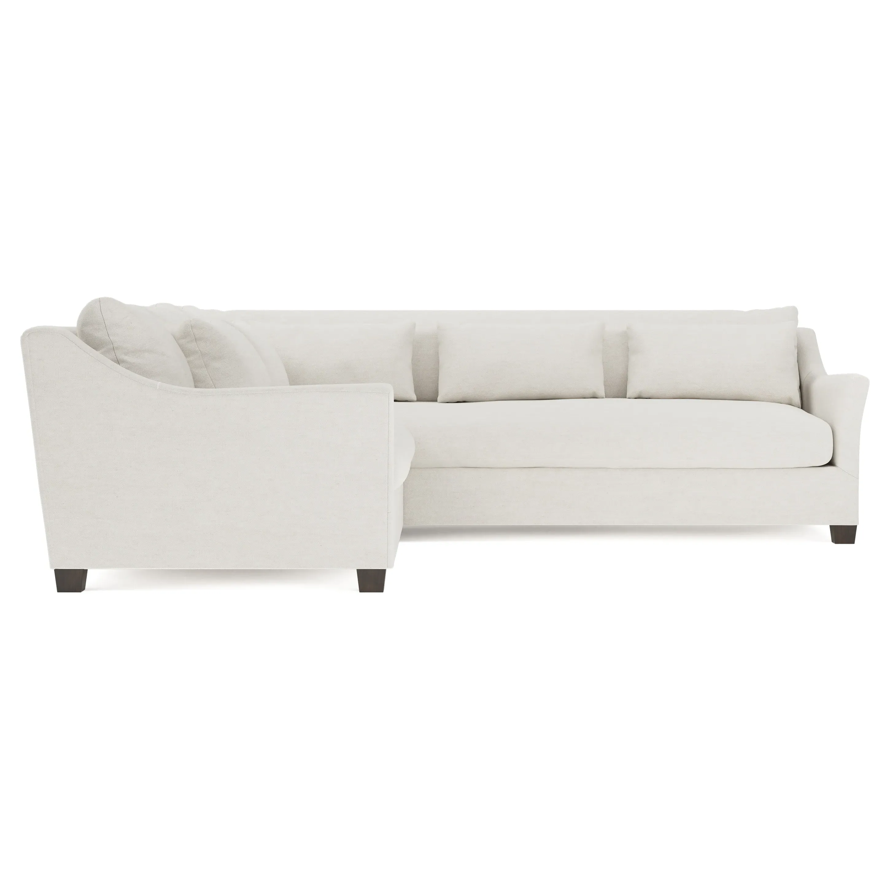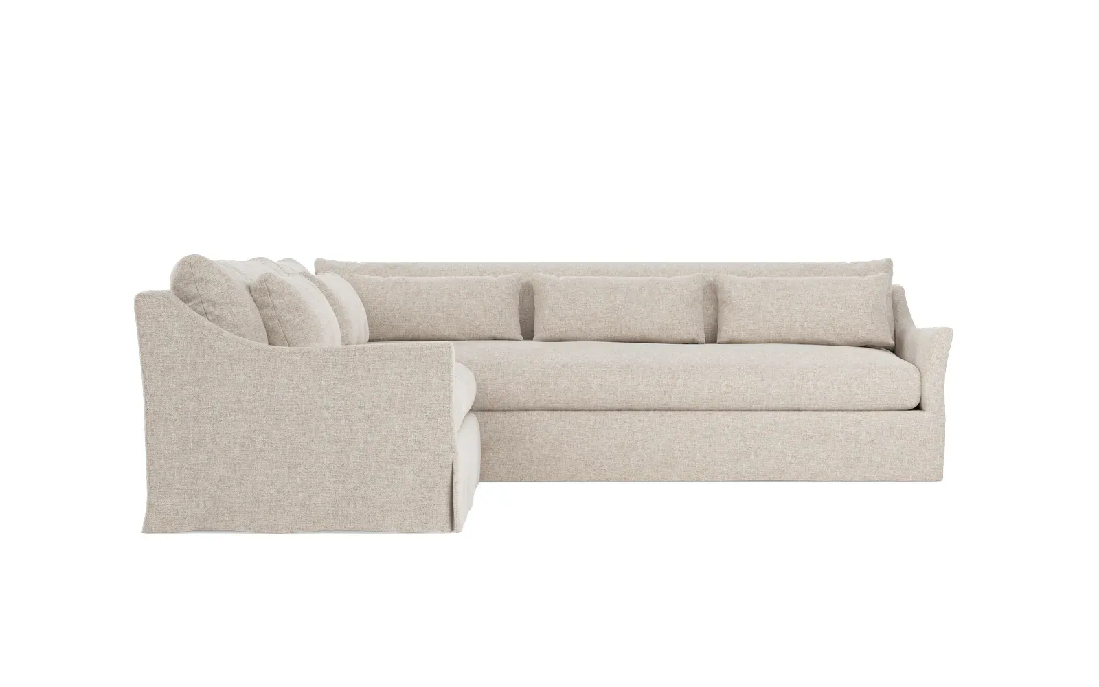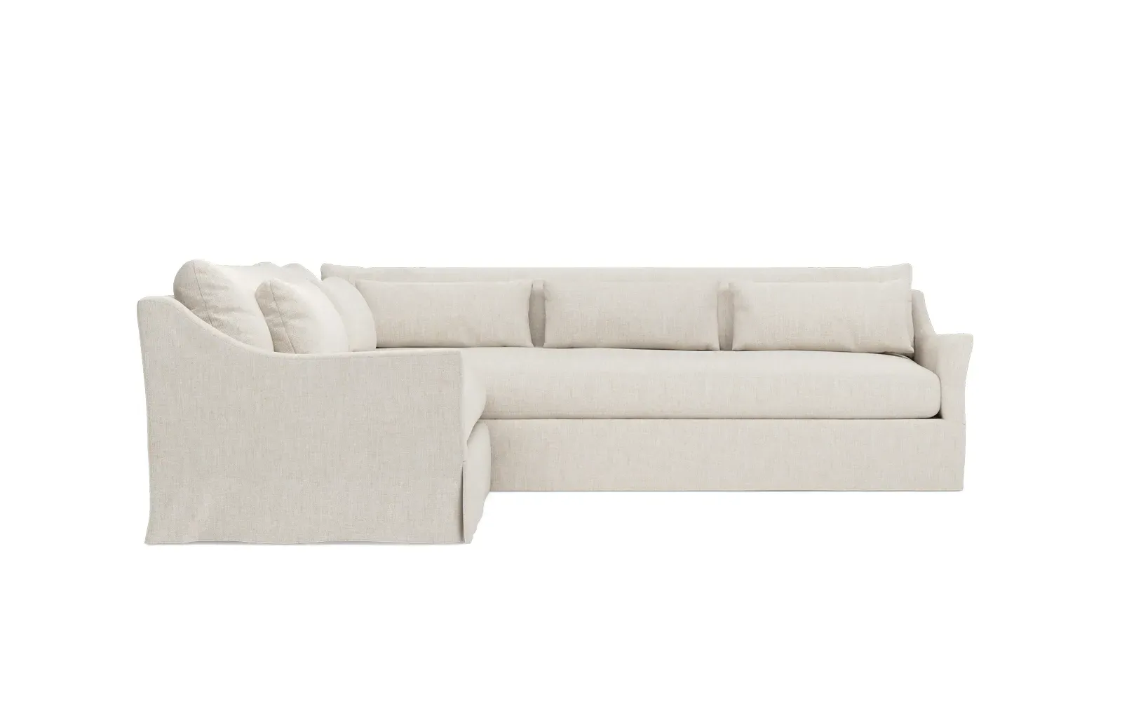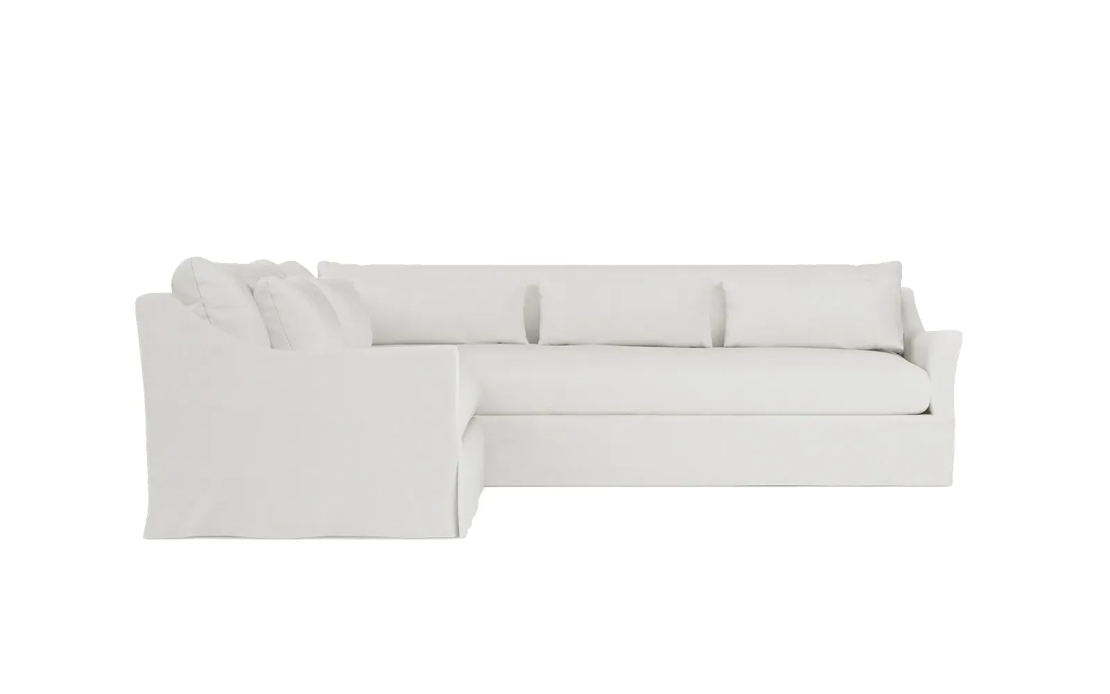 The left 106” Pauline corner sectional features gently sloped, flared arms, low wood legs, and a spacious seat. Its structured silhouette is a natural divider for great rooms, making it easy to define a seating area in open-concept spaces. Soft yet supportive, the seat cushions are designed for plush comfort, with a foam core surrounded by a blend of fiber, down, and feather fill. Choose from a variety of upholstery options, including linen, velvet, and performance fabrics. <b>Overall Dimensions: </b> 106" W x 118" D x 35" H. <b>End Sofa with Corner Dimensions: </b> 118" W x 41" D x 35" H; <b>End Sofa Dimensions: </b> 65” W x 41” D x 35” H; <b>Seat Depth: </b>19” to the front of lumbar pillows, 24” to the front of back cushions; <b>Seat Height: </b>22”; <b>Arm Height: </b> 25”; <b>Leg Height: </b> 3 ½”. <b>Materials:</b> FSC®-certified, US-sourced, formaldehyde-free solid kiln-dried hardwood and furniture-grade laminates. <b>Material Finish: </b> Espresso legs. <b>Pieces Included: </b> Right end sofa with corner and left end sofa.