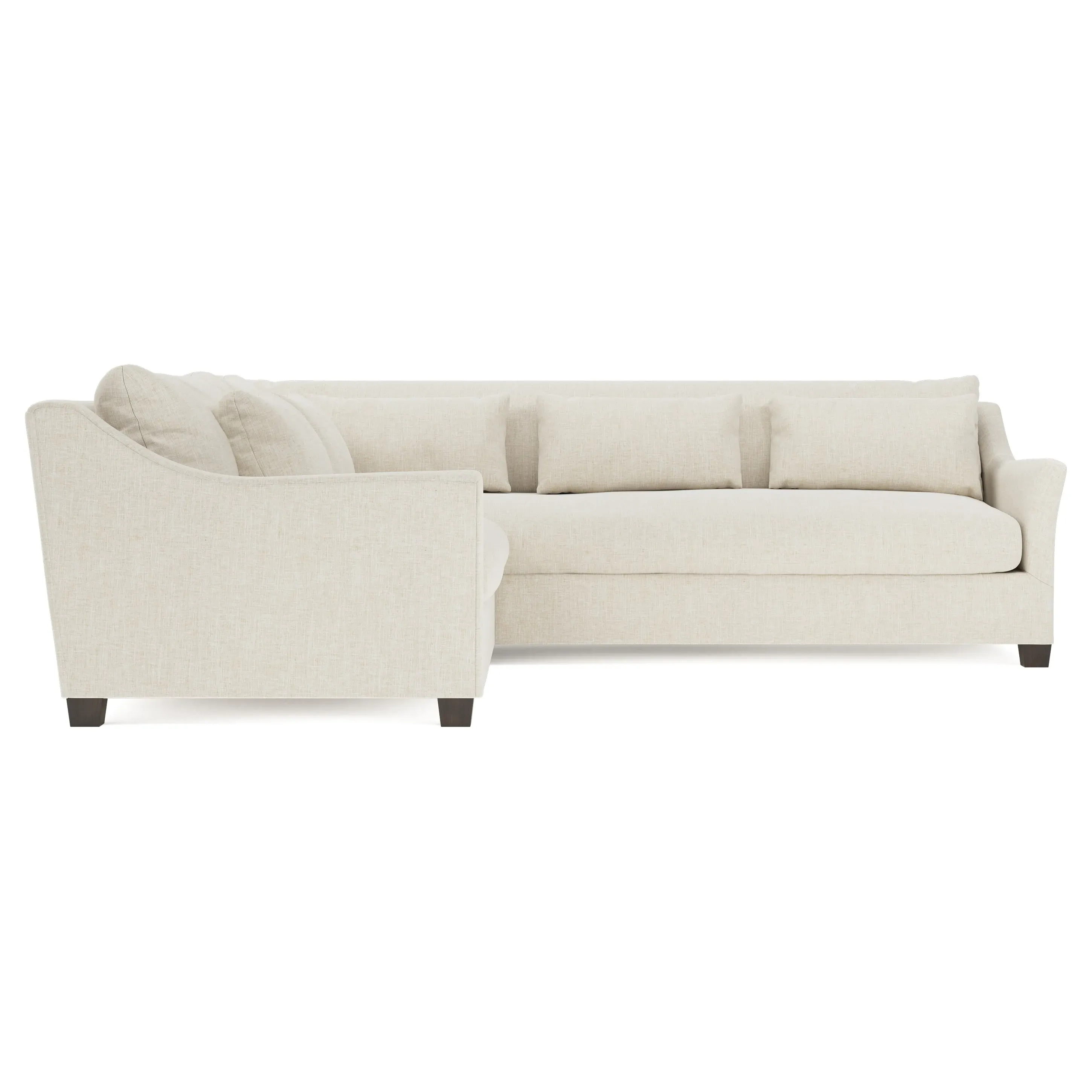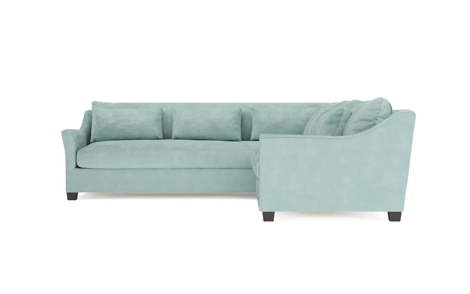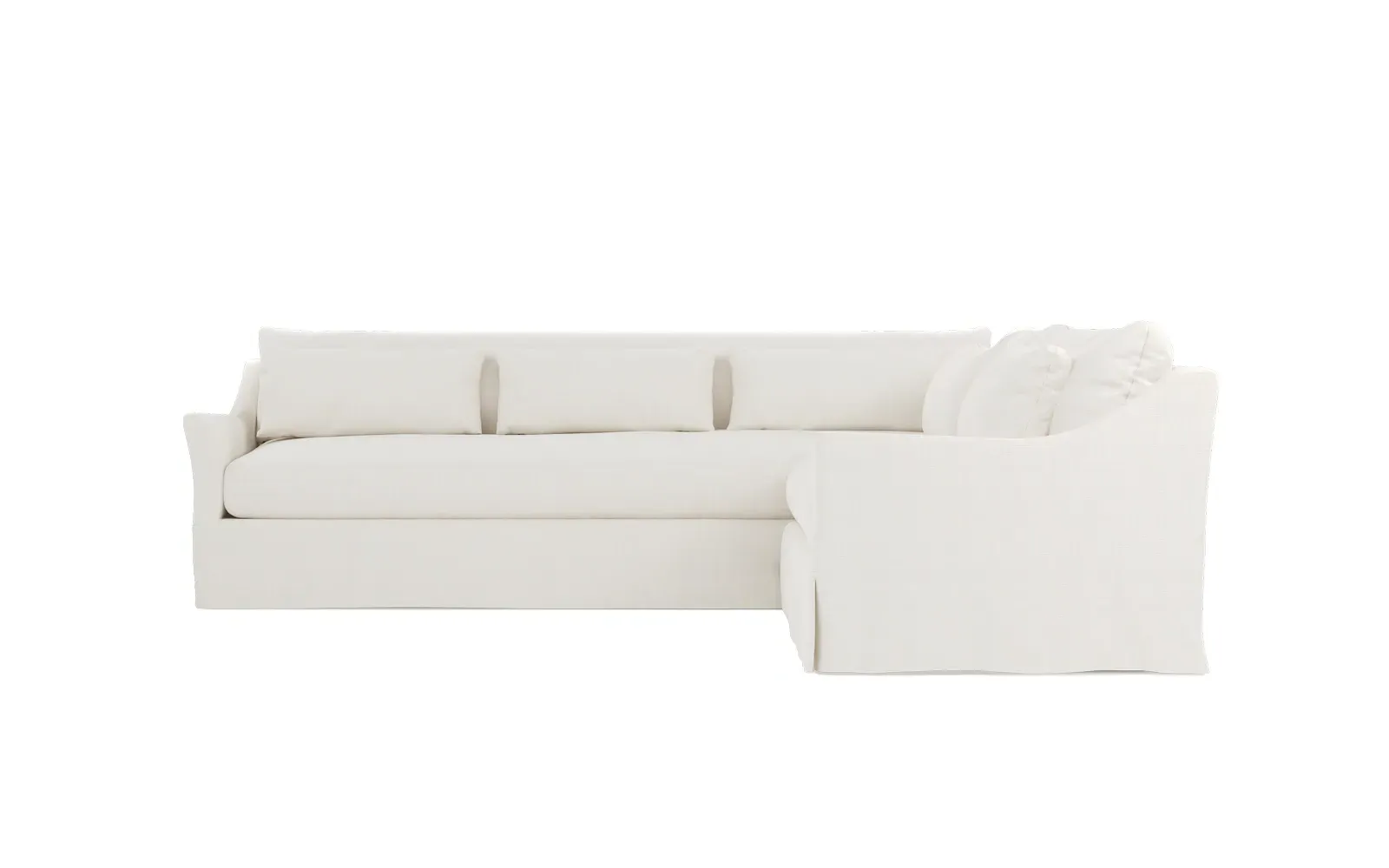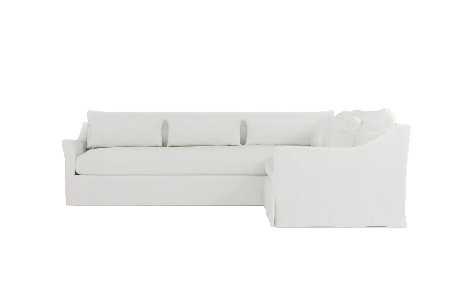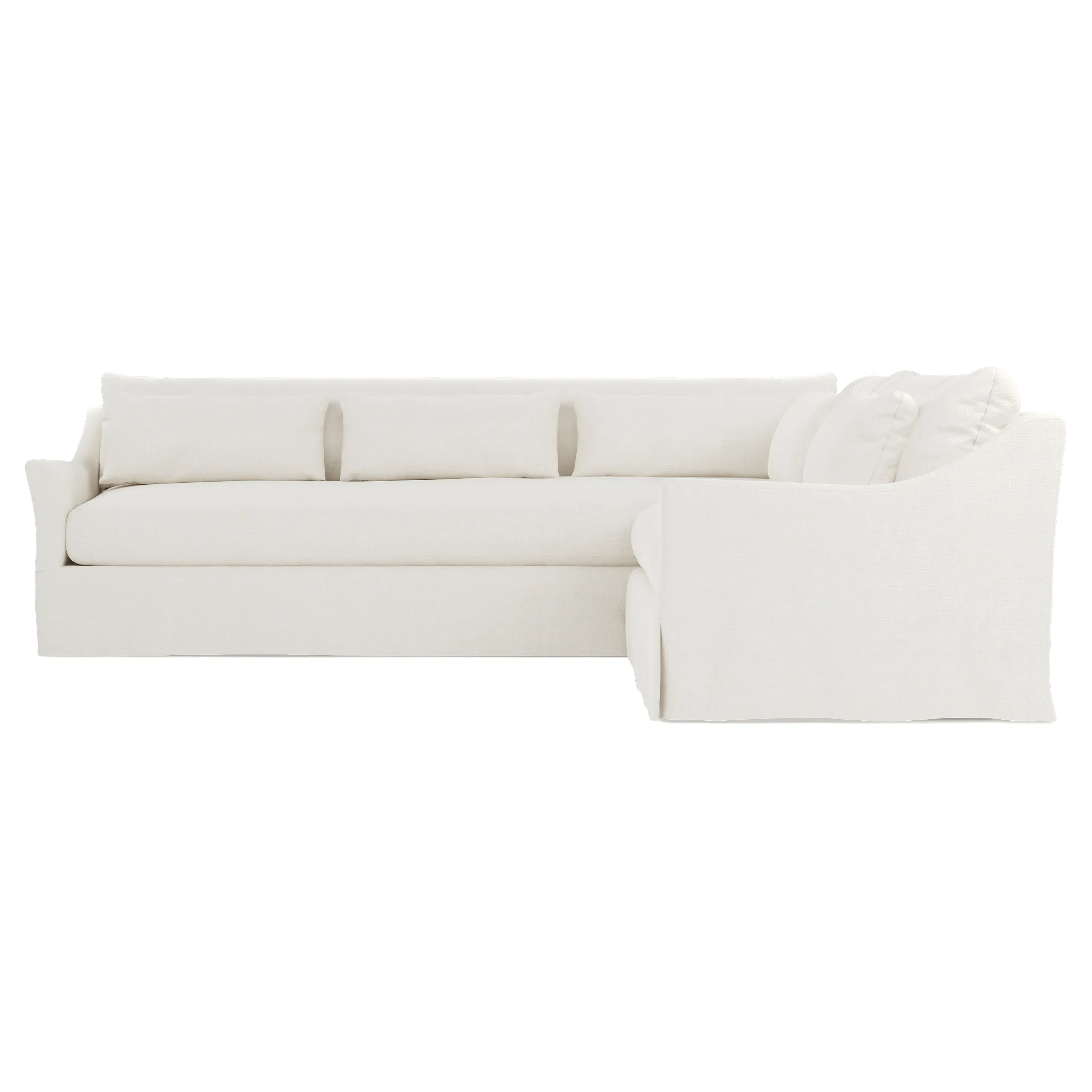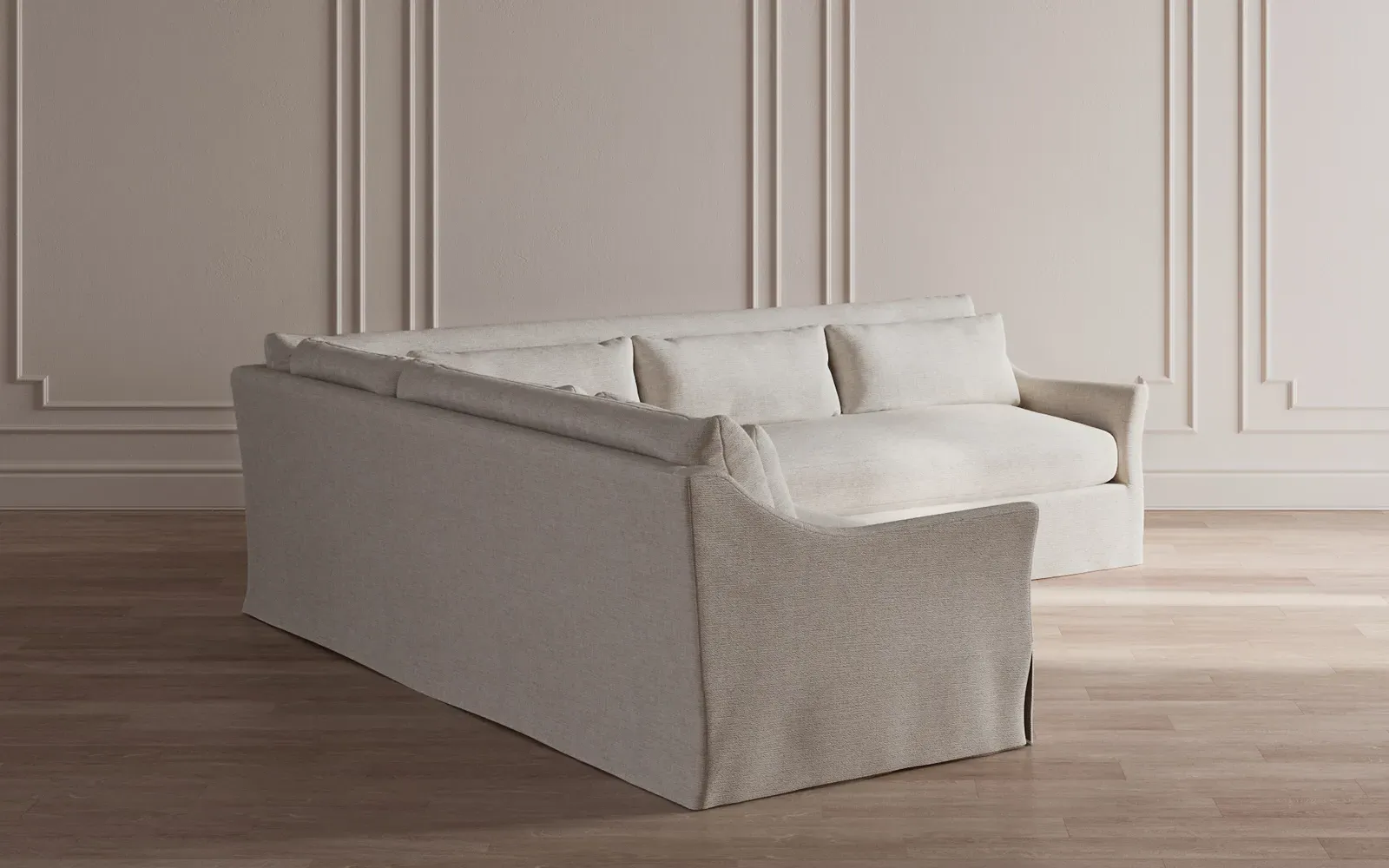 The left 106” Pauline corner sectional features gently sloped, flared arms, low wood legs, and a spacious seat. Its structured silhouette is a natural divider for great rooms, making it easy to define a seating area in open-concept spaces. Soft yet supportive, the seat cushions are designed for plush comfort, with a foam core surrounded by a blend of fiber, down, and feather fill. Choose from a variety of upholstery options, including linen, velvet, and performance fabrics. <b>Overall Dimensions: </b> 106" W x 118" D x 35" H. <b>End Sofa with Corner Dimensions: </b> 118" W x 41" D x 35" H; <b>End Sofa Dimensions: </b> 65” W x 41” D x 35” H; <b>Seat Depth: </b>19” to the front of lumbar pillows, 24” to the front of back cushions; <b>Seat Height: </b>22”; <b>Arm Height: </b> 25”; <b>Leg Height: </b> 3 ½”. <b>Materials:</b> FSC®-certified, US-sourced, formaldehyde-free solid kiln-dried hardwood and furniture-grade laminates. <b>Material Finish: </b> Espresso legs. <b>Pieces Included: </b> Right end sofa with corner and left end sofa.