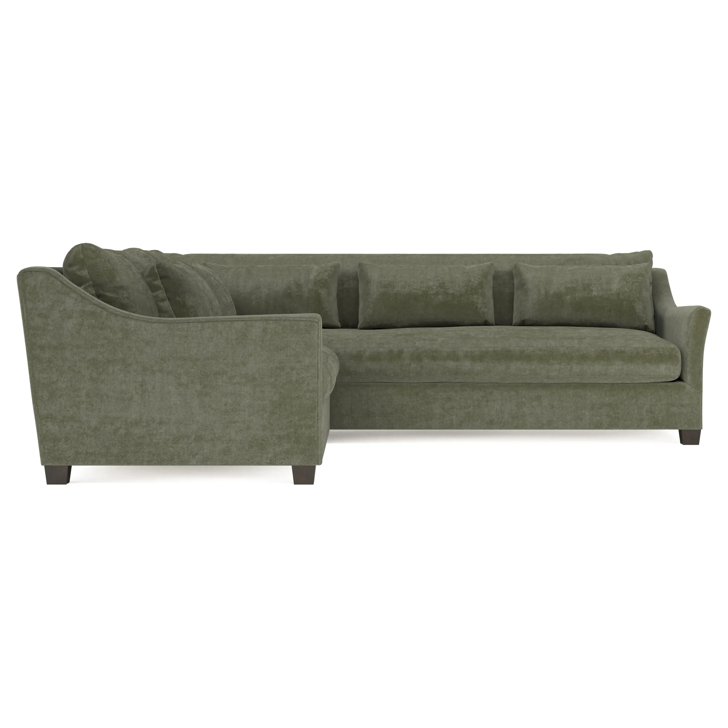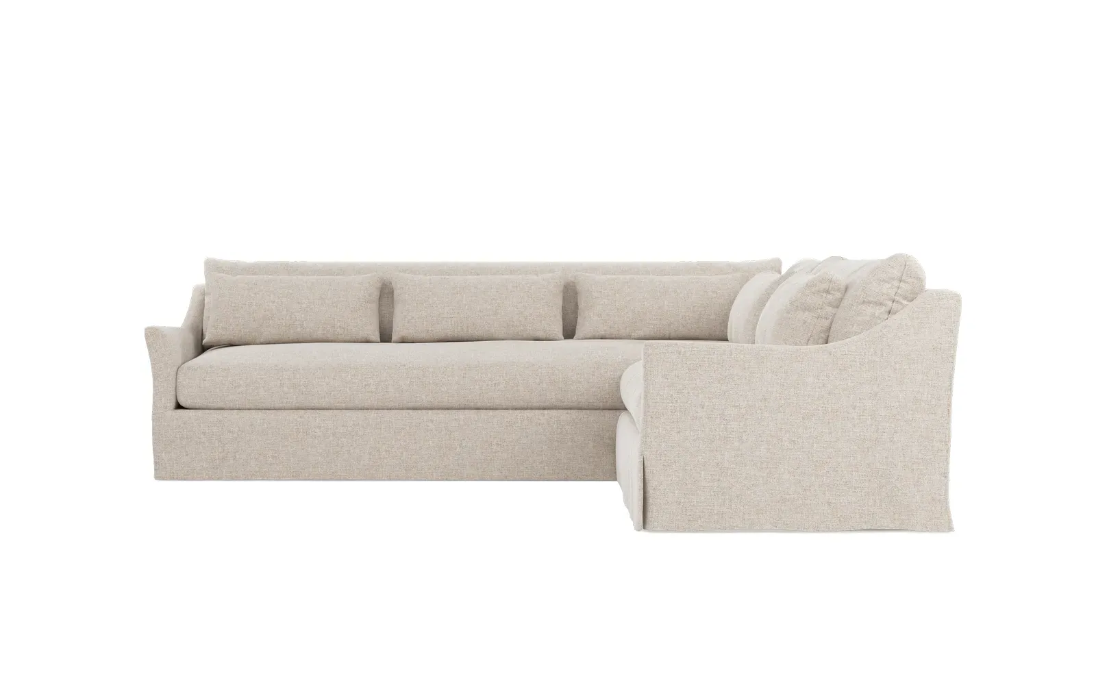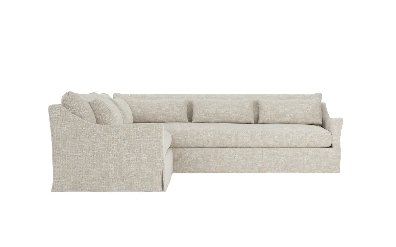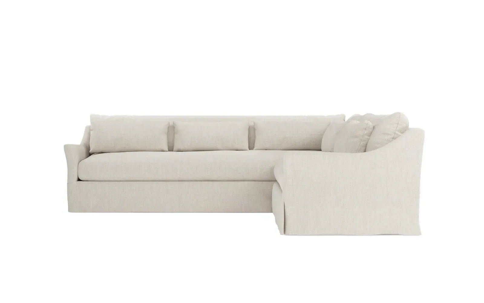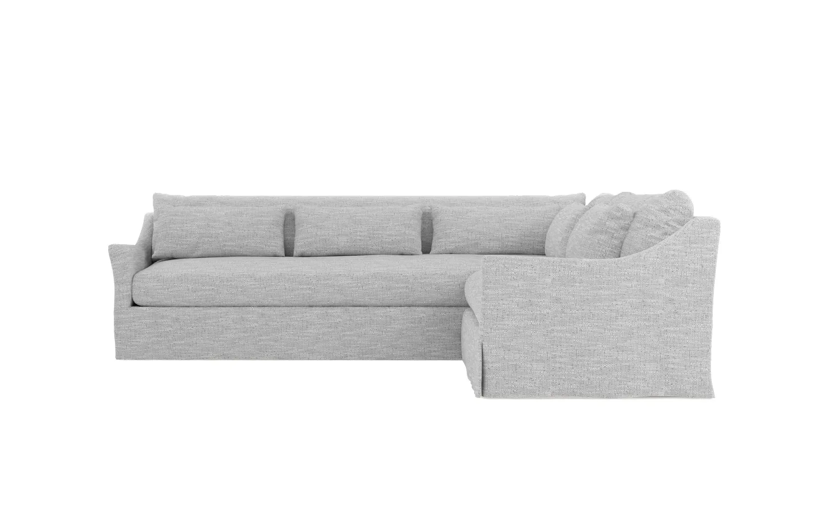The left 106” Pauline corner sectional features gently sloped, flared arms, low wood legs, and a spacious seat. Its structured silhouette is a natural divider for great rooms, making it easy to define a seating area in open-concept spaces. Soft yet supportive, the seat cushions are designed for plush comfort, with a foam core surrounded by a blend of fiber, down, and feather fill. Choose from a variety of upholstery options, including linen, velvet, and performance fabrics. <b>Overall Dimensions: </b> 106" W x 118" D x 35" H. <b>End Sofa with Corner Dimensions: </b> 118" W x 41" D x 35" H; <b>End Sofa Dimensions: </b> 65” W x 41” D x 35” H; <b>Seat Depth: </b>19” to the front of lumbar pillows, 24” to the front of back cushions; <b>Seat Height: </b>22”; <b>Arm Height: </b> 25”; <b>Leg Height: </b> 3 ½”. <b>Materials:</b> FSC®-certified, US-sourced, formaldehyde-free solid kiln-dried hardwood and furniture-grade laminates. <b>Material Finish: </b> Espresso legs. <b>Pieces Included: </b> Right end sofa with corner and left end sofa.