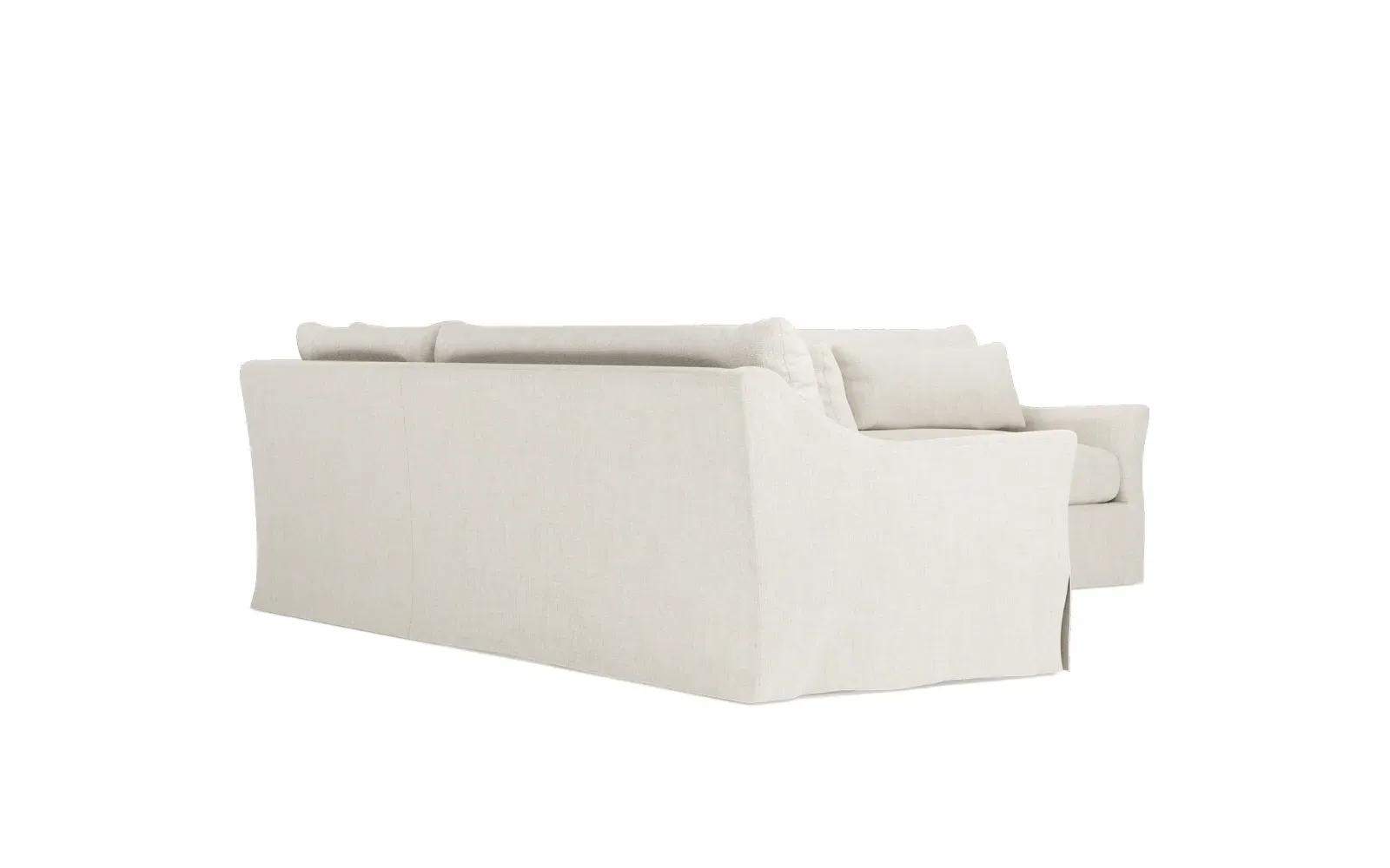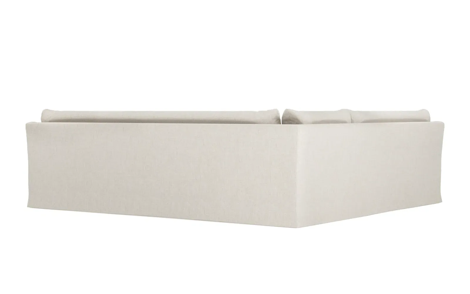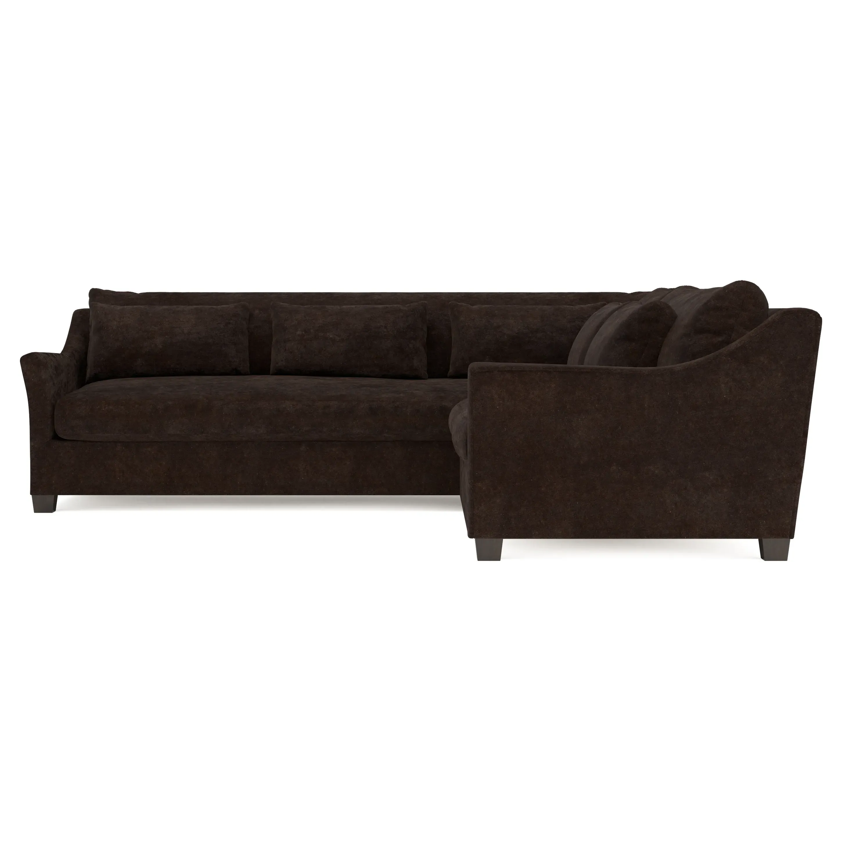 The Pauline corner sectional offers plush comfort with its foam core surrounded by fiber, down, and feather fill. Its gently sloped, flared arms and structured silhouette provide both support and visual appeal, while the spacious seat design accommodates relaxed lounging. The solid kiln-dried hardwood frame ensures lasting durability, and the low espresso wood legs add a refined finish. W269 x D300 x H89 cm.
