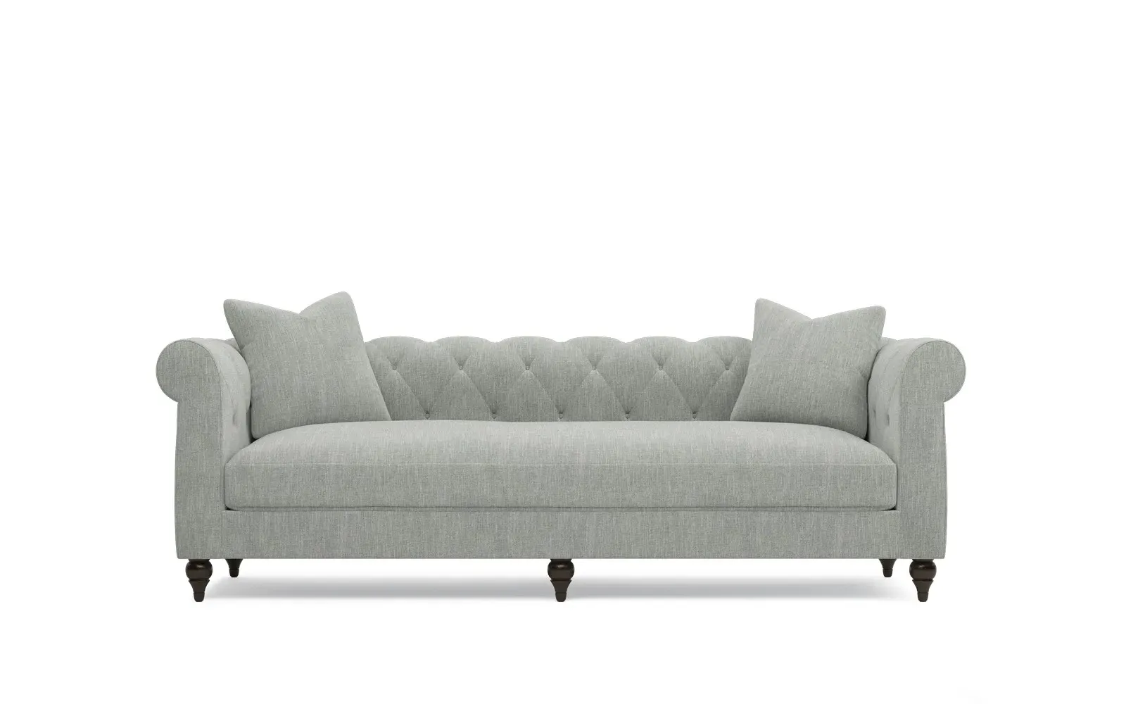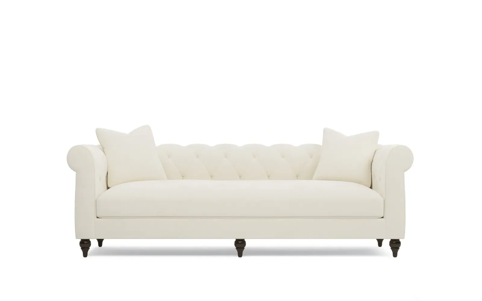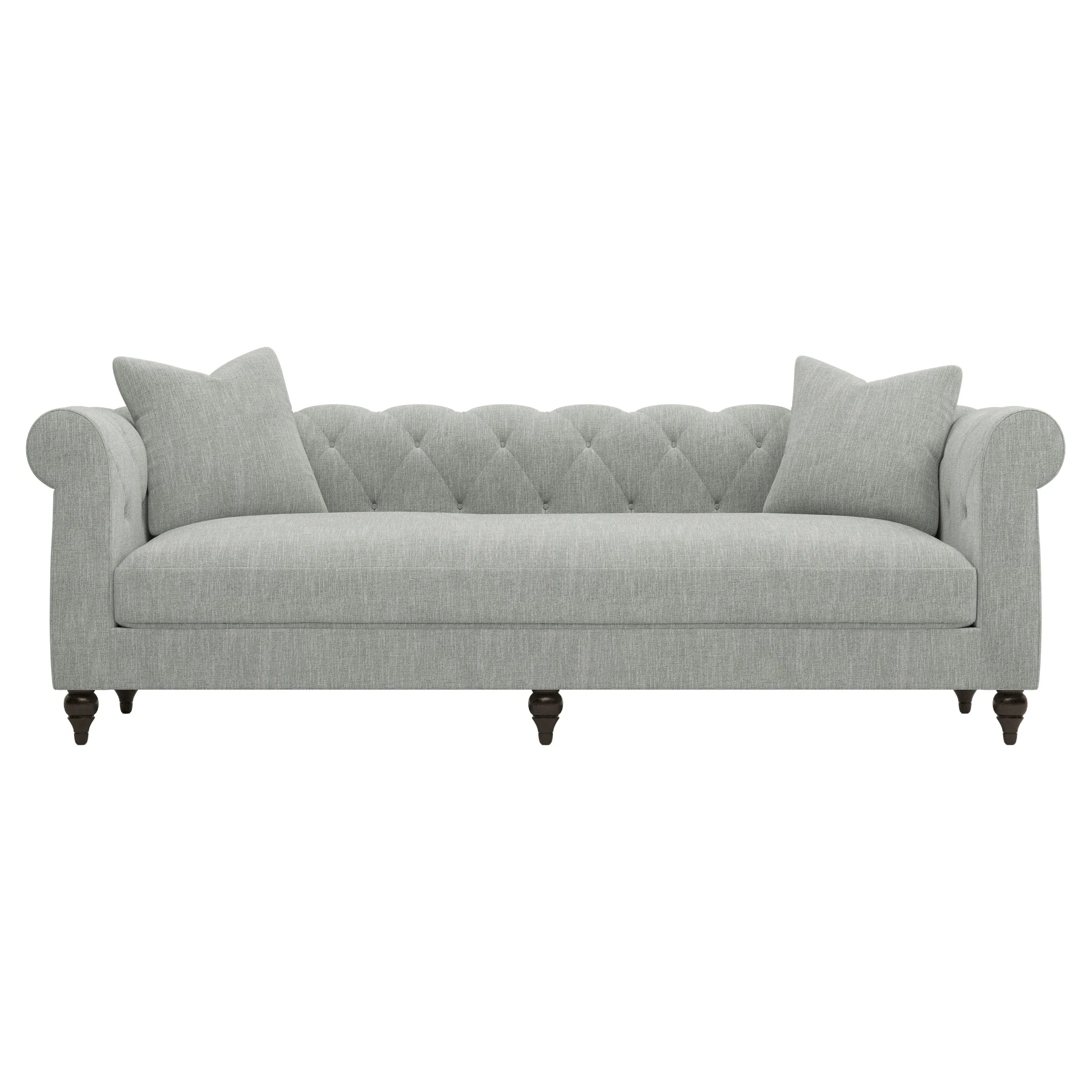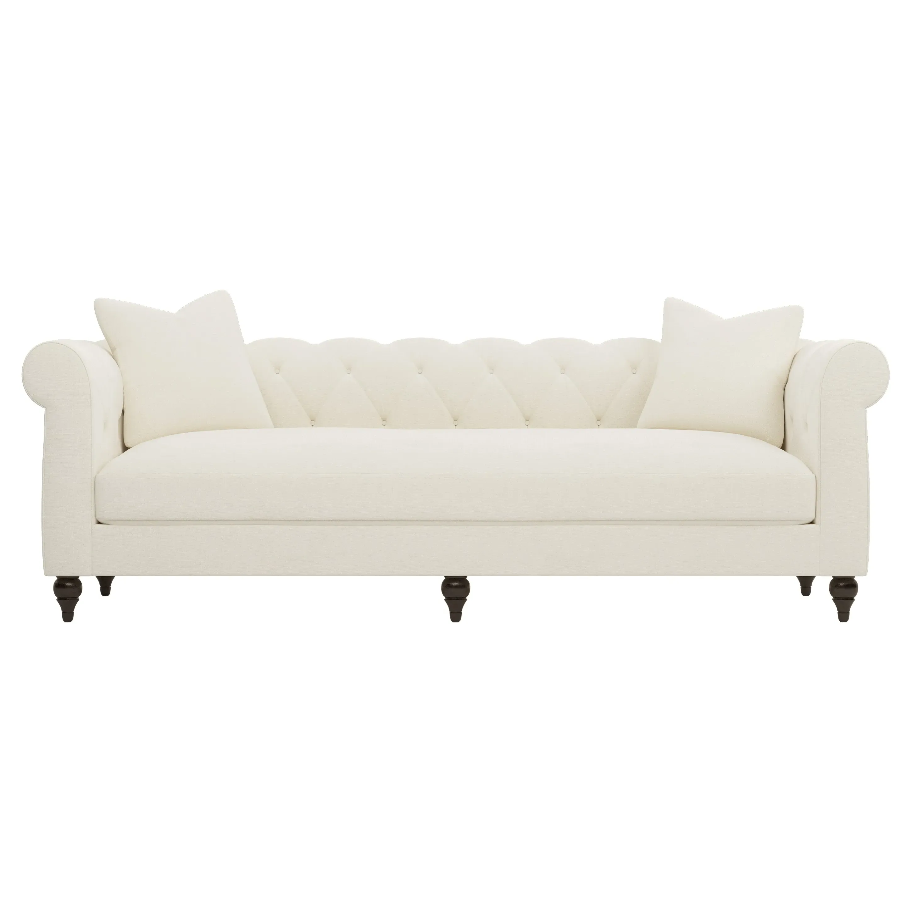 A Kathy Kuo Home exclusive, our 94” Rosehill sofa puts a modern twist on the traditional Chesterfield style. Designed without pleating for a cleaner look, the timeless silhouette highlights rolled arms, a tufted back, and turned wood legs. A simple, sophisticated bench seat features a custom cushion fill—hypoallergenic Trillium® fiber holds its shape and offers all the comfort of down without the fluffing maintenance. This charming sofa is a perfect choice for any classic living room. <b>Overall Dimensions:</b> 94" W x 35" D x 30" H. <b>Seat Dimensions:</b> 78” W x 23” D x 19” H; <b>Arm Height:</b> 30”; <b>Leg Height:</b> 5”. <b>Materials:</b> Poplar and plywood. <b>Leg Finish:</b> Dark Espresso. <b>Cushion Fill: A new KKH custom sit features Trillium®, a hypoallergenic poly fiber that offers all the benefits and comfort of down, without the escaping feathers or fluffing maintenance.</b> Trillium® fill is wrapped around a CertiPUR-US® certified, high-resiliency foam core, which provides just enough structure and ensures longevity.