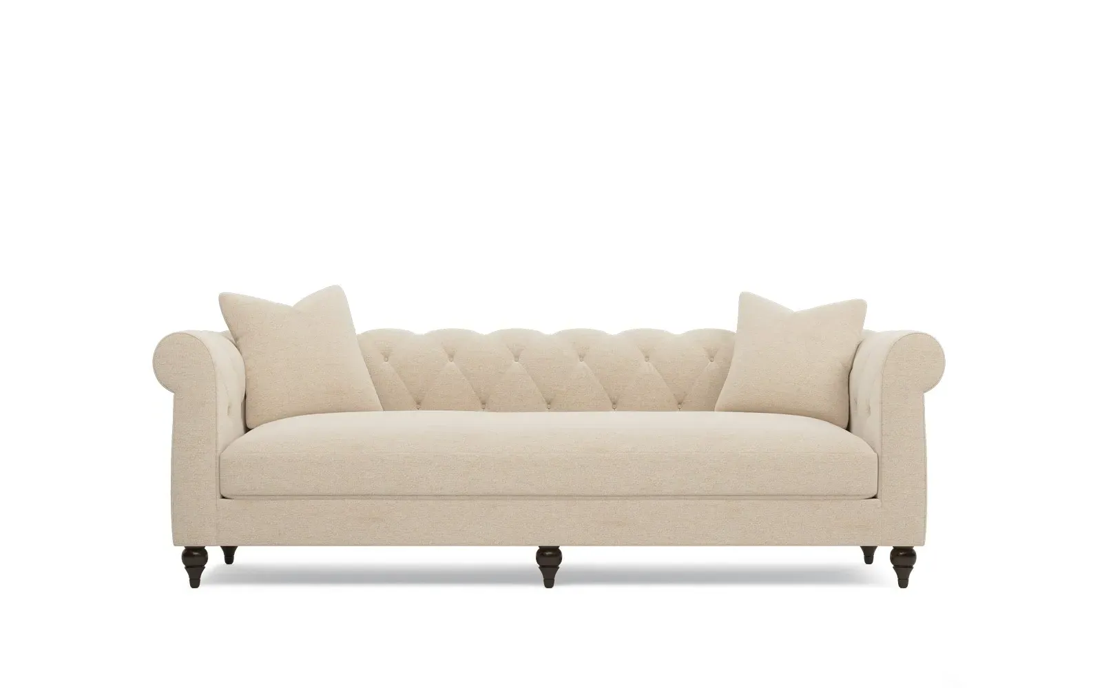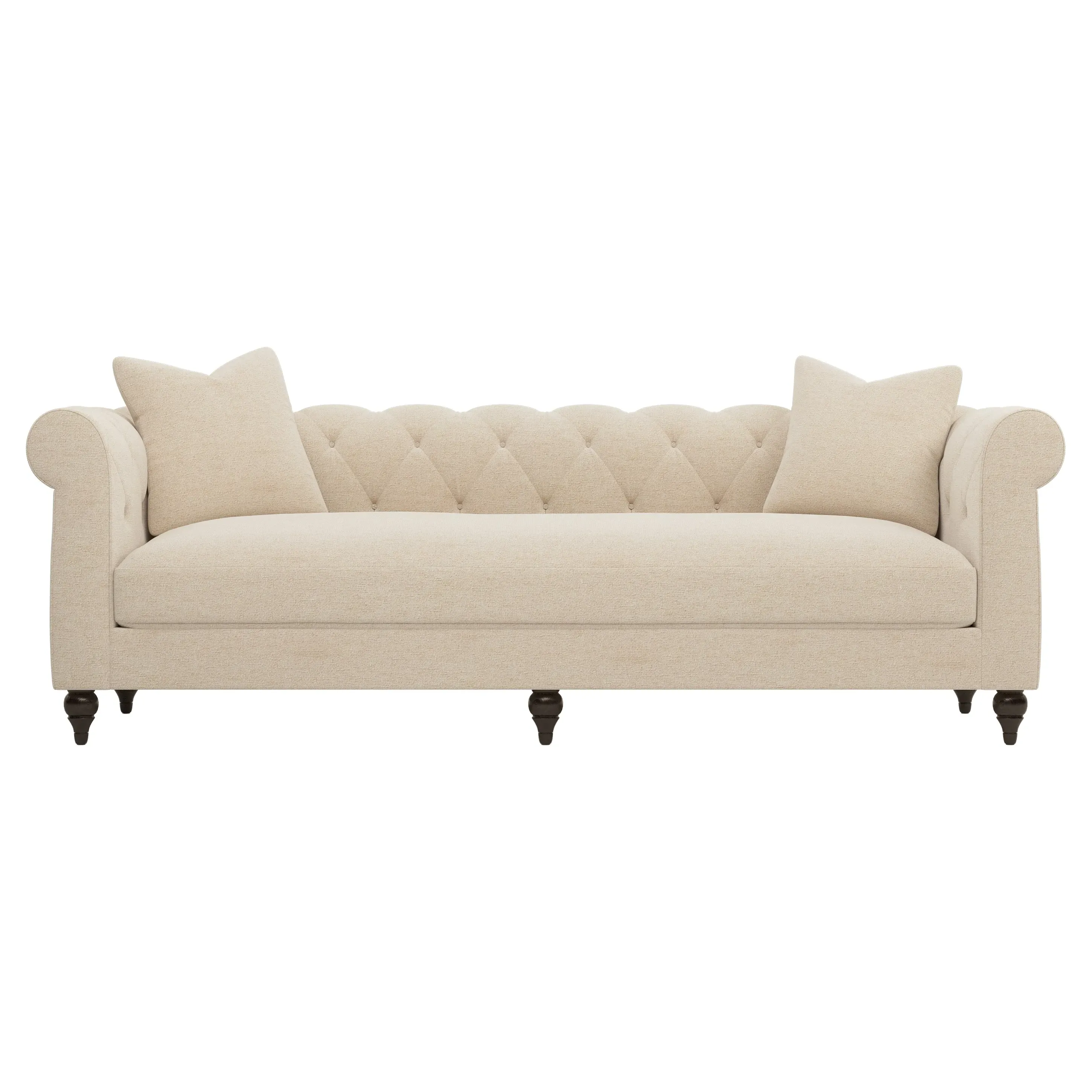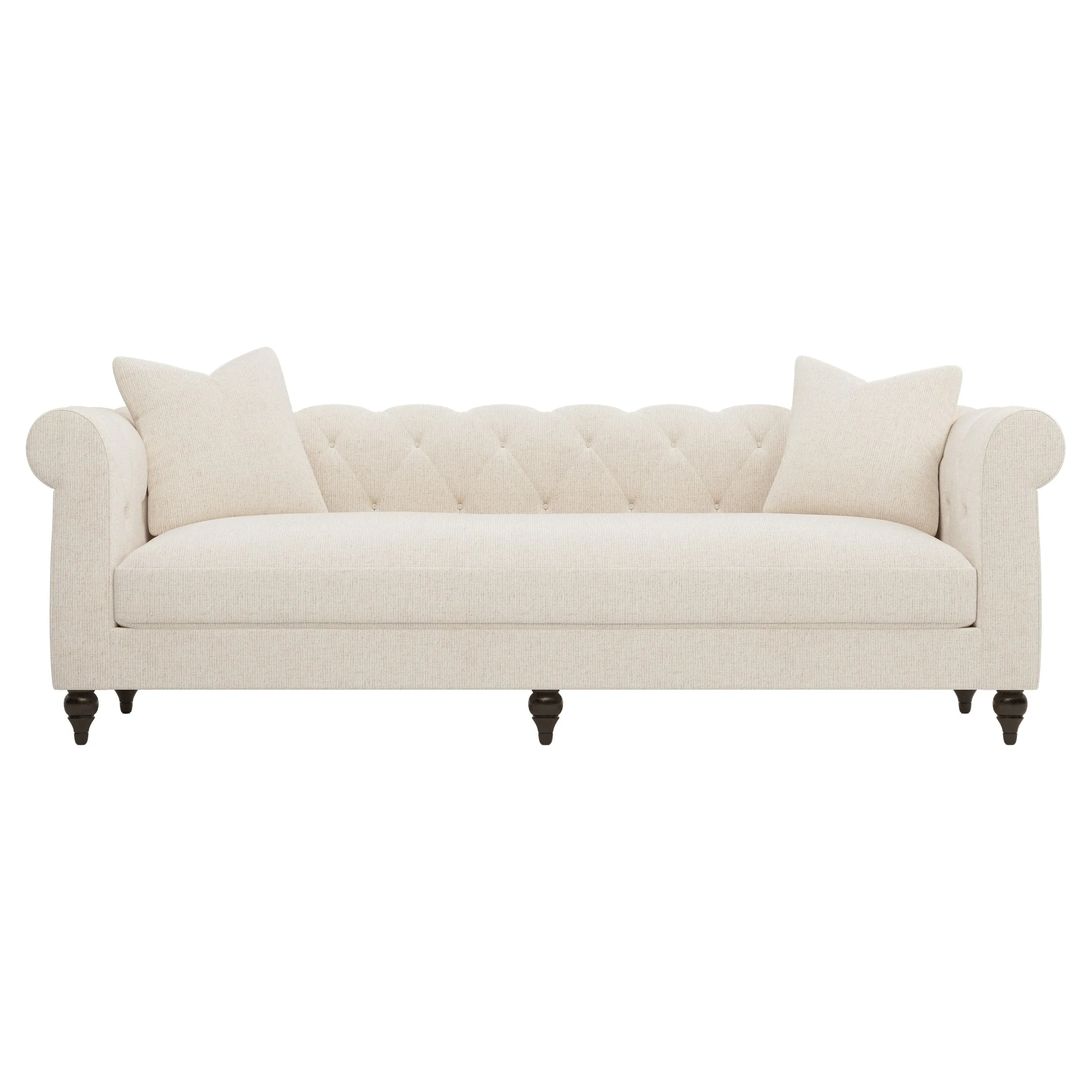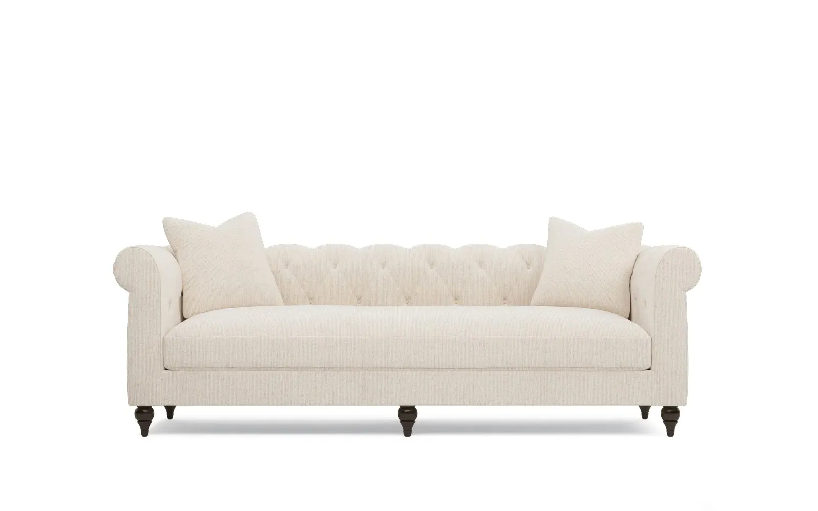 A Kathy Kuo Home exclusive, our 94” Rosehill sofa puts a modern twist on the traditional Chesterfield style. Designed without pleating for a cleaner look, the timeless silhouette highlights rolled arms, a tufted back, and turned wood legs. A simple, sophisticated bench seat features a custom cushion fill—hypoallergenic Trillium® fiber holds its shape and offers all the comfort of down without the fluffing maintenance. This charming sofa is a perfect choice for any classic living room. <b>Overall Dimensions:</b> 94" W x 35" D x 30" H. <b>Seat Dimensions:</b> 78” W x 23” D x 19” H; <b>Arm Height:</b> 30”; <b>Leg Height:</b> 5”. <b>Materials:</b> Poplar and plywood. <b>Leg Finish:</b> Dark Espresso. <b>Cushion Fill: A new KKH custom sit features Trillium®, a hypoallergenic poly fiber that offers all the benefits and comfort of down, without the escaping feathers or fluffing maintenance.</b> Trillium® fill is wrapped around a CertiPUR-US® certified, high-resiliency foam core, which provides just enough structure and ensures longevity.