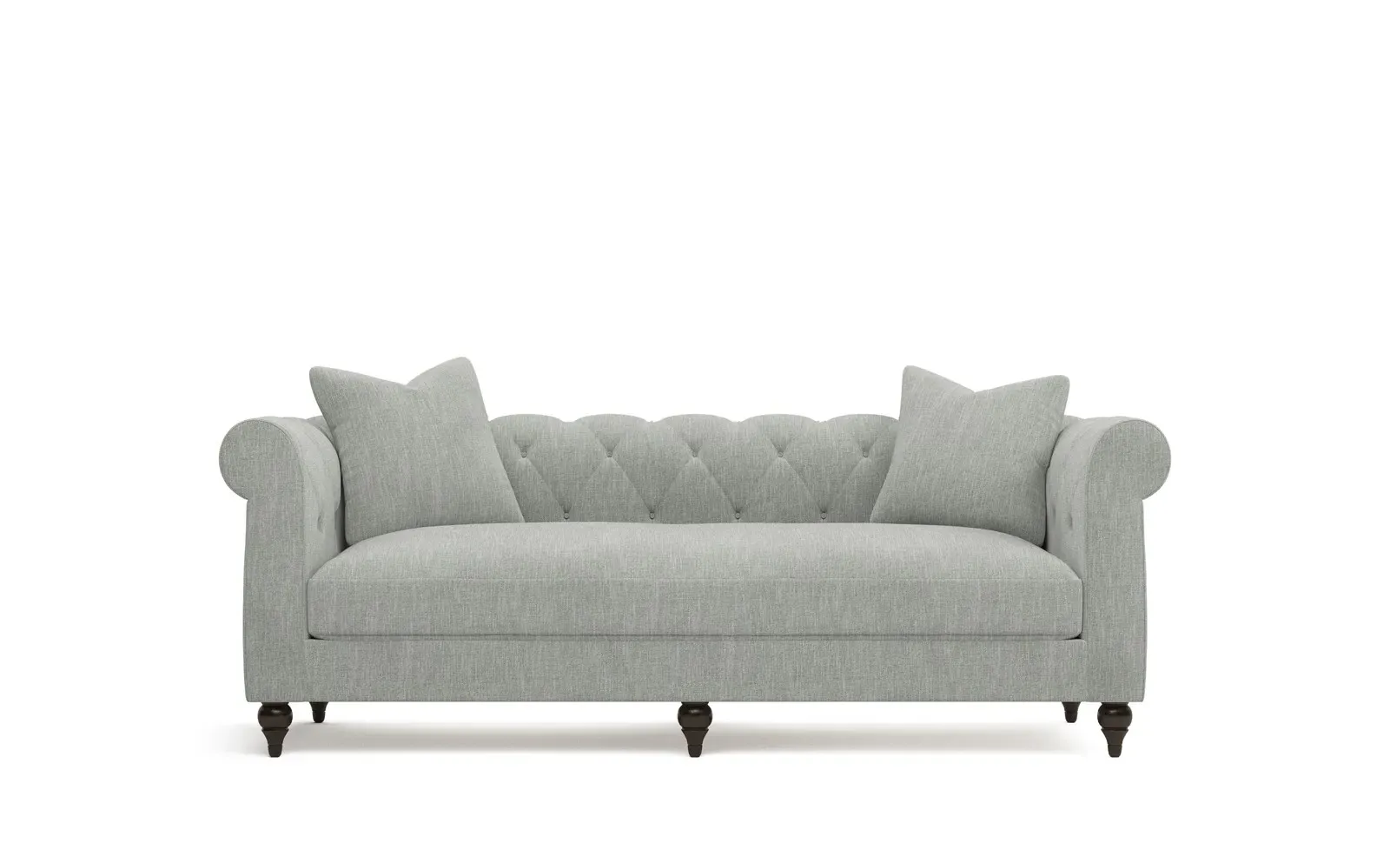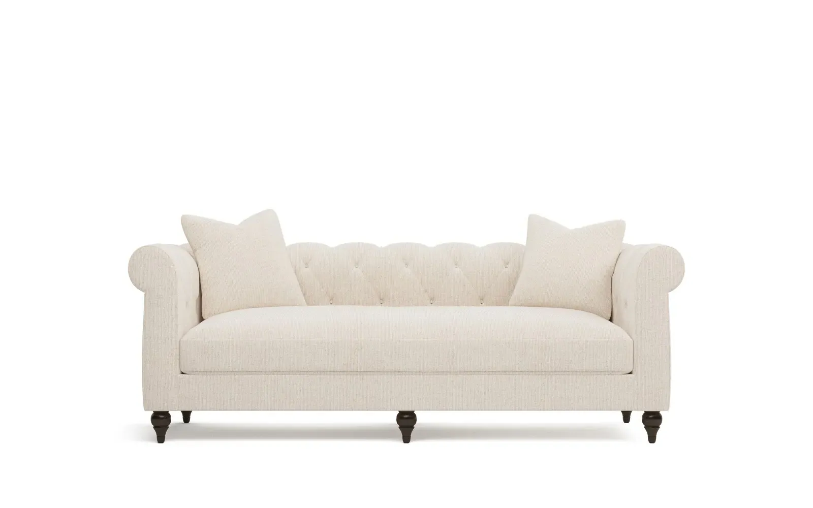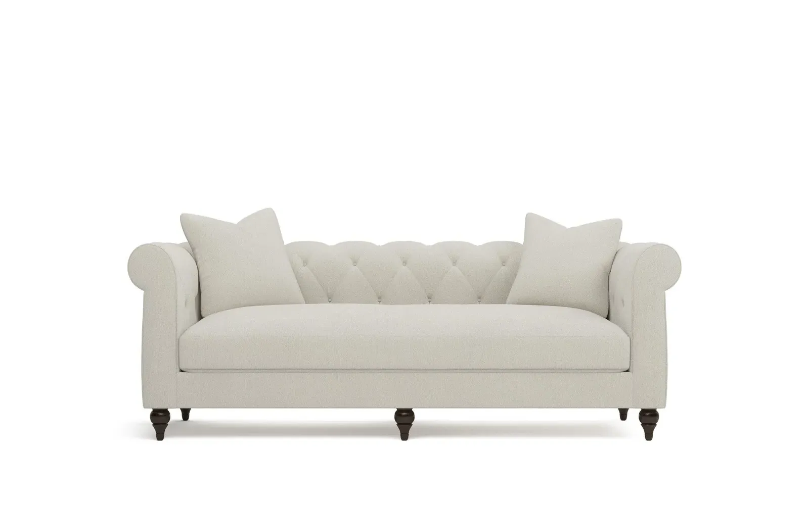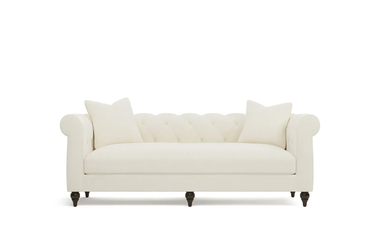 A Kathy Kuo Home exclusive, our 88” Rosehill sofa puts a modern twist on the traditional Chesterfield style. Designed without pleating for a cleaner look, the timeless silhouette highlights rolled arms, a tufted back, and turned wood legs. A simple, sophisticated bench seat features a custom cushion fill—hypoallergenic Trillium® fiber holds its shape and offers all the comfort of down without the fluffing maintenance. This charming sofa is a perfect choice for any classic living room. <b>Overall Dimensions:</b> 88" W x 35" D x 30" H. <b>Seat Dimensions:</b> 72” W x 23” D x 19” H; <b>Arm Height:</b> 30”; <b>Leg Height:</b> 5”. <b>Materials:</b> Poplar and plywood. <b>Leg Finish:</b> Dark Espresso. <b>Cushion Fill: A new KKH custom sit features Trillium®, a hypoallergenic poly fiber that offers all the benefits and comfort of down, without the escaping feathers or fluffing maintenance.</b> Trillium® fill is wrapped around a CertiPUR-US® certified, high-resiliency foam core, which provides just enough structure and ensures longevity.