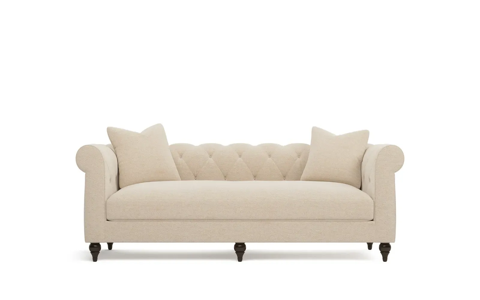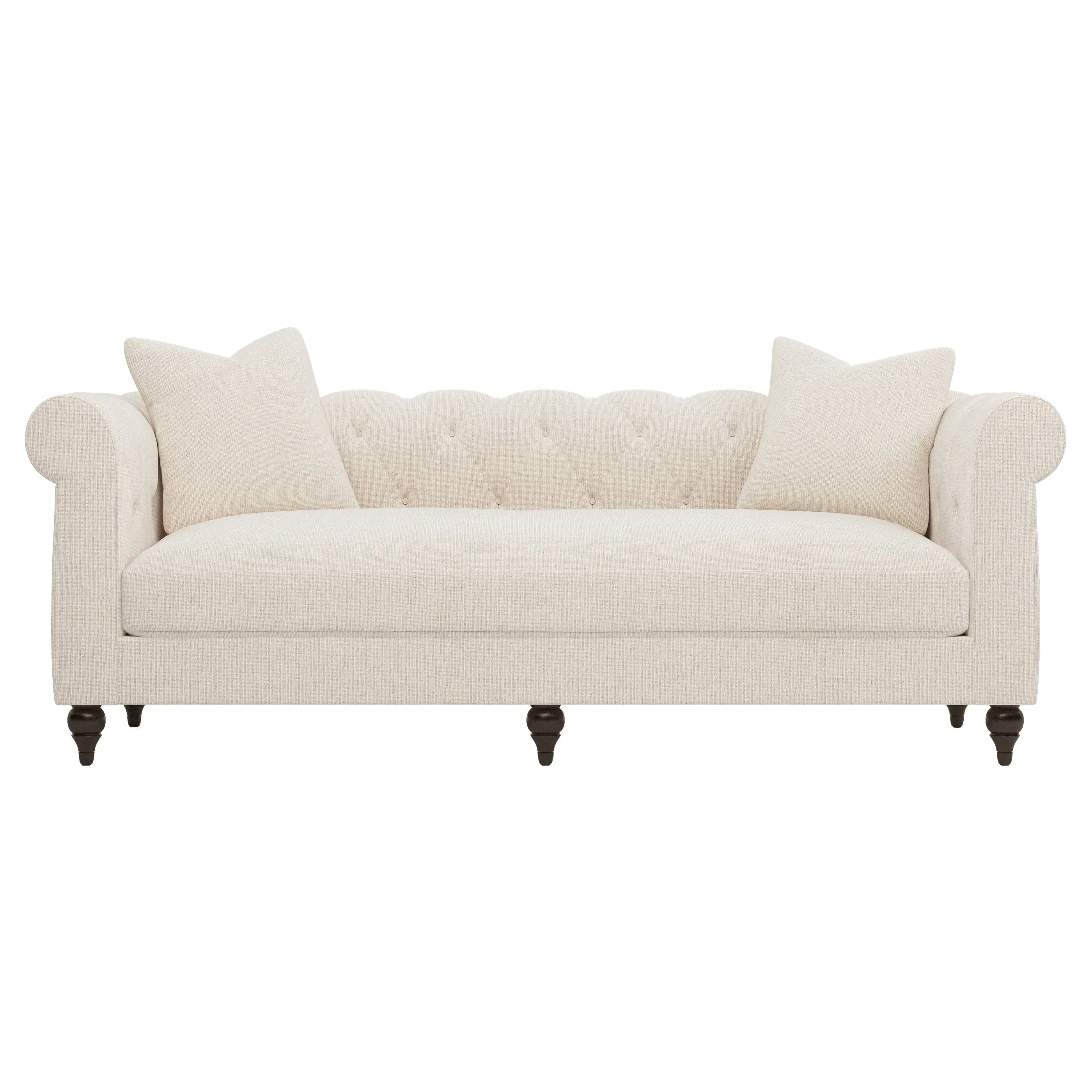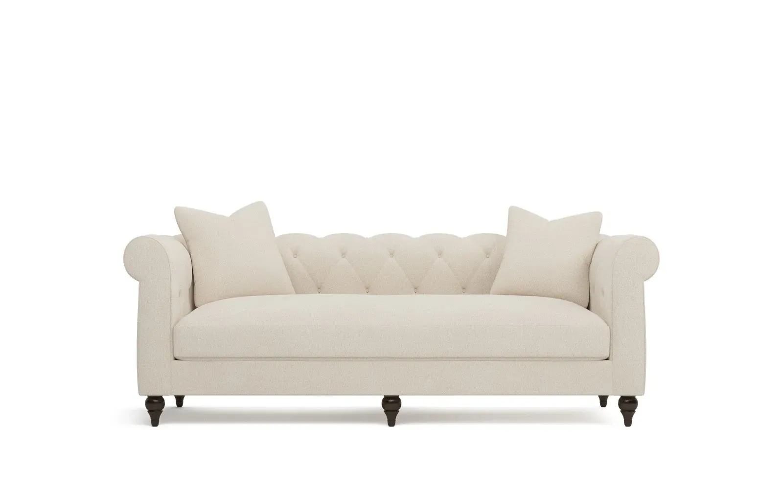 A Kathy Kuo Home exclusive, our 88” Rosehill sofa puts a modern twist on the traditional Chesterfield style. Designed without pleating for a cleaner look, the timeless silhouette highlights rolled arms, a tufted back, and turned wood legs. A simple, sophisticated bench seat features a custom cushion fill—hypoallergenic Trillium® fiber holds its shape and offers all the comfort of down without the fluffing maintenance. This charming sofa is a perfect choice for any classic living room. <b>Overall Dimensions:</b> 88" W x 35" D x 30" H. <b>Seat Dimensions:</b> 72” W x 23” D x 19” H; <b>Arm Height:</b> 30”; <b>Leg Height:</b> 5”. <b>Materials:</b> Poplar and plywood. <b>Leg Finish:</b> Dark Espresso. <b>Cushion Fill: A new KKH custom sit features Trillium®, a hypoallergenic poly fiber that offers all the benefits and comfort of down, without the escaping feathers or fluffing maintenance.</b> Trillium® fill is wrapped around a CertiPUR-US® certified, high-resiliency foam core, which provides just enough structure and ensures longevity.