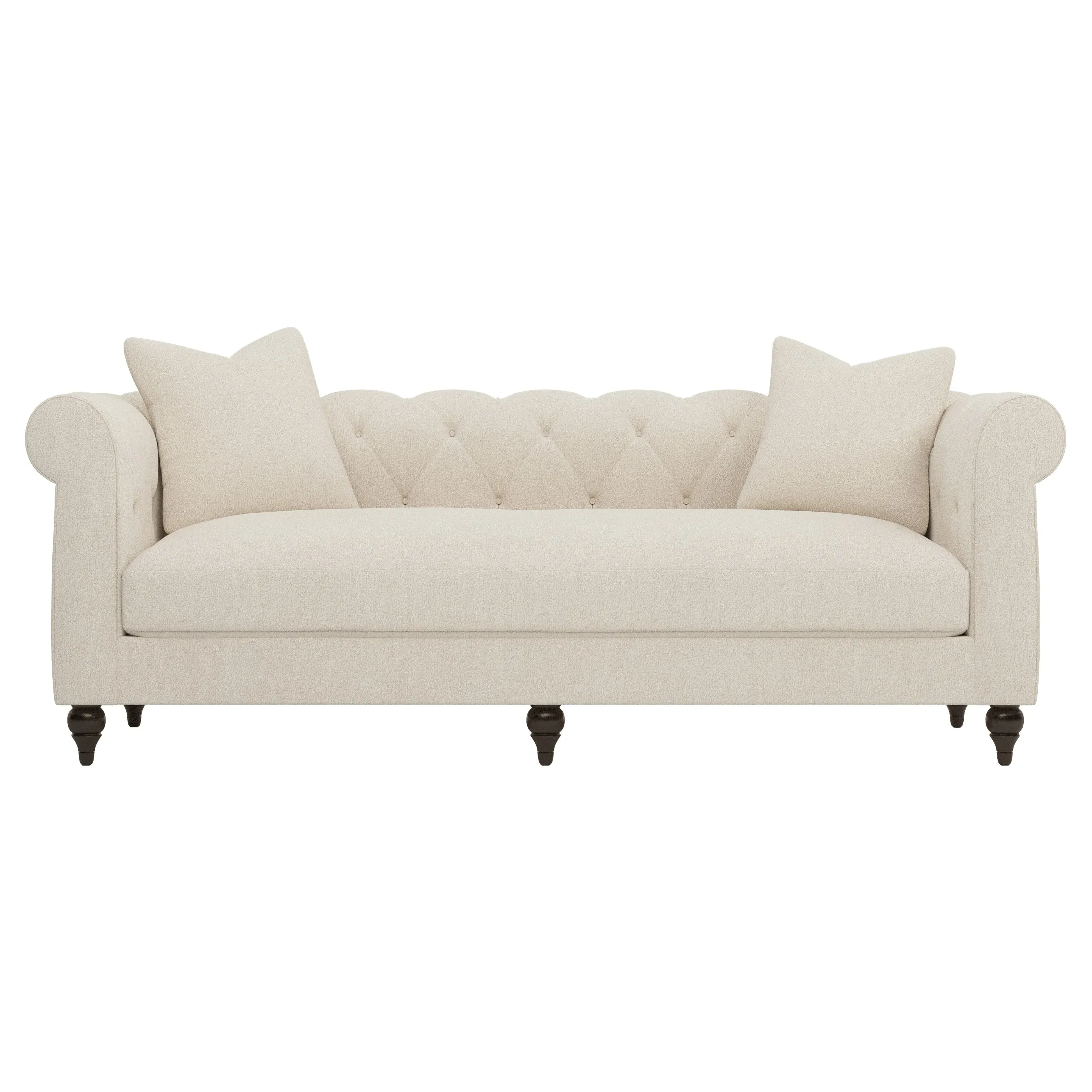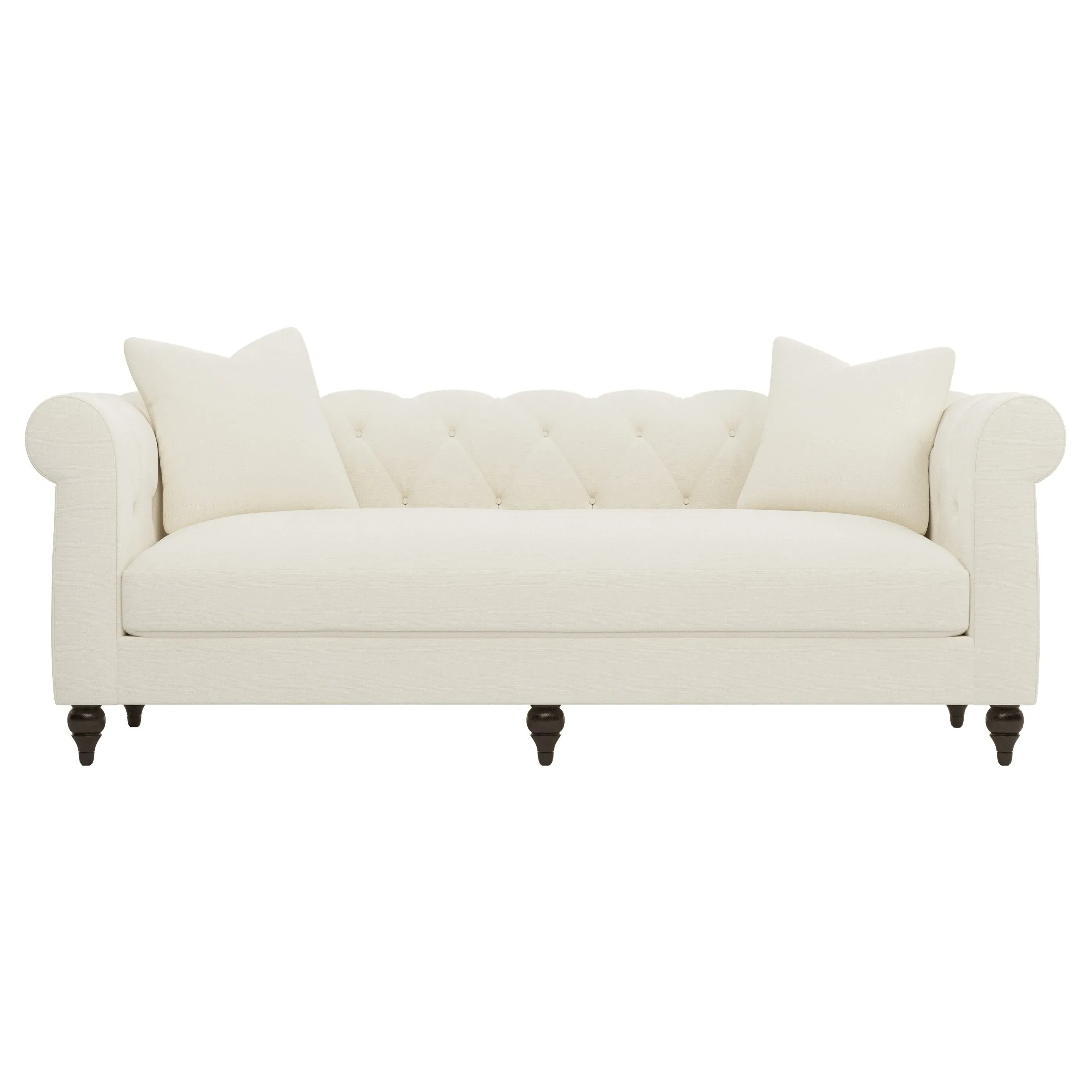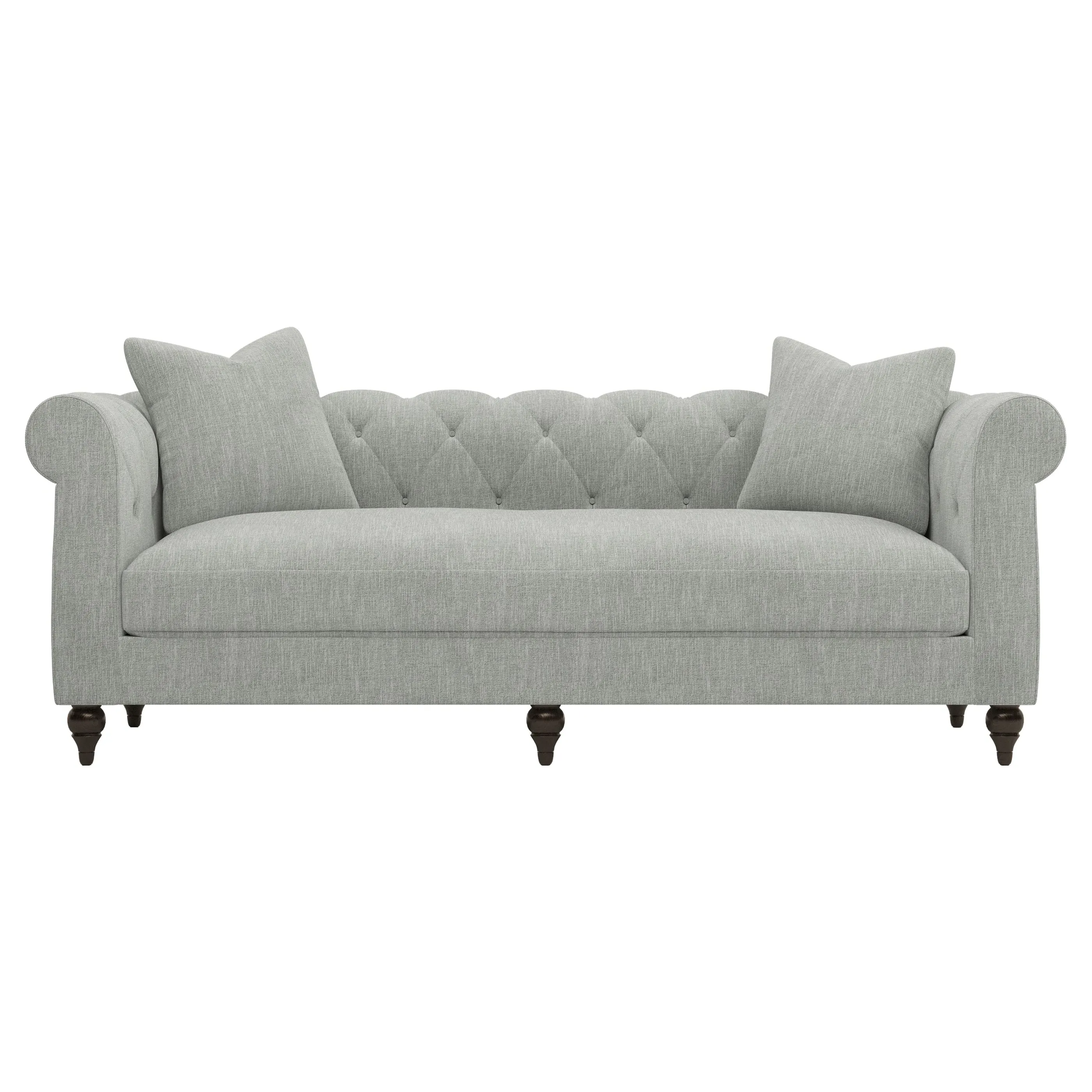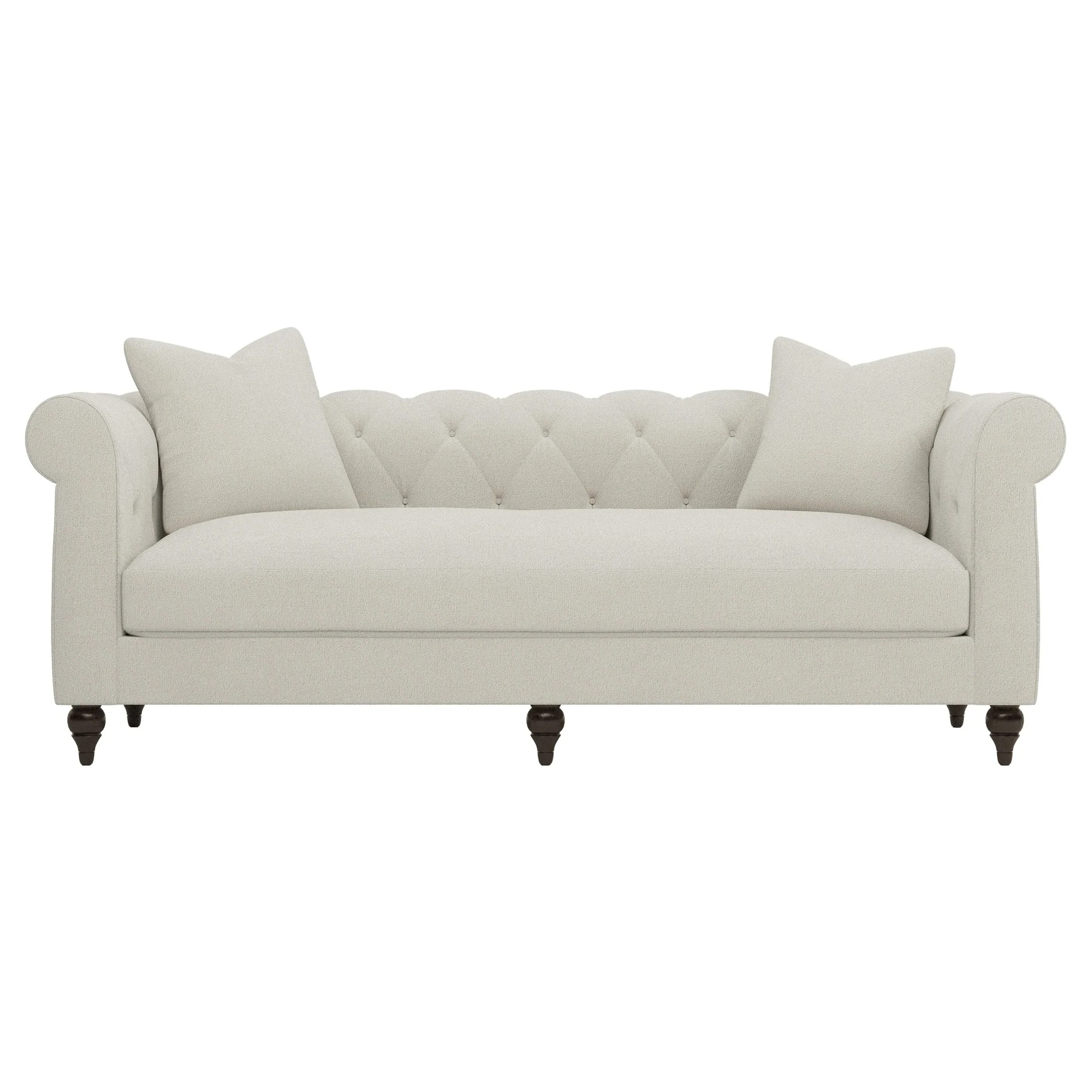 A Kathy Kuo Home exclusive, our 88” Rosehill sofa puts a modern twist on the traditional Chesterfield style. Designed without pleating for a cleaner look, the timeless silhouette highlights rolled arms, a tufted back, and turned wood legs. A simple, sophisticated bench seat features a custom cushion fill—hypoallergenic Trillium® fiber holds its shape and offers all the comfort of down without the fluffing maintenance. This charming sofa is a perfect choice for any classic living room. <b>Overall Dimensions:</b> 88" W x 35" D x 30" H. <b>Seat Dimensions:</b> 72” W x 23” D x 19” H; <b>Arm Height:</b> 30”; <b>Leg Height:</b> 5”. <b>Materials:</b> Poplar and plywood. <b>Leg Finish:</b> Dark Espresso. <b>Cushion Fill: A new KKH custom sit features Trillium®, a hypoallergenic poly fiber that offers all the benefits and comfort of down, without the escaping feathers or fluffing maintenance.</b> Trillium® fill is wrapped around a CertiPUR-US® certified, high-resiliency foam core, which provides just enough structure and ensures longevity.