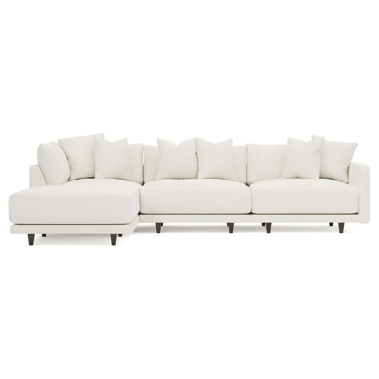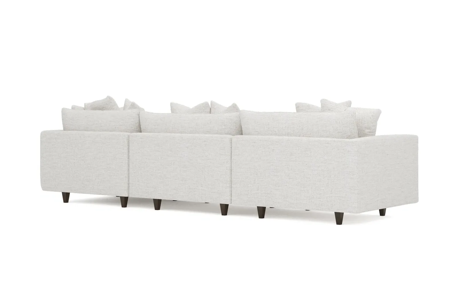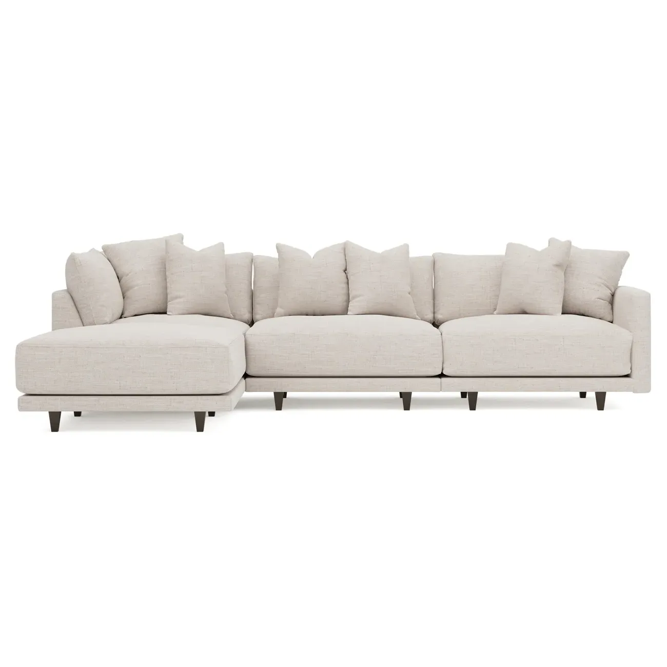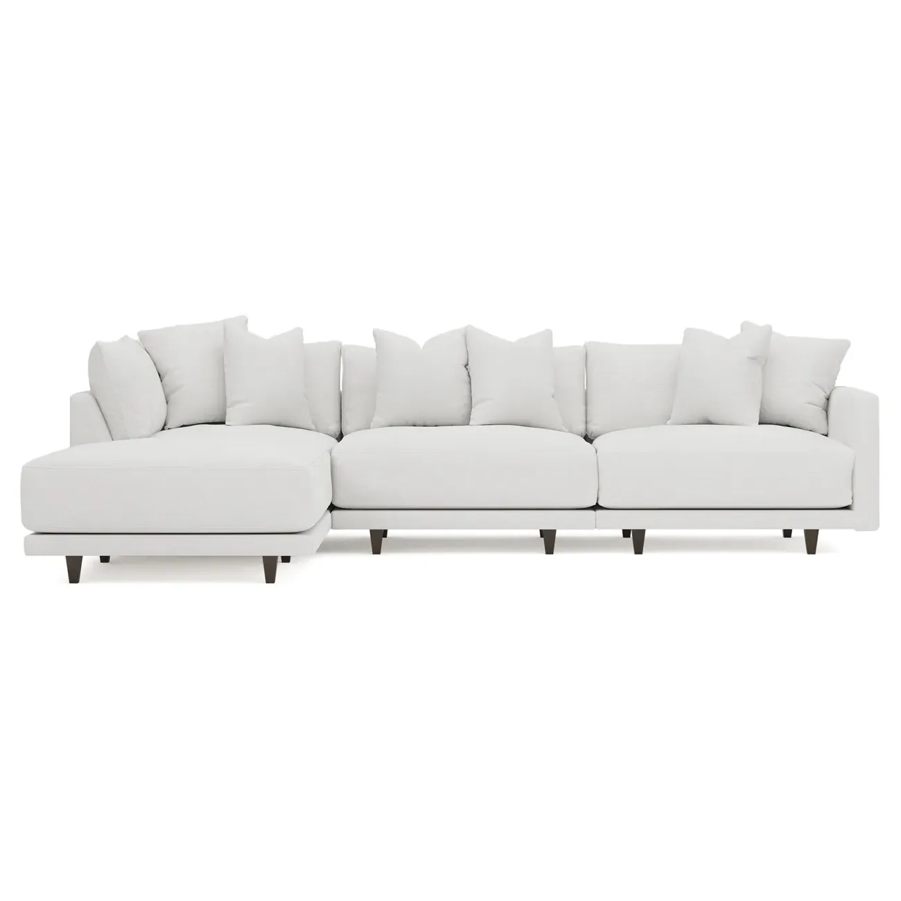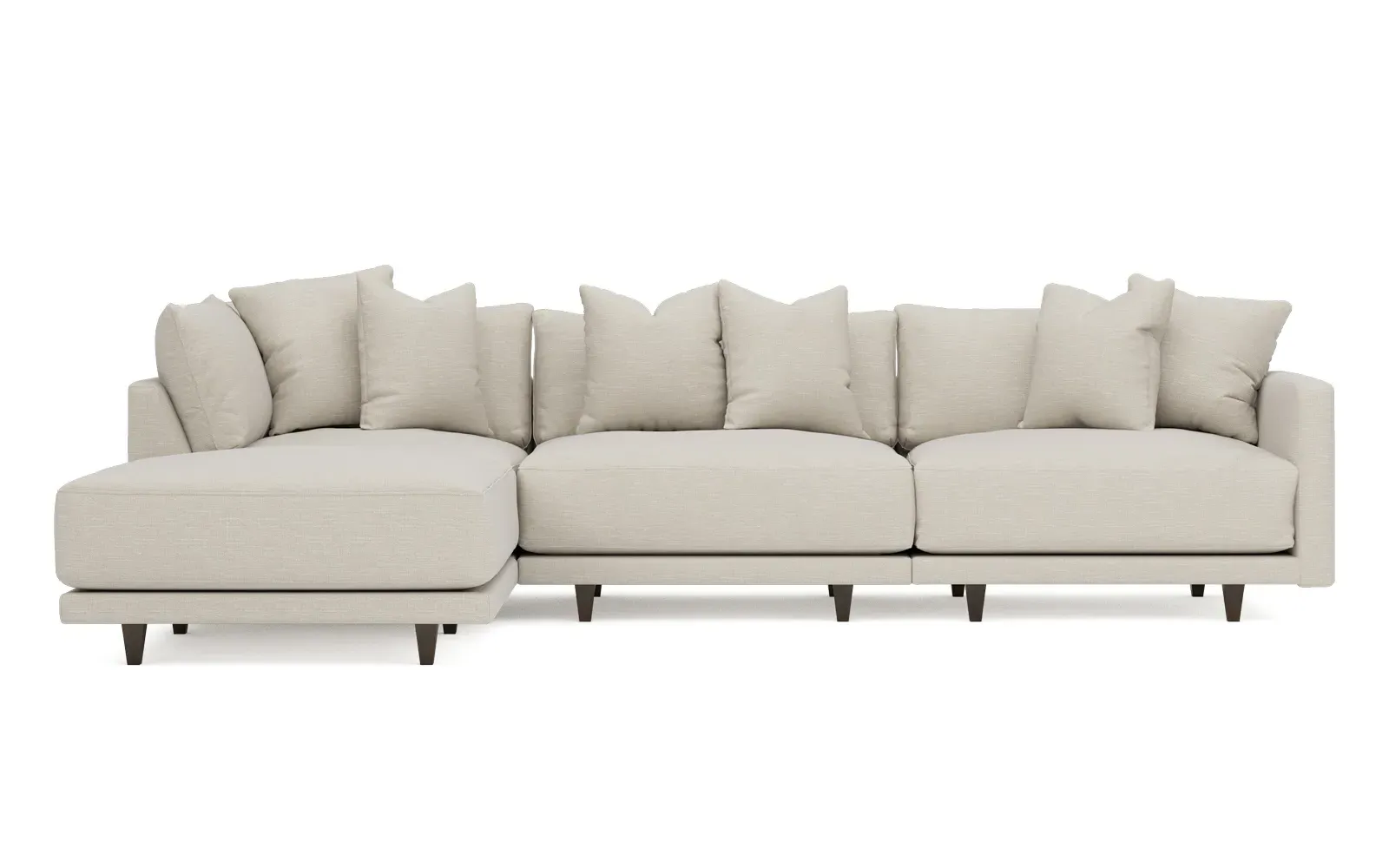 The living is easy on the right 129” Toulouse modular chaise sectional. With deep seating and oh-so-many plush pillows for sink-in comfort, the modern silhouette is delightfully relaxed. Recessed wood legs are hidden from sight, giving the sofa the appearance of floating. Lofted cushions are soft and supportive, with a foam core surrounded by a blend of fiber, down, and feather fill. Choose from a variety of upholstery options, including linen, velvet, and performance fabrics. <b>Overall Dimensions:</b> 129" W x 81" D x 35" H. <b>Ottoman Dimensions:</b> 40” W x 40” D x 20” H; <b>Corner Seat Dimensions:</b> 41” W x 41” D x 35” H; <b>Armless Seat Dimensions:</b> 42” W x 41” D x 35” H; <b>Single Seat Dimensions:</b> 46” W x 41” D x 35” H; <b>Seat Dimensions:</b> 29” D x 20” H; <b>Arm Height:</b> 27”; <b>Leg Height:</b> 5”. <b>Materials:</b> FSC®-certified, US-sourced, formaldehyde-free solid kiln-dried hardwood and furniture-grade laminates. <b>Material Finish:</b> Espresso legs. <b>Pieces Included:</b> Ottoman, Corner Seat, Armless Seat, Left Single Seat.