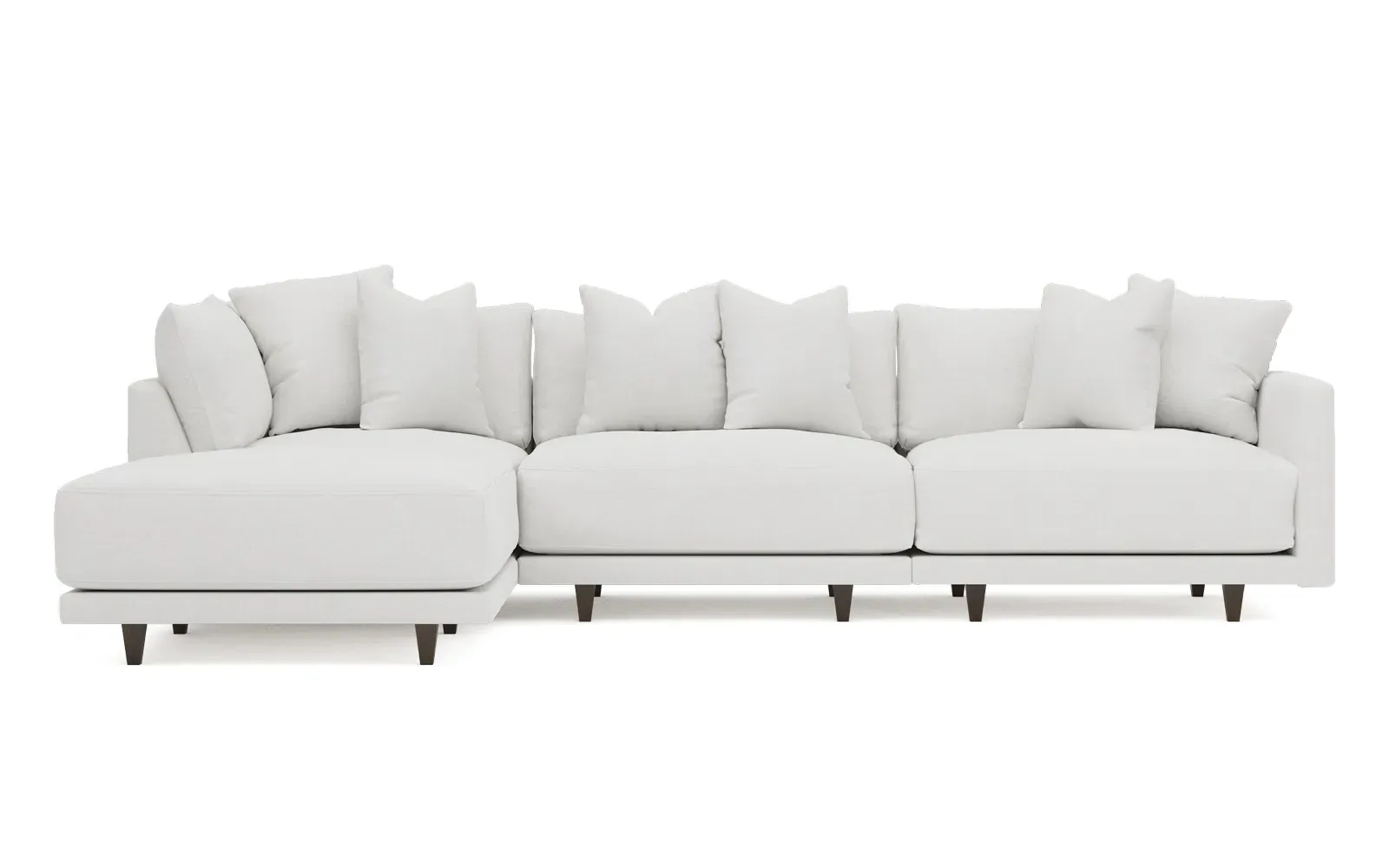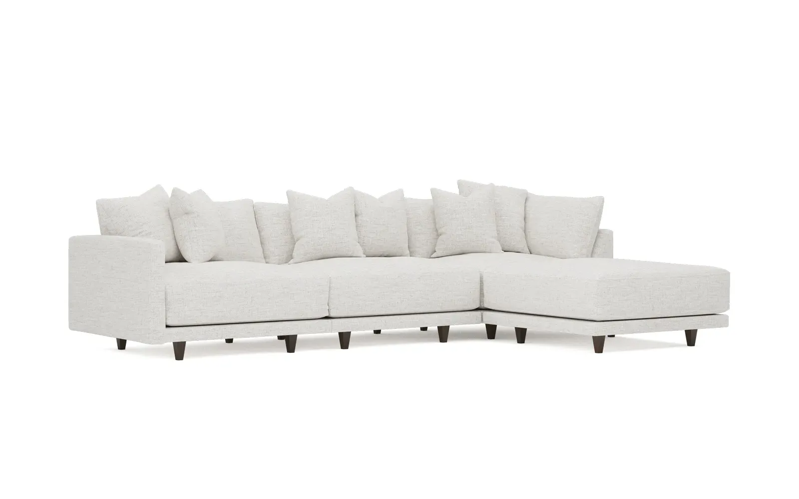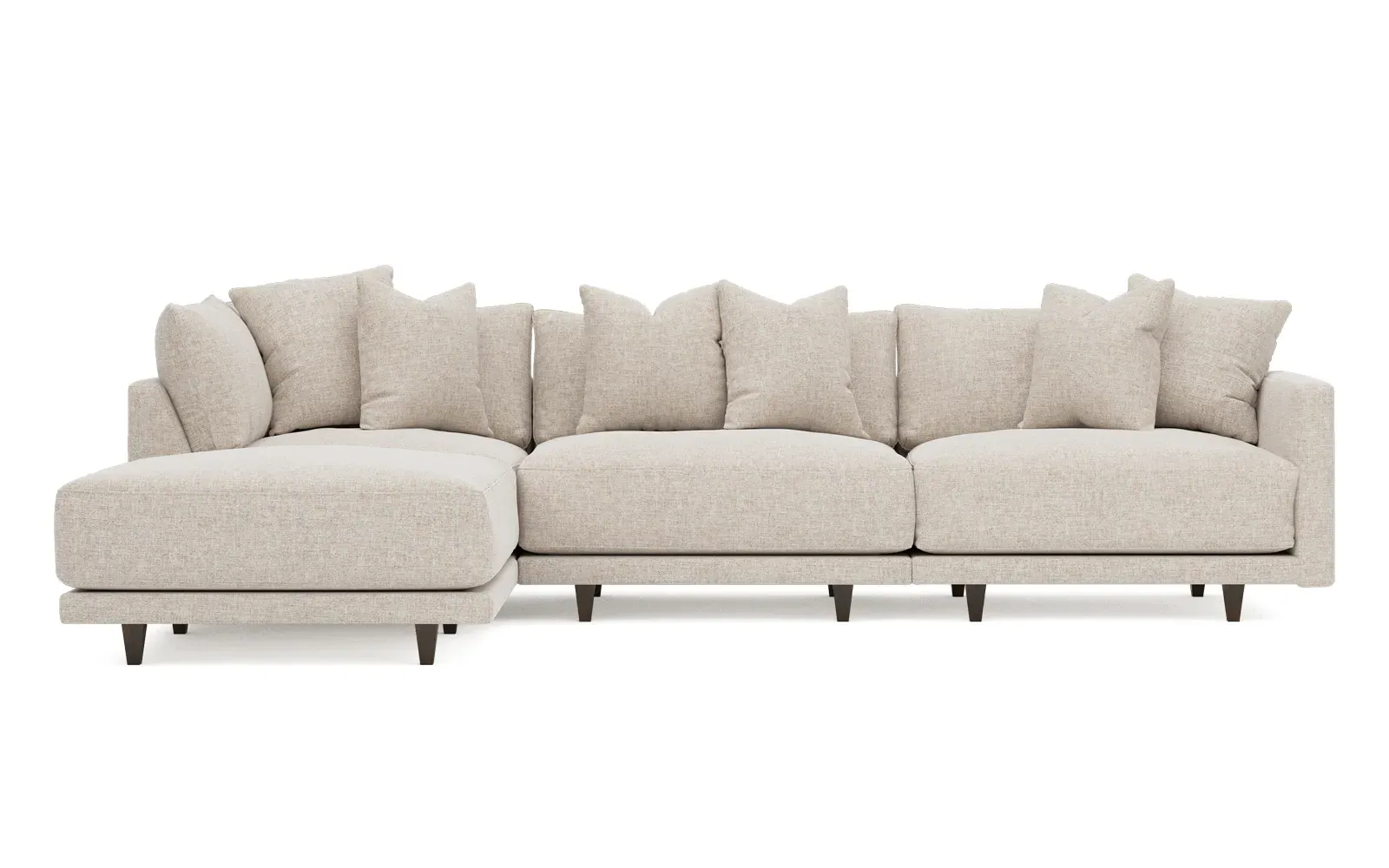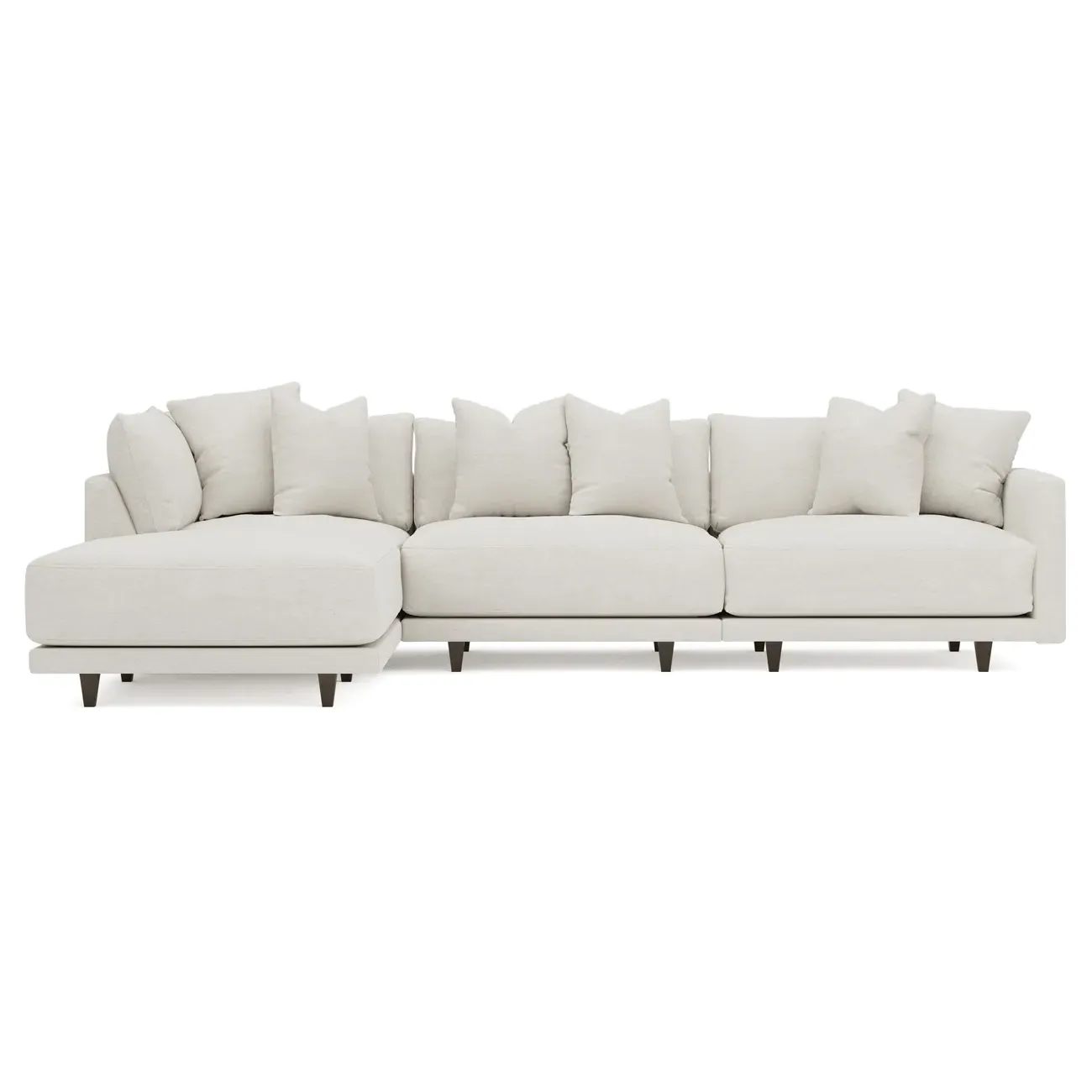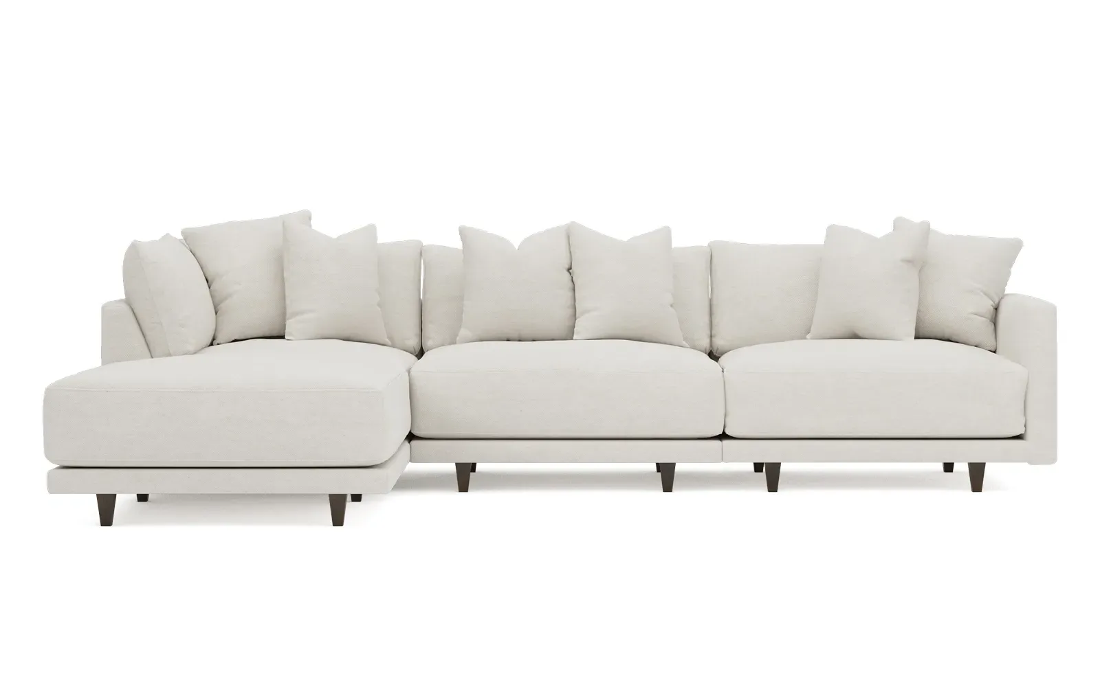 The living is easy on the right 129” Toulouse modular chaise sectional. With deep seating and oh-so-many plush pillows for sink-in comfort, the modern silhouette is delightfully relaxed. Recessed wood legs are hidden from sight, giving the sofa the appearance of floating. Lofted cushions are soft and supportive, with a foam core surrounded by a blend of fiber, down, and feather fill. Choose from a variety of upholstery options, including linen, velvet, and performance fabrics. <b>Overall Dimensions:</b> 129" W x 81" D x 35" H. <b>Ottoman Dimensions:</b> 40” W x 40” D x 20” H; <b>Corner Seat Dimensions:</b> 41” W x 41” D x 35” H; <b>Armless Seat Dimensions:</b> 42” W x 41” D x 35” H; <b>Single Seat Dimensions:</b> 46” W x 41” D x 35” H; <b>Seat Dimensions:</b> 29” D x 20” H; <b>Arm Height:</b> 27”; <b>Leg Height:</b> 5”. <b>Materials:</b> FSC®-certified, US-sourced, formaldehyde-free solid kiln-dried hardwood and furniture-grade laminates. <b>Material Finish:</b> Espresso legs. <b>Pieces Included:</b> Ottoman, Corner Seat, Armless Seat, Left Single Seat.