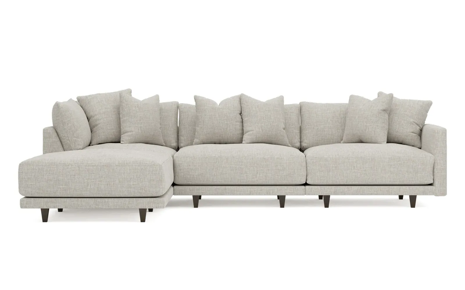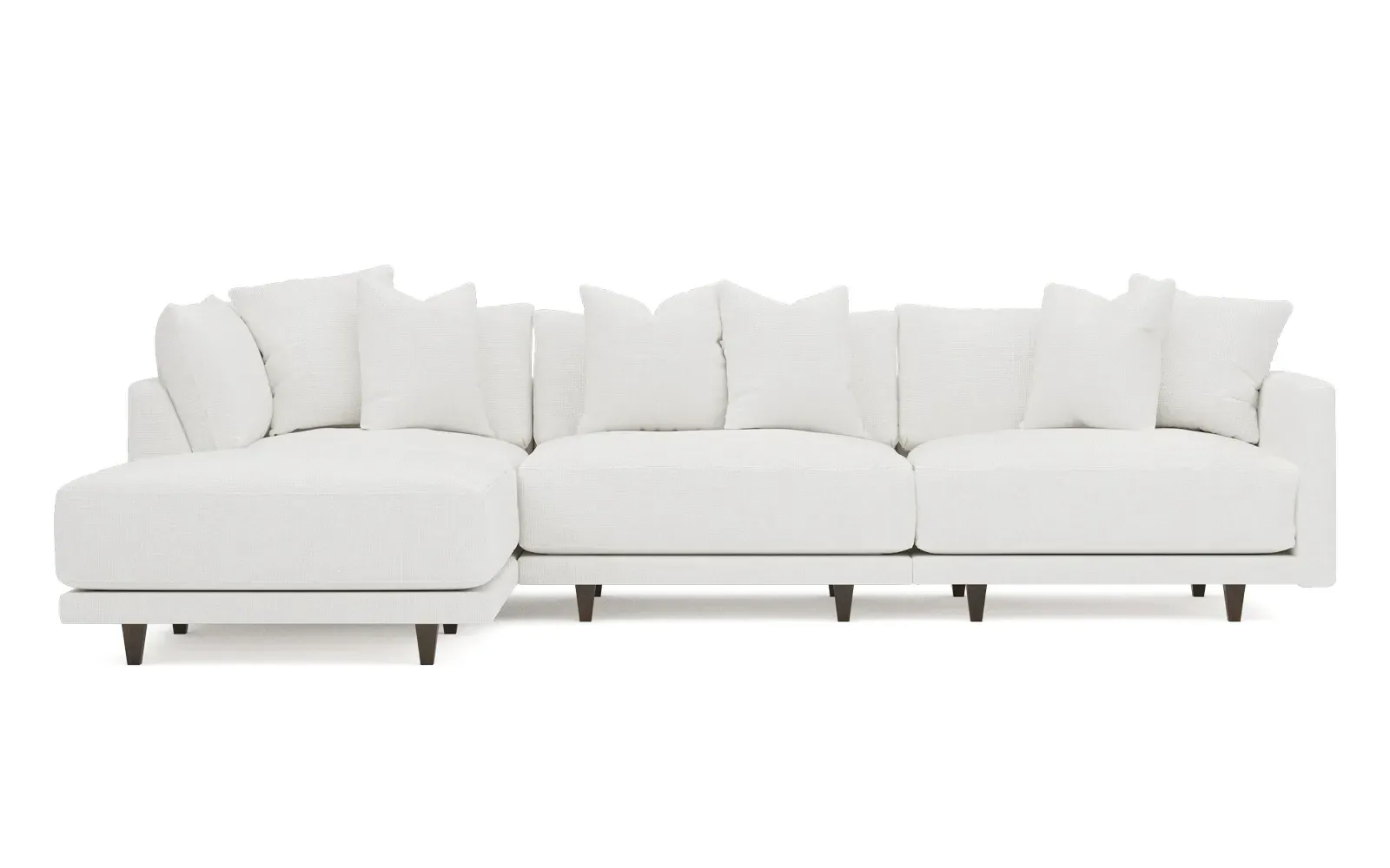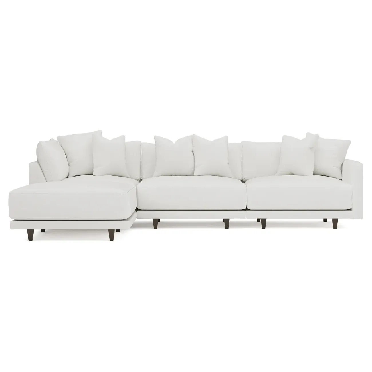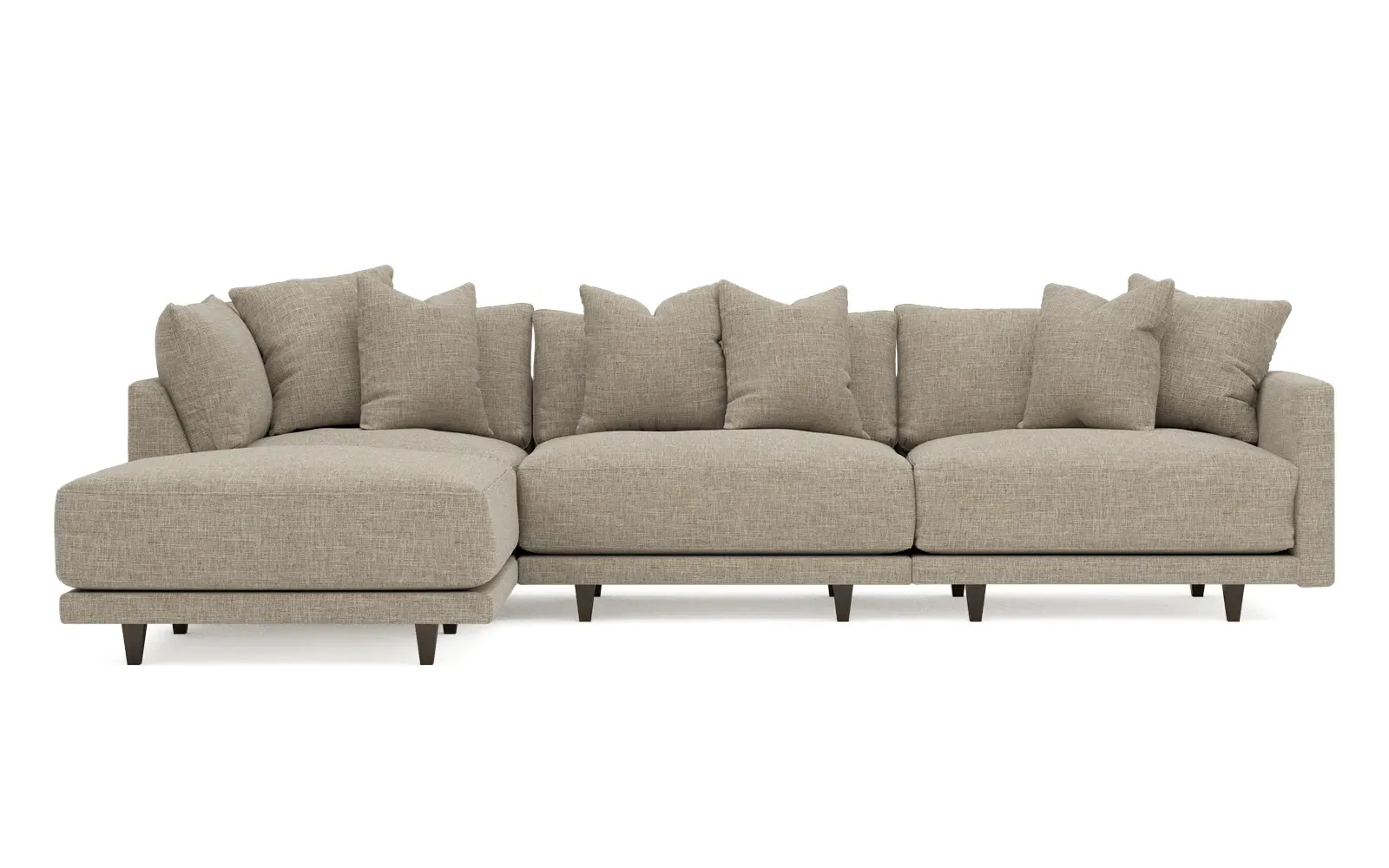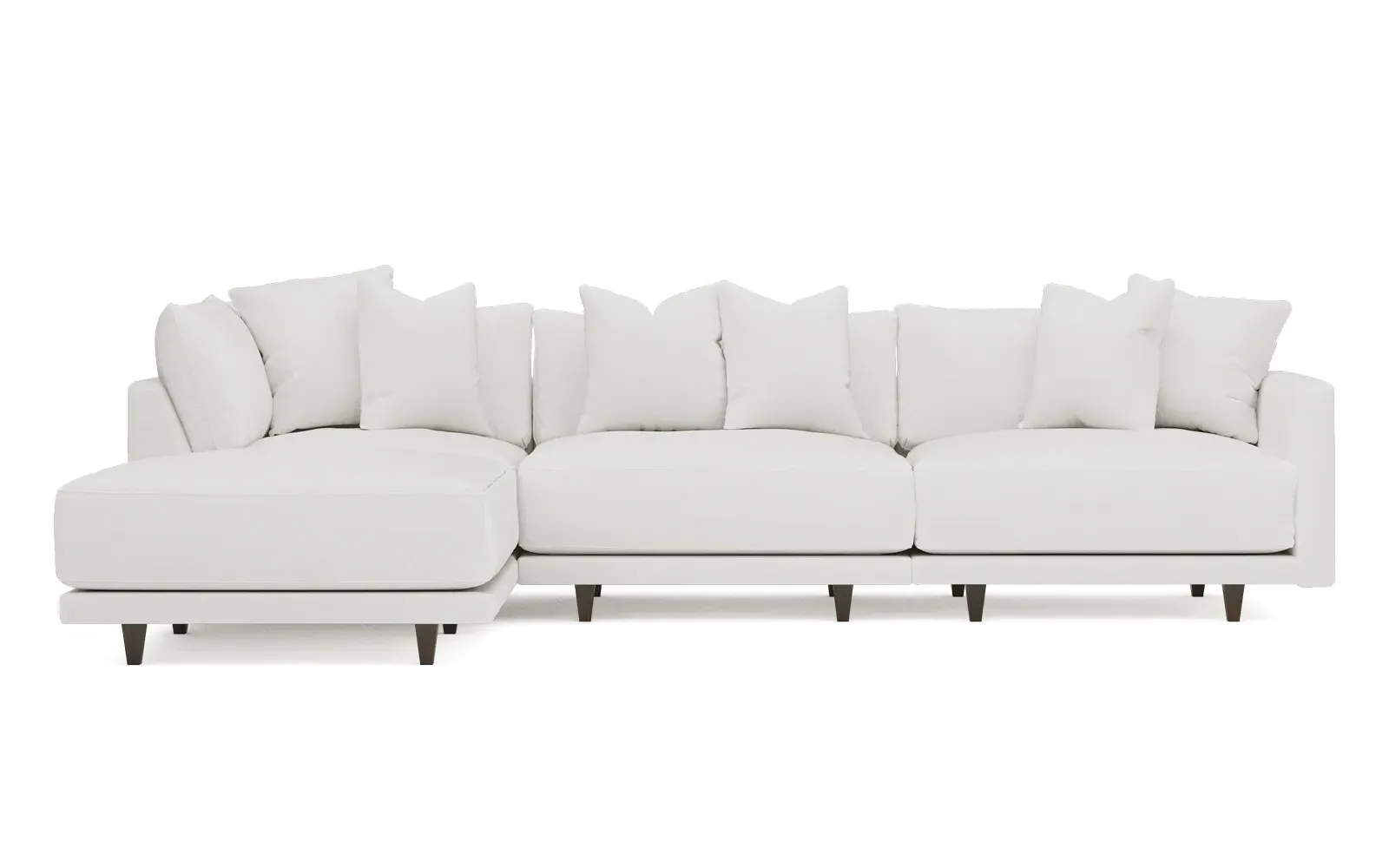 The living is easy on the right 129” Toulouse modular chaise sectional. With deep seating and oh-so-many plush pillows for sink-in comfort, the modern silhouette is delightfully relaxed. Recessed wood legs are hidden from sight, giving the sofa the appearance of floating. Lofted cushions are soft and supportive, with a foam core surrounded by a blend of fiber, down, and feather fill. Choose from a variety of upholstery options, including linen, velvet, and performance fabrics. <b>Overall Dimensions:</b> 129" W x 81" D x 35" H. <b>Ottoman Dimensions:</b> 40” W x 40” D x 20” H; <b>Corner Seat Dimensions:</b> 41” W x 41” D x 35” H; <b>Armless Seat Dimensions:</b> 42” W x 41” D x 35” H; <b>Single Seat Dimensions:</b> 46” W x 41” D x 35” H; <b>Seat Dimensions:</b> 29” D x 20” H; <b>Arm Height:</b> 27”; <b>Leg Height:</b> 5”. <b>Materials:</b> FSC®-certified, US-sourced, formaldehyde-free solid kiln-dried hardwood and furniture-grade laminates. <b>Material Finish:</b> Espresso legs. <b>Pieces Included:</b> Ottoman, Corner Seat, Armless Seat, Left Single Seat.