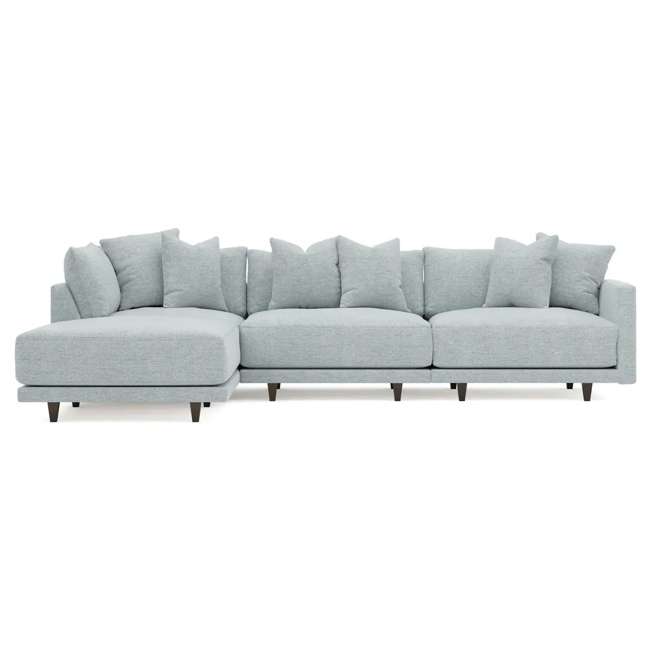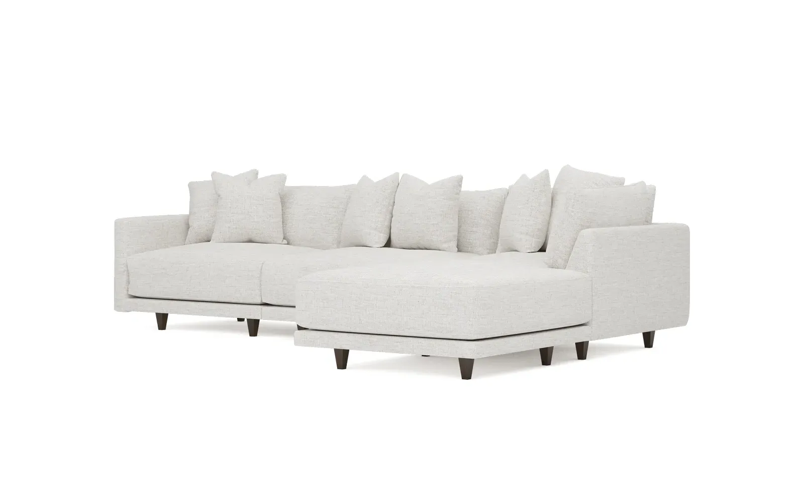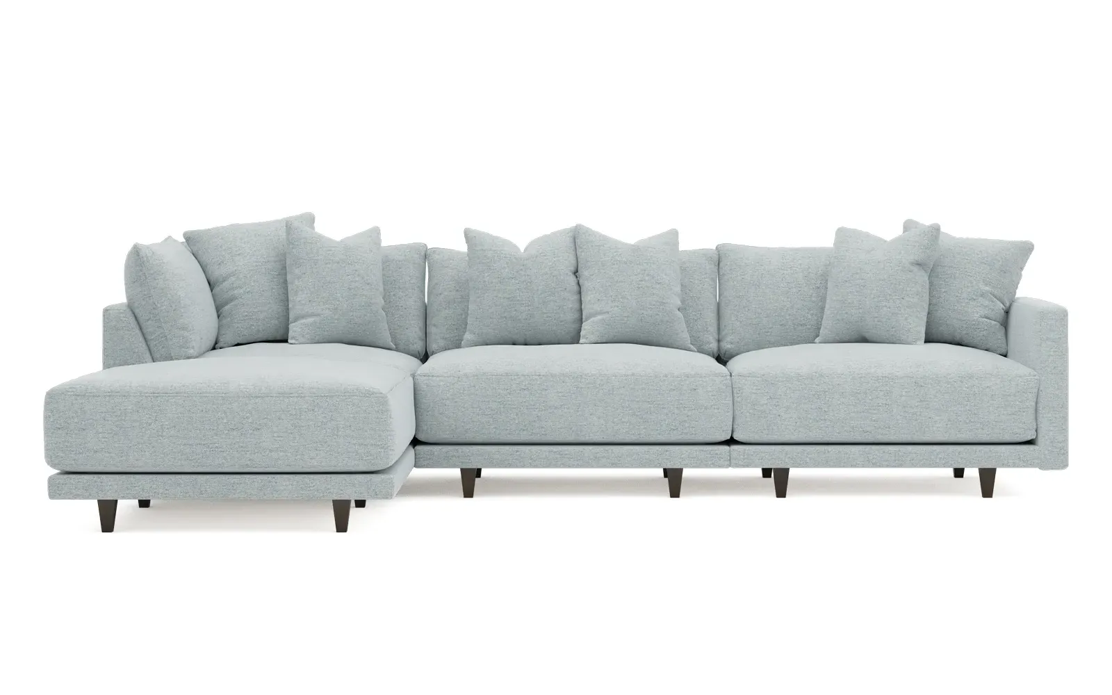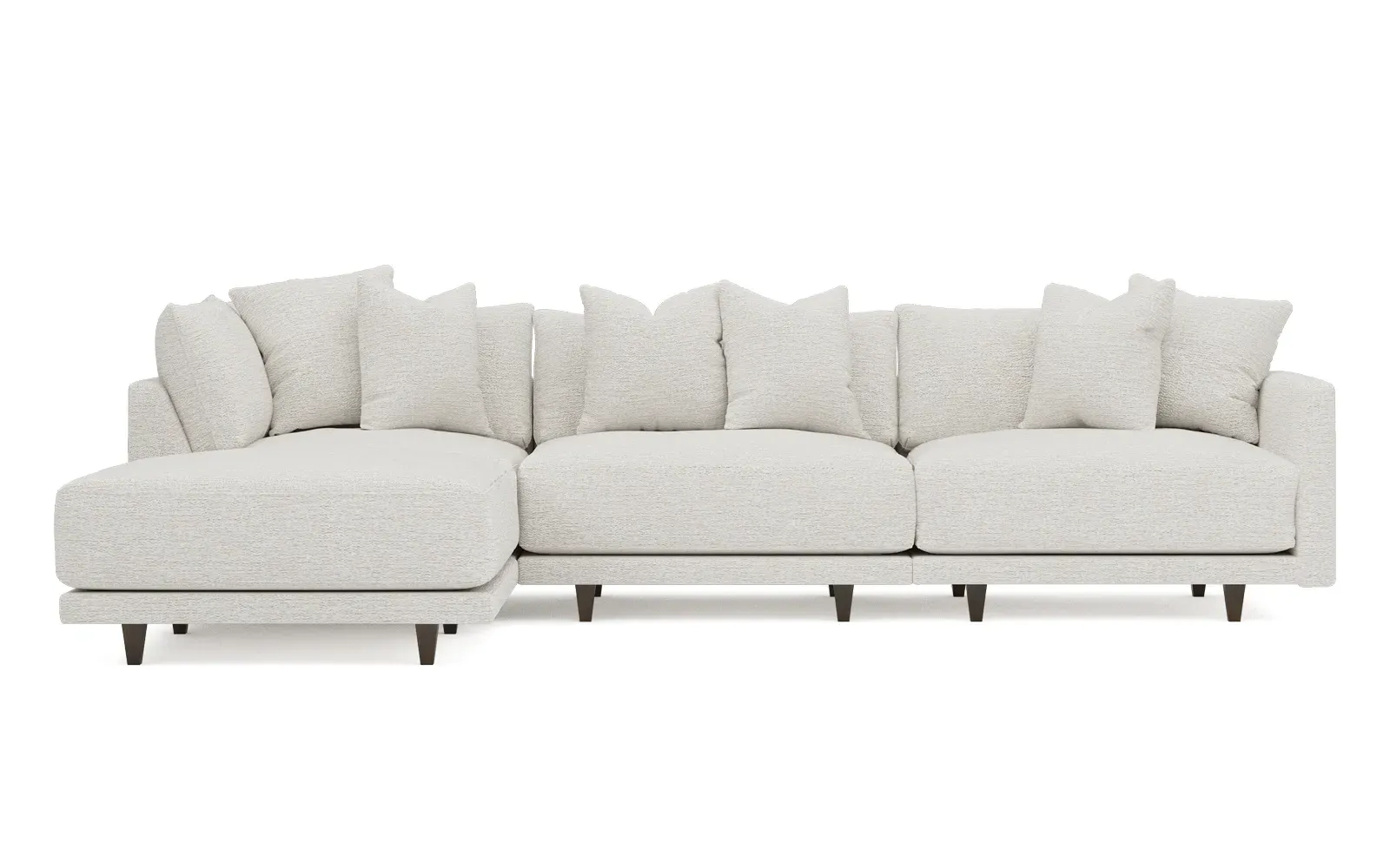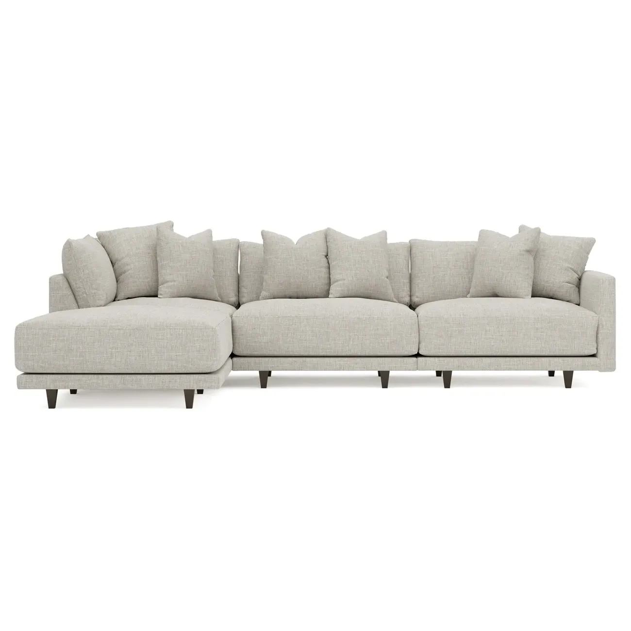 The living is easy on the right 129” Toulouse modular chaise sectional. With deep seating and oh-so-many plush pillows for sink-in comfort, the modern silhouette is delightfully relaxed. Recessed wood legs are hidden from sight, giving the sofa the appearance of floating. Lofted cushions are soft and supportive, with a foam core surrounded by a blend of fiber, down, and feather fill. Choose from a variety of upholstery options, including linen, velvet, and performance fabrics. <b>Overall Dimensions:</b> 129" W x 81" D x 35" H. <b>Ottoman Dimensions:</b> 40” W x 40” D x 20” H; <b>Corner Seat Dimensions:</b> 41” W x 41” D x 35” H; <b>Armless Seat Dimensions:</b> 42” W x 41” D x 35” H; <b>Single Seat Dimensions:</b> 46” W x 41” D x 35” H; <b>Seat Dimensions:</b> 29” D x 20” H; <b>Arm Height:</b> 27”; <b>Leg Height:</b> 5”. <b>Materials:</b> FSC®-certified, US-sourced, formaldehyde-free solid kiln-dried hardwood and furniture-grade laminates. <b>Material Finish:</b> Espresso legs. <b>Pieces Included:</b> Ottoman, Corner Seat, Armless Seat, Left Single Seat.