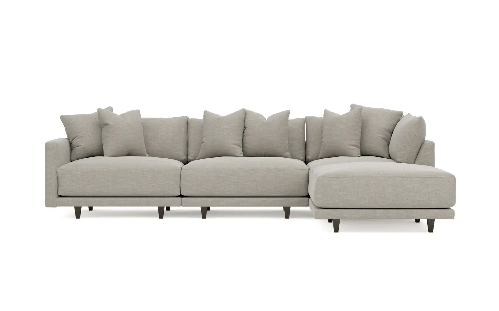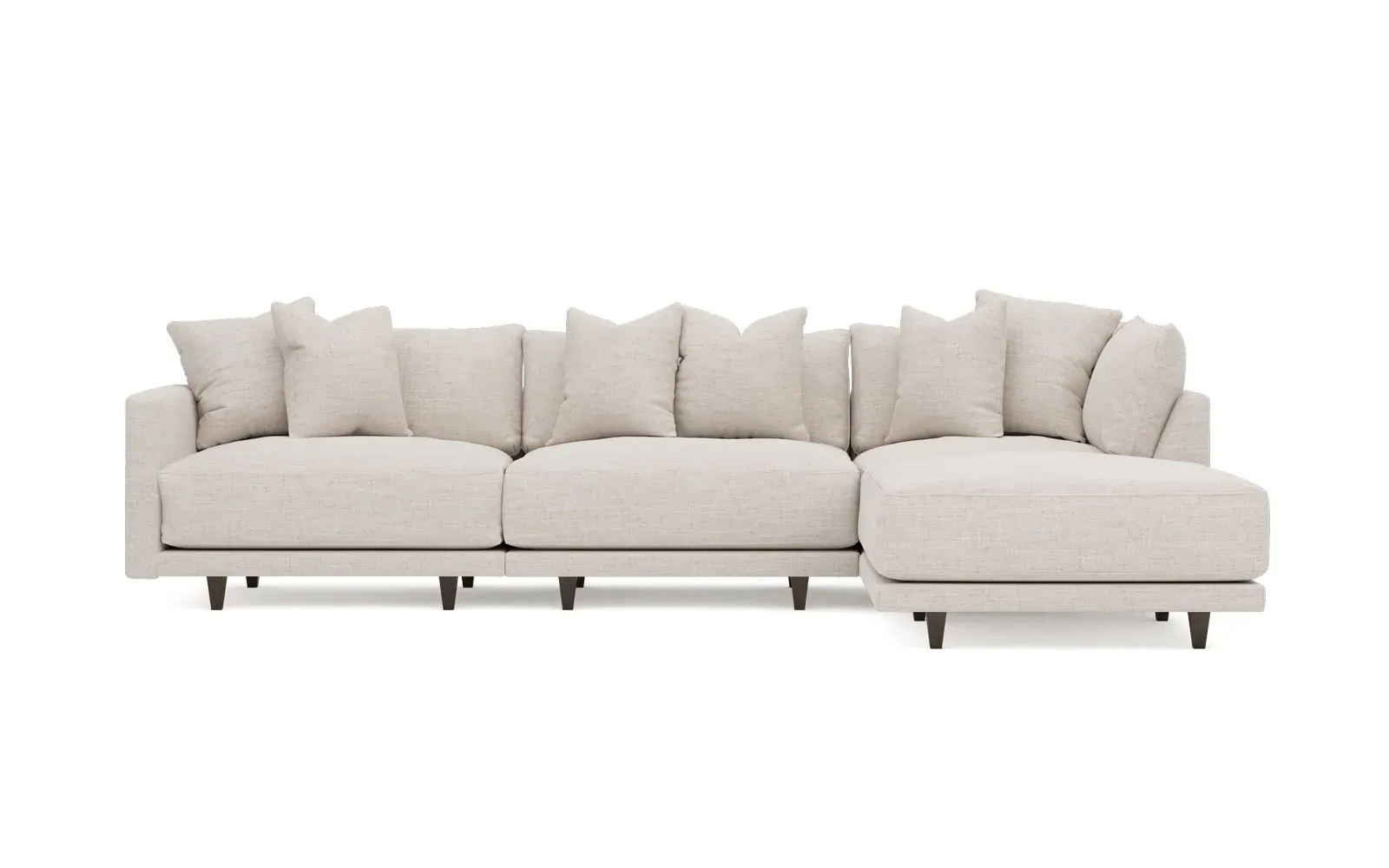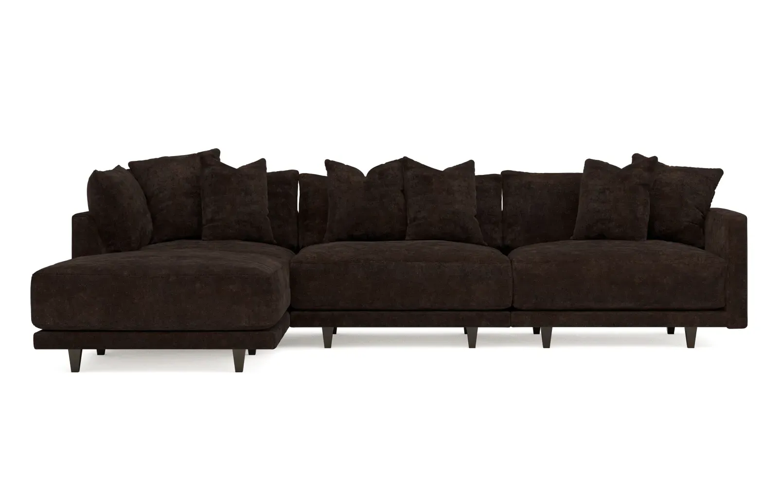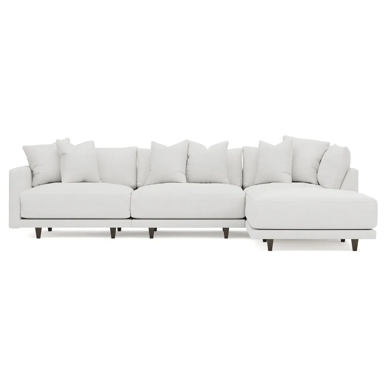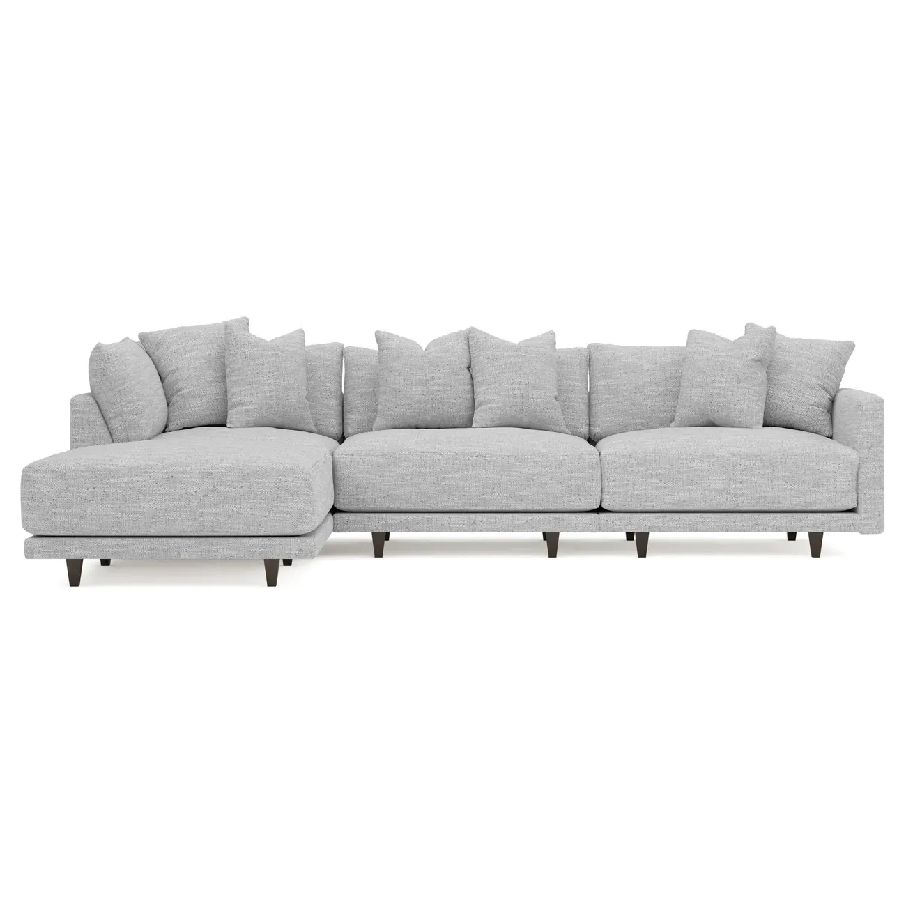 The living is easy on the right 129” Toulouse modular chaise sectional. With deep seating and oh-so-many plush pillows for sink-in comfort, the modern silhouette is delightfully relaxed. Recessed wood legs are hidden from sight, giving the sofa the appearance of floating. Lofted cushions are soft and supportive, with a foam core surrounded by a blend of fiber, down, and feather fill. Choose from a variety of upholstery options, including linen, velvet, and performance fabrics. <b>Overall Dimensions:</b> 129" W x 81" D x 35" H. <b>Ottoman Dimensions:</b> 40” W x 40” D x 20” H; <b>Corner Seat Dimensions:</b> 41” W x 41” D x 35” H; <b>Armless Seat Dimensions:</b> 42” W x 41” D x 35” H; <b>Single Seat Dimensions:</b> 46” W x 41” D x 35” H; <b>Seat Dimensions:</b> 29” D x 20” H; <b>Arm Height:</b> 27”; <b>Leg Height:</b> 5”. <b>Materials:</b> FSC®-certified, US-sourced, formaldehyde-free solid kiln-dried hardwood and furniture-grade laminates. <b>Material Finish:</b> Espresso legs. <b>Pieces Included:</b> Ottoman, Corner Seat, Armless Seat, Left Single Seat.