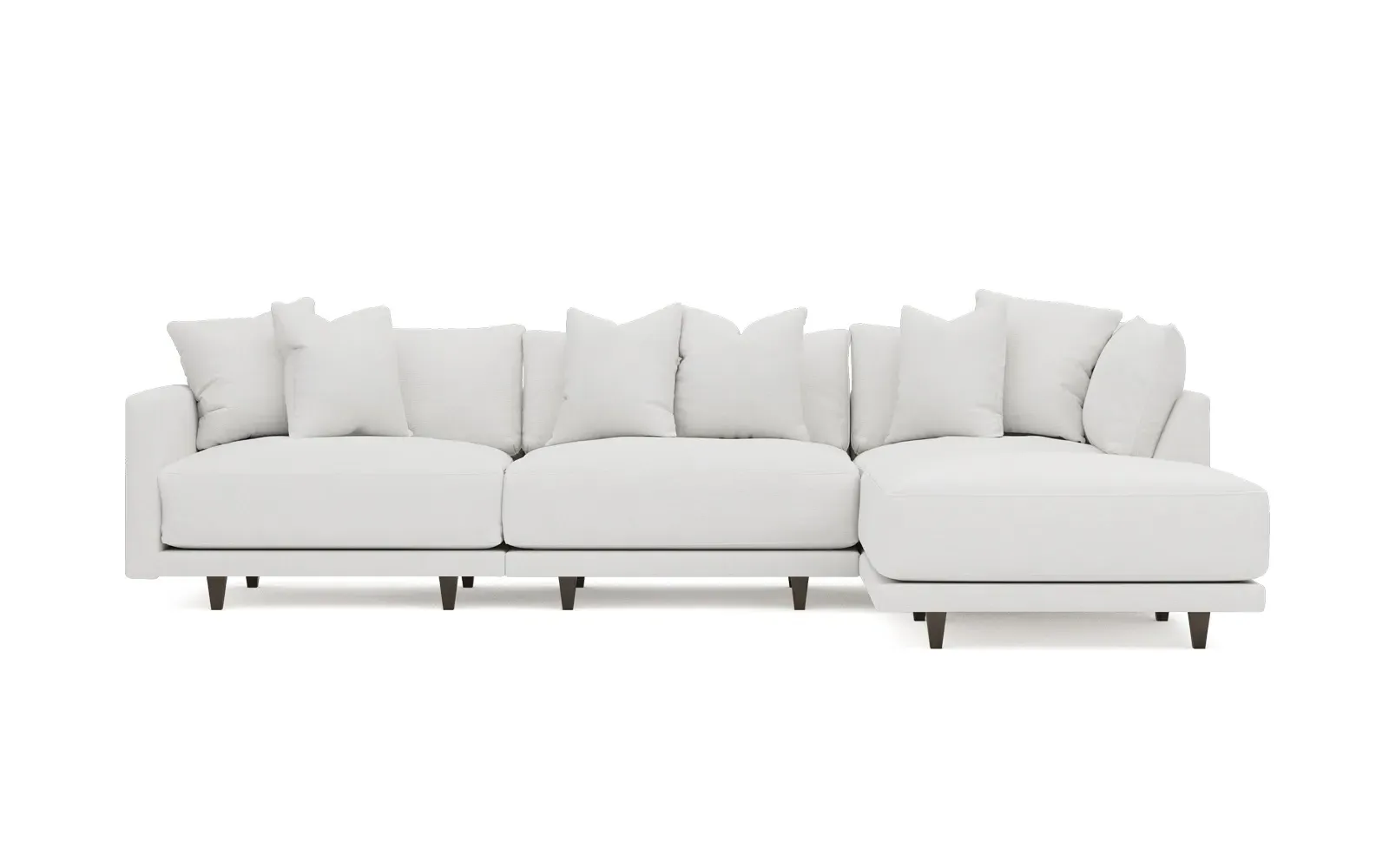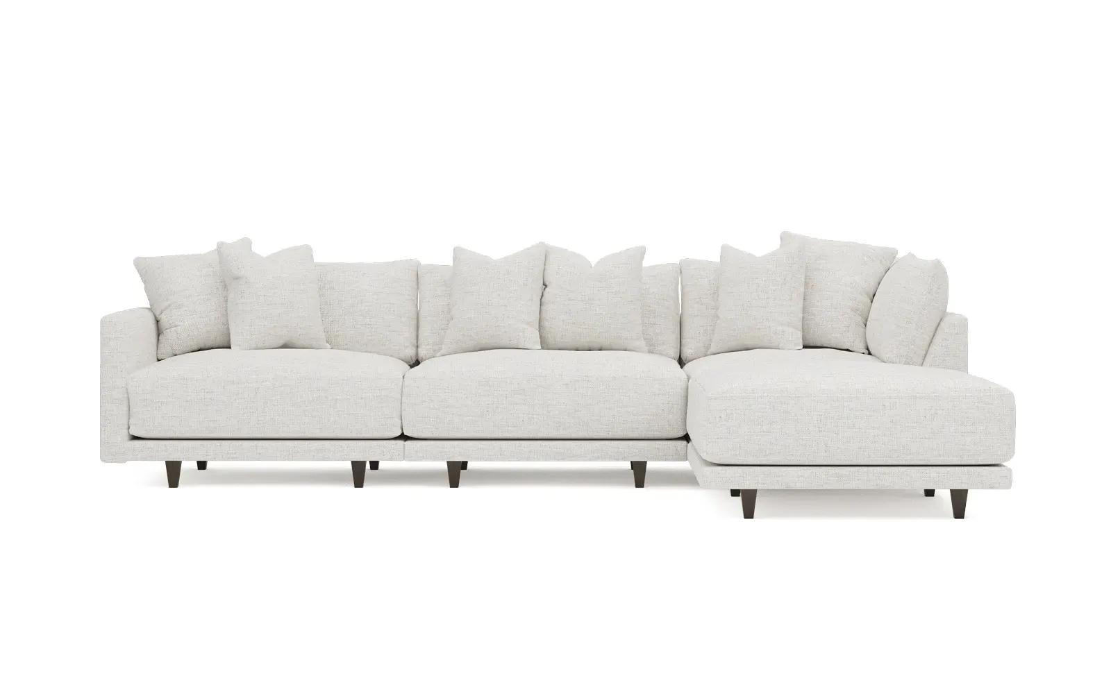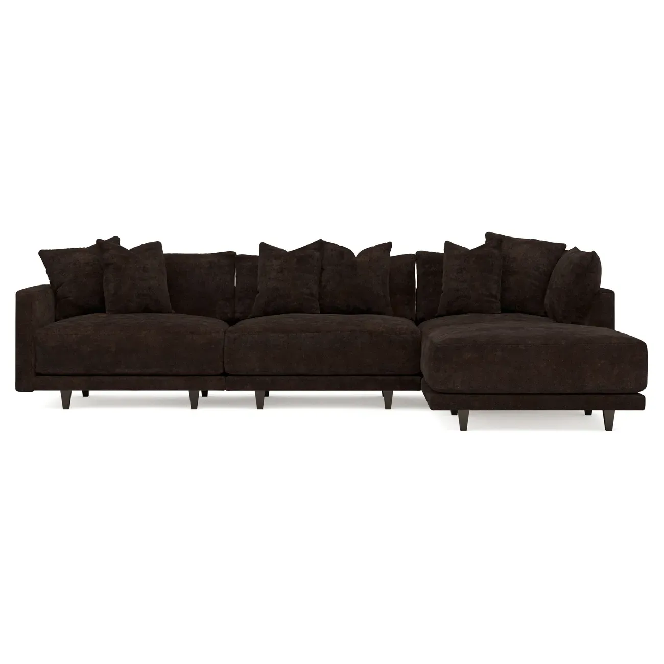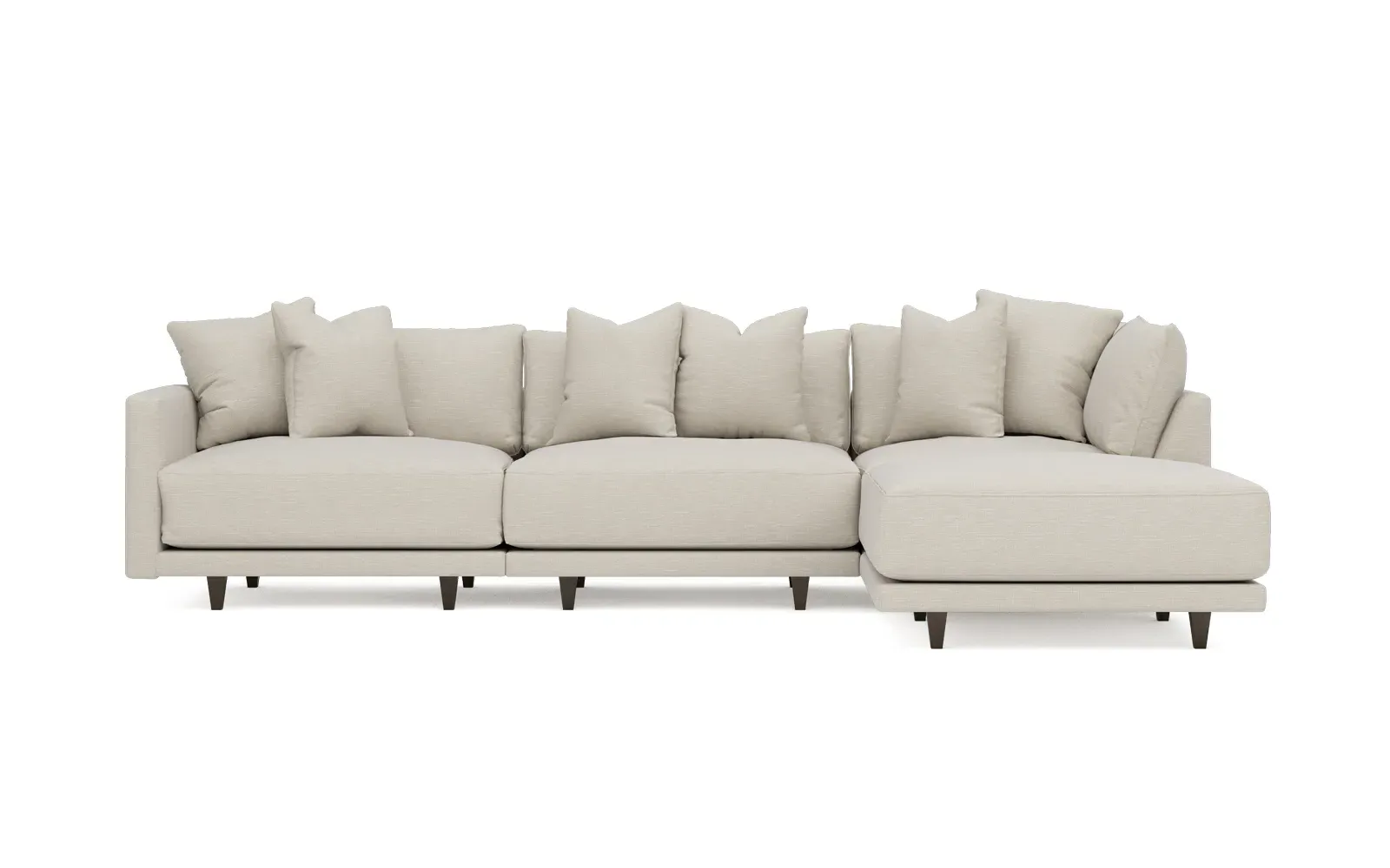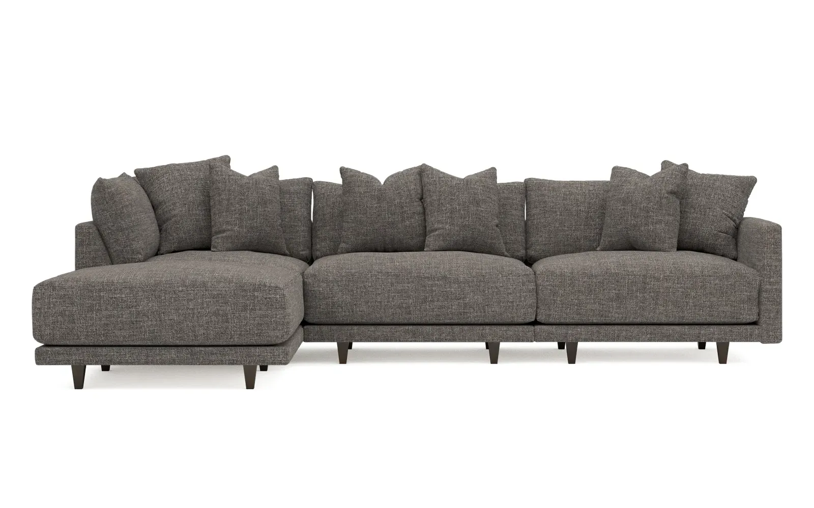 The living is easy on the right 129” Toulouse modular chaise sectional. With deep seating and oh-so-many plush pillows for sink-in comfort, the modern silhouette is delightfully relaxed. Recessed wood legs are hidden from sight, giving the sofa the appearance of floating. Lofted cushions are soft and supportive, with a foam core surrounded by a blend of fiber, down, and feather fill. Choose from a variety of upholstery options, including linen, velvet, and performance fabrics. <b>Overall Dimensions:</b> 129" W x 81" D x 35" H. <b>Ottoman Dimensions:</b> 40” W x 40” D x 20” H; <b>Corner Seat Dimensions:</b> 41” W x 41” D x 35” H; <b>Armless Seat Dimensions:</b> 42” W x 41” D x 35” H; <b>Single Seat Dimensions:</b> 46” W x 41” D x 35” H; <b>Seat Dimensions:</b> 29” D x 20” H; <b>Arm Height:</b> 27”; <b>Leg Height:</b> 5”. <b>Materials:</b> FSC®-certified, US-sourced, formaldehyde-free solid kiln-dried hardwood and furniture-grade laminates. <b>Material Finish:</b> Espresso legs. <b>Pieces Included:</b> Ottoman, Corner Seat, Armless Seat, Left Single Seat.