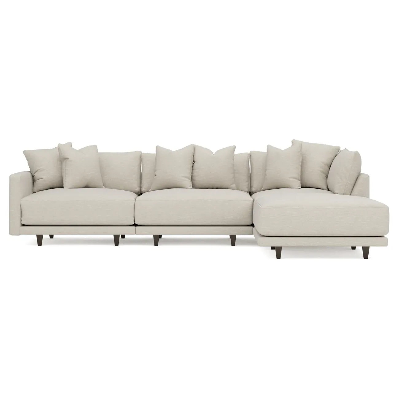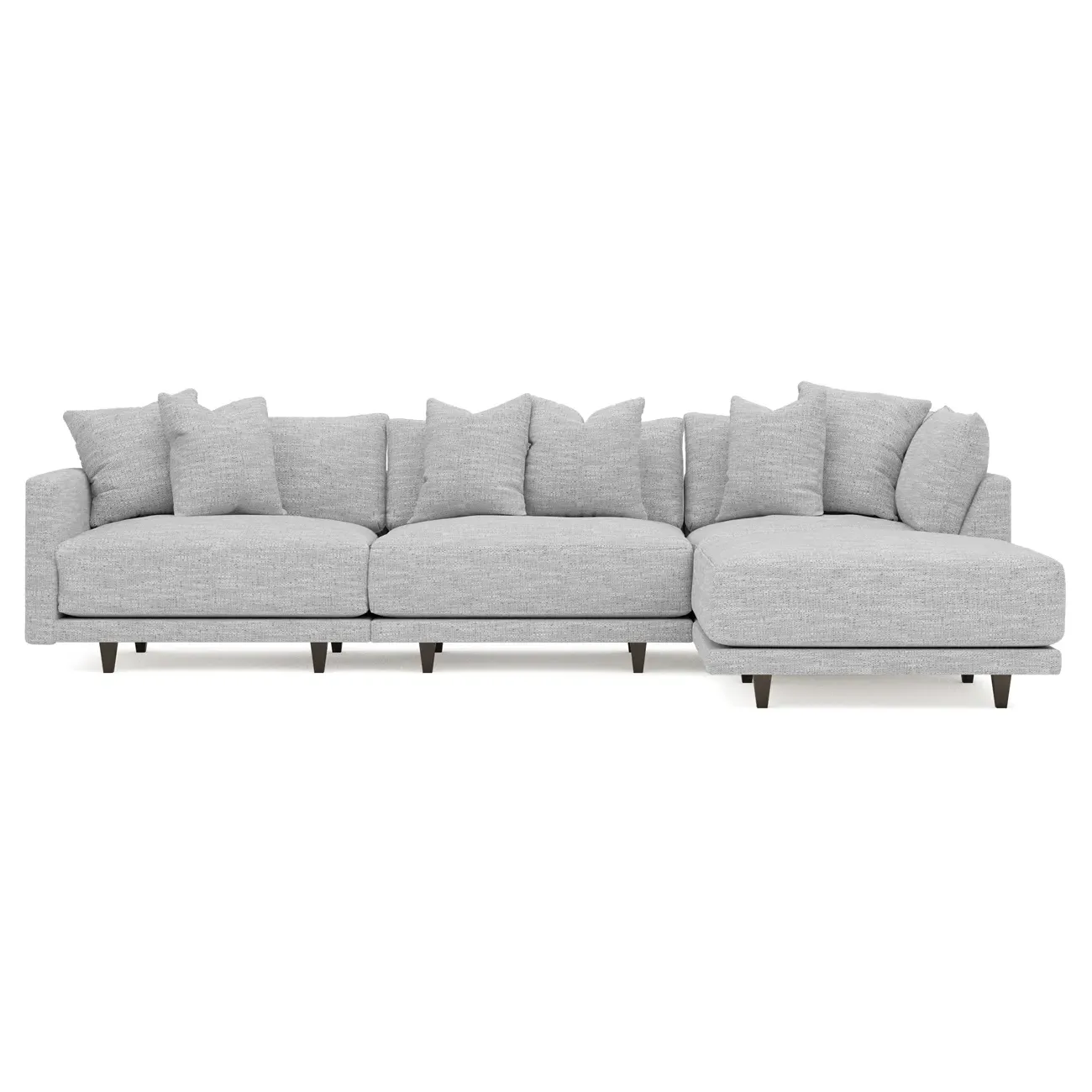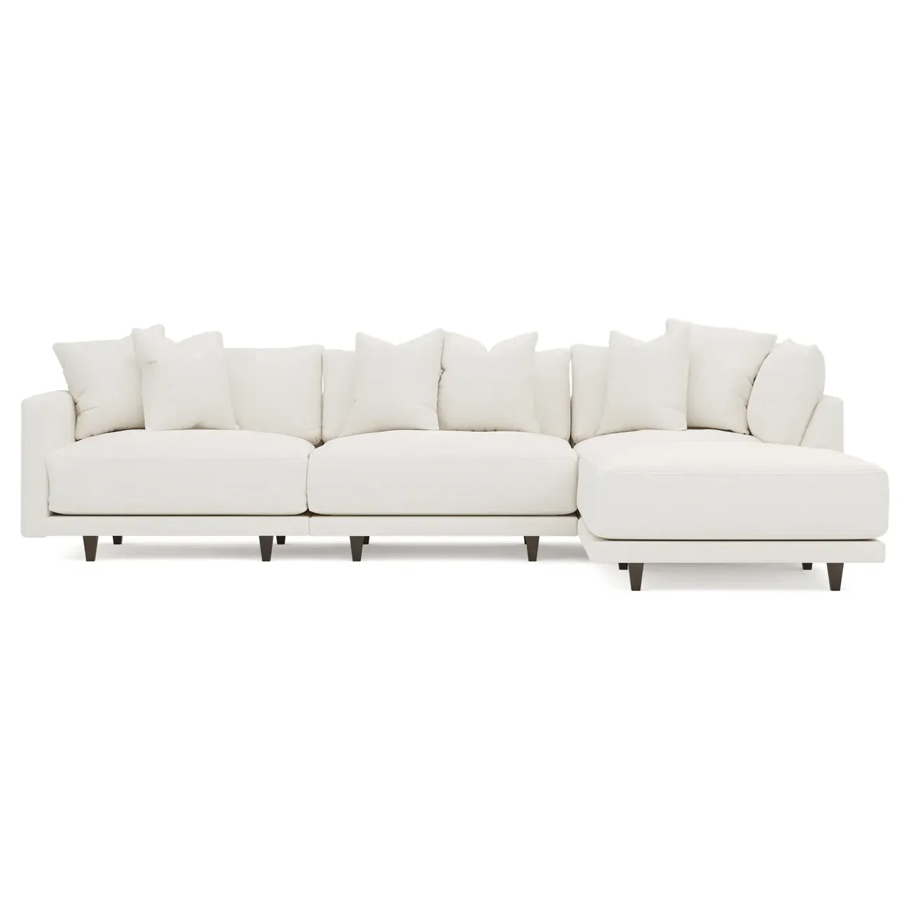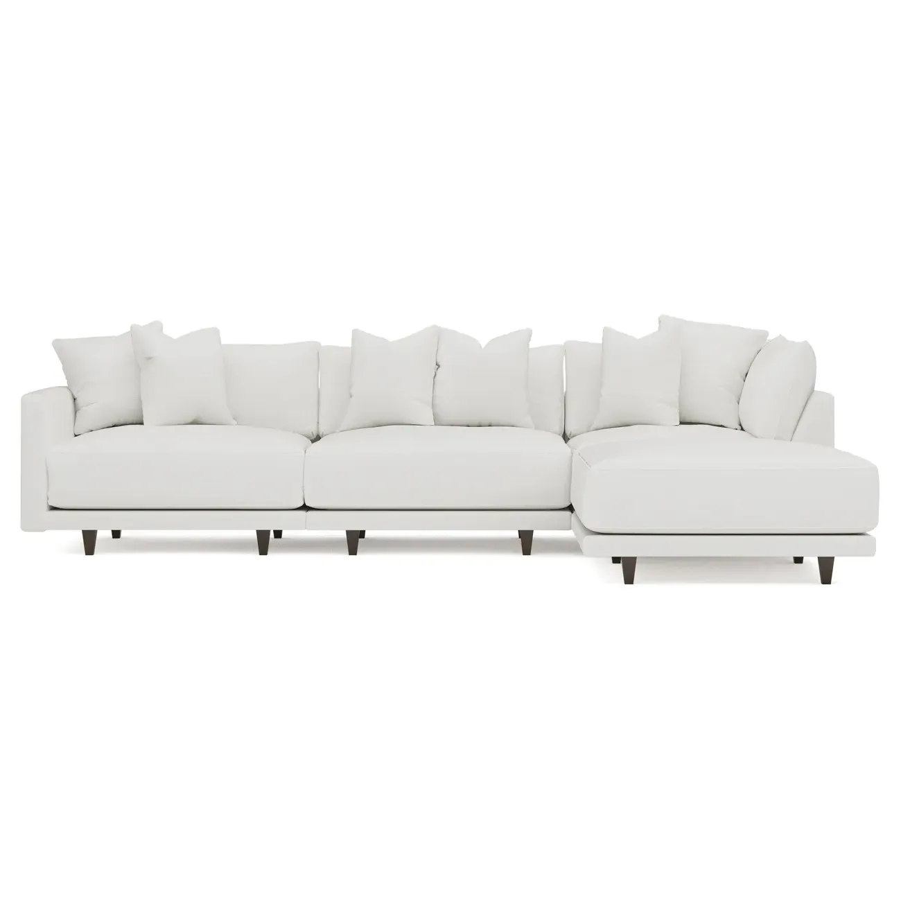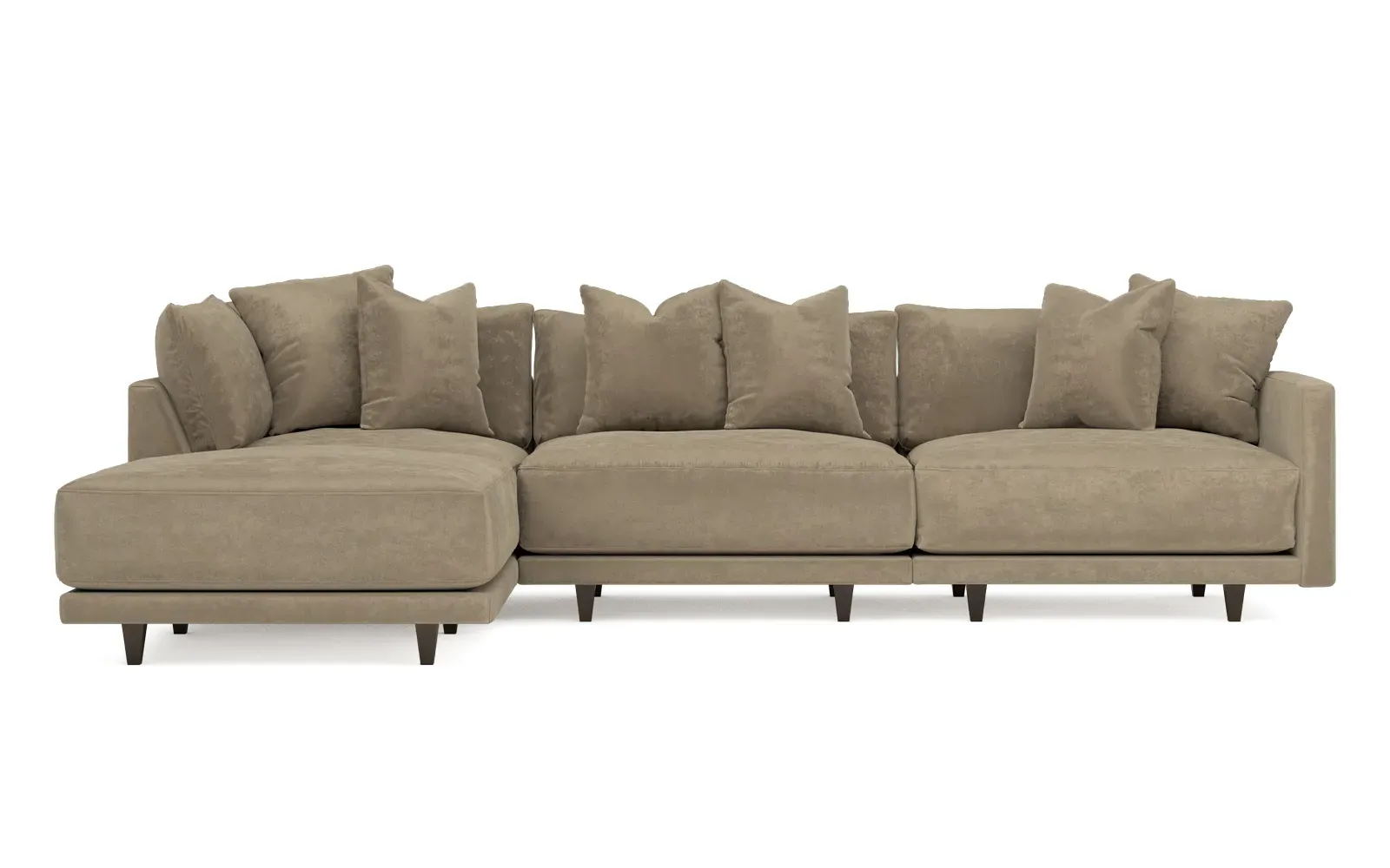 The living is easy on the right 129” Toulouse modular chaise sectional. With deep seating and oh-so-many plush pillows for sink-in comfort, the modern silhouette is delightfully relaxed. Recessed wood legs are hidden from sight, giving the sofa the appearance of floating. Lofted cushions are soft and supportive, with a foam core surrounded by a blend of fiber, down, and feather fill. Choose from a variety of upholstery options, including linen, velvet, and performance fabrics. <b>Overall Dimensions:</b> 129" W x 81" D x 35" H. <b>Ottoman Dimensions:</b> 40” W x 40” D x 20” H; <b>Corner Seat Dimensions:</b> 41” W x 41” D x 35” H; <b>Armless Seat Dimensions:</b> 42” W x 41” D x 35” H; <b>Single Seat Dimensions:</b> 46” W x 41” D x 35” H; <b>Seat Dimensions:</b> 29” D x 20” H; <b>Arm Height:</b> 27”; <b>Leg Height:</b> 5”. <b>Materials:</b> FSC®-certified, US-sourced, formaldehyde-free solid kiln-dried hardwood and furniture-grade laminates. <b>Material Finish:</b> Espresso legs. <b>Pieces Included:</b> Ottoman, Corner Seat, Armless Seat, Left Single Seat.
