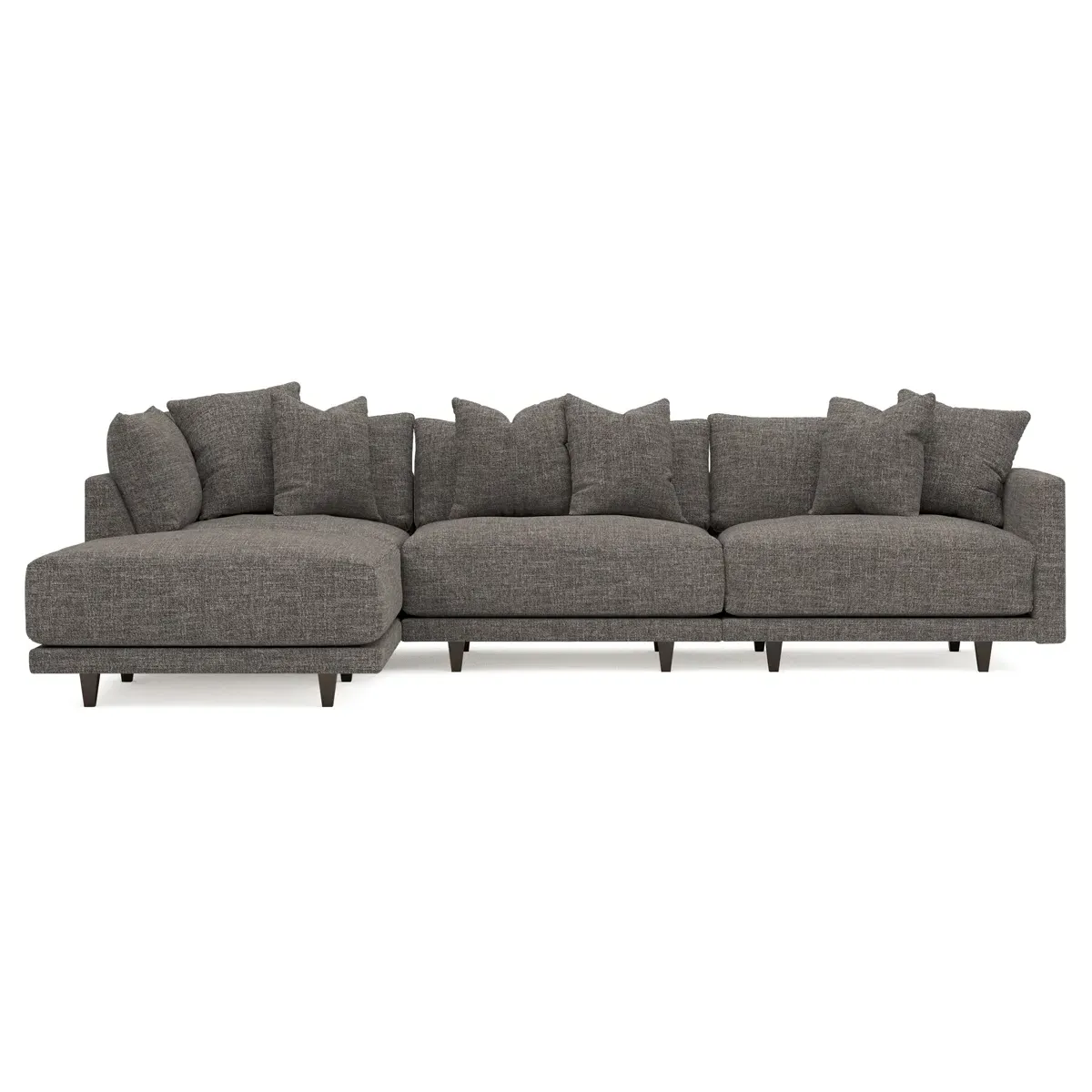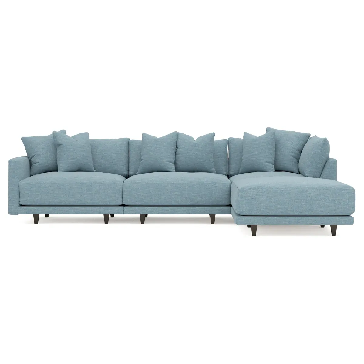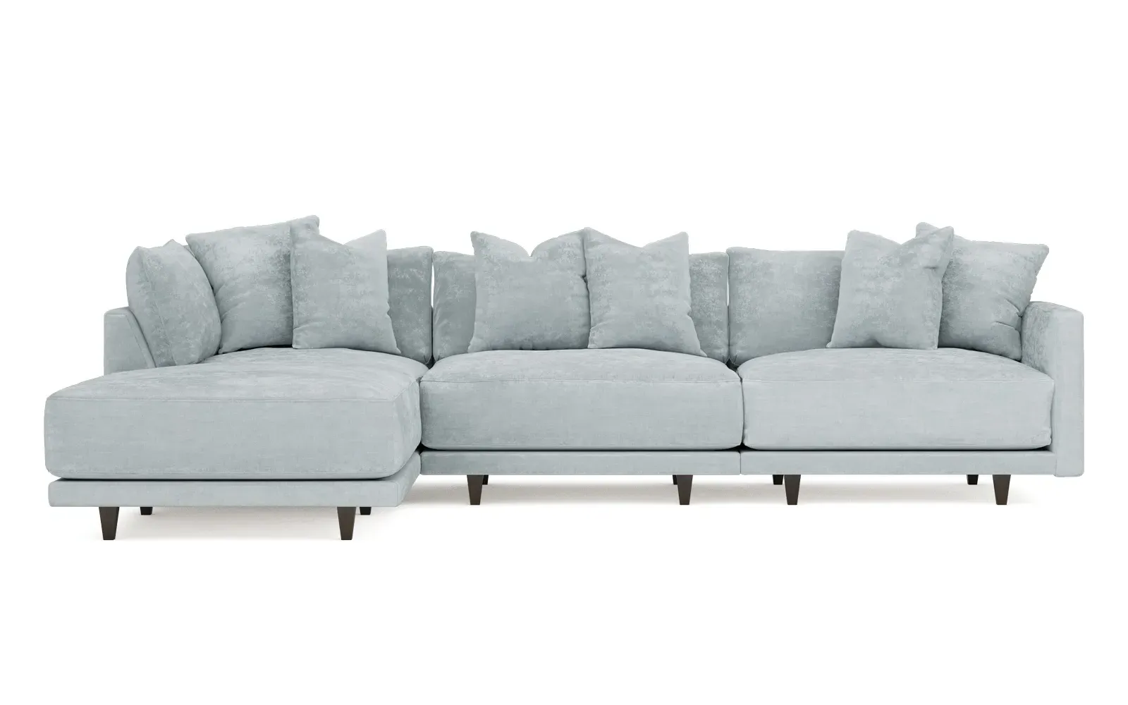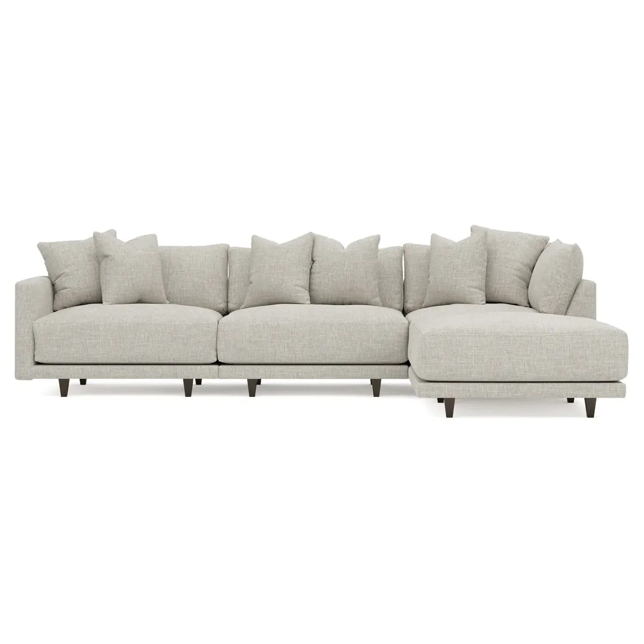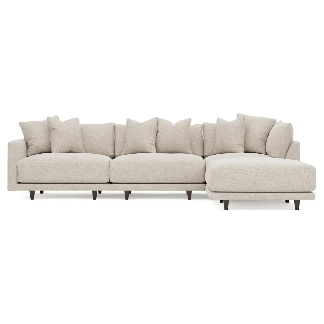 The living is easy on the right 129” Toulouse modular chaise sectional. With deep seating and oh-so-many plush pillows for sink-in comfort, the modern silhouette is delightfully relaxed. Recessed wood legs are hidden from sight, giving the sofa the appearance of floating. Lofted cushions are soft and supportive, with a foam core surrounded by a blend of fiber, down, and feather fill. Choose from a variety of upholstery options, including linen, velvet, and performance fabrics. <b>Overall Dimensions:</b> 129" W x 81" D x 35" H. <b>Ottoman Dimensions:</b> 40” W x 40” D x 20” H; <b>Corner Seat Dimensions:</b> 41” W x 41” D x 35” H; <b>Armless Seat Dimensions:</b> 42” W x 41” D x 35” H; <b>Single Seat Dimensions:</b> 46” W x 41” D x 35” H; <b>Seat Dimensions:</b> 29” D x 20” H; <b>Arm Height:</b> 27”; <b>Leg Height:</b> 5”. <b>Materials:</b> FSC®-certified, US-sourced, formaldehyde-free solid kiln-dried hardwood and furniture-grade laminates. <b>Material Finish:</b> Espresso legs. <b>Pieces Included:</b> Ottoman, Corner Seat, Armless Seat, Left Single Seat.