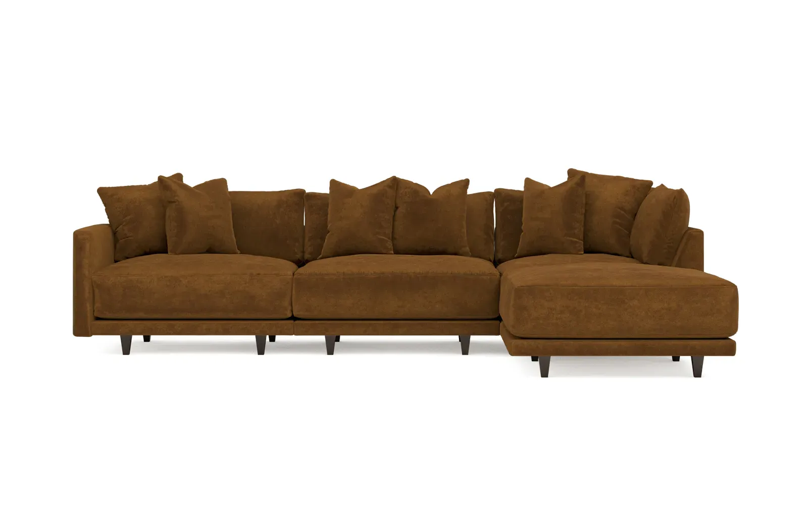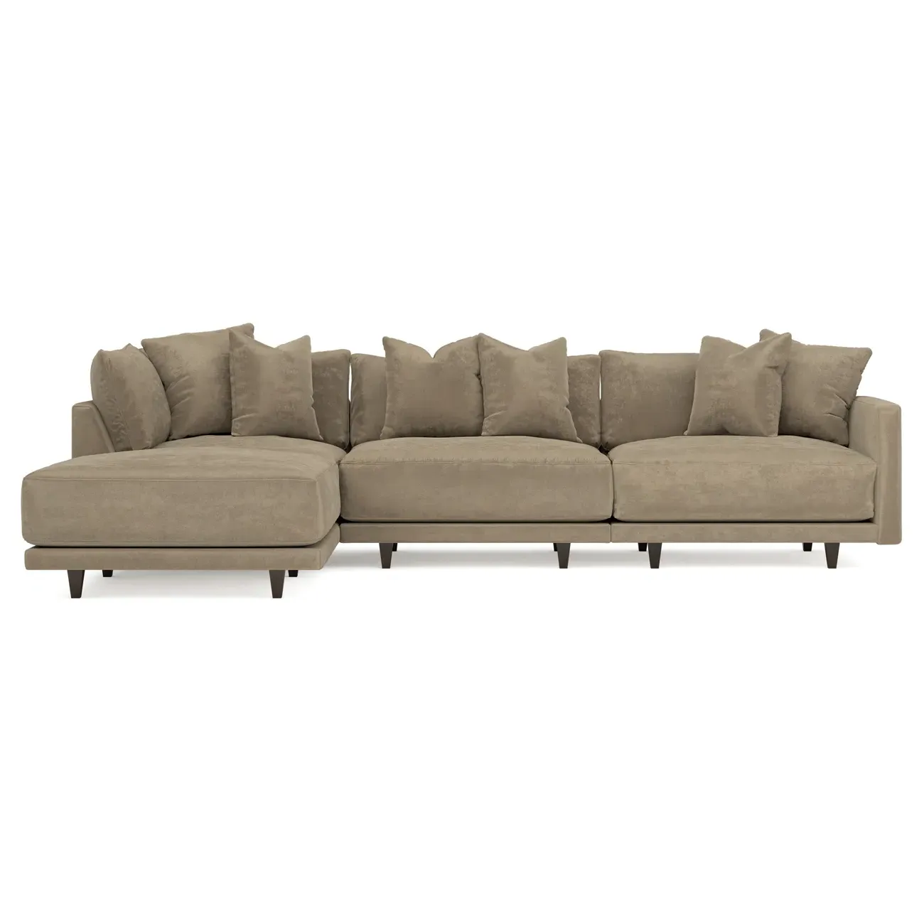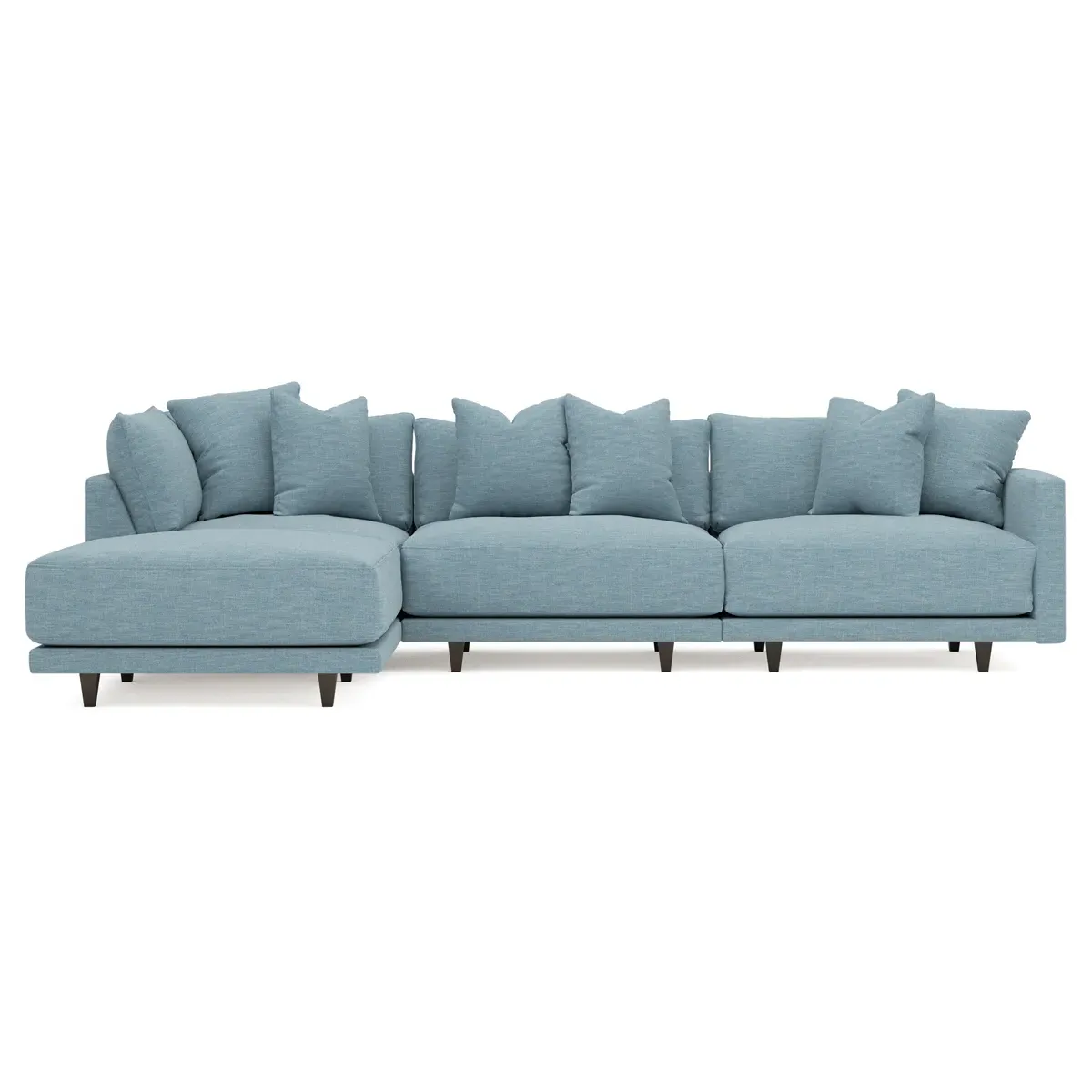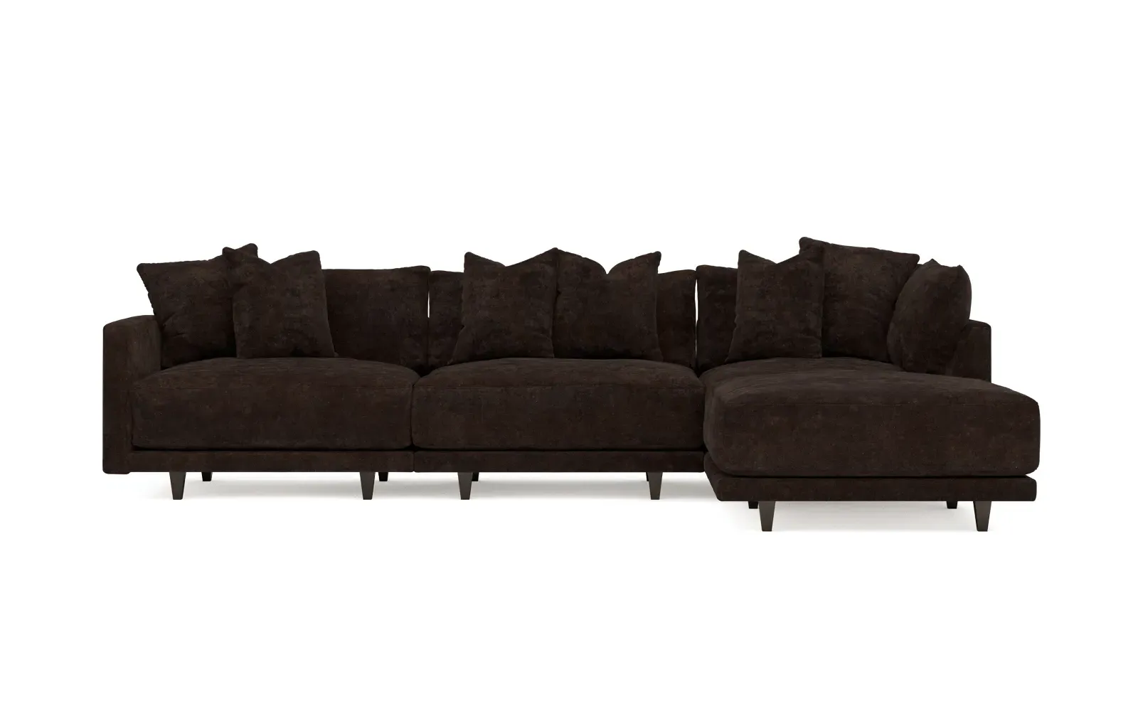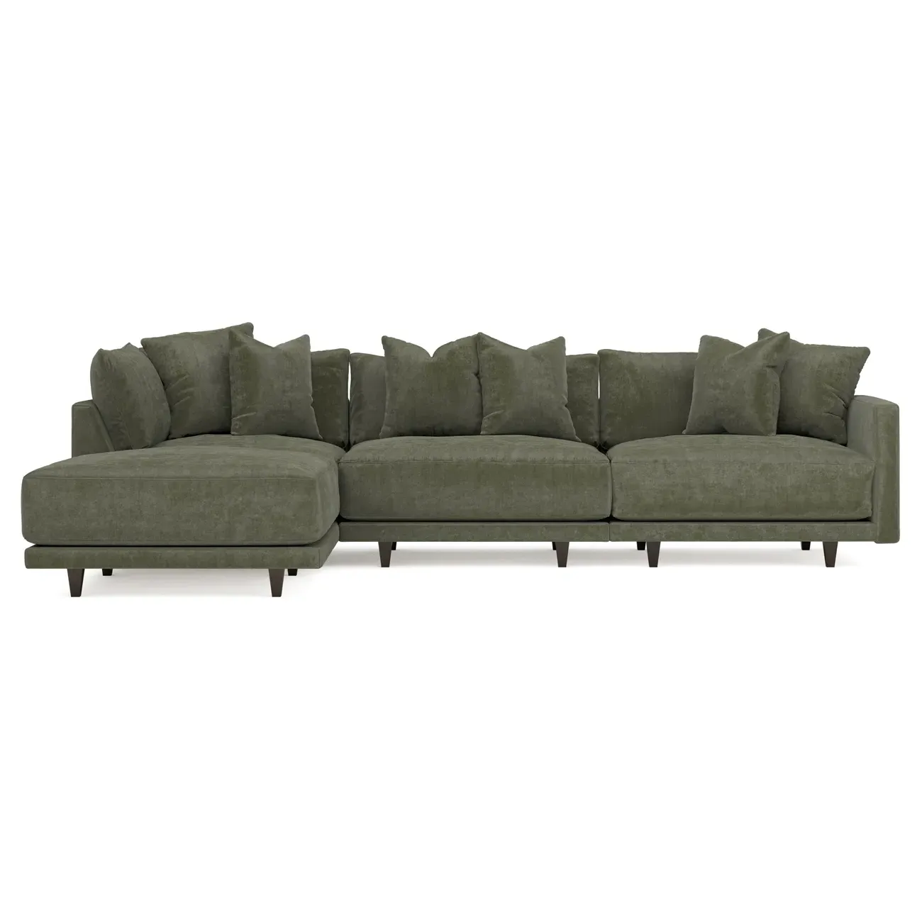 The living is easy on the right 129” Toulouse modular chaise sectional. With deep seating and oh-so-many plush pillows for sink-in comfort, the modern silhouette is delightfully relaxed. Recessed wood legs are hidden from sight, giving the sofa the appearance of floating. Lofted cushions are soft and supportive, with a foam core surrounded by a blend of fiber, down, and feather fill. Choose from a variety of upholstery options, including linen, velvet, and performance fabrics. <b>Overall Dimensions:</b> 129" W x 81" D x 35" H. <b>Ottoman Dimensions:</b> 40” W x 40” D x 20” H; <b>Corner Seat Dimensions:</b> 41” W x 41” D x 35” H; <b>Armless Seat Dimensions:</b> 42” W x 41” D x 35” H; <b>Single Seat Dimensions:</b> 46” W x 41” D x 35” H; <b>Seat Dimensions:</b> 29” D x 20” H; <b>Arm Height:</b> 27”; <b>Leg Height:</b> 5”. <b>Materials:</b> FSC®-certified, US-sourced, formaldehyde-free solid kiln-dried hardwood and furniture-grade laminates. <b>Material Finish:</b> Espresso legs. <b>Pieces Included:</b> Ottoman, Corner Seat, Armless Seat, Left Single Seat.