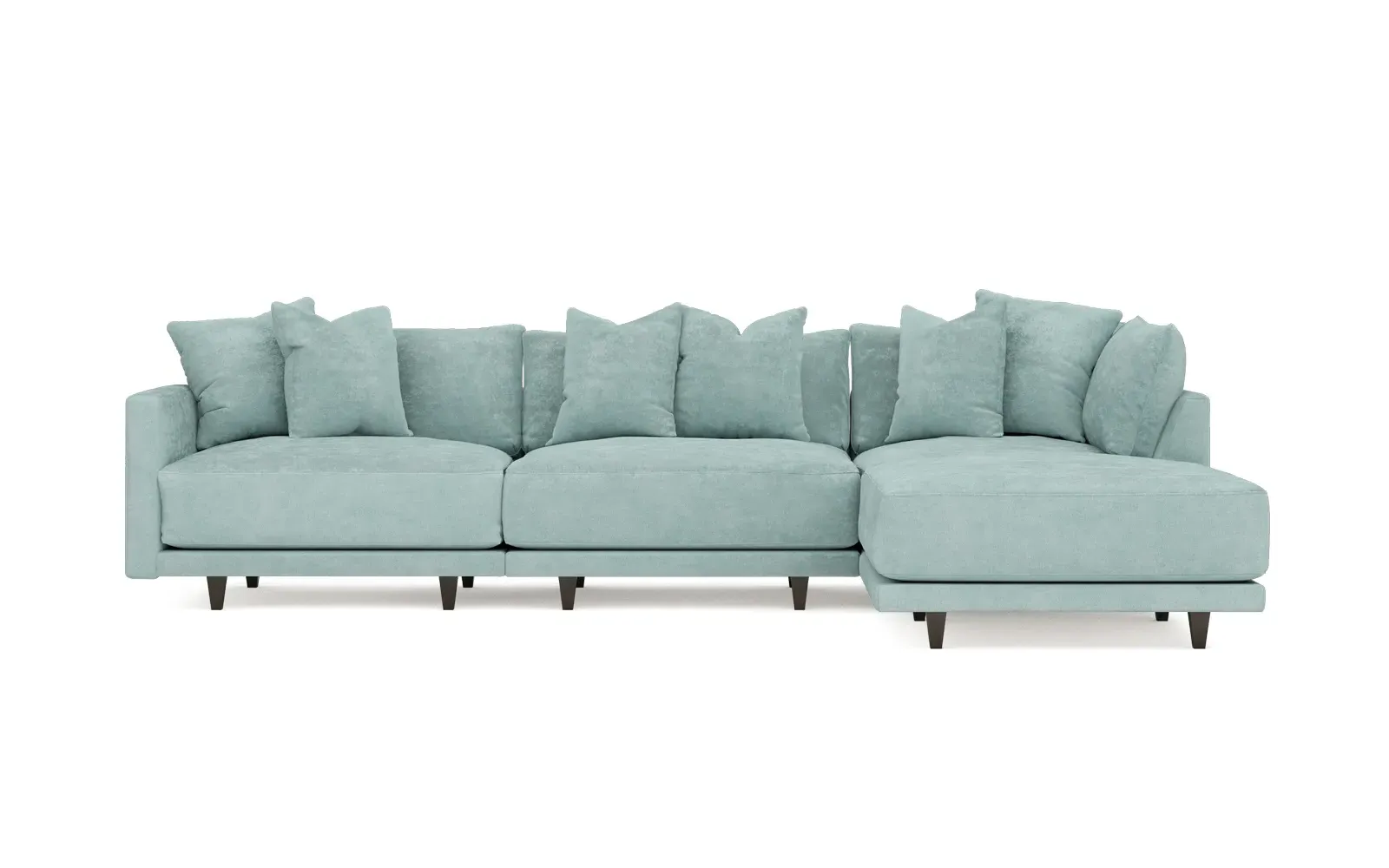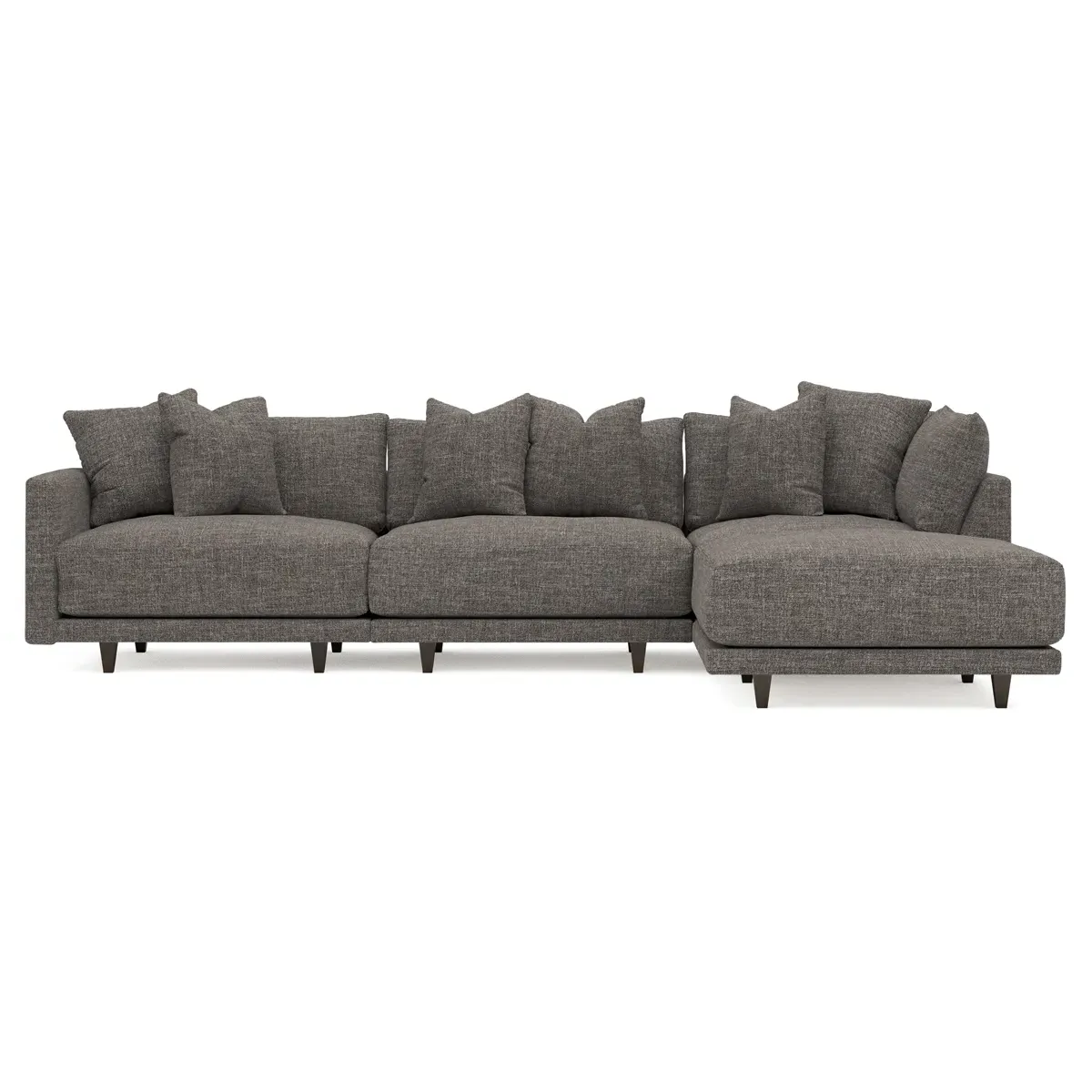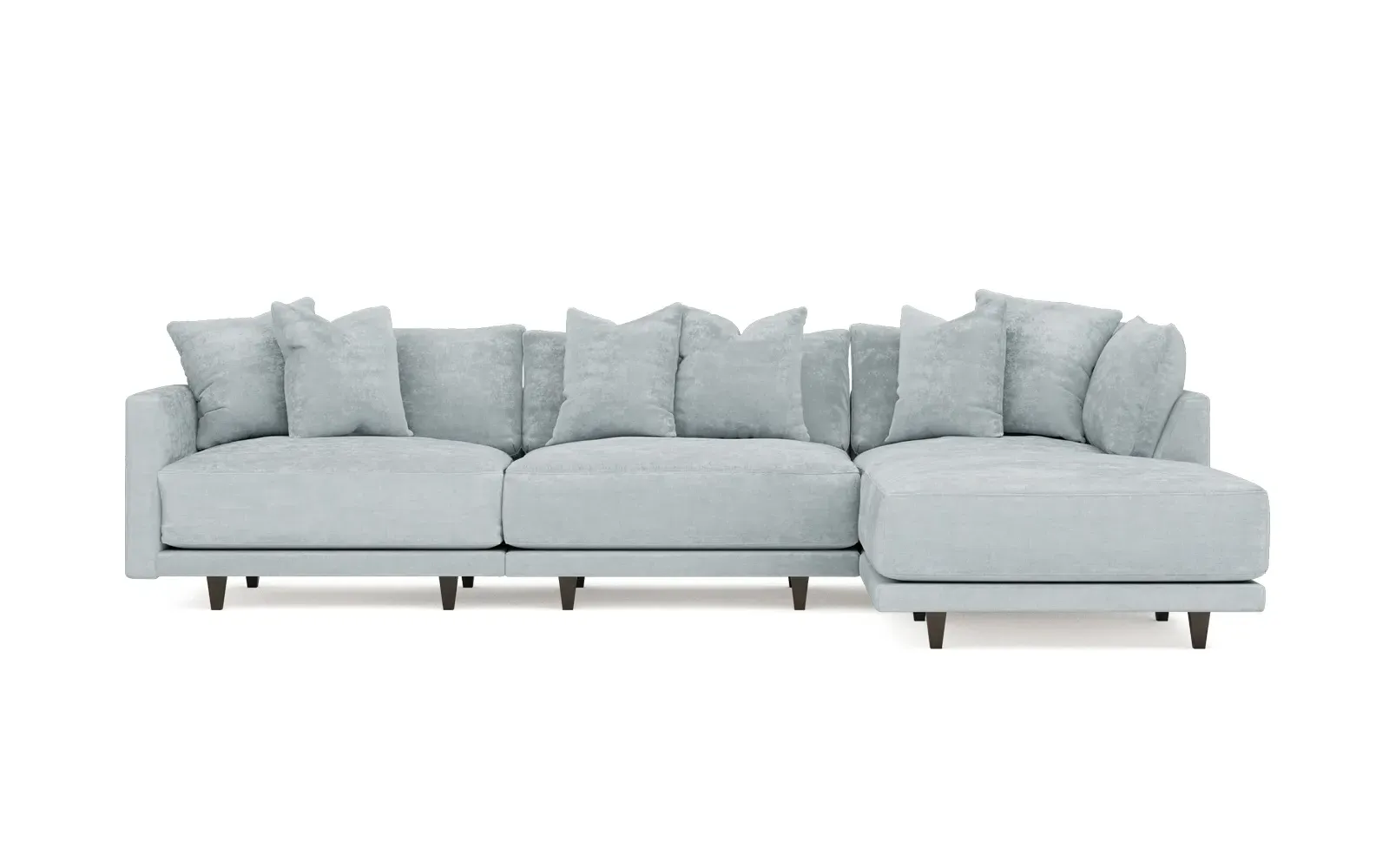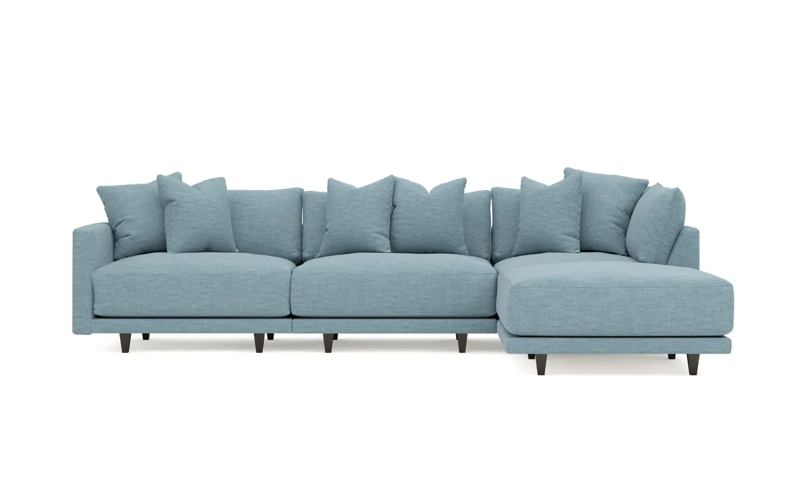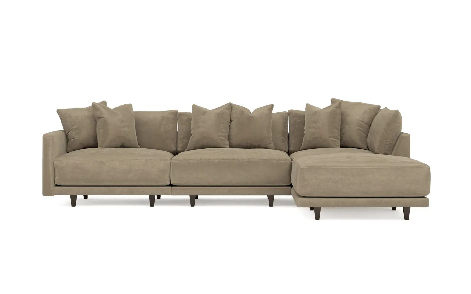 The living is easy on the right 129” Toulouse modular chaise sectional. With deep seating and oh-so-many plush pillows for sink-in comfort, the modern silhouette is delightfully relaxed. Recessed wood legs are hidden from sight, giving the sofa the appearance of floating. Lofted cushions are soft and supportive, with a foam core surrounded by a blend of fiber, down, and feather fill. Choose from a variety of upholstery options, including linen, velvet, and performance fabrics. <b>Overall Dimensions:</b> 129" W x 81" D x 35" H. <b>Ottoman Dimensions:</b> 40” W x 40” D x 20” H; <b>Corner Seat Dimensions:</b> 41” W x 41” D x 35” H; <b>Armless Seat Dimensions:</b> 42” W x 41” D x 35” H; <b>Single Seat Dimensions:</b> 46” W x 41” D x 35” H; <b>Seat Dimensions:</b> 29” D x 20” H; <b>Arm Height:</b> 27”; <b>Leg Height:</b> 5”. <b>Materials:</b> FSC®-certified, US-sourced, formaldehyde-free solid kiln-dried hardwood and furniture-grade laminates. <b>Material Finish:</b> Espresso legs. <b>Pieces Included:</b> Ottoman, Corner Seat, Armless Seat, Left Single Seat.