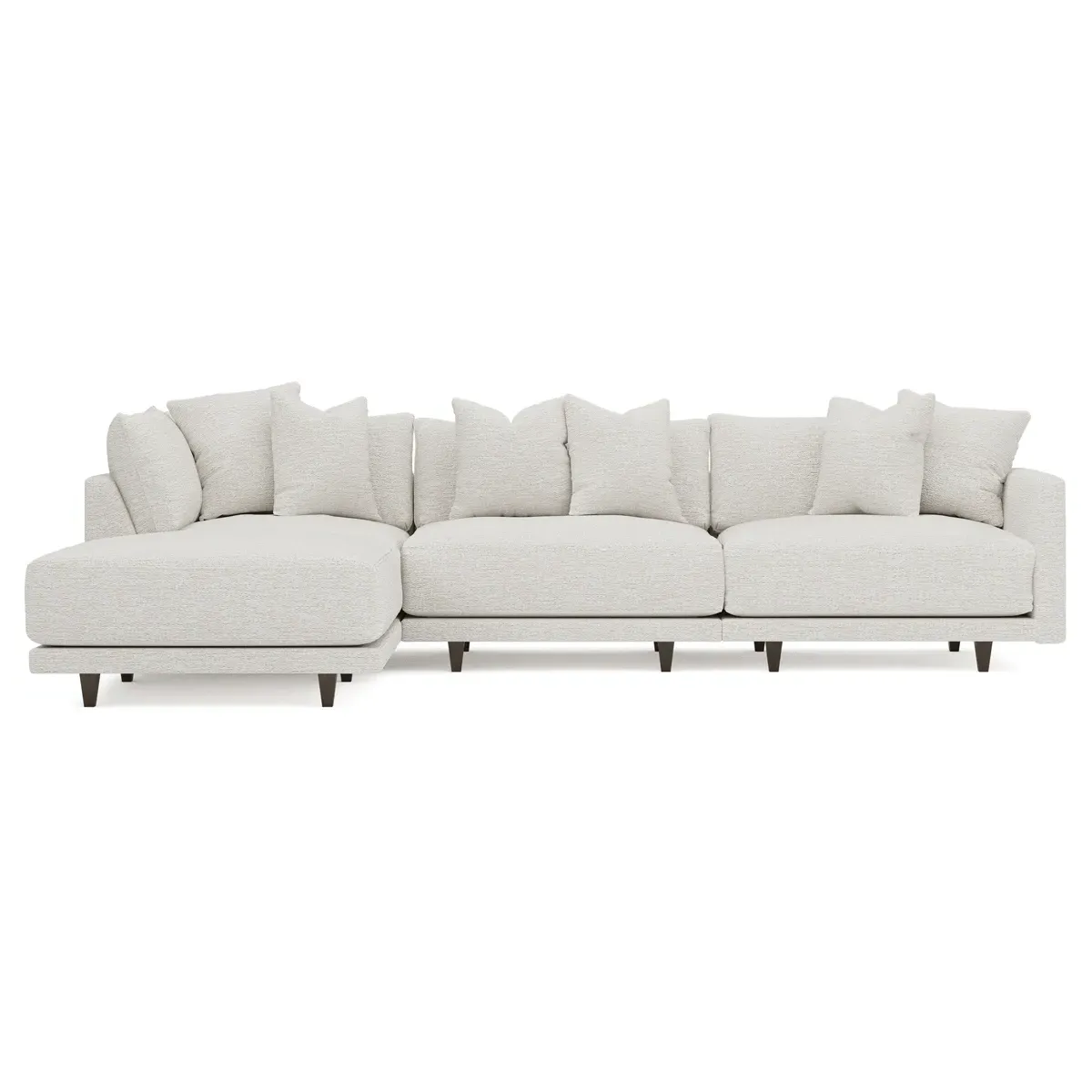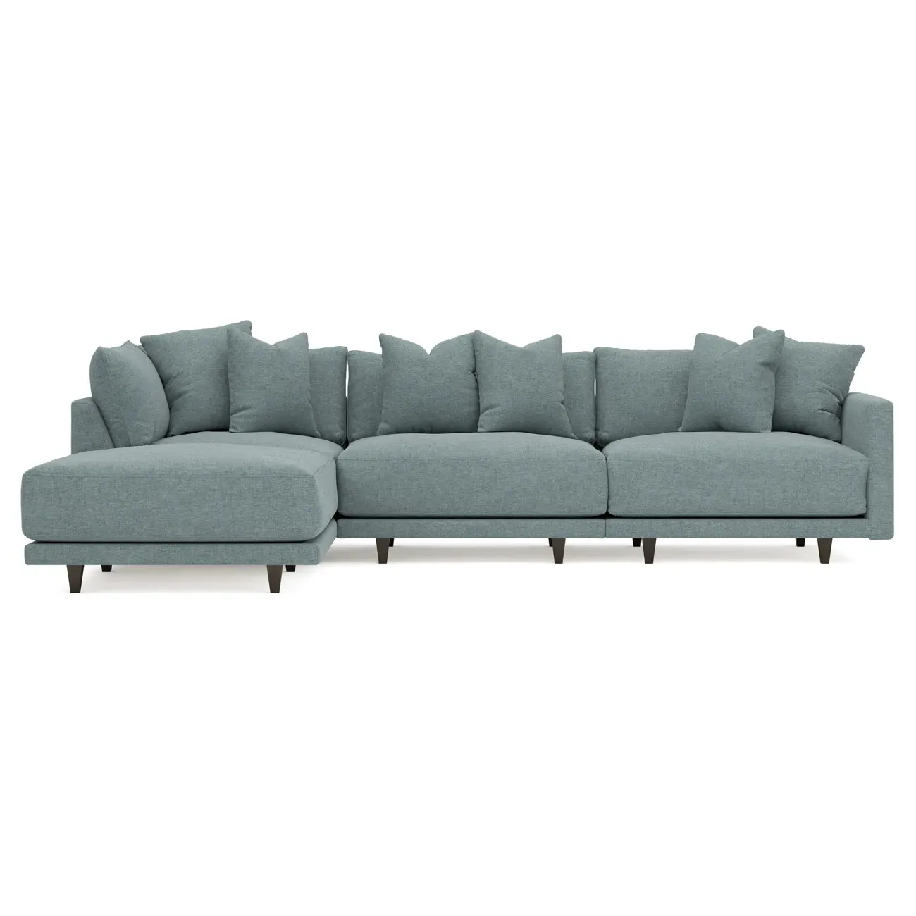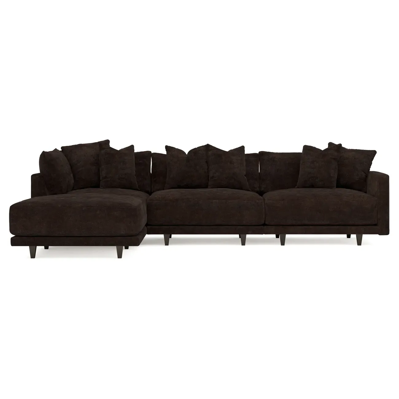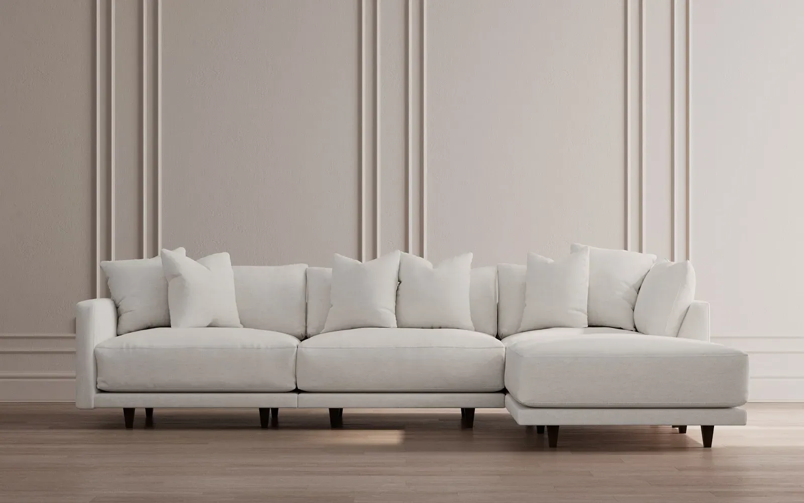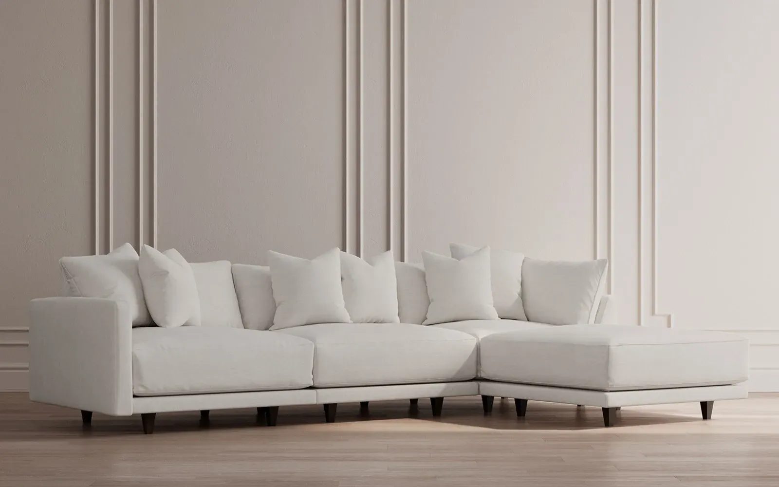 The Toulouse sectional offers deep seating with plush pillows for sink-in comfort. Its recessed wood legs remain hidden from sight, creating a floating appearance, while the lofted cushions feature a foam core surrounded by fiber, down, and feather fill. The FSC-certified kiln-dried hardwood frame ensures durability, and the espresso-finished legs add warmth. W327 x D206 x H89 cm.
