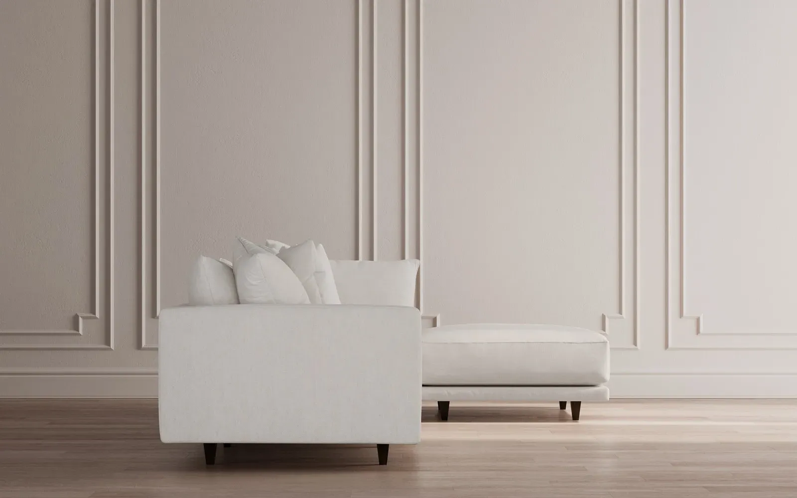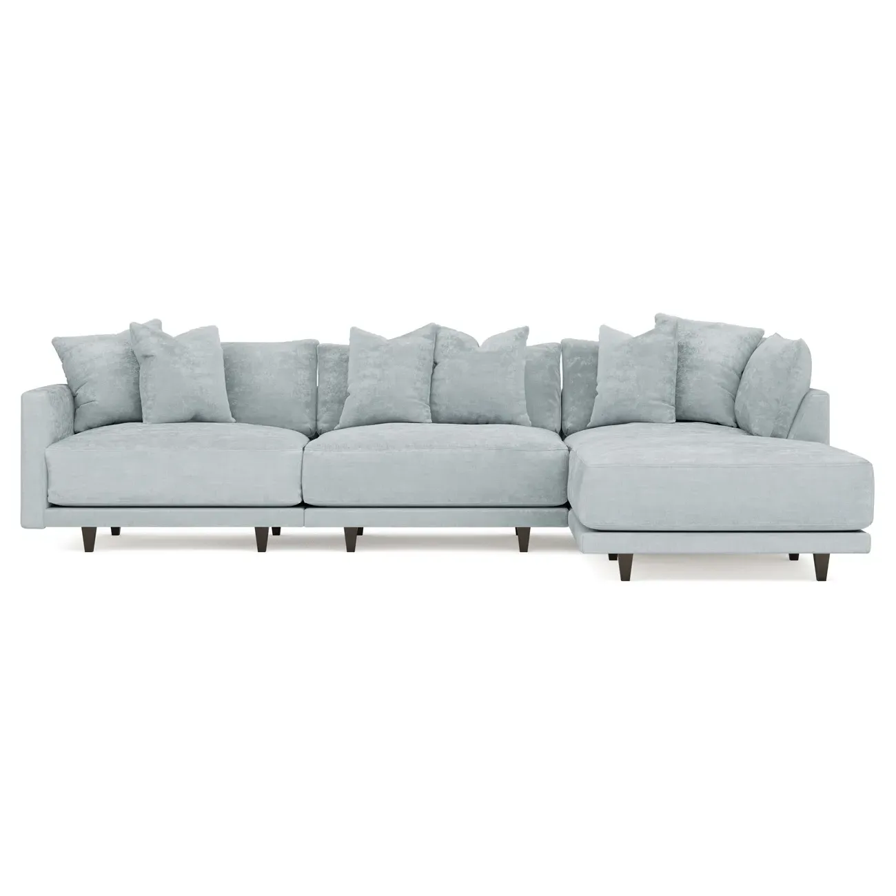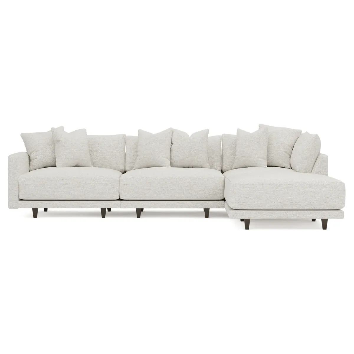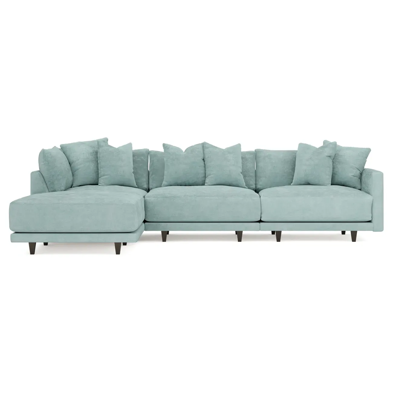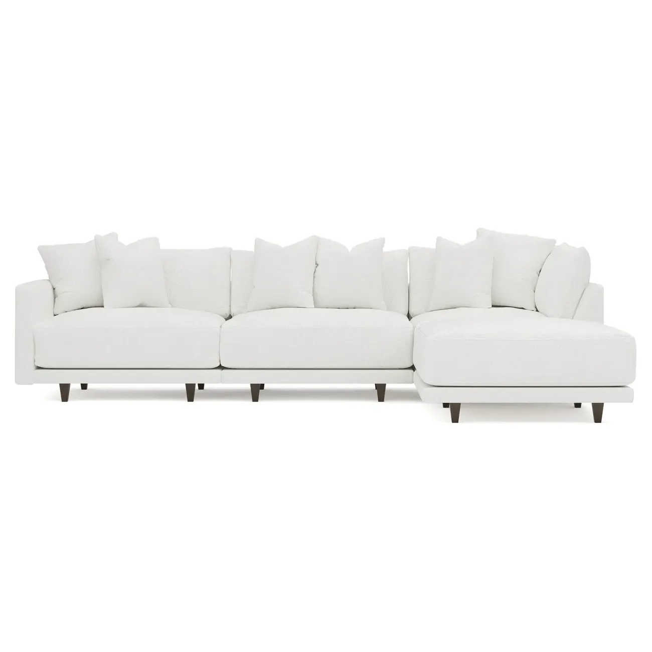The Toulouse sectional offers deep seating with plush pillows for sink-in comfort. Its recessed wood legs remain hidden from sight, creating a floating appearance, while the lofted cushions feature a foam core surrounded by fiber, down, and feather fill. The FSC-certified kiln-dried hardwood frame ensures durability, and the espresso-finished legs add warmth. W327 x D206 x H89 cm.