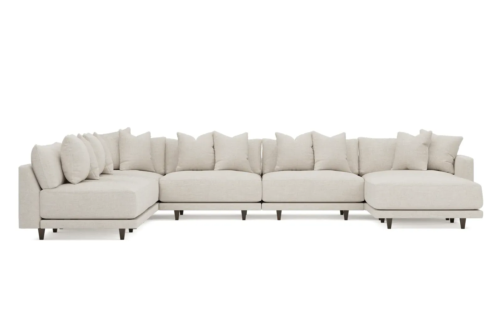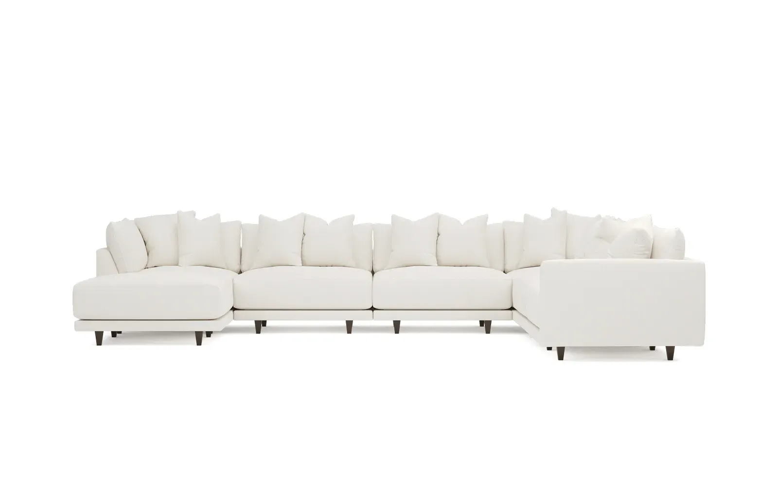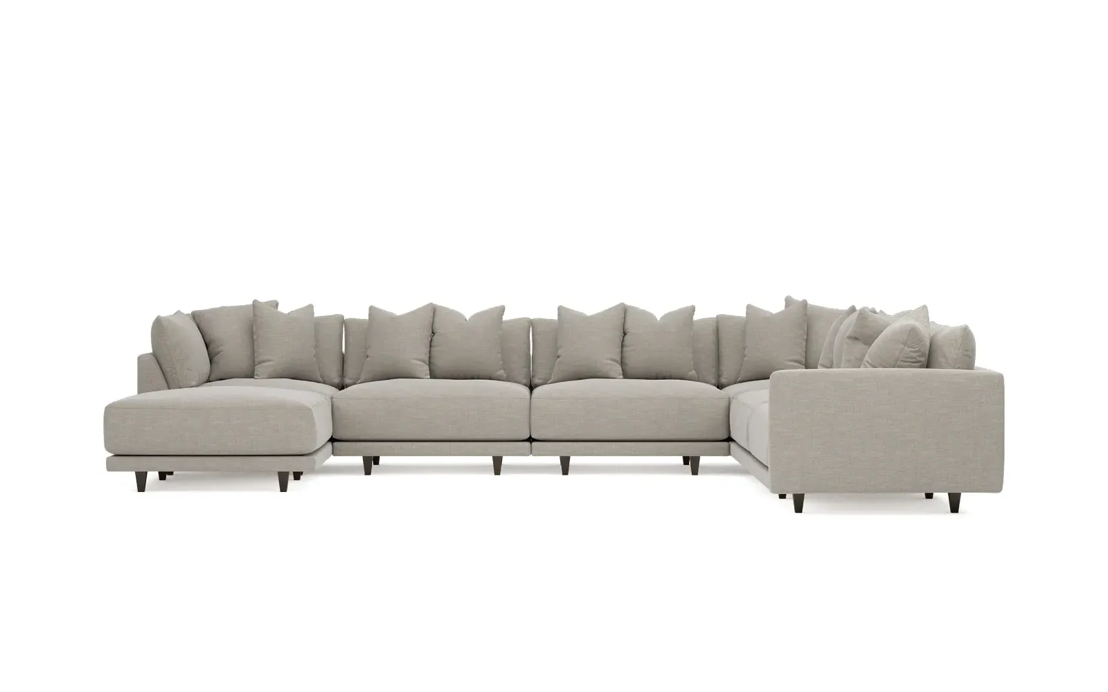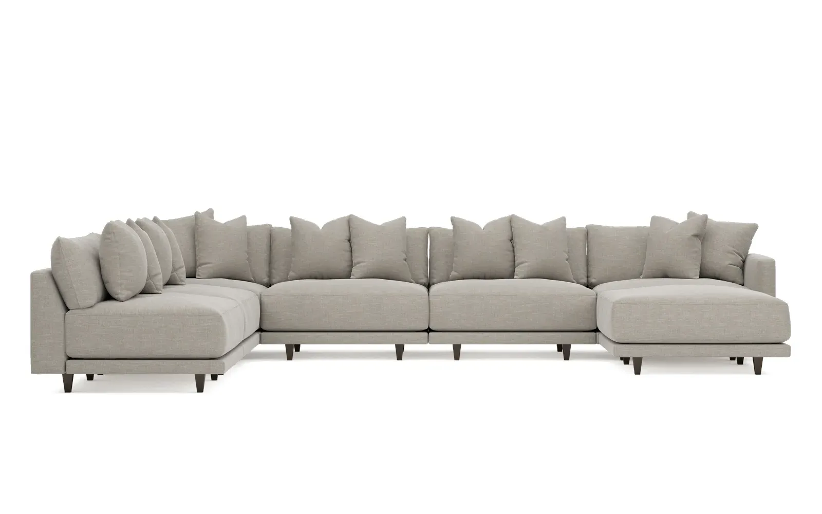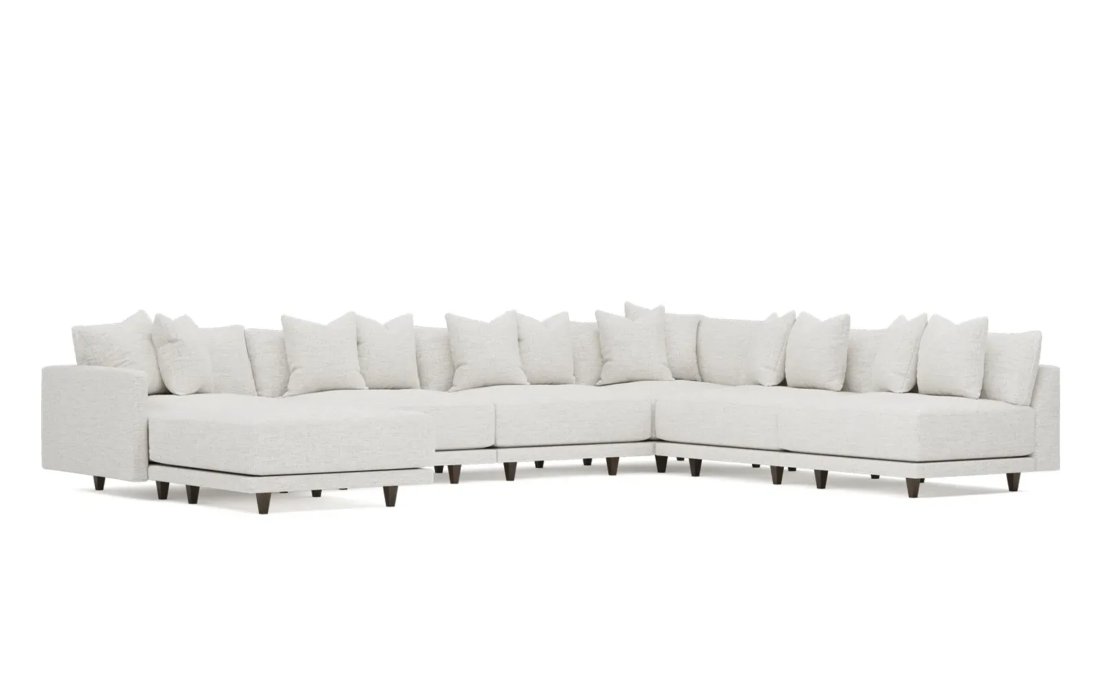 The left 171” Toulouse modular corner sectional is a family room’s perfect companion. With deep seating and oh-so-many plush pillows for sink-in comfort, the modern silhouette is delightfully relaxed. Recessed wood legs are hidden from sight, giving the sofa the appearance of floating. Lofted cushions are soft and supportive, with a foam core surrounded by a blend of fiber, down, and feather fill. Choose from a variety of upholstery options, including linen, velvet, and performance fabrics. <b>Overall Dimensions:</b> 171" W x 125" D x 35" H. <b>Ottoman Dimensions:</b> 40” W x 40” D x 20” H; <b>Corner Seat Dimensions:</b> 41” W x 41” D x 35” H; <b>Armless Seat Dimensions:</b> 42” W x 41” D x 35” H; <b>Single Seat Dimensions:</b> 46” W x 41” D x 35” H; <b>Seat Dimensions:</b> 29” D x 20” H; <b>Arm Height:</b> 27”; <b>Leg Height:</b> 5”. <b>Materials:</b> FSC®-certified, US-sourced, formaldehyde-free solid kiln-dried hardwood and furniture-grade laminates. <b>Material Finish:</b> Espresso legs. <b>Pieces Included:</b> Ottoman, Corner Seat, 4 Armless Seats, Left Single Seat.
