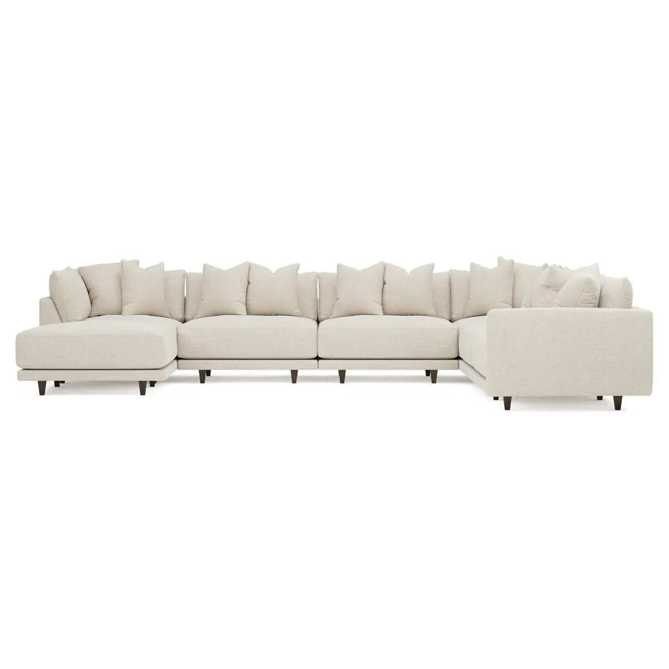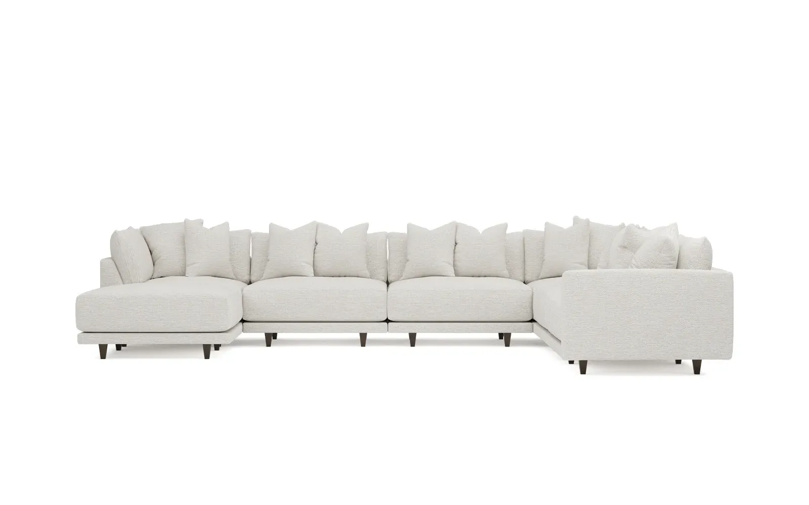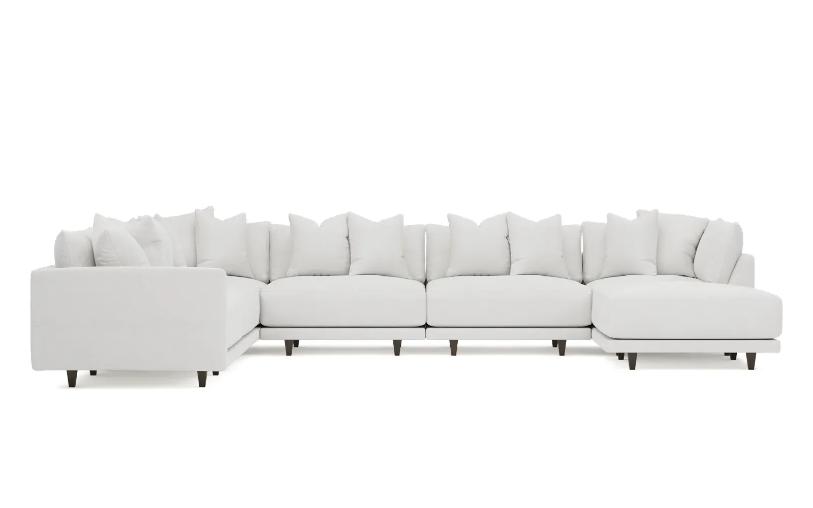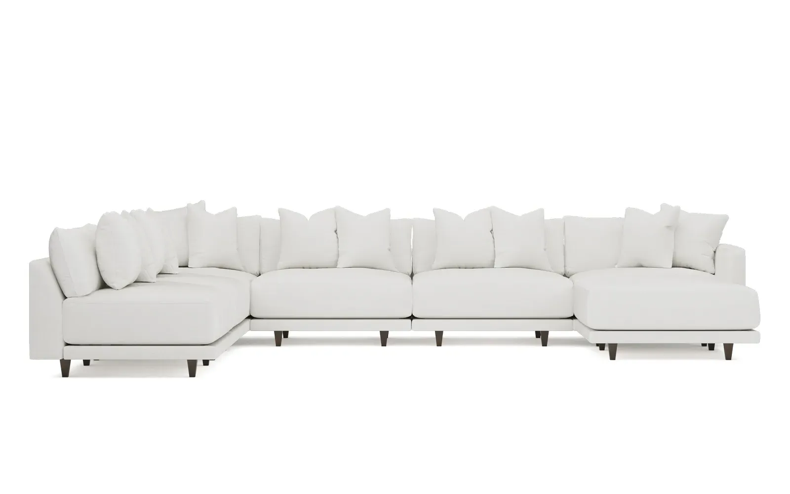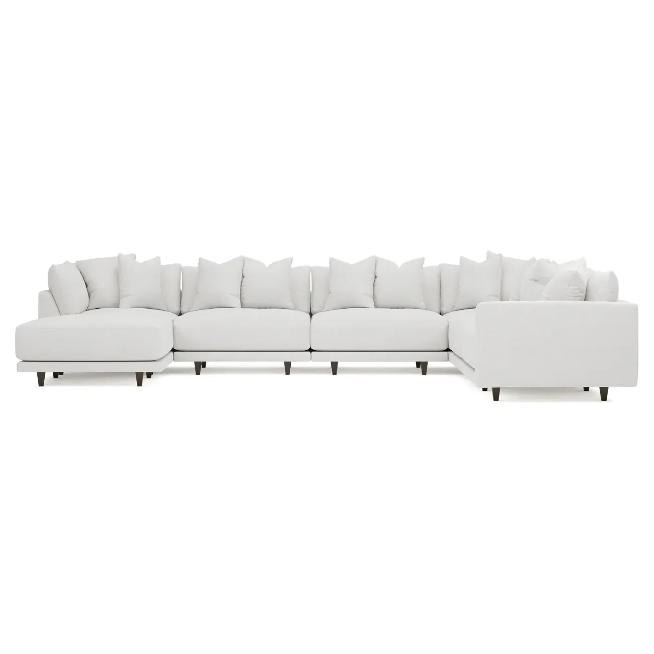 The left 171” Toulouse modular corner sectional is a family room’s perfect companion. With deep seating and oh-so-many plush pillows for sink-in comfort, the modern silhouette is delightfully relaxed. Recessed wood legs are hidden from sight, giving the sofa the appearance of floating. Lofted cushions are soft and supportive, with a foam core surrounded by a blend of fiber, down, and feather fill. Choose from a variety of upholstery options, including linen, velvet, and performance fabrics. <b>Overall Dimensions:</b> 171" W x 125" D x 35" H. <b>Ottoman Dimensions:</b> 40” W x 40” D x 20” H; <b>Corner Seat Dimensions:</b> 41” W x 41” D x 35” H; <b>Armless Seat Dimensions:</b> 42” W x 41” D x 35” H; <b>Single Seat Dimensions:</b> 46” W x 41” D x 35” H; <b>Seat Dimensions:</b> 29” D x 20” H; <b>Arm Height:</b> 27”; <b>Leg Height:</b> 5”. <b>Materials:</b> FSC®-certified, US-sourced, formaldehyde-free solid kiln-dried hardwood and furniture-grade laminates. <b>Material Finish:</b> Espresso legs. <b>Pieces Included:</b> Ottoman, Corner Seat, 4 Armless Seats, Left Single Seat.