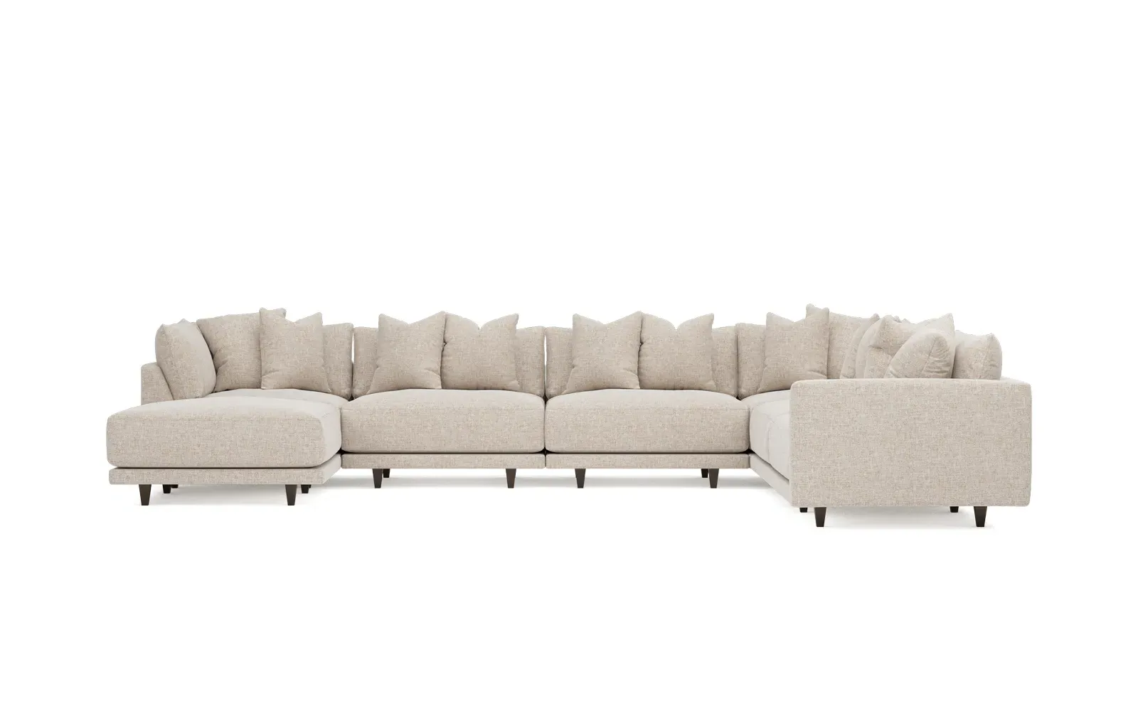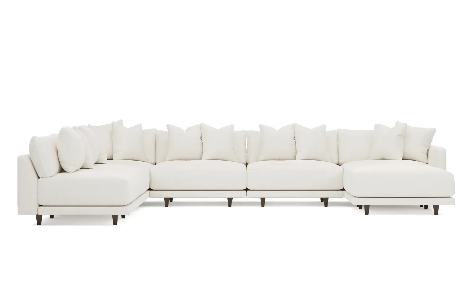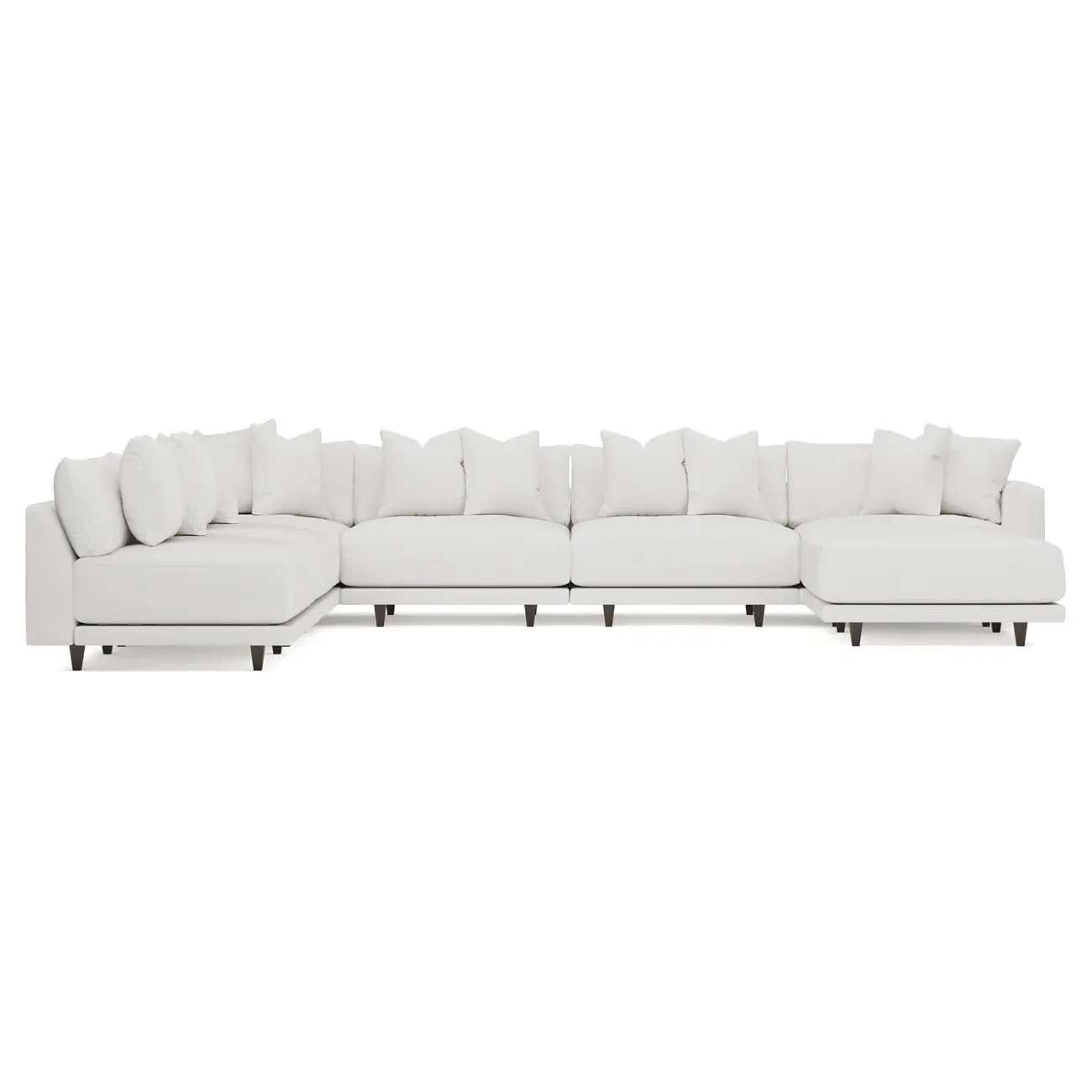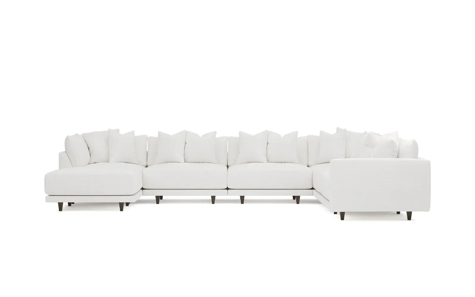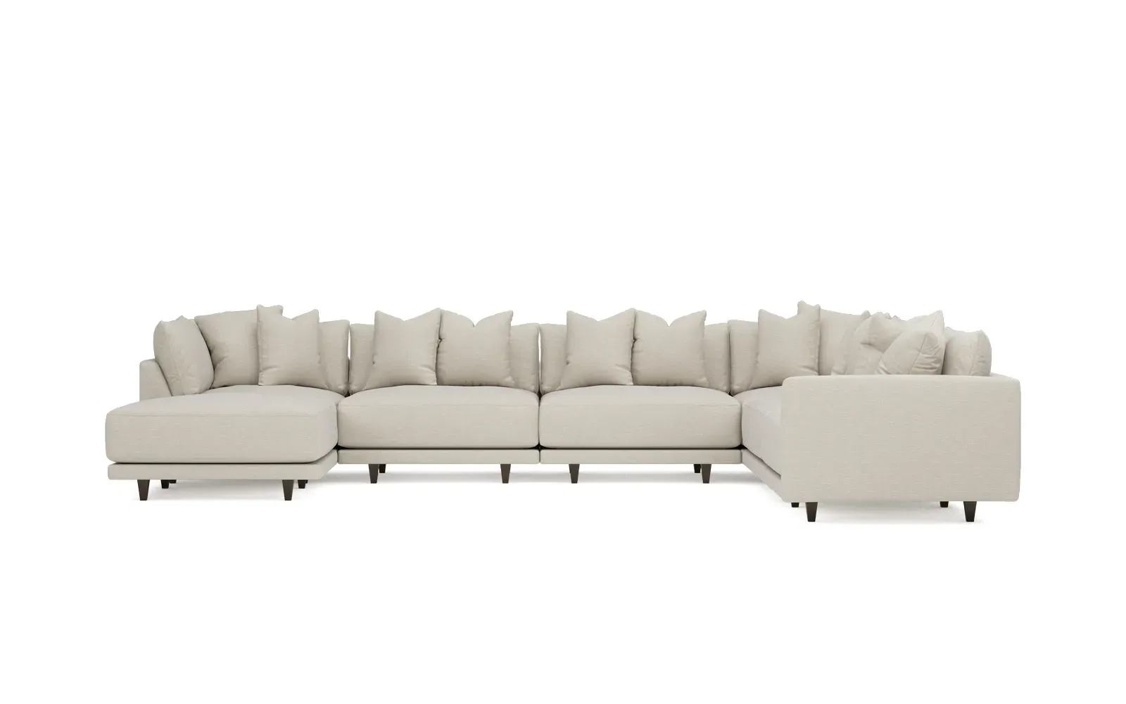 The left 171” Toulouse modular corner sectional is a family room’s perfect companion. With deep seating and oh-so-many plush pillows for sink-in comfort, the modern silhouette is delightfully relaxed. Recessed wood legs are hidden from sight, giving the sofa the appearance of floating. Lofted cushions are soft and supportive, with a foam core surrounded by a blend of fiber, down, and feather fill. Choose from a variety of upholstery options, including linen, velvet, and performance fabrics. <b>Overall Dimensions:</b> 171" W x 125" D x 35" H. <b>Ottoman Dimensions:</b> 40” W x 40” D x 20” H; <b>Corner Seat Dimensions:</b> 41” W x 41” D x 35” H; <b>Armless Seat Dimensions:</b> 42” W x 41” D x 35” H; <b>Single Seat Dimensions:</b> 46” W x 41” D x 35” H; <b>Seat Dimensions:</b> 29” D x 20” H; <b>Arm Height:</b> 27”; <b>Leg Height:</b> 5”. <b>Materials:</b> FSC®-certified, US-sourced, formaldehyde-free solid kiln-dried hardwood and furniture-grade laminates. <b>Material Finish:</b> Espresso legs. <b>Pieces Included:</b> Ottoman, Corner Seat, 4 Armless Seats, Left Single Seat.