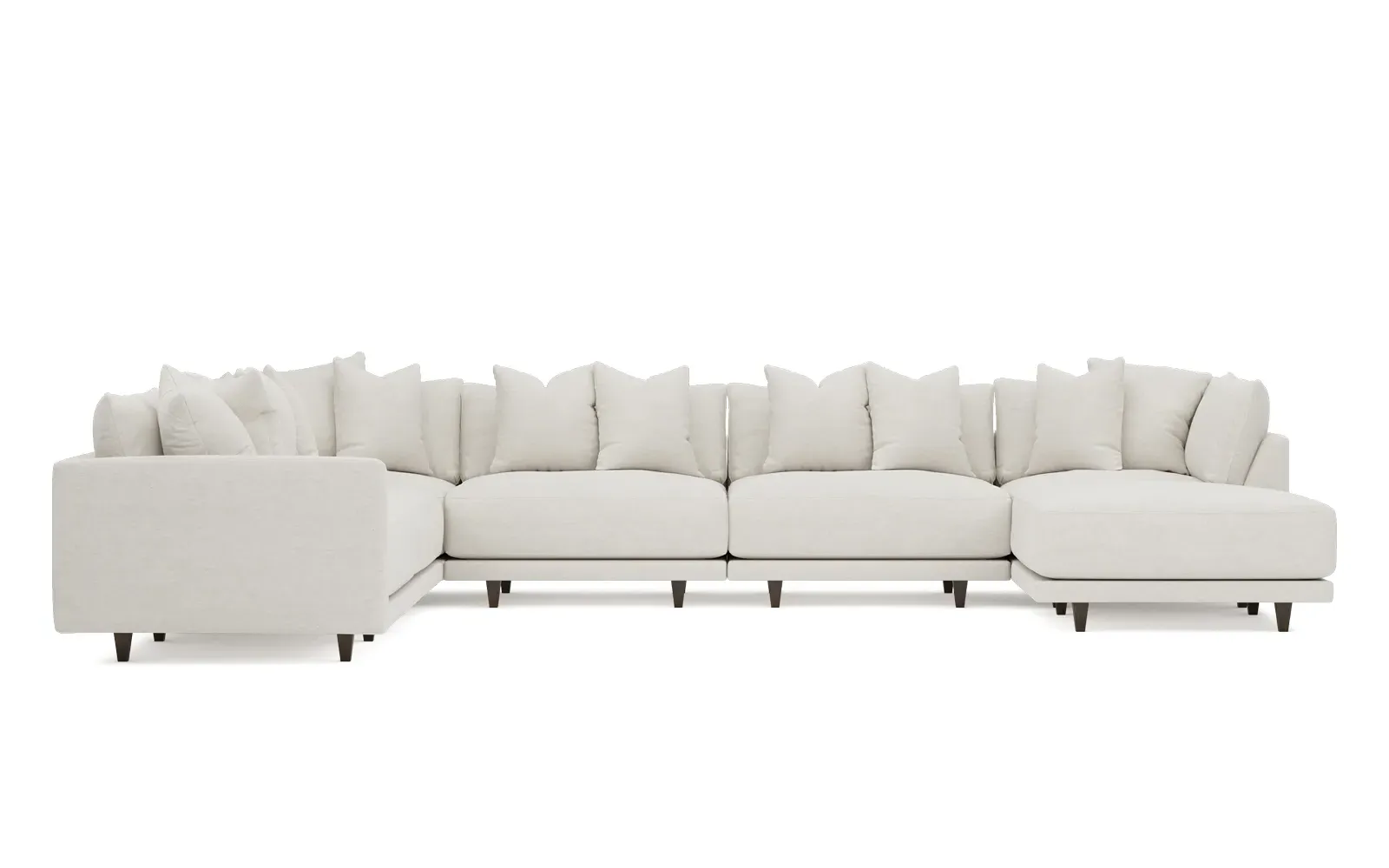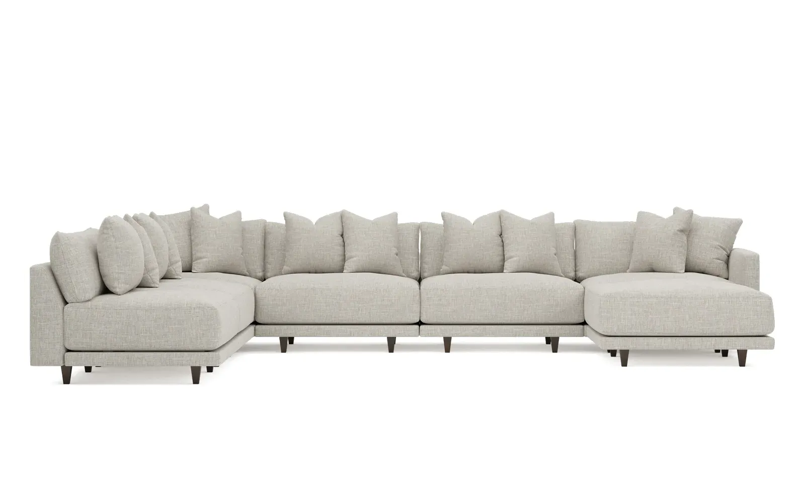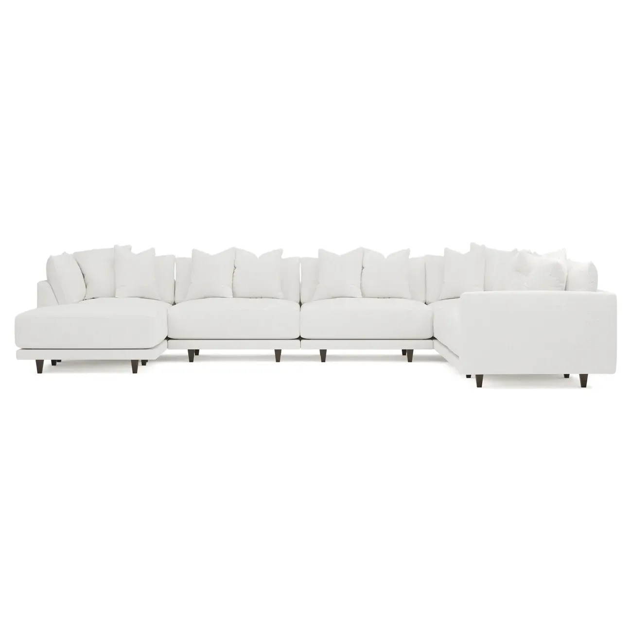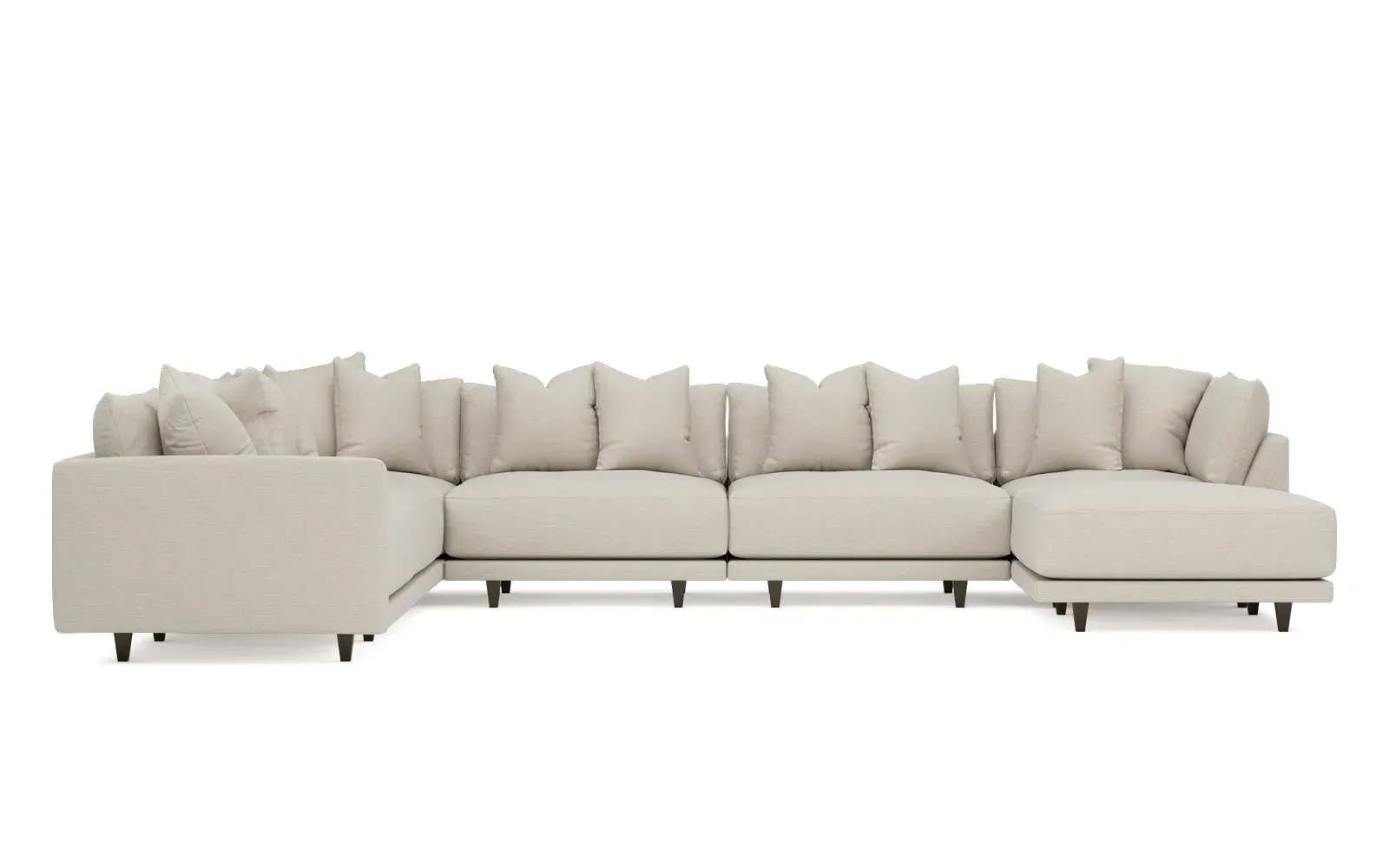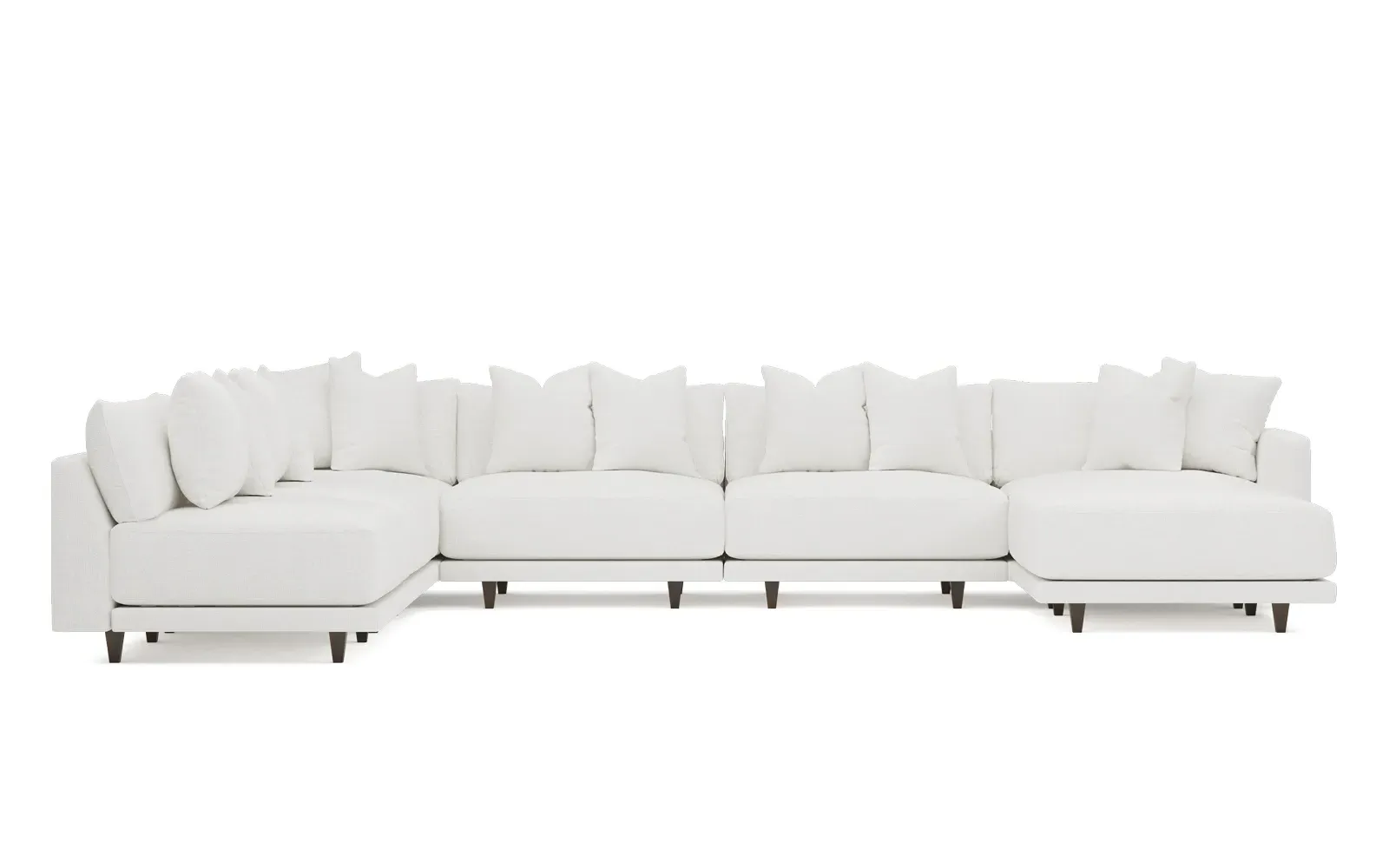 The left 171” Toulouse modular corner sectional is a family room’s perfect companion. With deep seating and oh-so-many plush pillows for sink-in comfort, the modern silhouette is delightfully relaxed. Recessed wood legs are hidden from sight, giving the sofa the appearance of floating. Lofted cushions are soft and supportive, with a foam core surrounded by a blend of fiber, down, and feather fill. Choose from a variety of upholstery options, including linen, velvet, and performance fabrics. <b>Overall Dimensions:</b> 171" W x 125" D x 35" H. <b>Ottoman Dimensions:</b> 40” W x 40” D x 20” H; <b>Corner Seat Dimensions:</b> 41” W x 41” D x 35” H; <b>Armless Seat Dimensions:</b> 42” W x 41” D x 35” H; <b>Single Seat Dimensions:</b> 46” W x 41” D x 35” H; <b>Seat Dimensions:</b> 29” D x 20” H; <b>Arm Height:</b> 27”; <b>Leg Height:</b> 5”. <b>Materials:</b> FSC®-certified, US-sourced, formaldehyde-free solid kiln-dried hardwood and furniture-grade laminates. <b>Material Finish:</b> Espresso legs. <b>Pieces Included:</b> Ottoman, Corner Seat, 4 Armless Seats, Left Single Seat.