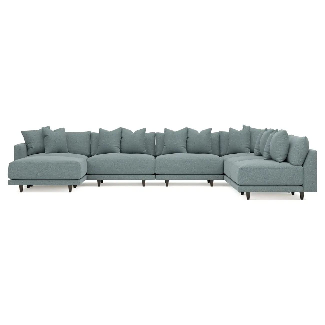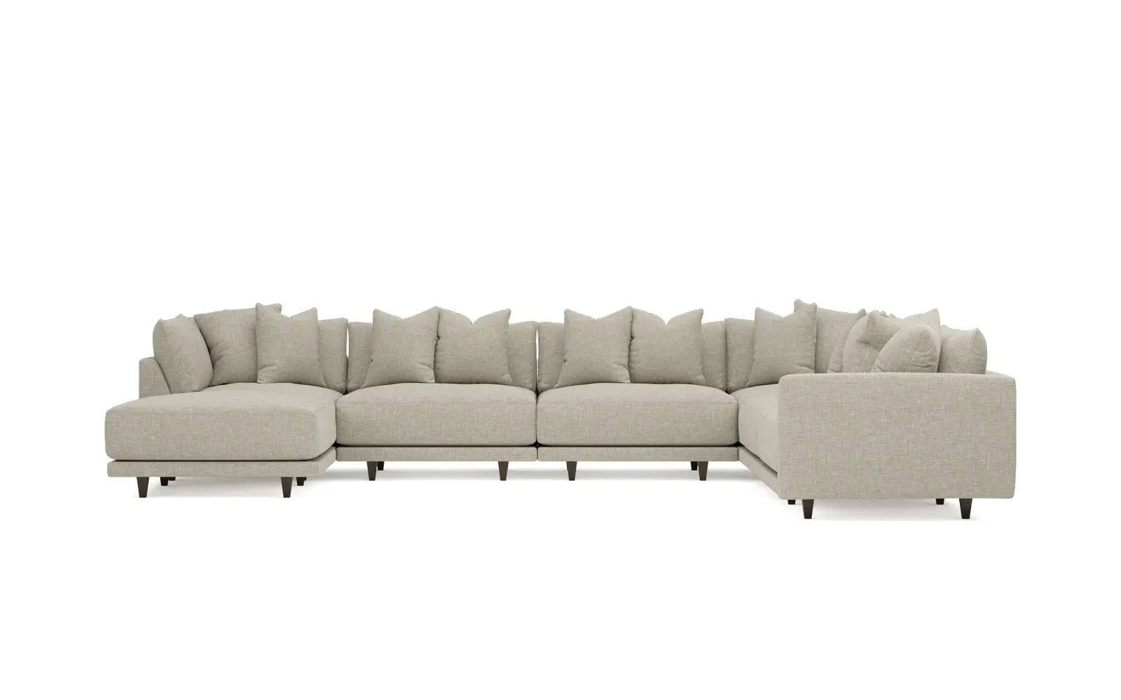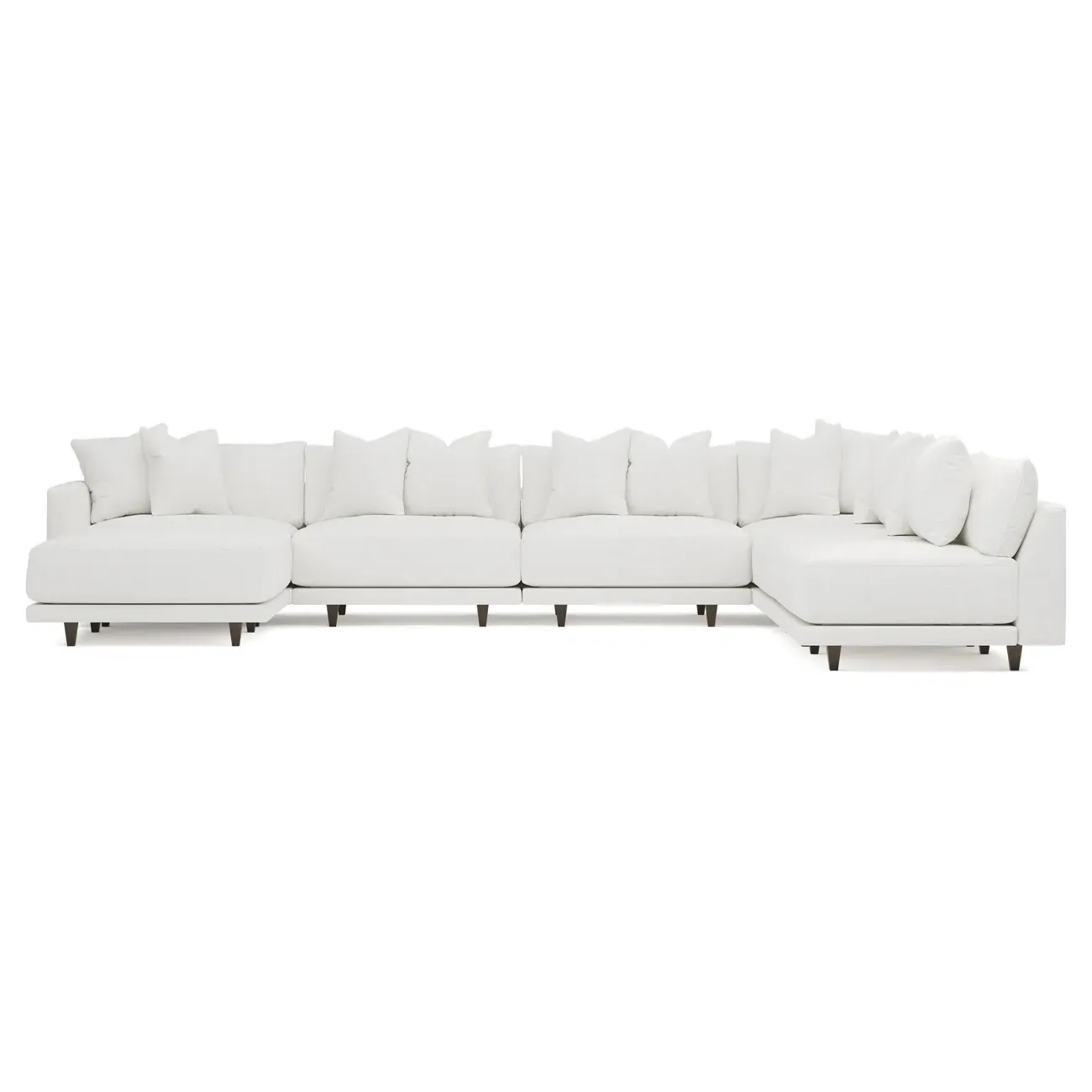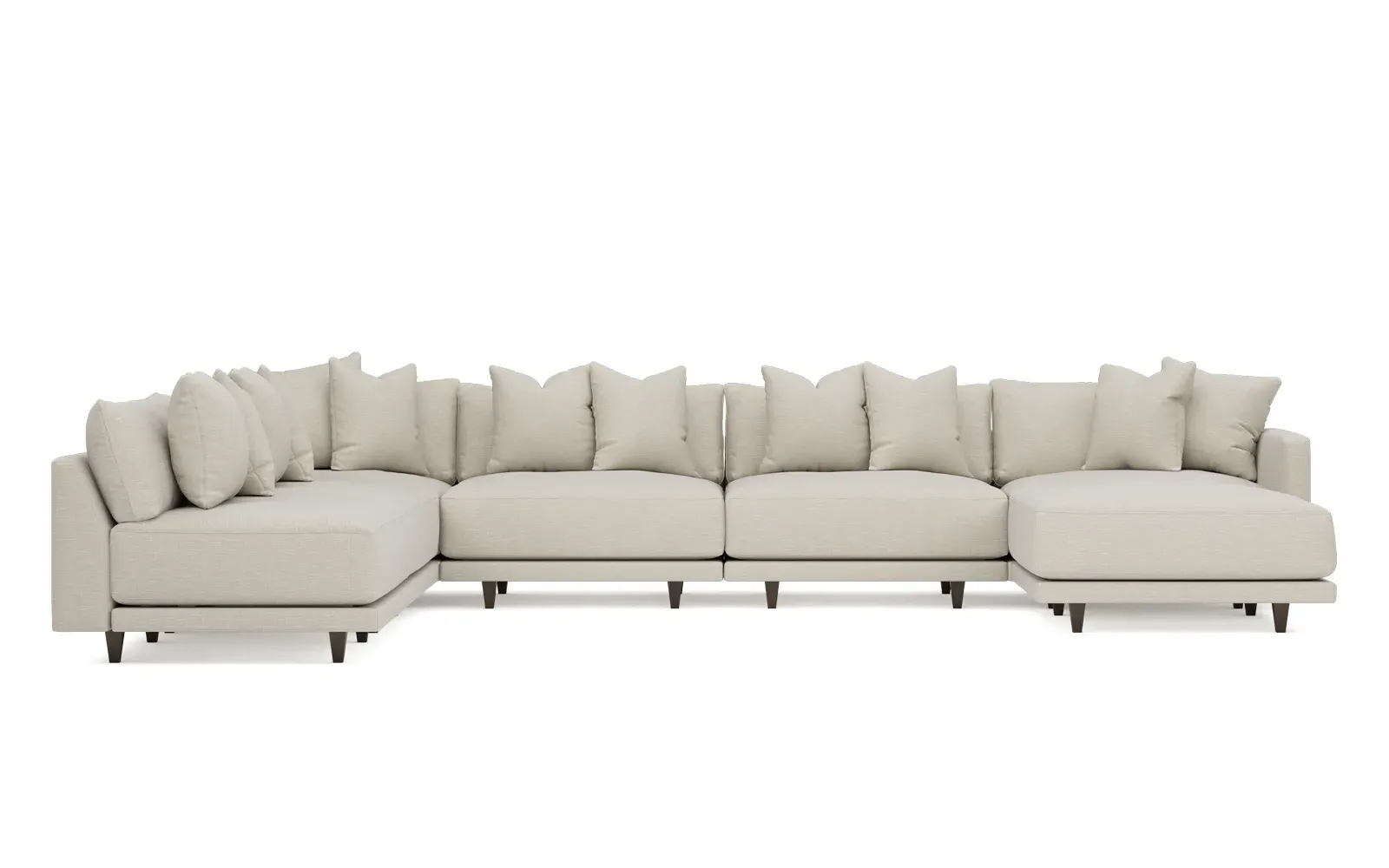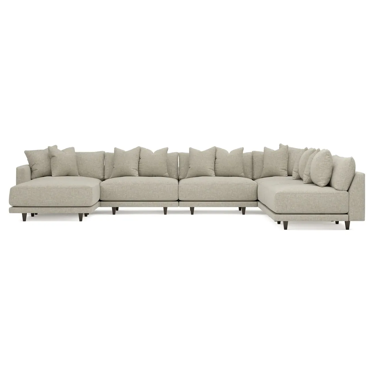 The left 171” Toulouse modular corner sectional is a family room’s perfect companion. With deep seating and oh-so-many plush pillows for sink-in comfort, the modern silhouette is delightfully relaxed. Recessed wood legs are hidden from sight, giving the sofa the appearance of floating. Lofted cushions are soft and supportive, with a foam core surrounded by a blend of fiber, down, and feather fill. Choose from a variety of upholstery options, including linen, velvet, and performance fabrics. <b>Overall Dimensions:</b> 171" W x 125" D x 35" H. <b>Ottoman Dimensions:</b> 40” W x 40” D x 20” H; <b>Corner Seat Dimensions:</b> 41” W x 41” D x 35” H; <b>Armless Seat Dimensions:</b> 42” W x 41” D x 35” H; <b>Single Seat Dimensions:</b> 46” W x 41” D x 35” H; <b>Seat Dimensions:</b> 29” D x 20” H; <b>Arm Height:</b> 27”; <b>Leg Height:</b> 5”. <b>Materials:</b> FSC®-certified, US-sourced, formaldehyde-free solid kiln-dried hardwood and furniture-grade laminates. <b>Material Finish:</b> Espresso legs. <b>Pieces Included:</b> Ottoman, Corner Seat, 4 Armless Seats, Left Single Seat.