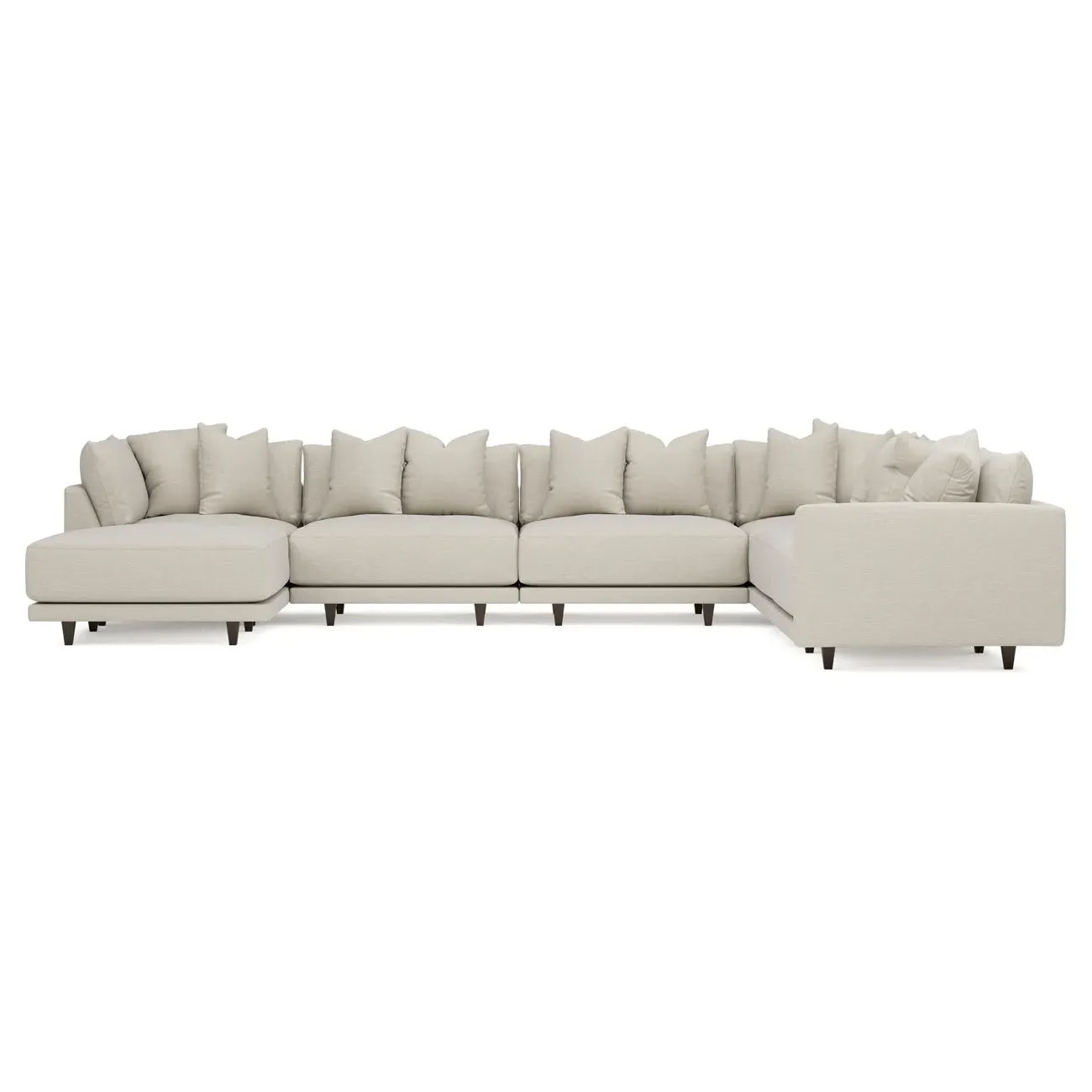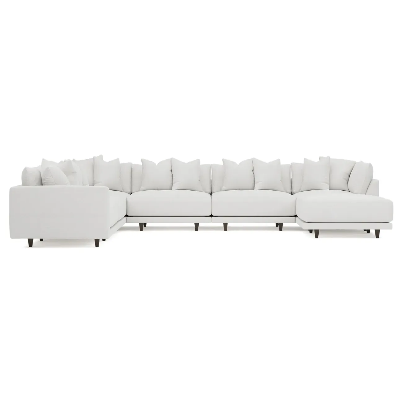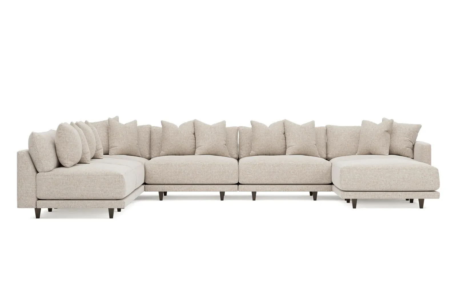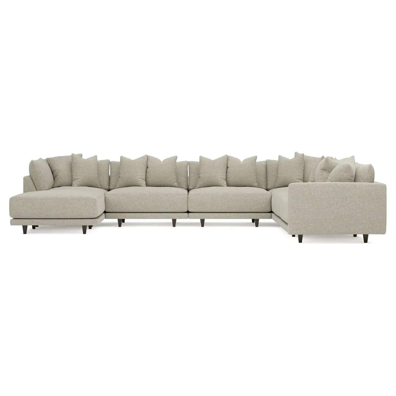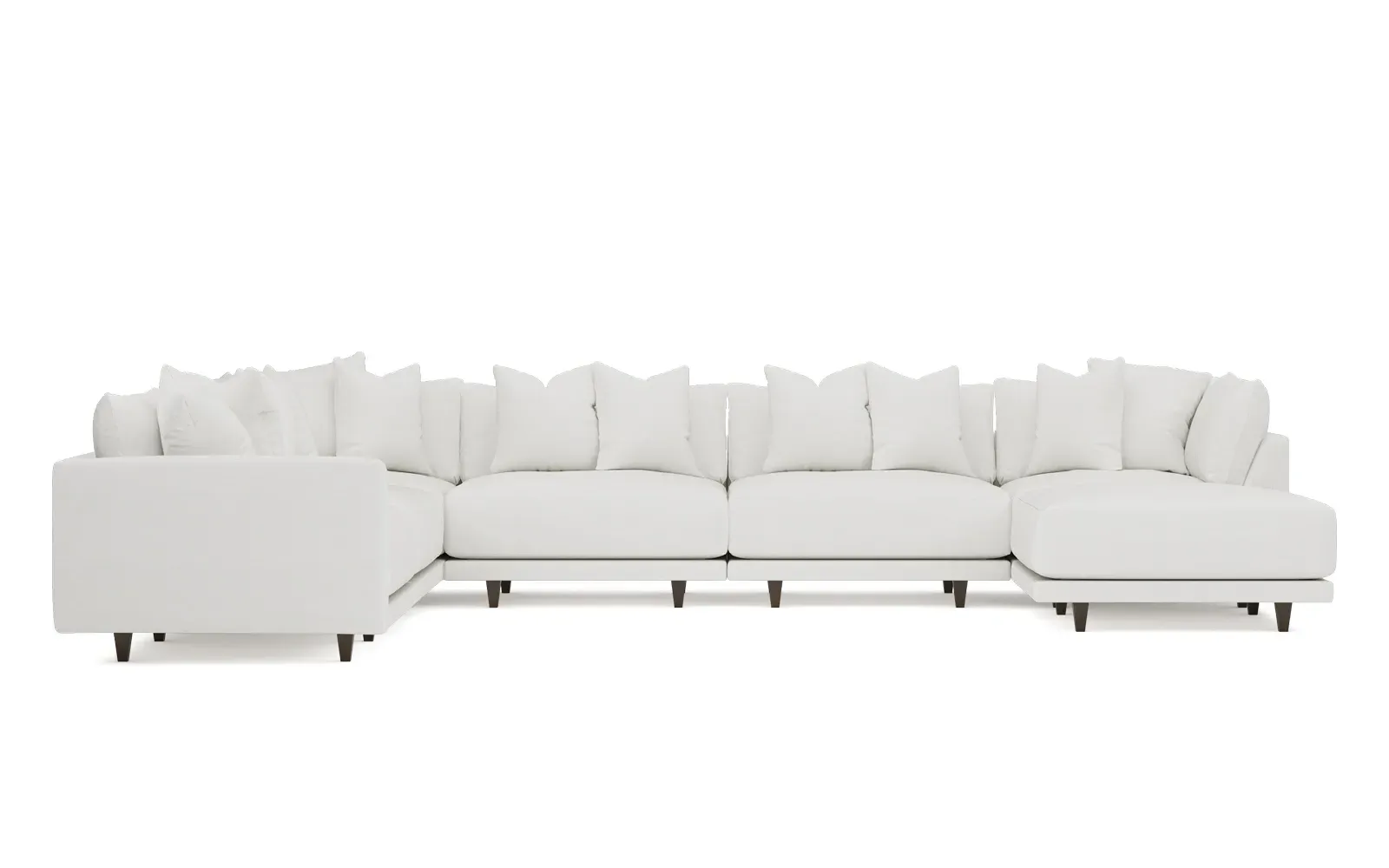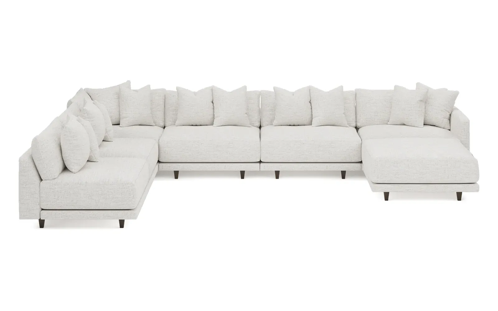 The left 171” Toulouse modular corner sectional is a family room’s perfect companion. With deep seating and oh-so-many plush pillows for sink-in comfort, the modern silhouette is delightfully relaxed. Recessed wood legs are hidden from sight, giving the sofa the appearance of floating. Lofted cushions are soft and supportive, with a foam core surrounded by a blend of fiber, down, and feather fill. Choose from a variety of upholstery options, including linen, velvet, and performance fabrics. <b>Overall Dimensions:</b> 171" W x 125" D x 35" H. <b>Ottoman Dimensions:</b> 40” W x 40” D x 20” H; <b>Corner Seat Dimensions:</b> 41” W x 41” D x 35” H; <b>Armless Seat Dimensions:</b> 42” W x 41” D x 35” H; <b>Single Seat Dimensions:</b> 46” W x 41” D x 35” H; <b>Seat Dimensions:</b> 29” D x 20” H; <b>Arm Height:</b> 27”; <b>Leg Height:</b> 5”. <b>Materials:</b> FSC®-certified, US-sourced, formaldehyde-free solid kiln-dried hardwood and furniture-grade laminates. <b>Material Finish:</b> Espresso legs. <b>Pieces Included:</b> Ottoman, Corner Seat, 4 Armless Seats, Left Single Seat.